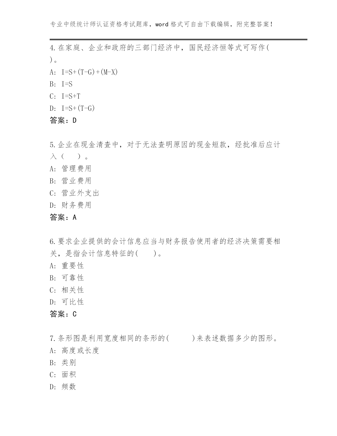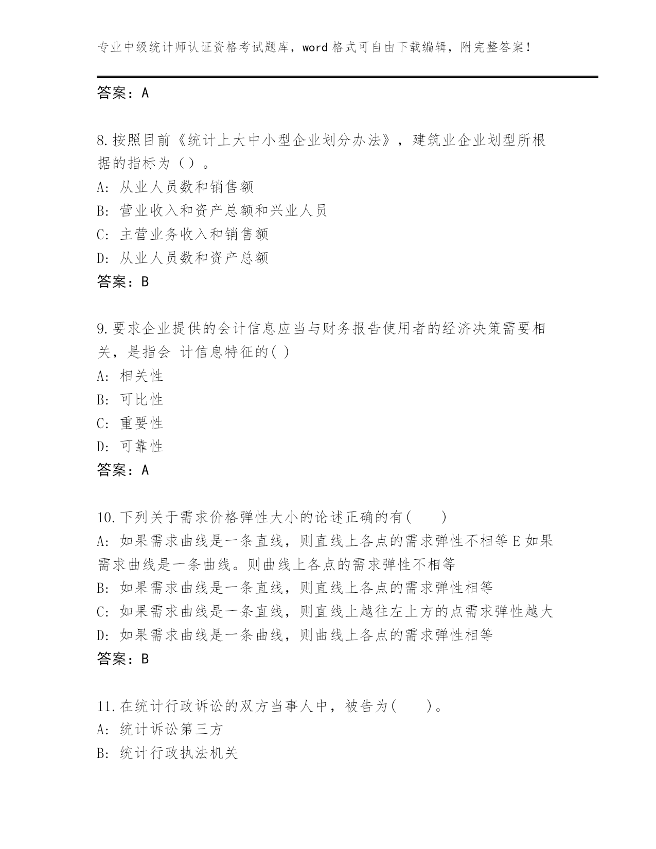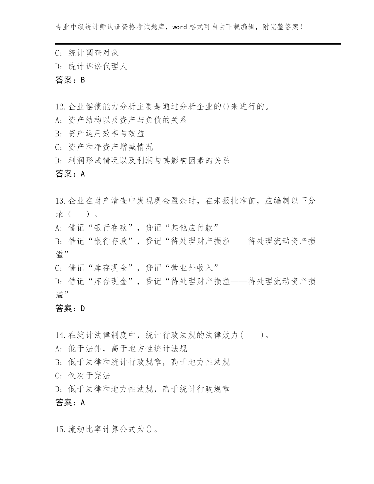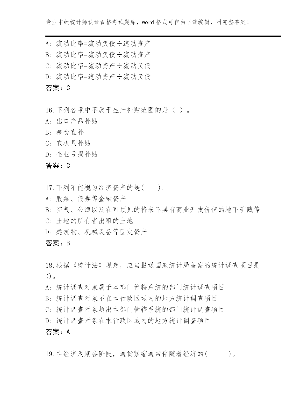 专业中级统计师认证资格考试题库,word格式可自由下载编辑,附完整答案!河北省武强县完整版中级统计师认证资格考试通关秘籍题库带答案(典型题)第I部分单选题(100题)1.下列各项中不属于住户成员范围的是()。A:本住户临时外出的家庭人员B:轮流居住的老人C:本住户不再供养的在外学生D:本住户未分家的农村外出从业人员答案:C2.下列关于会计主体假设的说法,正确的是()。A:会计主体是对会计工作的时间范围所作的限定B:会计主体既可以是法人,也可以是非法人C:会计主体必然是法律主体,法律主体不一定是会计主体D:企业内部某个特定的部分或单位不能称为会计主体答案:B3.根据《统计上大中小微型企业划分办法》,房地产开发企业划型所采用的指标组合是()。A:从业人员、营业收入和资产总额。B:从业人员和营业收入C:营业收入和资产总额D:从业人员和资产总额答案:C4.在家庭、企业和政府的三部门经济中,国民经济恒等式可写作()。A:I=S+(T-G)+(M-X)B:I=SC:I=S+TD:I=S+(T-G)答案:D5.企业在现金清查中,对于无法查明原因的现金短款,经批准后应计入()。A:管理费用B:营业费用C:营业外支出D:财务费用答案:A6.要求企业提供的会计信息应当与财务报告使用者的经济决策需要相关,是指会计信息特征的()。A:重要性B:可靠性C:相关性D:可比性答案:C7.条形图是利用宽度相同的条形的()来表述数据多少的图形。A:高度或长度B:类别C:面积D:频数答案:A8.按照目前《统计上大中小型企业划分办法》,建筑业企业划型所根据的指标为()。A:从业人员数和销售额B:营业收入和资产总额和兴业人员C:主营业务收入和销售额D:从业人员数和资产总额答案:B9.要求企业提供的会计信息应当与财务报告使用者的经济决策需要相关,是指会计信息特征的()A:相关性B:可比性C:重要性D:可靠性答案:A10.下列关于需求价格弹性大小的论述正确的有()A:如果需求曲线是一条直线,则直线上各点的需求弹性不相等E如果需求曲线是一条曲线。则曲线上各点的需求弹性不相等B:如果需求曲线是一条直线,则直线上各点的需求弹性相等C:如果需求曲线是一条直线,则直线上越往左上方的点需求弹性越大D:如果需求曲线是一条曲线,则曲线上各点的需求弹性相等答案:B11.在统计行政诉讼的双方当事人中,被告为()。A:统计诉讼第三方B:统计行政执法机关C:统计调查对象D:统计诉讼代理人答案:B12.企业偿债能力分析主要是通过分析企业的()来进行的。A:资产结构以及资产与负债的关系B:资产运用效率与效益C:资产和净资产增减情况D:利润形成情况以及利润与其影响因素的关系答案:A13.企业在财产清查中发现现金盈余时,在未报批准前,应编制以下分录()。A:借记“银行存款”,贷记“其他应付款”B:借记“银行存款”,贷记“待处理财产损溢——待处理流动资产损溢”C:借记“库存现金”,贷记“营业外收入”D:借记“库存现金”,贷记“待处理财产损溢——待处理流动资产损溢”答案:D14.在统计法律制度中,统计行政法规的法律效力()。A:低于法律,高于地方性统计法规B:低于法律和统计行政规章,高于地方性法规C:仅次于宪法D:低于法律和地方性法规,高于统计行政规章答案:A15.流动比率计算公式为()。A:流动比率=流动负债÷速动资产B:流动比率=流动负债÷流动资产C:流动比率=流动资产÷流动负债D:流动比率=速动资产÷流动负债答案:C16.下列各项中不属于生产补贴范围的是()。A:出口产品补贴B:粮食直补C:农机具补贴D:企业亏损补贴答案:C17.下列不能视为经济资产的是()。A:股票、债券等金融资产B:空气、公海以及在可预见的将来不具有商业开发价值的地下矿藏等C:土地的所有者出租的土地D:建筑物、机械设备等固定资产答案:B18.根据《统计法》规定,应当报送国家统计局备案的统计调查项目是()。A:统计调查对象属于本部门管辖系统的部门统计调查项目B:统计调查对象不在本行政区域内的地方统计调查项目C:统计调查对象超出本部门管辖系统的部门统计调查项目D:统计调查对象在本行政区域内的地方统计调查项目答案:A19.在经济周期各阶段,通货紧缩通常伴随着经济的()。A:衰退B:繁荣C:萧条D:复苏答案:C20.如果既定的资源配置状态能够在其他人福利水平不下降的情况下,通过资源重新配置使至少一个人的福利水平有所提高,这种资源重新配置被称为()。A:帕累托最优B:一般均衡状态C:瓦尔拉斯均衡D:帕累托改进答案:D21.《统计法》第十六条规定,搜集、整理统计资料的统计调查方法应当以()为主体。A:全面调查B:周期性普查C:经常性抽样调查D:重点调查答案:C22.统计行政管理相对人在法定的期限内既未申请复议,也未起诉,而又不履行行政处罚决