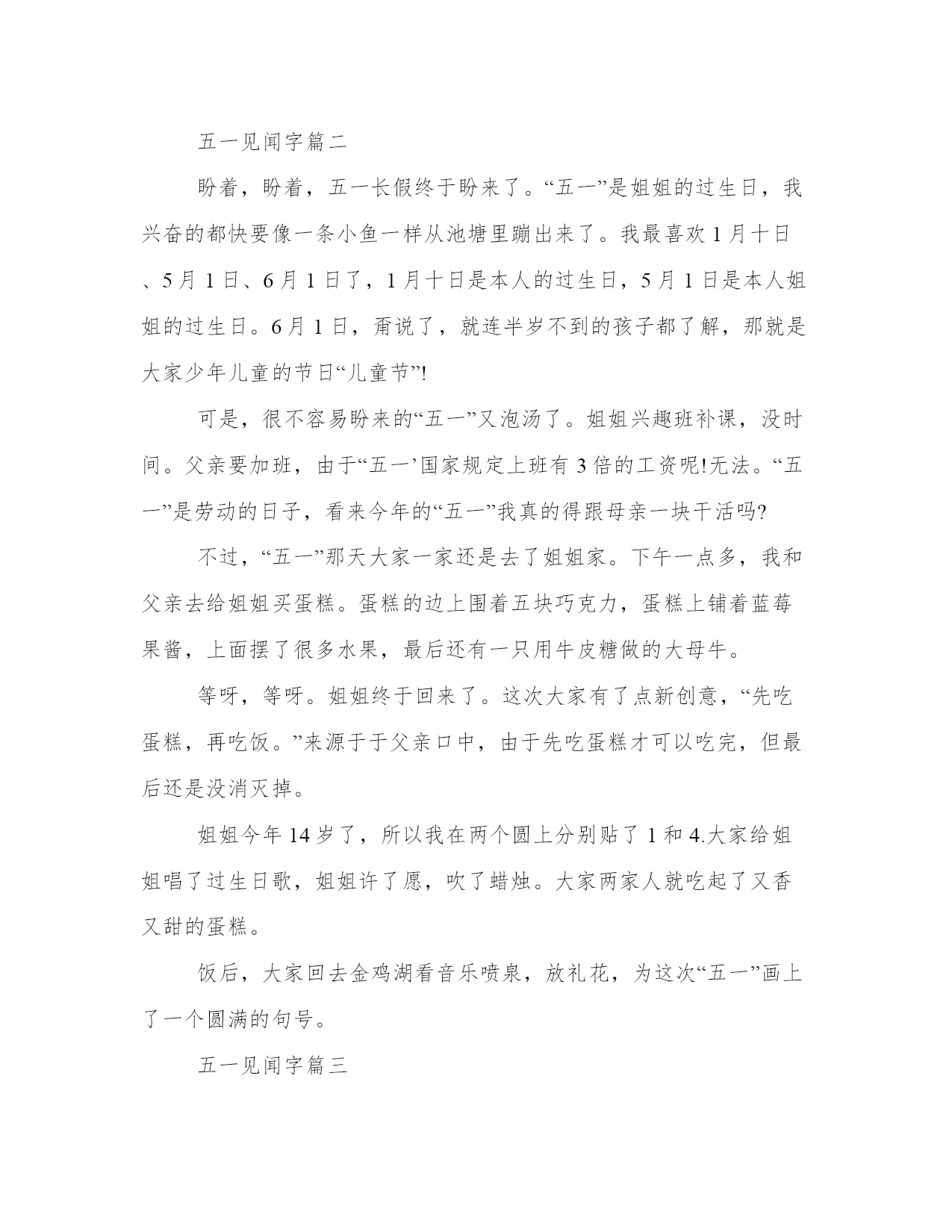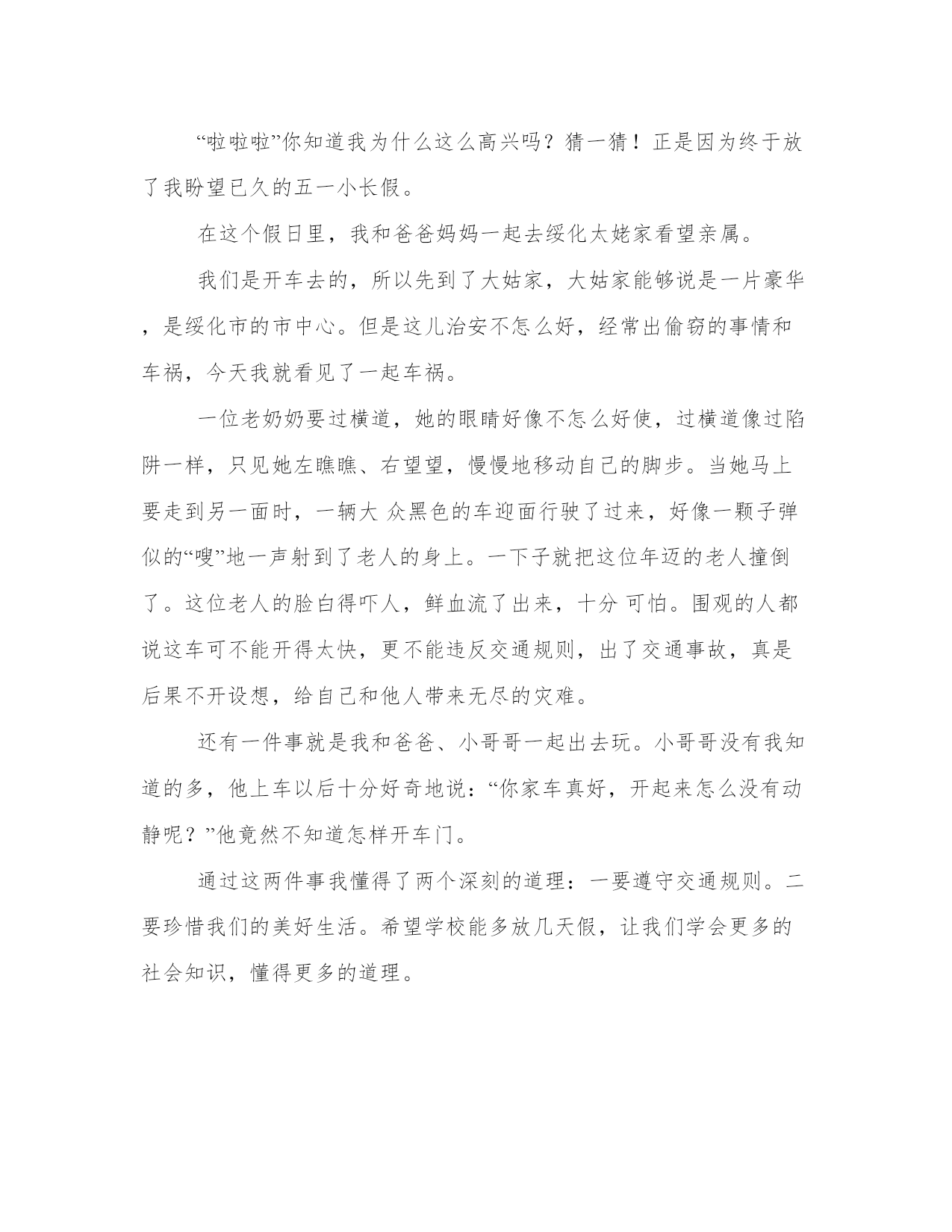 2023年五一见闻字3篇(大全)无论是身处学校还是步入社会,大家都尝试过写作吧,借助写作也可以提高我们的语言组织能力。范文怎么写才能发挥它最大的作用呢?以下是我为大家搜集的优质范文,仅供参考,一起来看看吧五一见闻字篇一这次的目标是朗诗。我们首先在学校门口的---集合,人都到齐了,我们小手拉小手,唱起了动听地歌。不一会儿,我们就到达了目的地。那里的守卫真森严,我们个个像小特工,趁他玩手机时,溜了进去。一进大门,我们都惊呆了,那里如仙境般美!郁郁葱葱的大树,争奇斗艳的花,小鸟在枝头唱着歌,蝴蝶也随着歌声跳起了舞,小池塘里的小鱼,蝌蚪和青蛙也过来凑热闹。我们向池塘冲去,像乡下的孩子把鞋袜都脱了一起去抓小蝌蚪和鱼,它们灵活极了,你刚要去抓它,它就跑的无影无踪了,像是在和我们捉迷藏......整个小区立充满了我们的笑声。蝌蚪是抓完了,可是我们的小脚都被泥巴給弄脏了,于是我们坐在池塘边,把脚伸了进去,啊!那水冰冰凉凉的,可真舒服。--眼睛骨碌一转,肯定想了什么坏主意,我一想,完了,太迟了,--用他的水管向我们喷水,我们打起了水仗,最后我们都成了落汤鸡了......啊!今天是我最开心的一天,也是我最难忘的一天!五一见闻字篇二盼着,盼着,五一长假终于盼来了。“五一”是姐姐的过生日,我兴奋的都快要像一条小鱼一样从池塘里蹦出来了。我最喜欢1月十日、5月1日、6月1日了,1月十日是本人的过生日,5月1日是本人姐姐的过生日。6月1日,甭说了,就连半岁不到的孩子都了解,那就是大家少年儿童的节日“儿童节”!可是,很不容易盼来的“五一”又泡汤了。姐姐兴趣班补课,没时间。父亲要加班,由于“五一’国家规定上班有3倍的工资呢!无法。“五一”是劳动的日子,看来今年的“五一”我真的得跟母亲一块干活吗?不过,“五一”那天大家一家还是去了姐姐家。下午一点多,我和父亲去给姐姐买蛋糕。蛋糕的边上围着五块巧克力,蛋糕上铺着蓝莓果酱,上面摆了很多水果,最后还有一只用牛皮糖做的大母牛。等呀,等呀。姐姐终于回来了。这次大家有了点新创意,“先吃蛋糕,再吃饭。”来源于于父亲口中,由于先吃蛋糕才可以吃完,但最后还是没消灭掉。姐姐今年14岁了,所以我在两个圆上分别贴了1和4.大家给姐姐唱了过生日歌,姐姐许了愿,吹了蜡烛。大家两家人就吃起了又香又甜的蛋糕。饭后,大家回去金鸡湖看音乐喷泉,放礼花,为这次“五一”画上了一个圆满的句号。五一见闻字篇三“啦啦啦”你知道我为什么这么高兴吗?猜一猜!正是因为终于放了我盼望已久的五一小长假。在这个假日里,我和爸爸妈妈一起去绥化太姥家看望亲属。我们是开车去的,所以先到了大姑家,大姑家能够说是一片豪华,是绥化市的市中心。但是这儿治安不怎么好,经常出偷窃的事情和车祸,今天我就看见了一起车祸。一位老奶奶要过横道,她的眼睛好像不怎么好使,过横道像过陷阱一样,只见她左瞧瞧、右望望,慢慢地移动自己的脚步。当她马上要走到另一面时,一辆大众黑色的车迎面行驶了过来,好像一颗子弹似的“嗖”地一声射到了老人的身上。一下子就把这位年迈的老人撞倒了。这位老人的脸白得吓人,鲜血流了出来,十分可怕。围观的人都说这车可不能开得太快,更不能违反交通规则,出了交通事故,真是后果不开设想,给自己和他人带来无尽的灾难。还有一件事就是我和爸爸、小哥哥一起出去玩。小哥哥没有我知道的多,他上车以后十分好奇地说:“你家车真好,开起来怎么没有动静呢?”他竟然不知道怎样开车门。通过这两件事我懂得了两个深刻的道理:一要遵守交通规则。二要珍惜我们的美好生活。希望学校能多放几天假,让我们学会更多的社会知识,懂得更多的道理。