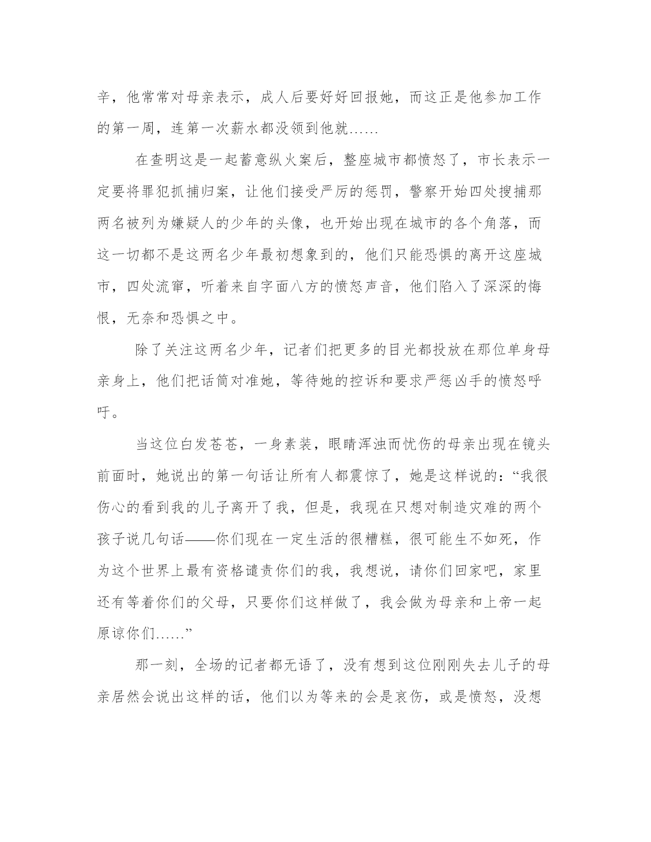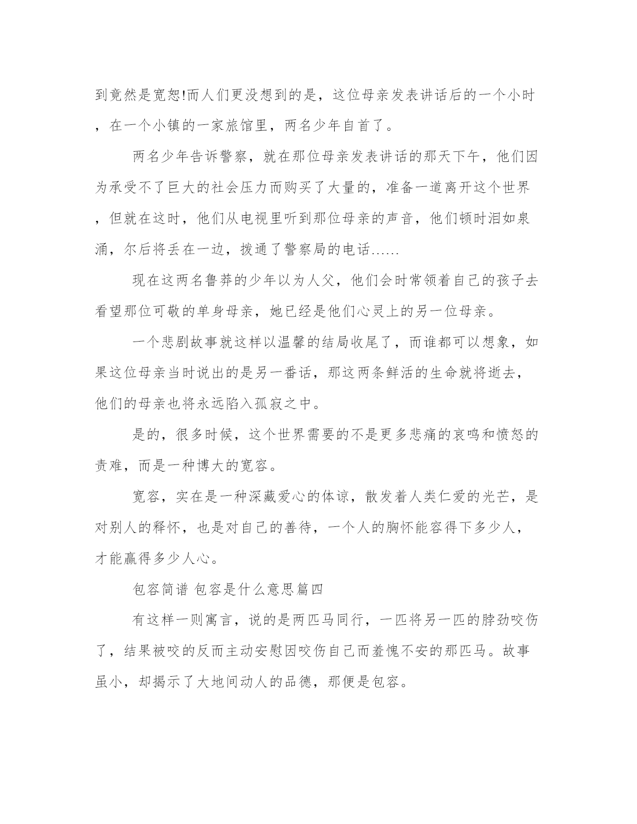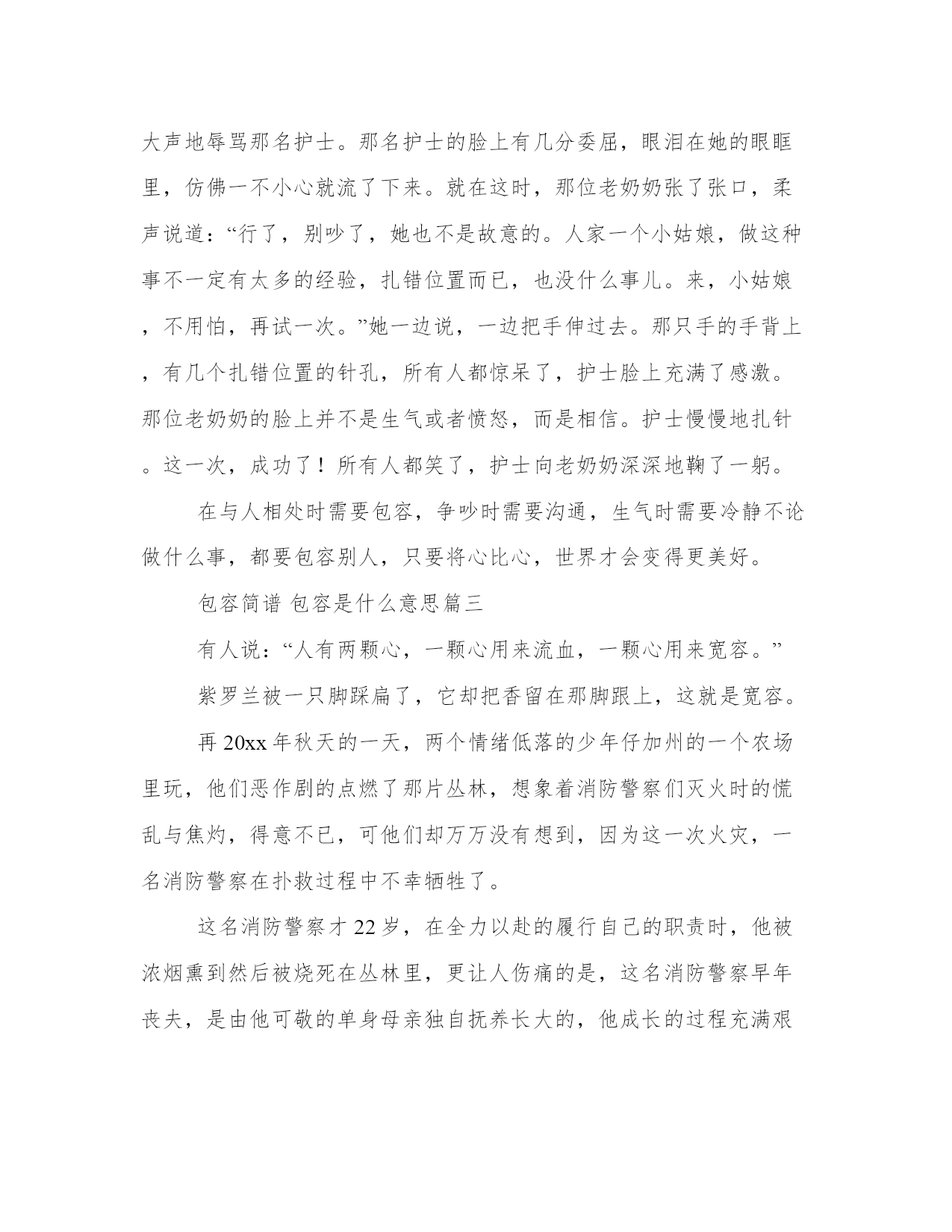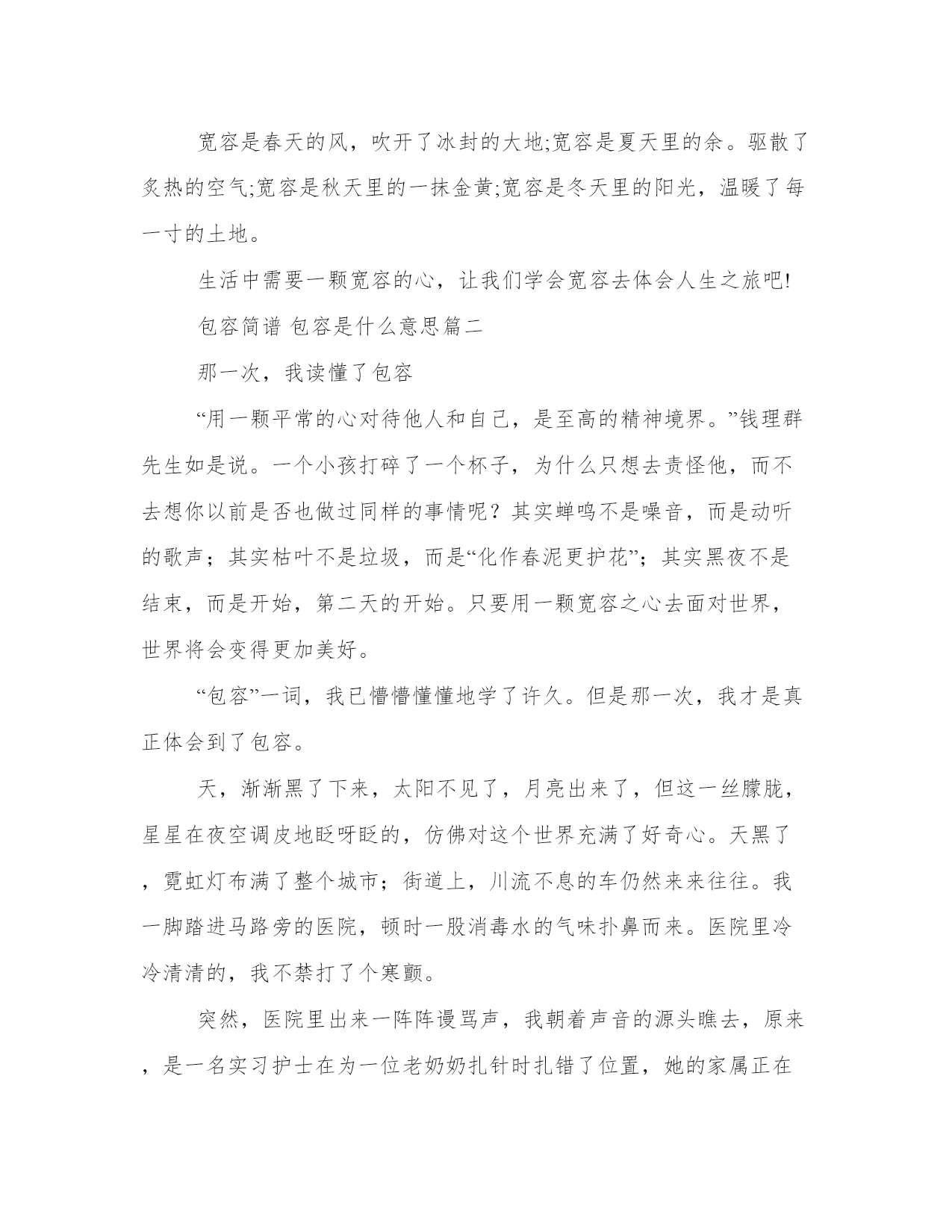 2023年包容简谱包容是什么意思5篇(大全)每个人都曾试图在平淡的学习、工作和生活中写一篇文章。写作是培养人的观察、联想、想象、思维和记忆的重要手段。那么我们该如何写一篇较为完美的范文呢?以下是小编为大家收集的优秀范文,欢迎大家分享阅读。包容简谱包容是什么意思篇一学会宽容别人,就是学会善待自己。怨恨只能永远让我们的心灵生活在黑暗之中;而宽容,却能让我们的心灵获得自由,获得解放,可以使我们的生活变的更快乐。最该忘记的是你曾帮助的人,你最应该原谅是曾经伤害过你的人;最该放弃是功过事非、名利得失,最需要学会的便是宽容别人。学会宽容别人,就等于学会善待生活。它可以让你赢得新的朋友,新的友谊,同时还会让你少一个敌人,成为融合人际关系的凝固剂。我们要做一个和和气气,大大方方,不耿耿于怀的人,用一颗宽容之心,去原谅、理解身边做错事的每一位亲戚、朋友。但宽容决不是纵容、无原则的放纵。在邪恶、丑恶面前退缩不是宽容,怜悯恶人不是宽容而是亏负好人、宽容恶霸更是欺压平民。宽容并不代表无能,更不是软弱的表现。处处宽容别人,绝不是怕事,也不是面对现实的无能为力、无可奈何,宽容恰恰是一种得体的淡泊,是一个人远见卓识、睿智、人格和心胸力量的体现。宽容是春天的风,吹开了冰封的大地;宽容是夏天里的余。驱散了炙热的空气;宽容是秋天里的一抹金黄;宽容是冬天里的阳光,温暖了每一寸的土地。生活中需要一颗宽容的心,让我们学会宽容去体会人生之旅吧!包容简谱包容是什么意思篇二那一次,我读懂了包容“用一颗平常的心对待他人和自己,是至高的精神境界。”钱理群先生如是说。一个小孩打碎了一个杯子,为什么只想去责怪他,而不去想你以前是否也做过同样的事情呢?其实蝉鸣不是噪音,而是动听的歌声;其实枯叶不是垃圾,而是“化作春泥更护花”;其实黑夜不是结束,而是开始,第二天的开始。只要用一颗宽容之心去面对世界,世界将会变得更加美好。“包容”一词,我已懵懵懂懂地学了许久。但是那一次,我才是真正体会到了包容。天,渐渐黑了下来,太阳不见了,月亮出来了,但这一丝朦胧,星星在夜空调皮地眨呀眨的,仿佛对这个世界充满了好奇心。天黑了,霓虹灯布满了整个城市;街道上,川流不息的车仍然来来往往。我一脚踏进马路旁的医院,顿时一股消毒水的气味扑鼻而来。医院里冷冷清清的,我不禁打了个寒颤。突然,医院里出来一阵阵谩骂声,我朝着声音的源头瞧去,原来,是一名实习护士在为一位老奶奶扎针时扎错了位置,她的家属正在大声地辱骂那名护士。那名护士的脸上有几分委屈,眼泪在她的眼眶里,仿佛一不小心就流了下来。就在这时,那位老奶奶张了张口,柔声说道:“行了,别吵了,她也不是故意的。人家一个小姑娘,做这种事不一定有太多的经验,扎错位置而已,也没什么事儿。来,小姑娘,不用怕,再试一次。”她一边说,一边把手伸过去。那只手的手背上,有几个扎错位置的针孔,所有人都惊呆了,护士脸上充满了感激。那位老奶奶的脸上并不是生气或者愤怒,而是相信。护士慢慢地扎针。这一次,成功了!所有人都笑了,护士向老奶奶深深地鞠了一躬。在与人相处时需要包容,争吵时需要沟通,生气时需要冷静不论做什么事,都要包容别人,只要将心比心,世界才会变得更美好。包容简谱包容是什么意思篇三有人说:“人有两颗心,一颗心用来流血,一颗心用来宽容。”紫罗兰被一只脚踩扁了,它却把香留在那脚跟上,这就是宽容。再20xx年秋天的一天,两个情绪低落的少年仔加州的一个农场里玩,他们恶作剧的点燃了那片丛林,想象着消防警察们灭火时的慌乱与焦灼,得意不已,可他们却万万没有想到,因为这一次火灾,一名消防警察在扑救过程中不幸牺牲了。这名消防警察才22岁,在全力以赴的履行自己的职责时,他被浓烟熏到然后被烧死在丛林里,更让人伤痛的是,这名消防警察早年丧夫,是由他可敬的单身母亲独自抚养长大的,他成长的过程充满艰辛,他常常对母亲表示,成人后要好好回报她,而这正是他参加工作的第一周,连第一次薪水都没领到他就……在查明这是一起蓄意纵火案后,整座城市都愤怒了,市长表示一定要将罪犯抓捕归案,让他们接受严厉的惩罚,警察开始四处搜捕那两名被列为嫌疑人的少年的头像,也开始出现在城市的各个角落,而这一切都不是这两名少年最初想象到的,他们只能恐惧的离开这座城市,四处流窜,听着来自字面八方的愤怒声音,他们陷入了深深的悔恨,无奈和恐惧之中。除了关注这两名少年,记者们把更多的目光都投放在那位单身母亲身上,他们把话筒对准她,等待她的控诉和要求严惩凶手的愤怒呼吁。当这位白发苍苍,一身素装,眼睛浑浊而忧伤的母亲出现在镜头前面时,她说出的第一句话让所有人都震惊了,她是这样说的:“我很伤心的看到我的儿子离开了我,但是,我现在只想对制造灾难的两个孩子说几句话——你们现在一定生活的很糟糕,很可能生不如死,作为这个世界上最有资格谴责你们的我,我想说,请你们回家吧,家里还