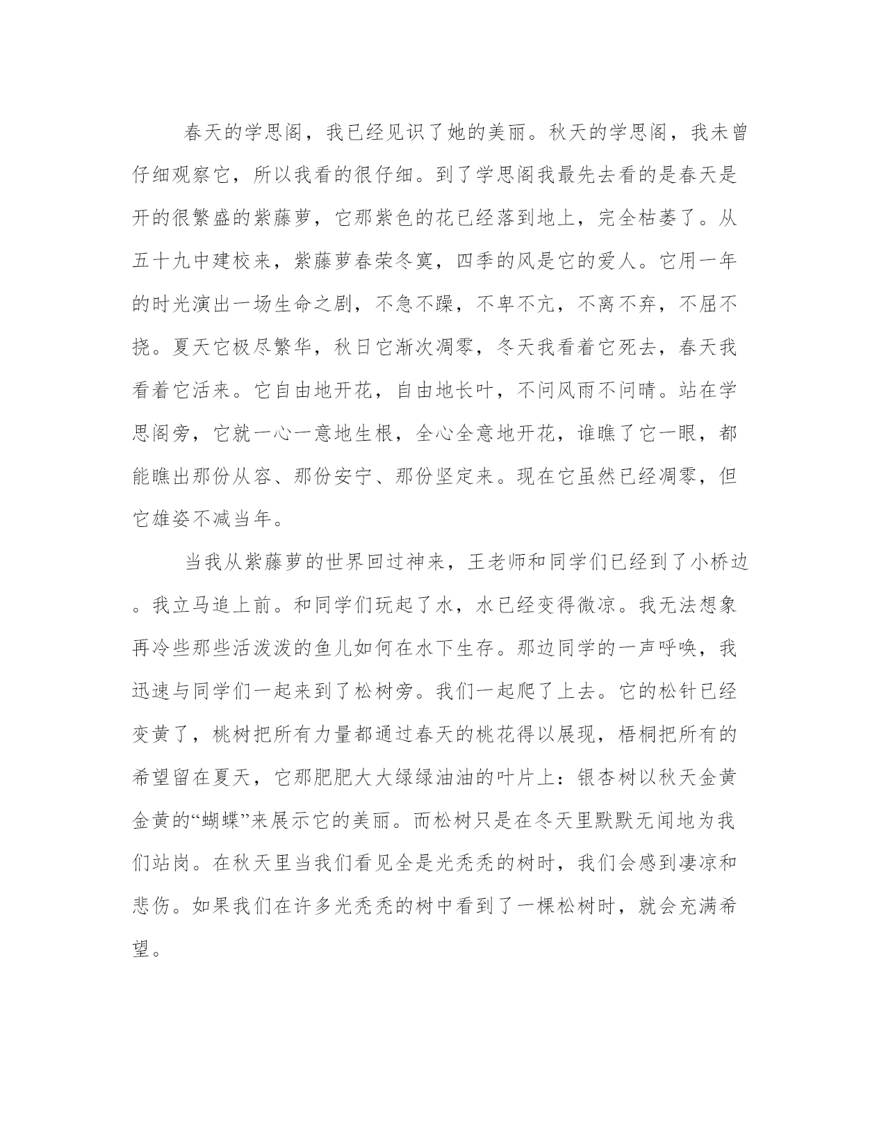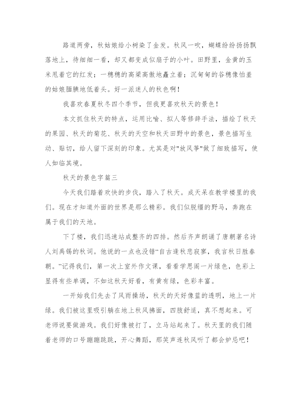 最新秋天的景色字(3篇)范文为教学中作为模范的文章,也常常用来指写作的模板。常常用于文秘写作的参考,也可以作为演讲材料编写前的参考。范文书写有哪些要求呢?我们怎样才能写好一篇范文呢?以下是小编为大家收集的优秀范文,欢迎大家分享阅读。秋天的景色字篇一秋天的天空就像小孩那张多变的脸。有时晴空万里,阳光明媚。天空是那么的高,云朵是那么的白,使人不禁想起“天高云淡,望断南飞雁”的优美诗句。有时天空阴云密布,像一潭浑浊的湖水,苦着脸,不一会儿,便滴滴答答地下起了雨,这连绵不断秋雨,一下起来就没完没了,真是“秋风秋雨愁煞人”。秋天的树木是多姿多彩的。大部分树木的叶子都开始凋零,每当一阵秋风吹过,枯黄的树叶就像一群蝴蝶在空中翩翩起舞似的,盘旋着、盘旋着,最后落下;而像枫树一样的一些树木,天气越冷,树叶越变的鲜红。一簇簇,远远望去像一团团火焰在燃烧;还有松柏一类的树木,依然四季常青,在寒冷的天气中,它们愈发挺拔苍翠,给秋天的原野增添一片生机。秋天的花园依然是五彩缤纷的。各种花草争奇斗艳,令人眼花缭乱。一串红,格外的鲜艳耀眼。远远望去就像一团红色的云朵;菊花则展示“满城尽带黄金甲”风范,在瑟瑟的秋风中,满地金黄的菊花,惹人喜爱,淡淡的清香,沁人心脾。走到田野里,山坡上,一眼望去,金灿灿的一大片,满是繁花似锦的野菊花。秋天的果园,果实累累。你看树上的苹果红艳艳、香喷喷的。令人馋涎欲滴,上去摘一个个苹果,咬上一口,一直甜到人的心里,满嘴都是香气。黄澄澄的梨子也上市了,看着它好像在叫你似的,叫人无法抗拒。毛茸茸的猕猴桃更是引人注目,别看见它的长相非常难看,可是吃在嘴里,却非常可口。一阵甜,一阵酸,令人舒服到每个毛孔。咦?那是什么,像一个个红灯笼似的挂在树上,想快要掉下来似的。令你不由自主的想要把它接住。走近一看,噢!原来是柿子呀!这柿子看起来不怎样,可是吃起来却十分爽口。秋天是丰收的田野。到处是丰收的果实,到处是忙碌的农民。春华秋实,一年的汗水,得到了回报。丰收的田野里,农民伯伯又撒下希望的种子,播下来年的希望。在农家的屋檐下,到处充满了欢声笑语。家乡的秋天啊!你太迷人了!我要大声的为你歌唱,为你献上一首最美的歌!家乡的秋天啊!我祝福你,我要为你描绘美好的未来,愿你的明天更加的美好!秋天的景色字篇二飘飘洒洒一夜的细雨,换来了清远明亮的小曲,吹散了夏的炎热,吹来了凉爽的秋天。秋天是丰收的季节,果园里硕果累累。黄澄澄的柿子像一个个灯笼高挂枝头,红彤彤的苹果像一个个挤在一起的胖娃娃,扒开树叶往外瞧。亮晶晶的葡萄像绿玛瑙般透射出诱人的色彩……赏心悦目之余,你会禁不住垂涎欲滴,真想这一个尝尝!风,轻轻地、温和的吹着。瞧!秋姑娘把这里装扮的多么美丽。看那菊花开的多么热烈!多么旺盛!红的、黄的、白的、粉的……一朵朵、一簇簇,迎着秋风,披着寒霜,争芳斗艳,眼睛应接不暇,那么多的菊花,一朵挨着一朵,仿佛要把它全部的生命力展示给我们看。这瞬间,这里仿佛变成了一个锦簇的世界!秋的.天空静静的,像一潭深沉的湖水,蓝的无可比拟,确有“天高任鸟飞的”高远之感。高空中,一只“蝴蝶”在和一只“蜻蜓”比舞。只见,“蝴蝶”在空中自由自在地飞翔,活似一位亭亭玉立的仙女在舞蹈。“蜻蜓”的主人也不甘示弱,不停地放着手中的线轴。你看!“蜻蜓”在绕着“蝴蝶”飞呢,它可以与“蝴蝶”相媲美。在它们的旁边,有两只“老鹰”在比翼高飞。哟!一只“蜈蚣”正扭着它那长长的身子,很是可爱!不一会儿,观看的人越来越多,空中又飞来了几只“大雁”。此时,天空好像活了似的。人们一个个个个仰面朝天,指指点点,手里不停地比划着,议论着。煞是热闹!我们去果园采摘了诱人的果实,又去了花园欣赏了迷人的菊花,然后我们又观看了空中精彩的风筝表演,何不要去路边散散步呢?路道两旁,秋姑娘给小树染了金发。秋风一吹,蝴蝶纷纷扬扬飘落地上,待细细一看,却又都变成似扇子的小叶。田野里,金黄的玉米甩着它的红发;一穗穗的高梁高傲地矗立着;沉甸甸的谷穗像怕羞的姑娘腼腆地低着头。好一派迷人的秋色啊!我喜欢春夏秋冬四个季节,但我更喜欢秋天的景色!本文抓住秋天的特点,运用比喻、拟人等修辞手法,描绘了秋天的果园、秋天的菊花、秋天的天空和秋天田野中的景色,景色描写生动、贴切,给人留下深刻的印象。尤其是对"放风筝"做了细致描写,使人如临其境。秋天的景色字篇三今天我们踏着欢快的步伐,踏入了秋天。成天呆在教学楼里的我们。现在才知道外面的世界是那么精彩。我们似脱缰的野马,奔跑在属于我们的天地。下了楼,我们迅速站成整齐的四排。然后齐声朗诵了唐朝著名诗人刘禹锡的秋词。他说的一点也没错“自古逢秋悲寂寥,我言秋日胜春朝。”记得我们,第一次上室外作文课,看看学思阁一片绿色,色彩上显得有些单调,不如这秋天好看,有黄有绿,色彩丰富。一开始我们先去了风雨操场,秋天的天好像蓝的透明,地