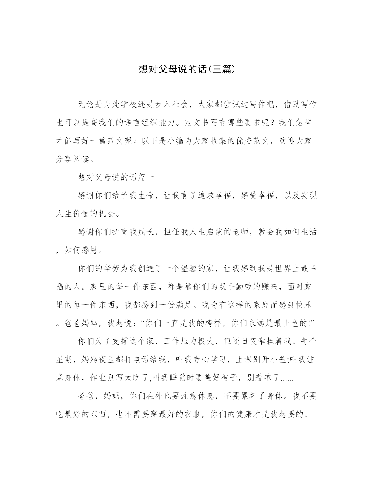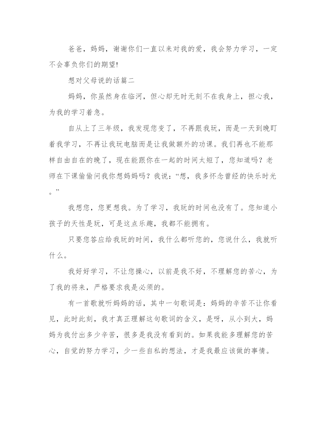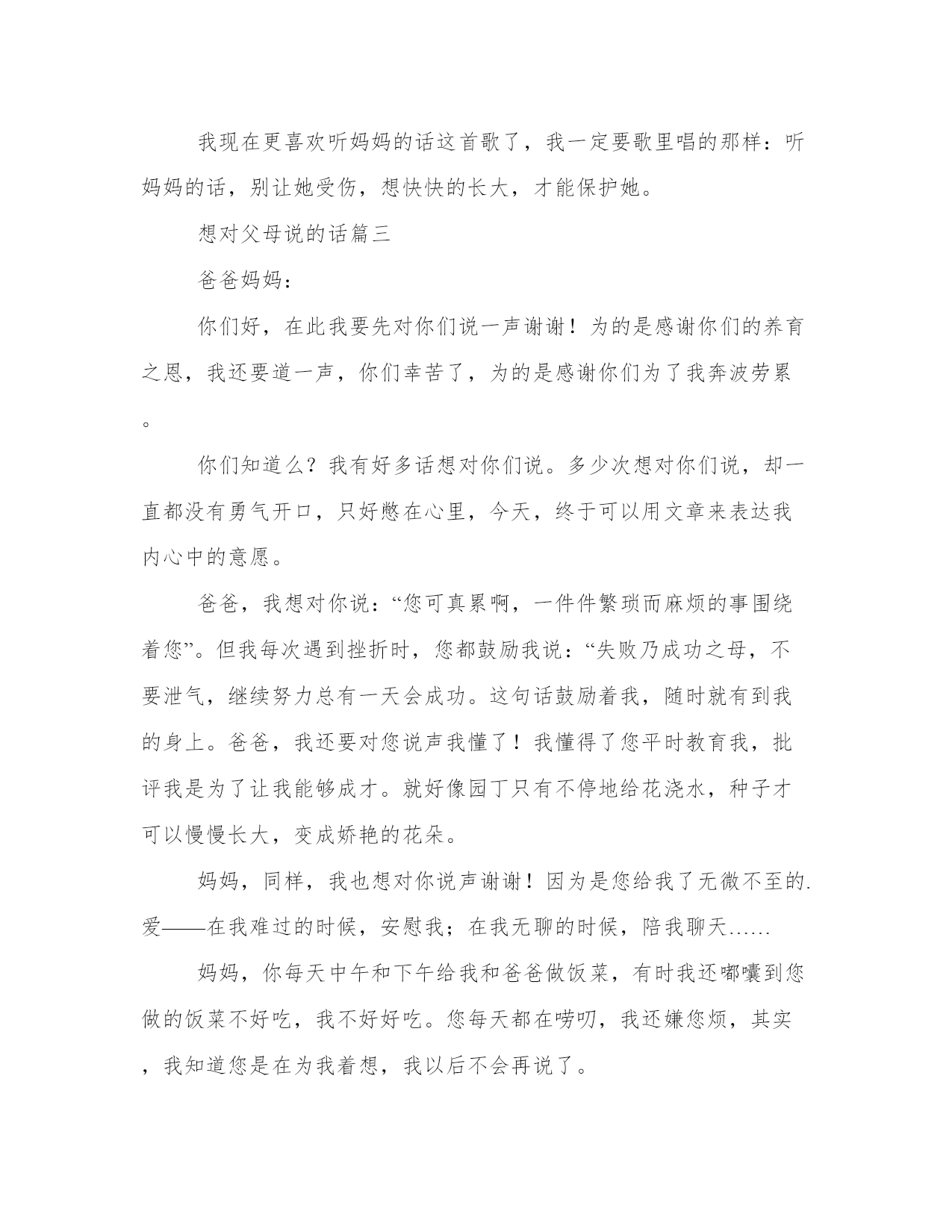想对父母说的话(三篇)无论是身处学校还是步入社会,大家都尝试过写作吧,借助写作也可以提高我们的语言组织能力。范文书写有哪些要求呢?我们怎样才能写好一篇范文呢?以下是小编为大家收集的优秀范文,欢迎大家分享阅读。想对父母说的话篇一感谢你们给予我生命,让我有了追求幸福,感受幸福,以及实现人生价值的机会。感谢你们抚育我成长,担任我人生启蒙的老师,教会我如何生活,如何感恩。你们的辛劳为我创造了一个温馨的家,让我感到我是世界上最幸福的人。家里的每一件东西,都是靠你们的双手勤劳的赚来,面对家里的每一件东西,我都感到一份满足。我为有这样的家庭而感到快乐。爸爸妈妈,我想说:“你们一直是我的榜样,你们永远是最出色的!”你们为了支撑这个家,工作压力极大,但还日夜牵挂着我。每个星期,妈妈夜里都打电话给我,叫我专心学习,上课别开小差;叫我注意身体,作业别写太晚了;叫我睡觉时要盖好被子,别着凉了......爸爸,妈妈,你们在外也要注意休息,不要累坏了身体。我不要吃最好的东西,也不需要穿最好的衣服,你们的健康才是我想要的。爸爸,妈妈,谢谢你们一直以来对我的爱,我会努力学习,一定不会辜负你们的期望!想对父母说的话篇二妈妈,你虽然身在临河,但心却无时无刻不在我身上,担心我,为我的学习着急。自从上了三年级,我发现您变了,不再跟我玩,而是一天到晚盯着我学习,不再让我玩电脑而是让我做额外的功课。我们再也不能那样自由自在的晚了,现在能跟你在一起的时间太短了,您知道吗?老师在下课偷偷问我你想妈妈吗?我说:“想,我多怀念曾经的快乐时光。”我想您,您更想我。为了学习,我玩的时间也没有了。您知道小孩子的天性是玩,可是这点乐趣,我都不能拥有。只要您答应给我玩的时间,我什么都听您的,您说什么,我就听什么。我好好学习,不让您操心,以前是我不好,不理解您的苦心,为了我的将来,严格要求我是必须的。有一首歌就听妈妈的话,其中一句歌词是:妈妈的辛苦不让你看见,此时此刻,我才真正理解这句歌词的含义,是呀,从小到大,妈妈为我付出多少辛苦,很多是我没有看到的。如果我能多理解您的苦心,自觉的努力学习,少一些自私的想法,才是我最应该做的事情。我现在更喜欢听妈妈的话这首歌了,我一定要歌里唱的那样:听妈妈的话,别让她受伤,想快快的长大,才能保护她。想对父母说的话篇三爸爸妈妈:你们好,在此我要先对你们说一声谢谢!为的是感谢你们的养育之恩,我还要道一声,你们幸苦了,为的是感谢你们为了我奔波劳累。你们知道么?我有好多话想对你们说。多少次想对你们说,却一直都没有勇气开口,只好憋在心里,今天,终于可以用文章来表达我内心中的意愿。爸爸,我想对你说:“您可真累啊,一件件繁琐而麻烦的事围绕着您”。但我每次遇到挫折时,您都鼓励我说:“失败乃成功之母,不要泄气,继续努力总有一天会成功。这句话鼓励着我,随时就有到我的身上。爸爸,我还要对您说声我懂了!我懂得了您平时教育我,批评我是为了让我能够成才。就好像园丁只有不停地给花浇水,种子才可以慢慢长大,变成娇艳的花朵。妈妈,同样,我也想对你说声谢谢!因为是您给我了无微不至的.爱——在我难过的时候,安慰我;在我无聊的时候,陪我聊天……妈妈,你每天中午和下午给我和爸爸做饭菜,有时我还嘟囔到您做的饭菜不好吃,我不好好吃。您每天都在唠叨,我还嫌您烦,其实,我知道您是在为我着想,我以后不会再说了。爸爸妈妈,你们为我而操碎了心,我非常感谢你们的养育之恩,谢谢你们给了我生命,给了我一个快乐的童年。