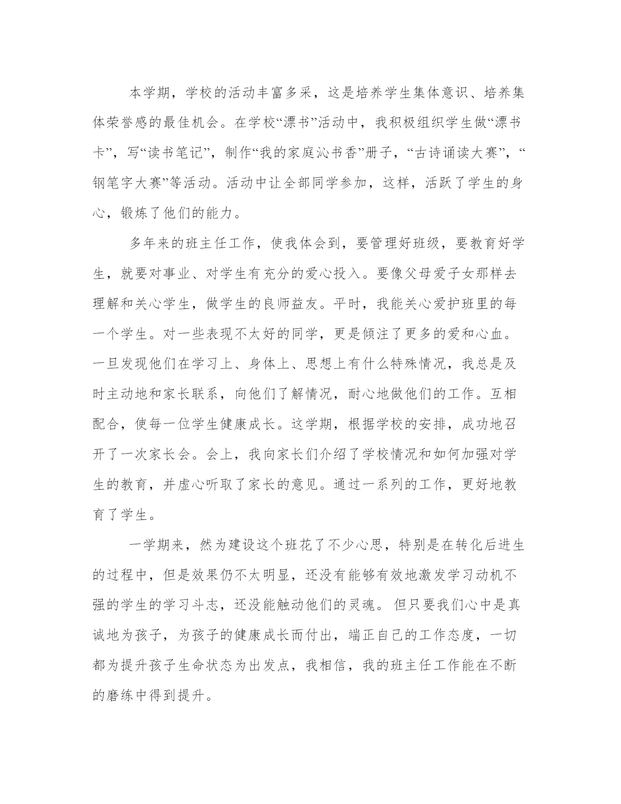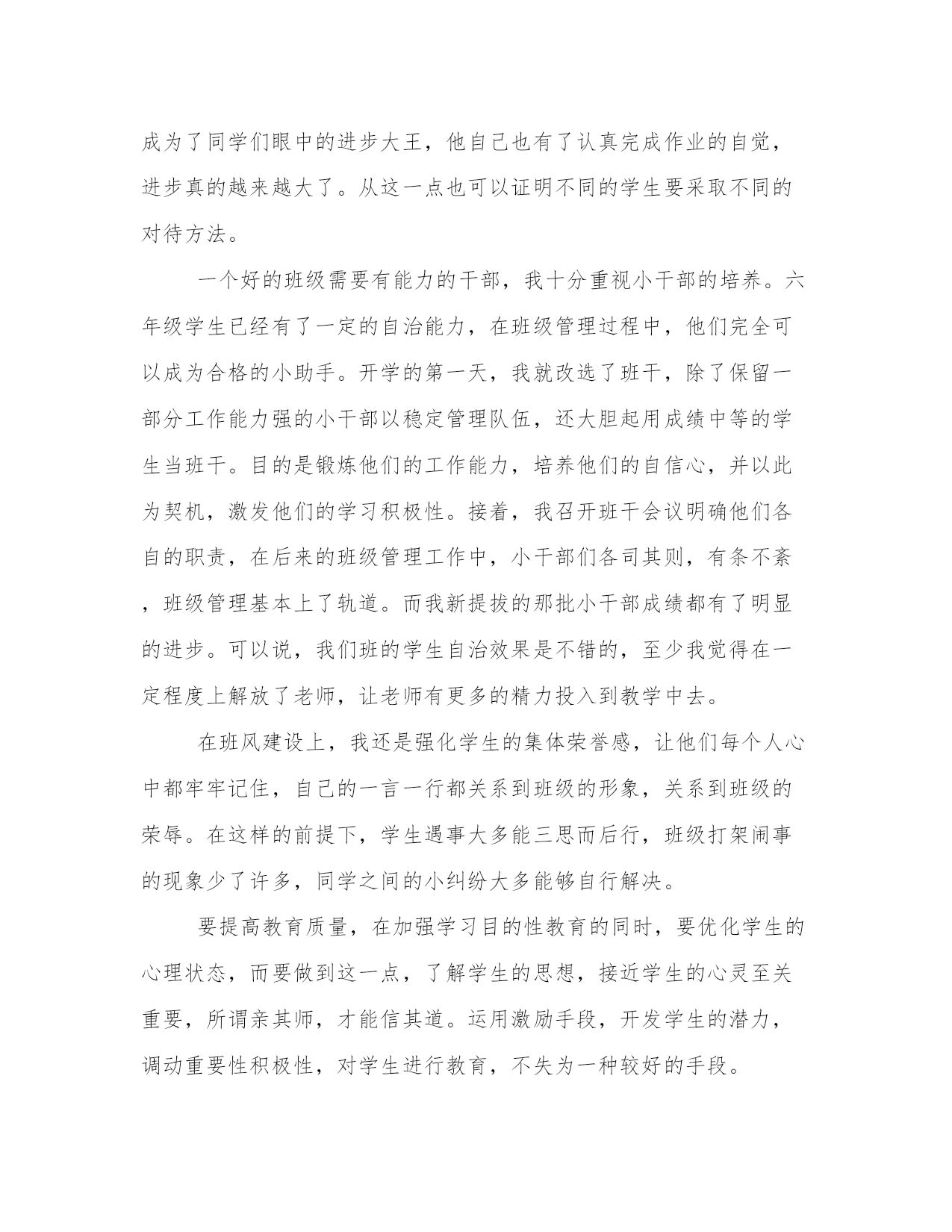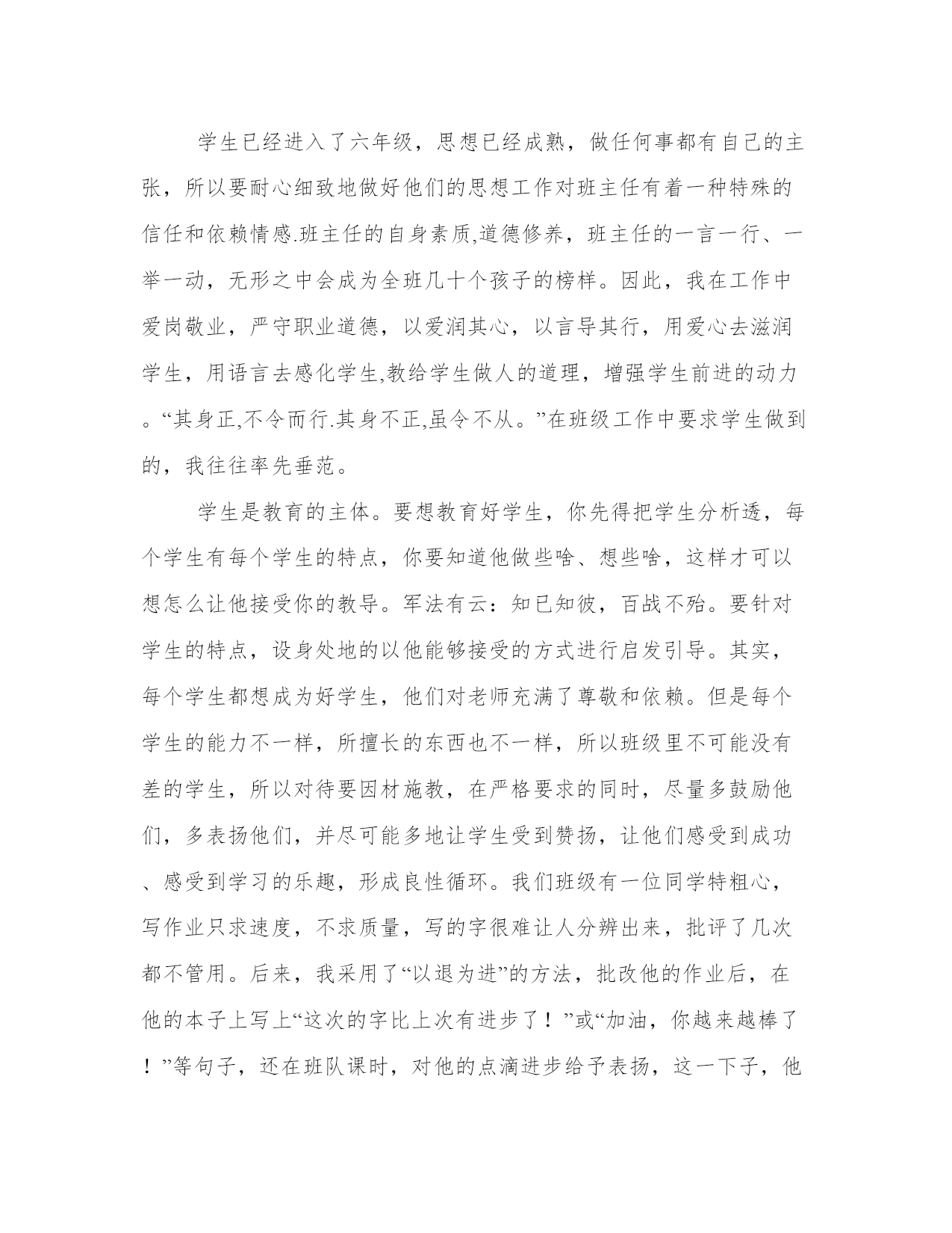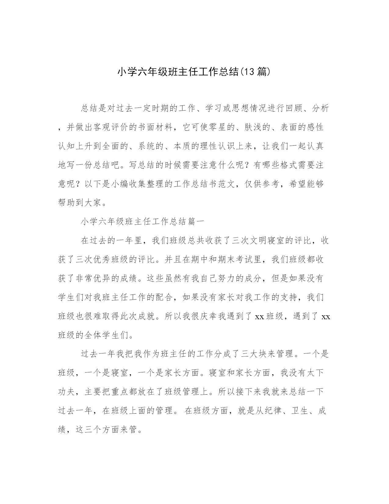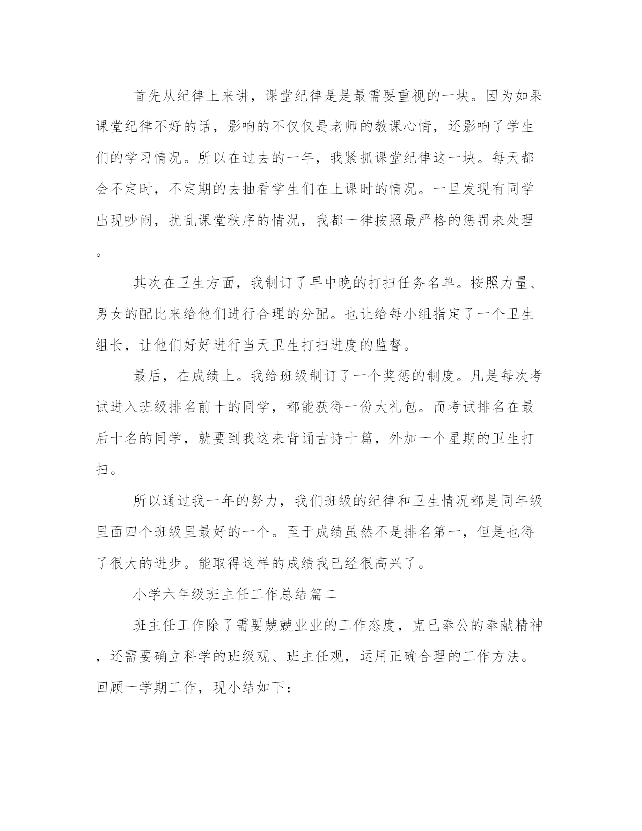 小学六年级班主任工作总结(13篇)总结是对过去一定时期的工作、学习或思想情况进行回顾、分析,并做出客观评价的书面材料,它可使零星的、肤浅的、表面的感性认知上升到全面的、系统的、本质的理性认识上来,让我们一起认真地写一份总结吧。写总结的时候需要注意什么呢?有哪些格式需要注意呢?以下是小编收集整理的工作总结书范文,仅供参考,希望能够帮助到大家。小学六年级班主任工作总结篇一在过去的一年里,我们班级总共收获了三次文明寝室的评比,收获了三次优秀班级的评比。并且在期中和期末考试里,我们班级都收获了非常优异的成绩。这些虽然有我自己努力的成分,但是如果没有学生们对我班主任工作的配合,如果没有家长对我工作的支持,我们班级也很难取得此次成就。所以我很庆幸我遇到了xx班级,遇到了xx班级的全体学生们。过去一年我把我作为班主任的工作分成了三大块来管理。一个是班级,一个是寝室,一个是家长方面。寝室和家长方面,我没有太下功夫,主要把重点都放在了班级管理上。所以接下来我就来总结一下过去一年,在班级上面的管理。在班级方面,就是从纪律、卫生、成绩,这三个方面来管。首先从纪律上来讲,课堂纪律是是最需要重视的一块。因为如果课堂纪律不好的话,影响的不仅仅是老师的教课心情,还影响了学生们的学习情况。所以在过去的一年,我紧抓课堂纪律这一块。每天都会不定时,不定期的去抽看学生们在上课时的情况。一旦发现有同学出现吵闹,扰乱课堂秩序的情况,我都一律按照最严格的惩罚来处理。其次在卫生方面,我制订了早中晚的打扫任务名单。按照力量、男女的配比来给他们进行合理的分配。也让给每小组指定了一个卫生组长,让他们好好进行当天卫生打扫进度的监督。最后,在成绩上。我给班级制订了一个奖惩的制度。凡是每次考试进入班级排名前十的同学,都能获得一份大礼包。而考试排名在最后十名的同学,就要到我这来背诵古诗十篇,外加一个星期的卫生打扫。所以通过我一年的努力,我们班级的纪律和卫生情况都是同年级里面四个班级里最好的一个。至于成绩虽然不是排名第一,但是也得了很大的进步。能取得这样的成绩我已经很高兴了。小学六年级班主任工作总结篇二班主任工作除了需要兢兢业业的工作态度,克已奉公的奉献精神,还需要确立科学的班级观、班主任观,运用正确合理的工作方法。回顾一学期工作,现小结如下:学生已经进入了六年级,思想已经成熟,做任何事都有自己的主张,所以要耐心细致地做好他们的思想工作对班主任有着一种特殊的信任和依赖情感.班主任的自身素质,道德修养,班主任的一言一行、一举一动,无形之中会成为全班几十个孩子的榜样。因此,我在工作中爱岗敬业,严守职业道德,以爱润其心,以言导其行,用爱心去滋润学生,用语言去感化学生,教给学生做人的道理,增强学生前进的动力。“其身正,不令而行.其身不正,虽令不从。”在班级工作中要求学生做到的,我往往率先垂范。学生是教育的主体。要想教育好学生,你先得把学生分析透,每个学生有每个学生的特点,你要知道他做些啥、想些啥,这样才可以想怎么让他接受你的教导。军法有云:知已知彼,百战不殆。要针对学生的特点,设身处地的以他能够接受的方式进行启发引导。其实,每个学生都想成为好学生,他们对老师充满了尊敬和依赖。但是每个学生的能力不一样,所擅长的东西也不一样,所以班级里不可能没有差的学生,所以对待要因材施教,在严格要求的同时,尽量多鼓励他们,多表扬他们,并尽可能多地让学生受到赞扬,让他们感受到成功、感受到学习的乐趣,形成良性循环。我们班级有一位同学特粗心,写作业只求速度,不求质量,写的字很难让人分辨出来,批评了几次都不管用。后来,我采用了“以退为进”的方法,批改他的作业后,在他的本子上写上“这次的字比上次有进步了!”或“加油,你越来越棒了!”等句子,还在班队课时,对他的点滴进步给予表扬,这一下子,他成为了同学们眼中的进步大王,他自己也有了认真完成作业的自觉,进步真的越来越大了。从这一点也可以证明不同的学生要采取不同的对待方法。一个好的班级需要有能力的干部,我十分重视小干部的培养。六年级学生已经有了一定的自治能力,在班级管理过程中,他们完全可以成为合格的小助手。开学的第一天,我就改选了班干,除了保留一部分工作能力强的小干部以稳定管理队伍,还大胆起用成绩中等的学生当班干。目的是锻炼他们的工作能力,培养他们的自信心,并以此为契机,激发他们的学习积极性。接着,我召开班干会议明确他们各自的职责,在后来的班级管理工作中,小干部们各司其则,有条不紊,班级管理基本上了轨道。而我新提拔的那批小干部成绩都有了明显的进步。可以说,我们班的学生自治效果是不错的,至少我觉得在一定程度上解放了老师,让老师有更多的精力投入到教学中去。在班风建设上,我还是强化学生的集体荣誉感,让他们每个人心中都牢牢记住,自己的一言一行都关系到班级的形象,关系到班级的荣辱。在这样的