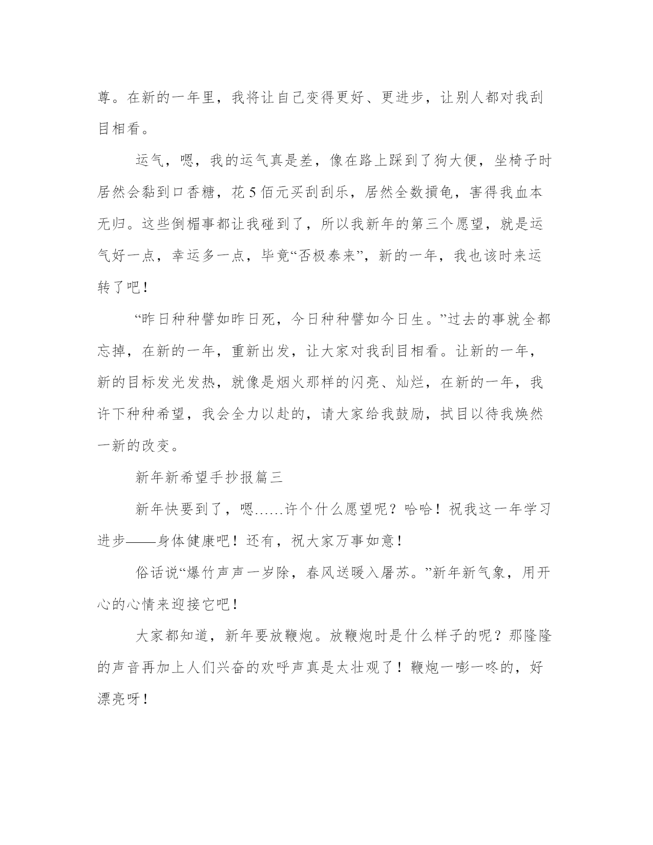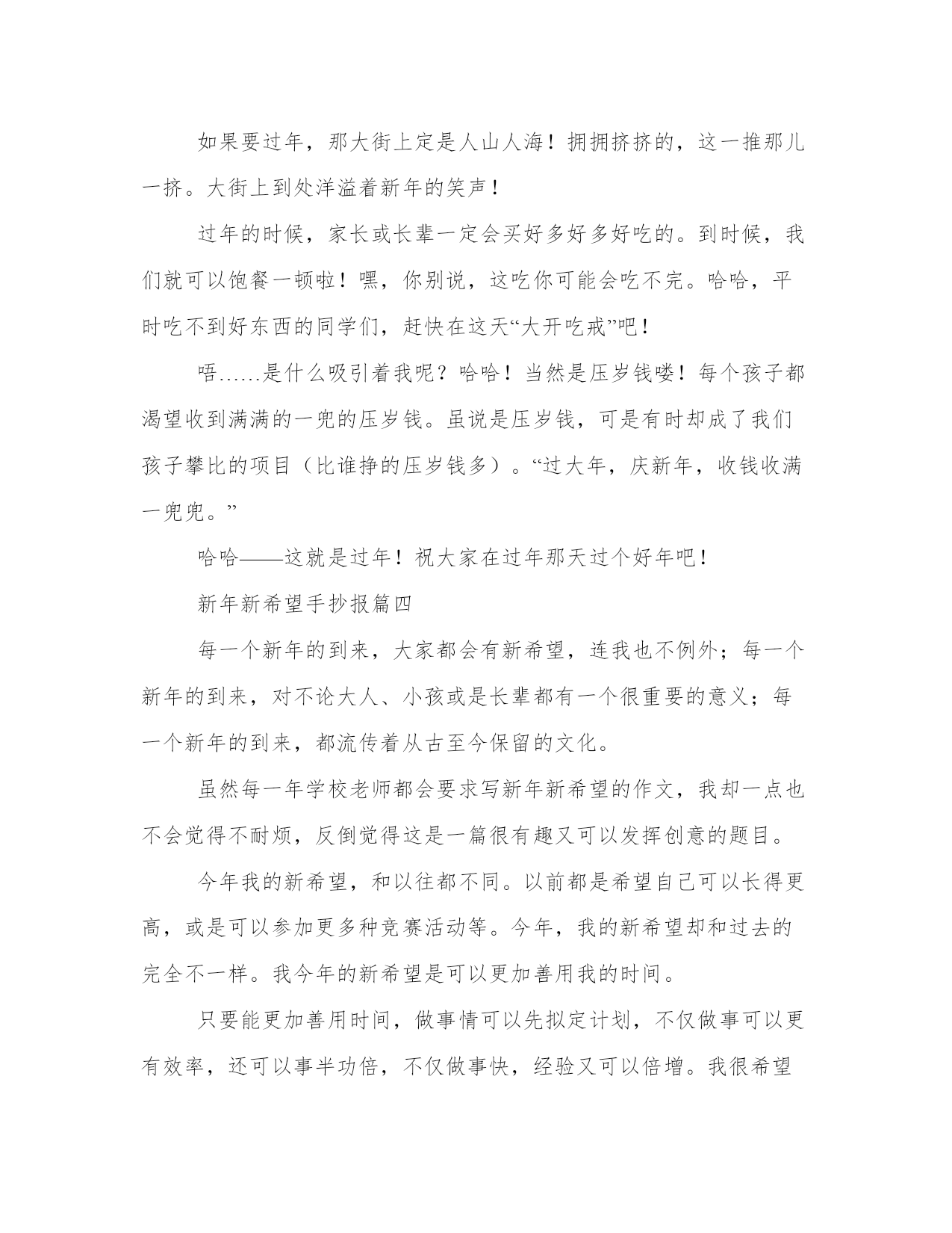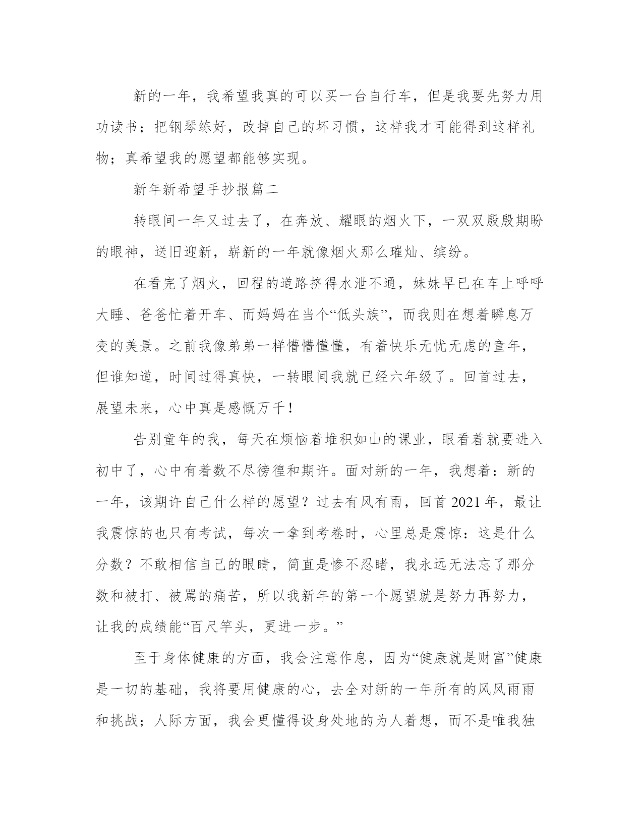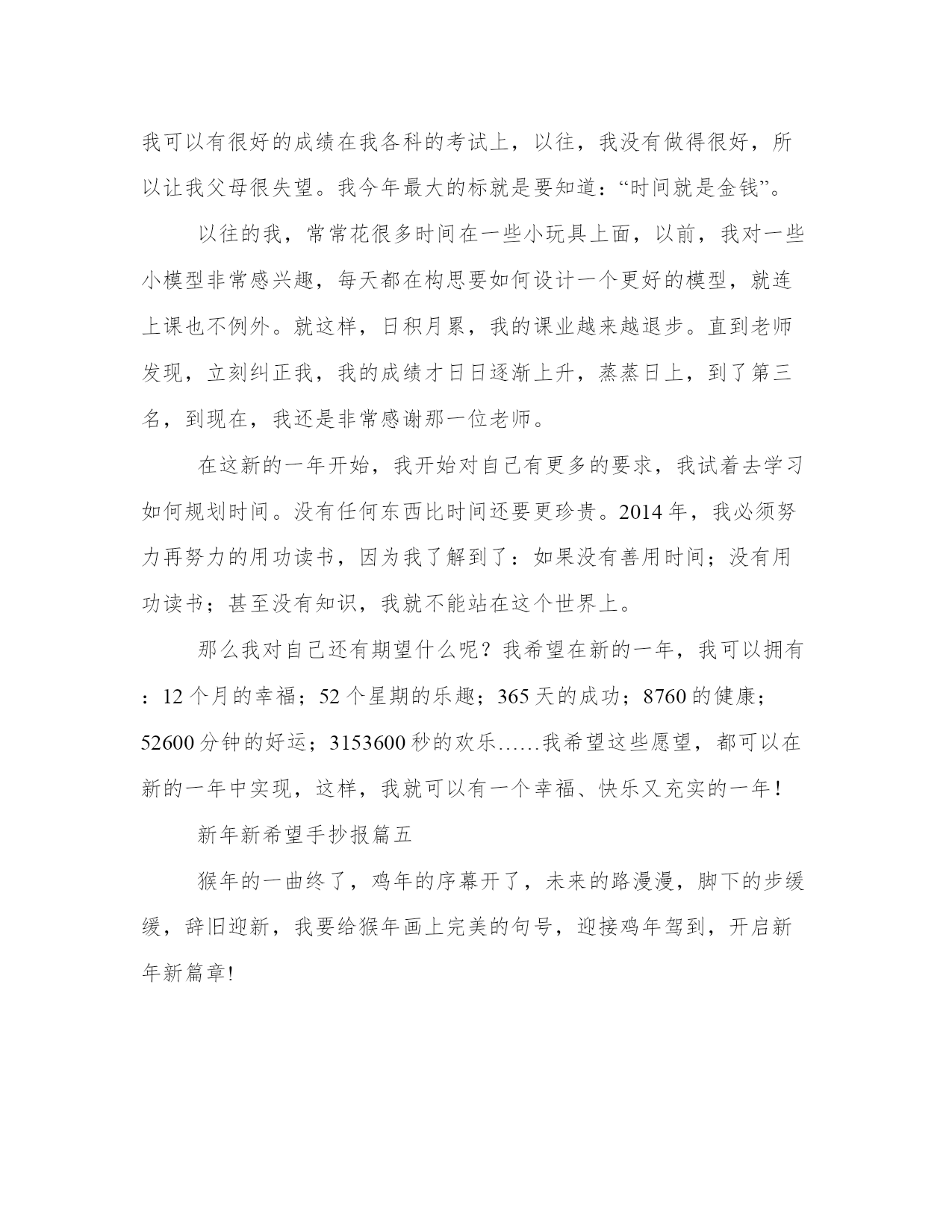 新年新希望手抄报大全(七篇)在日常学习、工作或生活中,大家总少不了接触作文或者范文吧,通过文章可以把我们那些零零散散的思想,聚集在一块。相信许多人会觉得范文很难写?以下是小编为大家收集的优秀范文,欢迎大家分享阅读。新年新希望手抄报篇一新的一年,我最想得到的礼物是一台全新的自行车;因为我可以骑着自行车出去兜风、买东西吃、骑去游乐区玩、还可以跟哥哥一起比赛谁骑得最快;如果今年可以得到一台自行车,我觉得那真是太棒了!我也希望我的钢琴能力可以变好,这样我就可以去各地演奏钢琴,得很多奖杯、奖状,还可以跟哥哥一起比赛谁弹得钢琴最好,所以我希望今年每天都至少练一个小时的钢琴,这样我弹的钢琴才不会输给哥哥,还可以弹出美妙的声音,给爸爸妈妈欣赏。在过去的一年里,我有一些偷懒的行为,例如:有时候不写作业;没有多看一些课外读物,还有我超级爱睡觉,放假的时候;常常睡到11点,爸爸说早起的鸟儿有虫吃,所以新的一年;我要改掉这个坏习惯,做早起的鸟儿,让生活更充实。在新的一年里,希望爸爸的工作顺利、工作赚大钱;希望我们全家人平平安安,身体健康,也希望大家能够快乐的过每一天。新的一年,我希望我真的可以买一台自行车,但是我要先努力用功读书;把钢琴练好,改掉自己的坏习惯,这样我才可能得到这样礼物;真希望我的愿望都能够实现。新年新希望手抄报篇二转眼间一年又过去了,在奔放、耀眼的烟火下,一双双殷殷期盼的眼神,送旧迎新,崭新的一年就像烟火那么璀灿、缤纷。在看完了烟火,回程的道路挤得水泄不通,妹妹早已在车上呼呼大睡、爸爸忙着开车、而妈妈在当个“低头族”,而我则在想着瞬息万变的美景。之前我像弟弟一样懵懵懂懂,有着快乐无忧无虑的童年,但谁知道,时间过得真快,一转眼间我就已经六年级了。回首过去,展望未来,心中真是感慨万千!告别童年的我,每天在烦恼着堆积如山的课业,眼看着就要进入初中了,心中有着数不尽徬徨和期许。面对新的一年,我想着:新的一年,该期许自己什么样的愿望?过去有风有雨,回首2021年,最让我震惊的也只有考试,每次一拿到考卷时,心里总是震惊:这是什么分数?不敢相信自己的眼睛,简直是惨不忍睹,我永远无法忘了那分数和被打、被駡的痛苦,所以我新年的第一个愿望就是努力再努力,让我的成绩能“百尺竿头,更进一步。”至于身体健康的方面,我会注意作息,因为“健康就是财富”健康是一切的基础,我将要用健康的心,去全对新的一年所有的风风雨雨和挑战;人际方面,我会更懂得设身处地的为人着想,而不是唯我独尊。在新的一年里,我将让自己变得更好、更进步,让别人都对我刮目相看。运气,嗯,我的运气真是差,像在路上踩到了狗大便,坐椅子时居然会黏到口香糖,花5佰元买刮刮乐,居然全数摃龟,害得我血本无归。这些倒楣事都让我碰到了,所以我新年的第三个愿望,就是运气好一点,幸运多一点,毕竟“否极泰来”,新的一年,我也该时来运转了吧!“昨日种种譬如昨日死,今日种种譬如今日生。”过去的事就全都忘掉,在新的一年,重新出发,让大家对我刮目相看。让新的一年,新的目标发光发热,就像是烟火那样的闪亮、灿烂,在新的一年,我许下种种希望,我会全力以赴的,请大家给我鼓励,拭目以待我焕然一新的改变。新年新希望手抄报篇三新年快要到了,嗯……许个什么愿望呢?哈哈!祝我这一年学习进步——身体健康吧!还有,祝大家万事如意!俗话说“爆竹声声一岁除,春风送暖入屠苏。”新年新气象,用开心的心情来迎接它吧!大家都知道,新年要放鞭炮。放鞭炮时是什么样子的呢?那隆隆的声音再加上人们兴奋的欢呼声真是太壮观了!鞭炮一嘭一咚的,好漂亮呀!如果要过年,那大街上定是人山人海!拥拥挤挤的,这一推那儿一挤。大街上到处洋溢着新年的笑声!过年的时候,家长或长辈一定会买好多好多好吃的。到时候,我们就可以饱餐一顿啦!嘿,你别说,这吃你可能会吃不完。哈哈,平时吃不到好东西的同学们,赶快在这天“大开吃戒”吧!唔……是什么吸引着我呢?哈哈!当然是压岁钱喽!每个孩子都渴望收到满满的一兜的压岁钱。虽说是压岁钱,可是有时却成了我们孩子攀比的项目(比谁挣的压岁钱多)。“过大年,庆新年,收钱收满一兜兜。”哈哈——这就是过年!祝大家在过年那天过个好年吧!新年新希望手抄报篇四每一个新年的到来,大家都会有新希望,连我也不例外;每一个新年的到来,对不论大人、小孩或是长辈都有一个很重要的意义;每一个新年的到来,都流传着从古至今保留的文化。虽然每一年学校老师都会要求写新年新希望的作文,我却一点也不会觉得不耐烦,反倒觉得这是一篇很有趣又可以发挥创意的题目。今年我的新希望,和以往都不同。以前都是希望自己可以长得更高,或是可以参加更多种竞赛活动等。今年,我的新希望却和过去的完全不一样。我今年的新希望是可以更加善用我的时间。只要能更加善用时间,做事情可以先拟定计划,不仅做事可以更有效率,还可以事半功倍,不仅做事快