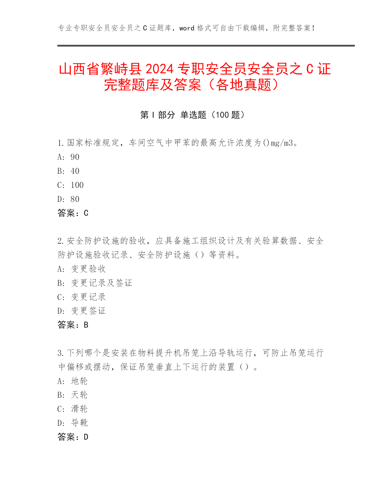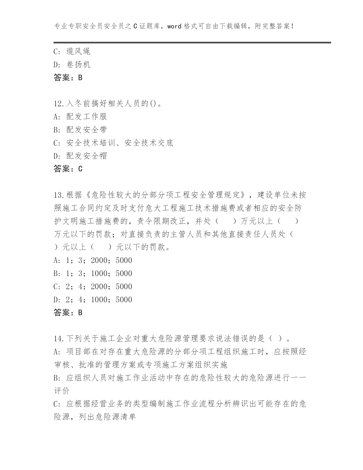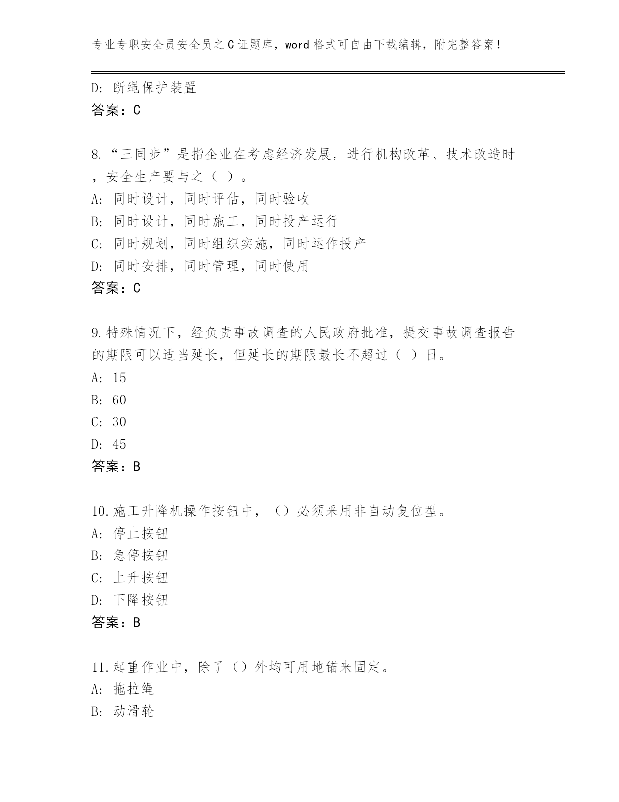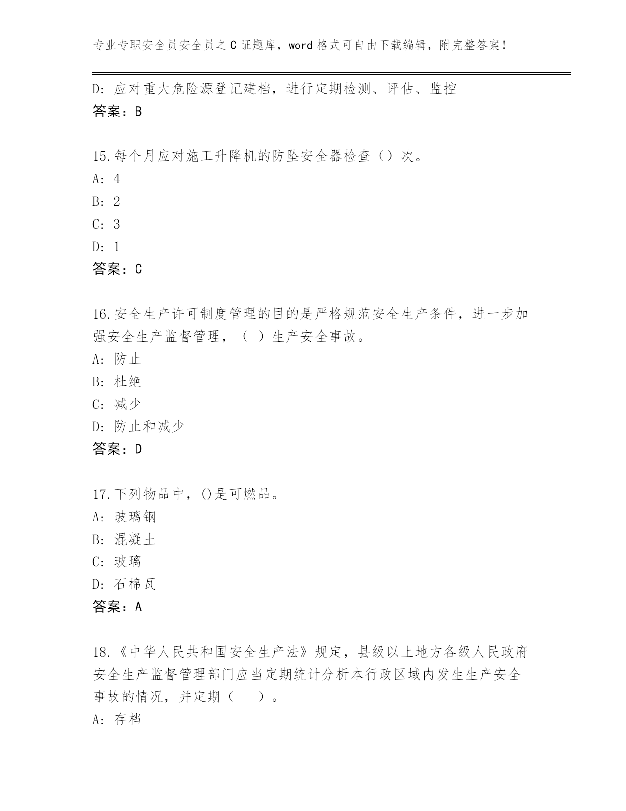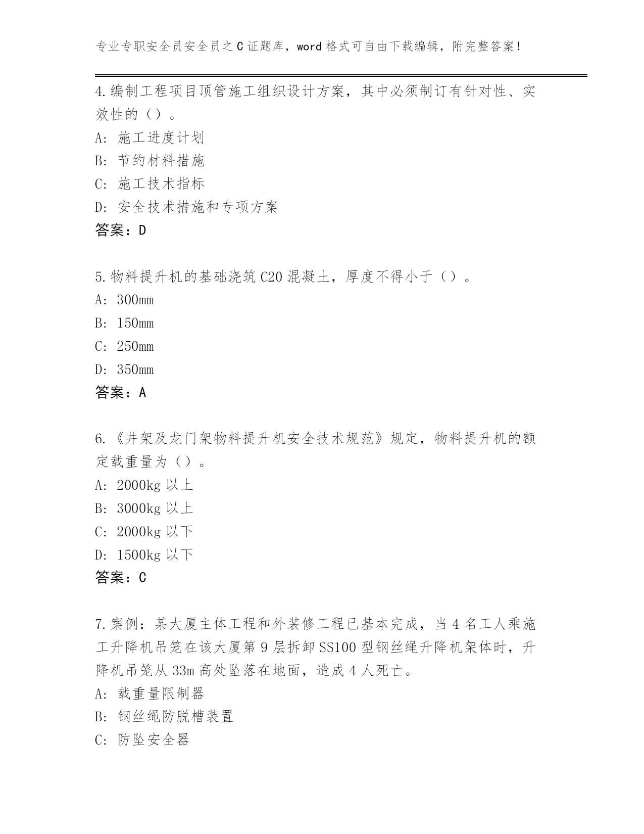 专业专职安全员安全员之C证题库,word格式可自由下载编辑,附完整答案!山西省繁峙县2024专职安全员安全员之C证完整题库及答案(各地真题)第I部分单选题(100题)1.国家标准规定,车间空气中甲苯的最高允许浓度为()mg/m3。A:90B:40C:100D:80答案:C2.安全防护设施的验收,应具备施工组织设计及有关验算数据、安全防护设施验收记录、安全防护设施()等资料。A:变更验收B:变更记录及签证C:变更记录D:变更签证答案:B3.下列哪个是安装在物料提升机吊笼上沿导轨运行,可防止吊笼运行中偏移或摆动,保证吊笼垂直上下运行的装置()。A:地轮B:天轮C:滑轮D:导靴答案:D4.编制工程项目顶管施工组织设计方案,其中必须制订有针对性、实效性的()。A:施工进度计划B:节约材料措施C:施工技术指标D:安全技术措施和专项方案答案:D5.物料提升机的基础浇筑C20混凝土,厚度不得小于()。A:300mmB:150mmC:250mmD:350mm答案:A6.《井架及龙门架物料提升机安全技术规范》规定,物料提升机的额定载重量为()。A:2000kg以上B:3000kg以上C:2000kg以下D:1500kg以下答案:C7.案例:某大厦主体工程和外装修工程已基本完成,当4名工人乘施工升降机吊笼在该大厦第9层拆卸SS100型钢丝绳升降机架体时,升降机吊笼从33m高处坠落在地面,造成4人死亡。A:载重量限制器B:钢丝绳防脱槽装置C:防坠安全器D:断绳保护装置答案:C8.“三同步”是指企业在考虑经济发展,进行机构改革、技术改造时,安全生产要与之()。A:同时设计,同时评估,同时验收B:同时设计,同时施工,同时投产运行C:同时规划,同时组织实施,同时运作投产D:同时安排,同时管理,同时使用答案:C9.特殊情况下,经负责事故调查的人民政府批准,提交事故调查报告的期限可以适当延长,但延长的期限最长不超过()日。A:15B:60C:30D:45答案:B10.施工升降机操作按钮中,()必须采用非自动复位型。A:停止按钮B:急停按钮C:上升按钮D:下降按钮答案:B11.起重作业中,除了()外均可用地锚来固定。A:拖拉绳B:动滑轮C:缆风绳D:卷扬机答案:B12.入冬前搞好相关人员的()。A:配发工作服B:配发安全带C:安全技术培训、安全技术交底D:配发安全帽答案:C13.根据《危险性较大的分部分项工程安全管理规定》,建设单位未按照施工合同约定及时支付危大工程施工技术措施费或者相应的安全防护文明施工措施费的,责令限期改正,并处()万元以上()万元以下的罚款;对直接负责的主管人员和其他直接责任人员处()元以上()元以下的罚款。A:1;3;2000;5000B:1;3;1000;5000C:2;4;2000;5000D:2;4;1000;5000答案:B14.下列关于施工企业对重大危险源管理要求说法错误的是()。A:项目部在对存在重大危险源的分部分项工程组织施工时,应按照经审核、批准的管理方案或专项施工方案组织实施B:应组织人员对施工作业活动中存在的危险性较大的危险源进行一一评价C:应根据经营业务的类型编制施工作业流程分析辨识出可能存在的危险源,列出危险源清单D:应对重大危险源登记建档,进行定期检测、评估、监控答案:B15.每个月应对施工升降机的防坠安全器检查()次。A:4B:2C:3D:1答案:C16.安全生产许可制度管理的目的是严格规范安全生产条件,进一步加强安全生产监督管理,()生产安全事故。A:防止B:杜绝C:减少D:防止和减少答案:D17.下列物品中,()是可燃品。A:玻璃钢B:混凝土C:玻璃D:石棉瓦答案:A18.《中华人民共和国安全生产法》规定,县级以上地方各级人民政府安全生产监督管理部门应当定期统计分析本行政区域内发生生产安全事故的情况,并定期()。A:存档B:登报C:上报D:向社会公布答案:D19.案例:某工地按施工进度要求正在搭设扣件式脚手架,安全员巡视检查发现新购进的扣件表面粗糙,商标模糊,向架子工询问,工人说有的扣件螺栓滑丝,有的扣件一拧,小盖口就裂了。安全员对此扣件质量发生怀疑。A:扣件检验不合格,将所有扣件清除出现场,追回已使用的扣件,并向有关负责人报告追查不合格产品的来源B:保存此批扣件,用于上不脚手架的搭设C:把有问题扣件扔掉,好的继续使用D:告诉工人将坏掉的扣件保留,以便万一发生事故时留作证据答案:A20.塔式起重机主要由()组成。A:基础、架体和提升机构B:金属结构、工作机构和控制系统C:金属结构、提升机构和安全保护装置D:基础、塔身和塔臂答案:B21.土层中如有局部流砂现象,土方开挖前,必须保证一定的预抽水时间,一般真空井点不少于()。A:3~4hB:7~10hC:4~6hD:6~9h答案:B22.为计算简便,并确保安全