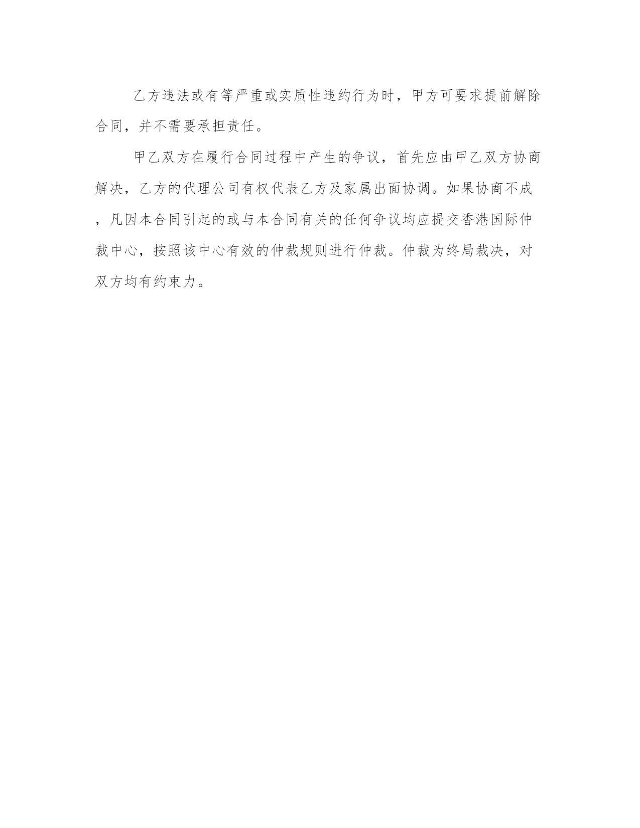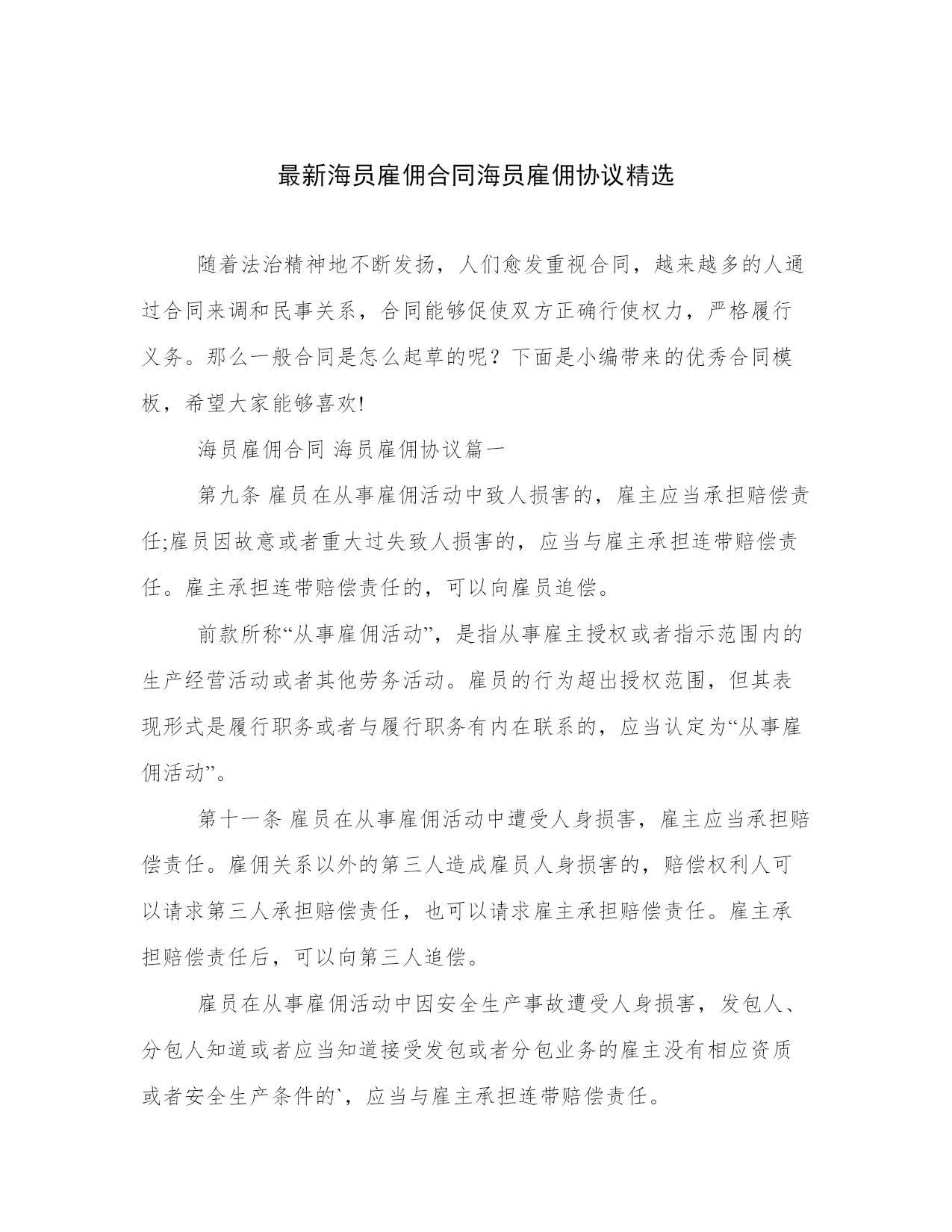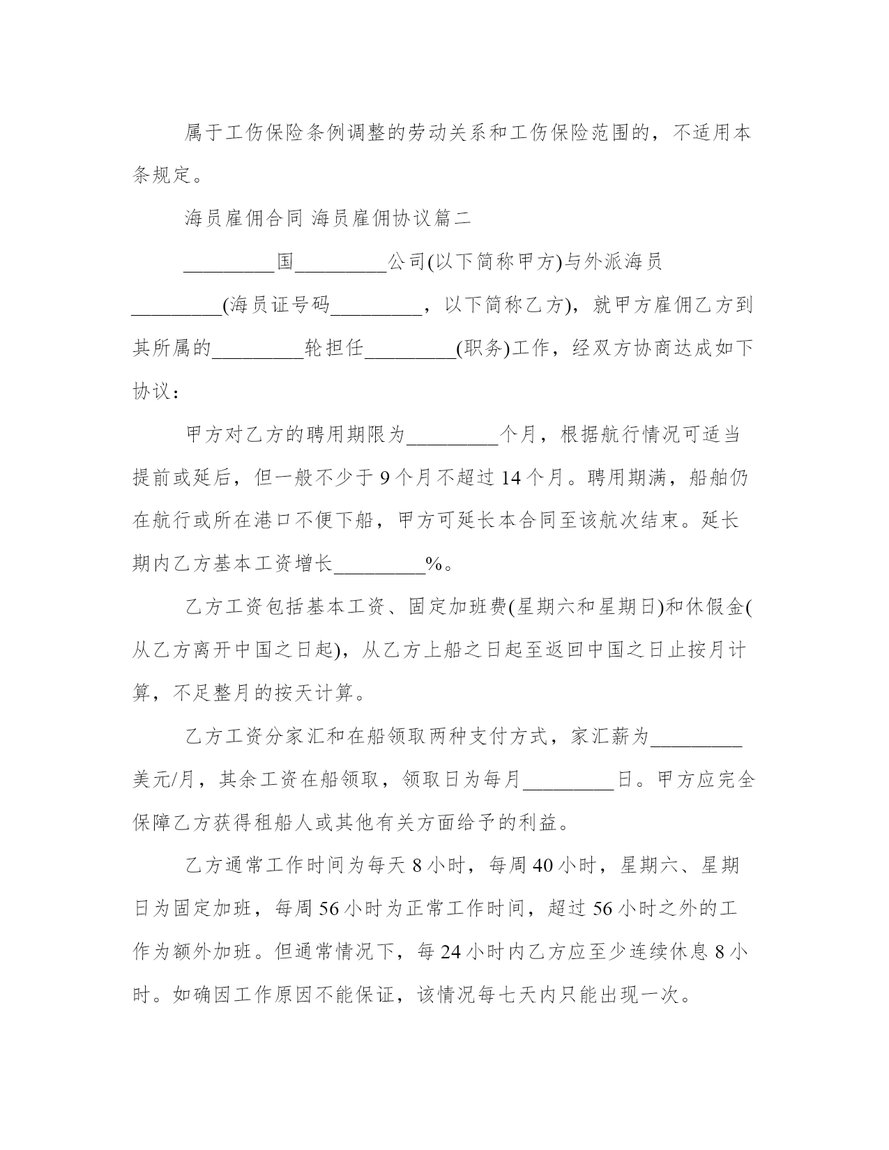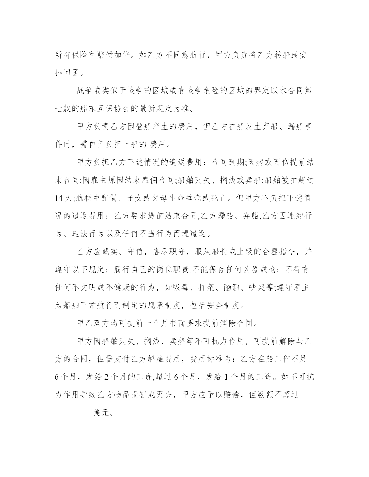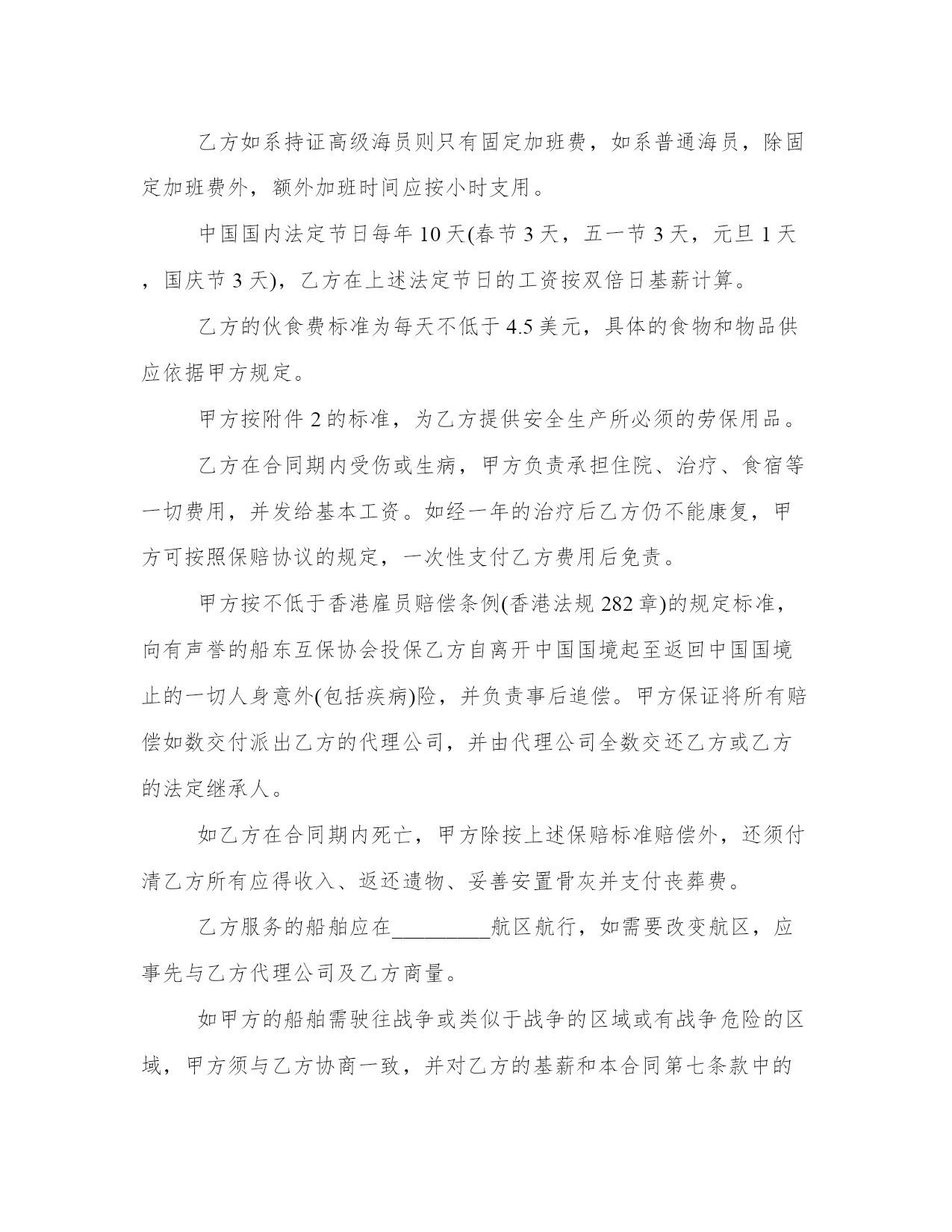 最新海员雇佣合同海员雇佣协议精选随着法治精神地不断发扬,人们愈发重视合同,越来越多的人通过合同来调和民事关系,合同能够促使双方正确行使权力,严格履行义务。那么一般合同是怎么起草的呢?下面是小编带来的优秀合同模板,希望大家能够喜欢!海员雇佣合同海员雇佣协议篇一第九条雇员在从事雇佣活动中致人损害的,雇主应当承担赔偿责任;雇员因故意或者重大过失致人损害的,应当与雇主承担连带赔偿责任。雇主承担连带赔偿责任的,可以向雇员追偿。前款所称“从事雇佣活动”,是指从事雇主授权或者指示范围内的生产经营活动或者其他劳务活动。雇员的行为超出授权范围,但其表现形式是履行职务或者与履行职务有内在联系的,应当认定为“从事雇佣活动”。第十一条雇员在从事雇佣活动中遭受人身损害,雇主应当承担赔偿责任。雇佣关系以外的第三人造成雇员人身损害的,赔偿权利人可以请求第三人承担赔偿责任,也可以请求雇主承担赔偿责任。雇主承担赔偿责任后,可以向第三人追偿。雇员在从事雇佣活动中因安全生产事故遭受人身损害,发包人、分包人知道或者应当知道接受发包或者分包业务的雇主没有相应资质或者安全生产条件的`,应当与雇主承担连带赔偿责任。属于工伤保险条例调整的劳动关系和工伤保险范围的,不适用本条规定。海员雇佣合同海员雇佣协议篇二_________国_________公司(以下简称甲方)与外派海员_________(海员证号码_________,以下简称乙方),就甲方雇佣乙方到其所属的_________轮担任_________(职务)工作,经双方协商达成如下协议:甲方对乙方的聘用期限为_________个月,根据航行情况可适当提前或延后,但一般不少于9个月不超过14个月。聘用期满,船舶仍在航行或所在港口不便下船,甲方可延长本合同至该航次结束。延长期内乙方基本工资增长_________%。乙方工资包括基本工资、固定加班费(星期六和星期日)和休假金(从乙方离开中国之日起),从乙方上船之日起至返回中国之日止按月计算,不足整月的按天计算。乙方工资分家汇和在船领取两种支付方式,家汇薪为_________美元/月,其余工资在船领取,领取日为每月_________日。甲方应完全保障乙方获得租船人或其他有关方面给予的利益。乙方通常工作时间为每天8小时,每周40小时,星期六、星期日为固定加班,每周56小时为正常工作时间,超过56小时之外的工作为额外加班。但通常情况下,每24小时内乙方应至少连续休息8小时。如确因工作原因不能保证,该情况每七天内只能出现一次。乙方如系持证高级海员则只有固定加班费,如系普通海员,除固定加班费外,额外加班时间应按小时支用。中国国内法定节日每年10天(春节3天,五一节3天,元旦1天,国庆节3天),乙方在上述法定节日的工资按双倍日基薪计算。乙方的伙食费标准为每天不低于4.5美元,具体的食物和物品供应依据甲方规定。甲方按附件2的标准,为乙方提供安全生产所必须的劳保用品。乙方在合同期内受伤或生病,甲方负责承担住院、治疗、食宿等一切费用,并发给基本工资。如经一年的治疗后乙方仍不能康复,甲方可按照保赔协议的规定,一次性支付乙方费用后免责。甲方按不低于香港雇员赔偿条例(香港法规282章)的规定标准,向有声誉的船东互保协会投保乙方自离开中国国境起至返回中国国境止的一切人身意外(包括疾病)险,并负责事后追偿。甲方保证将所有赔偿如数交付派出乙方的代理公司,并由代理公司全数交还乙方或乙方的法定继承人。如乙方在合同期内死亡,甲方除按上述保赔标准赔偿外,还须付清乙方所有应得收入、返还遗物、妥善安置骨灰并支付丧葬费。乙方服务的船舶应在_________航区航行,如需要改变航区,应事先与乙方代理公司及乙方商量。如甲方的船舶需驶往战争或类似于战争的区域或有战争危险的区域,甲方须与乙方协商一致,并对乙方的基薪和本合同第七条款中的所有保险和赔偿加倍。如乙方不同意航行,甲方负责将乙方转船或安排回国。战争或类似于战争的区域或有战争危险的区域的界定以本合同第七款的船东互保协会的最新规定为准。甲方负责乙方因登船产生的费用,但乙方在船发生弃船、漏船事件时,需自行负担上船的.费用。甲方负担乙方下述情况的遣返费用:合同到期;因病或因伤提前结束合同;因雇主原因结束雇佣合同;船舶灭失、搁浅或卖船;船舶被扣超过14天;航程中配偶、子女或父母生命垂危或死亡。但甲方不负担下述情况的遣返费用:乙方要求提前结束合同;乙方漏船、弃船;乙方因违约行为、违法行为以及任何不当行为而遭遣返。乙方应诚实、守信,恪尽职守,服从船长或上级的合理指令,并遵守以下规定:履行自己的岗位职责;不能保存任何凶器或枪;不得有任何不文明或不健康的行为,如吸毒、打架、酗酒、吵架等;遵守雇主为船舶正常航行而制定的规章制度,包括安全制度。甲乙双方均可提前一个月书面要求提前解除合同。甲方因