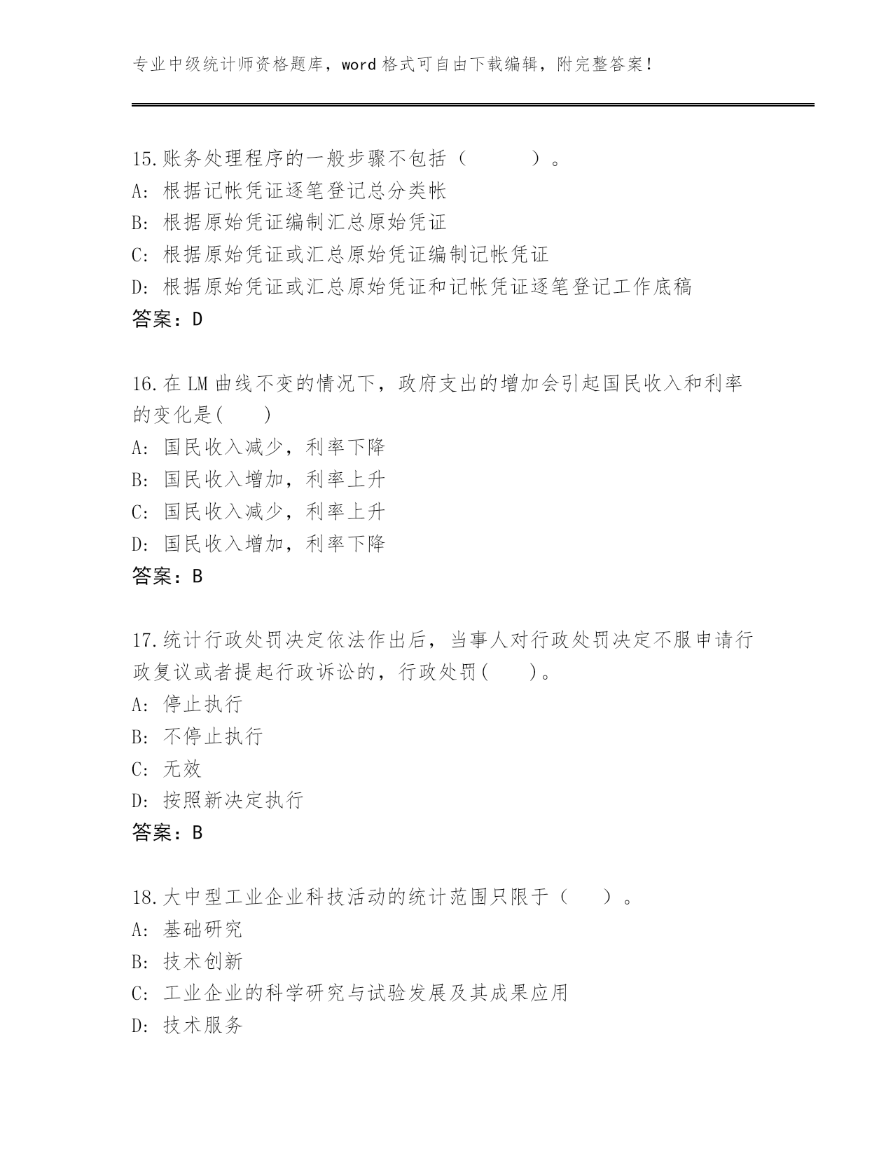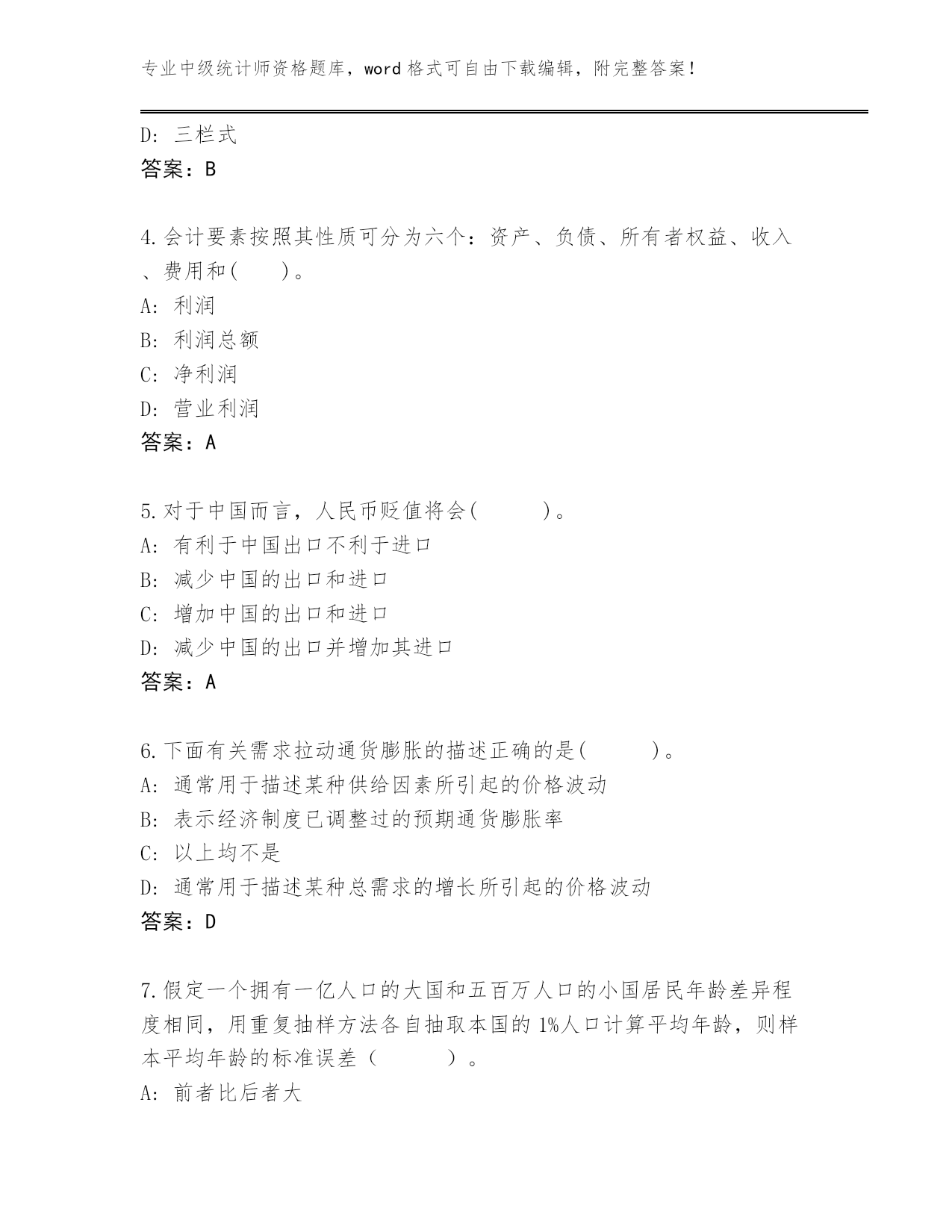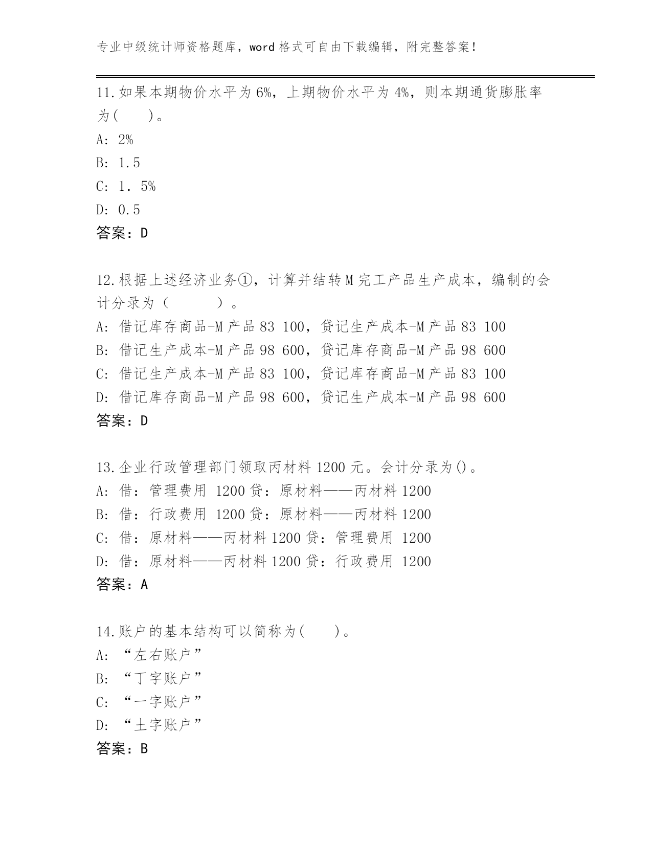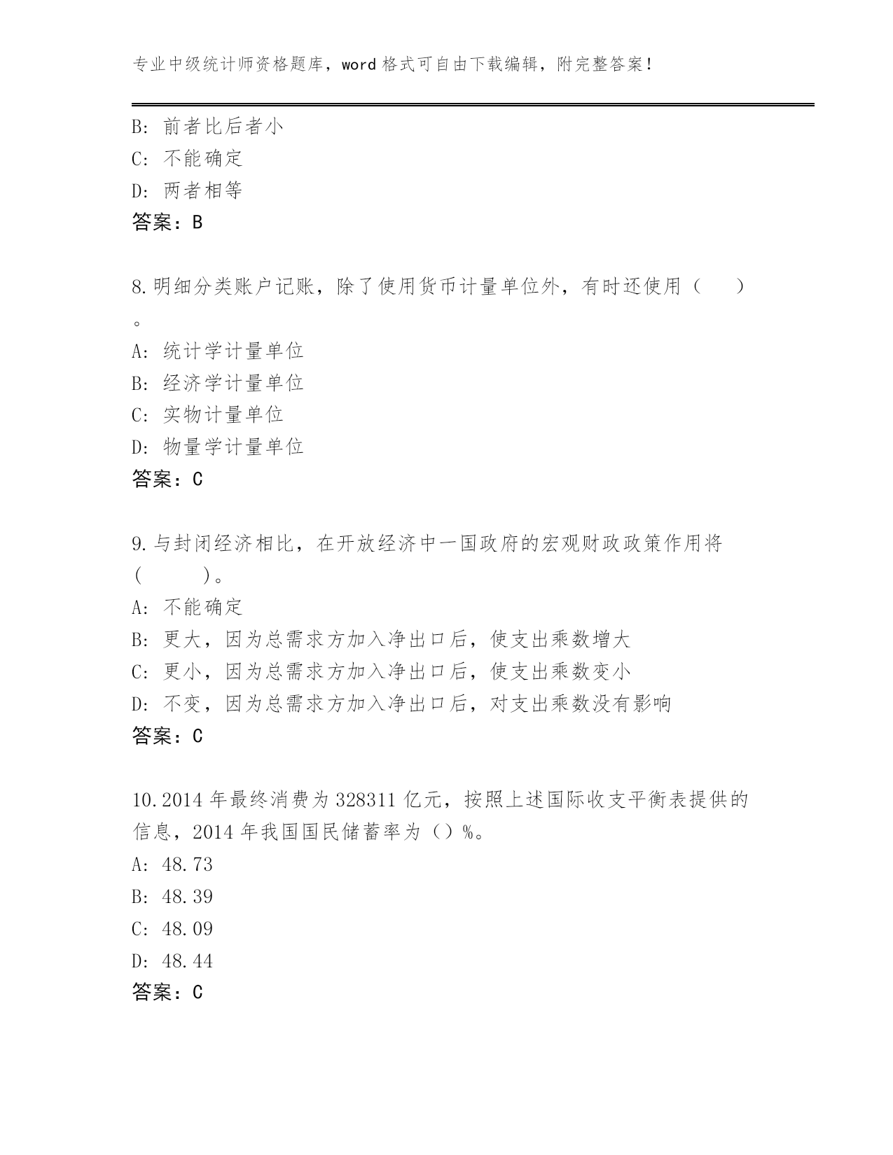 专业中级统计师资格题库,word格式可自由下载编辑,附完整答案!2024年吉林省东辽县中级统计师资格真题【精选题】第I部分单选题(100题)1.某省教育厅在日常检查由教育部制定并组织实施的一项统计调查项目时,发现一所大学报送的《教育基建投资完成情况统计报表》与实际情况严重不符,同时还发现该报表是由一名临时人员填报的。请根据上述材料回答下列问题:该省教育厅应当()。A:将情况报告该省统计局,由其按照《统计法》的规定予以处理B:将情况报告该省的国家统计局调查总队,由其按照《统计法》的规定予以处理C:按照《统计法》规定,对这所大学的统计违法行为进行处理D:将情况报告教育部,由其按照《统计法》的规定予以处理答案:B2.反向投资是指()。A:境外企业对其境内投资主体实现的投资B:境内企业对外国企业的投资C:境外企业对境内企业的投资D:境外企业在外国的投资答案:A3.明细分类账簿一般采用活页式账簿,也有的采用卡片式账簿,其账页格式一般没有()。A:多栏式B:两栏式C:数量金额式D:三栏式答案:B4.会计要素按照其性质可分为六个:资产、负债、所有者权益、收入、费用和()。A:利润B:利润总额C:净利润D:营业利润答案:A5.对于中国而言,人民币贬值将会()。A:有利于中国出口不利于进口B:减少中国的出口和进口C:增加中国的出口和进口D:减少中国的出口并增加其进口答案:A6.下面有关需求拉动通货膨胀的描述正确的是()。A:通常用于描述某种供给因素所引起的价格波动B:表示经济制度已调整过的预期通货膨胀率C:以上均不是D:通常用于描述某种总需求的增长所引起的价格波动答案:D7.假定一个拥有一亿人口的大国和五百万人口的小国居民年龄差异程度相同,用重复抽样方法各自抽取本国的1%人口计算平均年龄,则样本平均年龄的标准误差()。A:前者比后者大B:前者比后者小C:不能确定D:两者相等答案:B8.明细分类账户记账,除了使用货币计量单位外,有时还使用()。A:统计学计量单位B:经济学计量单位C:实物计量单位D:物量学计量单位答案:C9.与封闭经济相比,在开放经济中一国政府的宏观财政政策作用将()。A:不能确定B:更大,因为总需求方加入净出口后,使支出乘数增大C:更小,因为总需求方加入净出口后,使支出乘数变小D:不变,因为总需求方加入净出口后,对支出乘数没有影响答案:C10.2014年最终消费为328311亿元,按照上述国际收支平衡表提供的信息,2014年我国国民储蓄率为()%。A:48.73B:48.39C:48.09D:48.44答案:C11.如果本期物价水平为6%,上期物价水平为4%,则本期通货膨胀率为()。A:2%B:1.5C:1.5%D:0.5答案:D12.根据上述经济业务①,计算并结转M完工产品生产成本,编制的会计分录为()。A:借记库存商品-M产品83100,贷记生产成本-M产品83100B:借记生产成本-M产品98600,贷记库存商品-M产品98600C:借记生产成本-M产品83100,贷记库存商品-M产品83100D:借记库存商品-M产品98600,贷记生产成本-M产品98600答案:D13.企业行政管理部门领取丙材料1200元。会计分录为()。A:借:管理费用1200贷:原材料——丙材料1200B:借:行政费用1200贷:原材料——丙材料1200C:借:原材料——丙材料1200贷:管理费用1200D:借:原材料——丙材料1200贷:行政费用1200答案:A14.账户的基本结构可以简称为()。A:“左右账户”B:“丁字账户”C:“一字账户”D:“土字账户”答案:B15.账务处理程序的一般步骤不包括()。A:根据记帐凭证逐笔登记总分类帐B:根据原始凭证编制汇总原始凭证C:根据原始凭证或汇总原始凭证编制记帐凭证D:根据原始凭证或汇总原始凭证和记帐凭证逐笔登记工作底稿答案:D16.在LM曲线不变的情况下,政府支出的增加会引起国民收入和利率的变化是()A:国民收入减少,利率下降B:国民收入增加,利率上升C:国民收入减少,利率上升D:国民收入增加,利率下降答案:B17.统计行政处罚决定依法作出后,当事人对行政处罚决定不服申请行政复议或者提起行政诉讼的,行政处罚()。A:停止执行B:不停止执行C:无效D:按照新决定执行答案:B18.大中型工业企业科技活动的统计范围只限于()。A:基础研究B:技术创新C:工业企业的科学研究与试验发展及其成果应用D:技术服务答案:C19.从经济学理论上说,生产的外部不经济会造成()。A:资源有效配置B:资源均衡配置C:产品供给过少D:产品供给过多答案:D20.财政收入增长速度除以国内生产总值增长速度得到的指标是。A:财政支出边际倾向B:财政收入边际倾向C:财政收入弹性系数D:财政支出弹性系数答案:C21.按照城乡住户调查一体