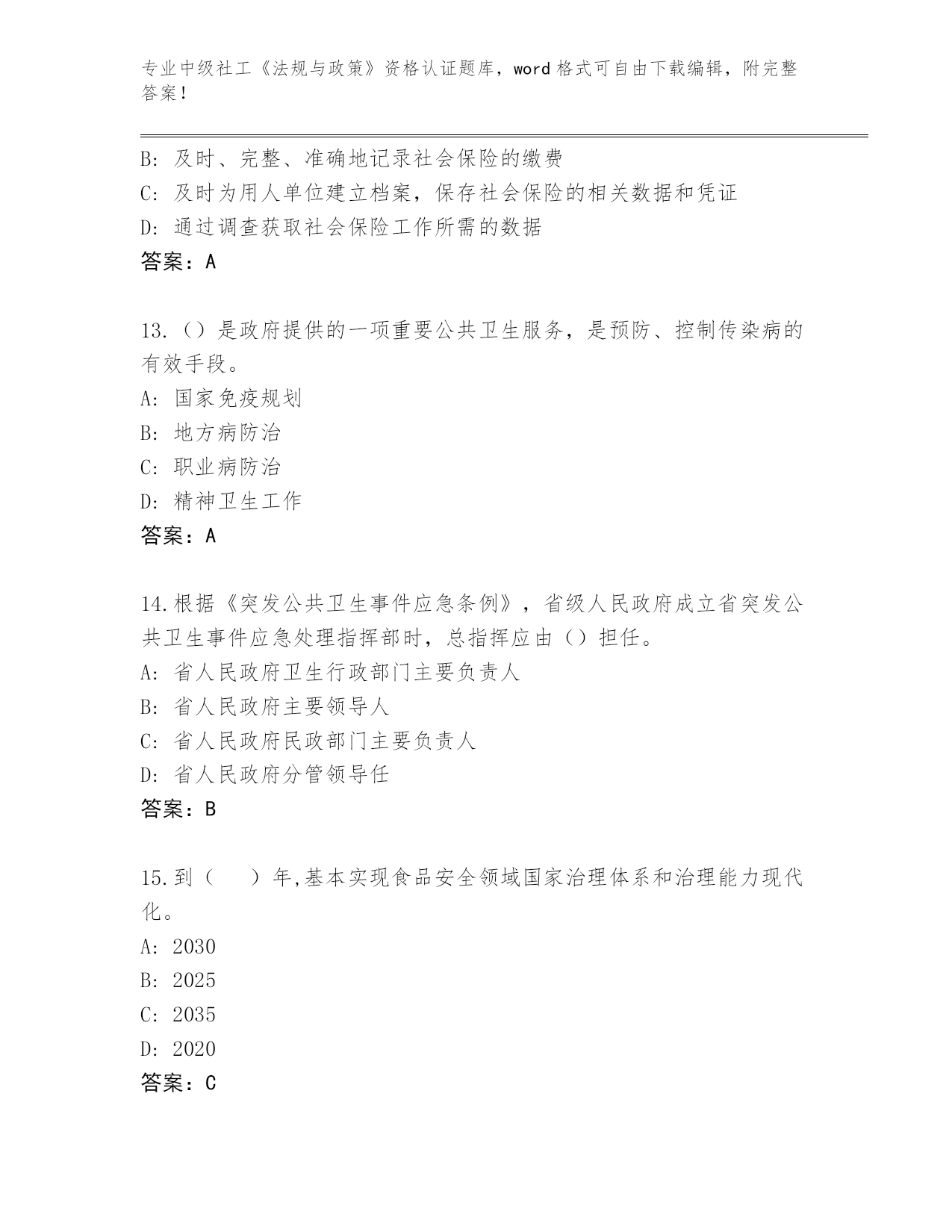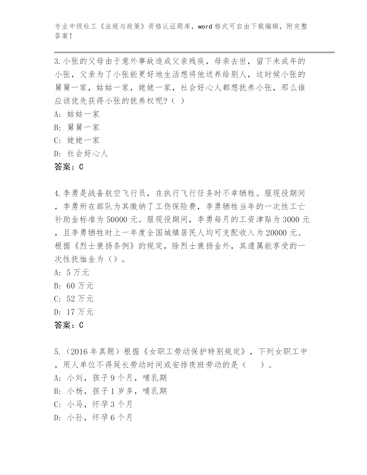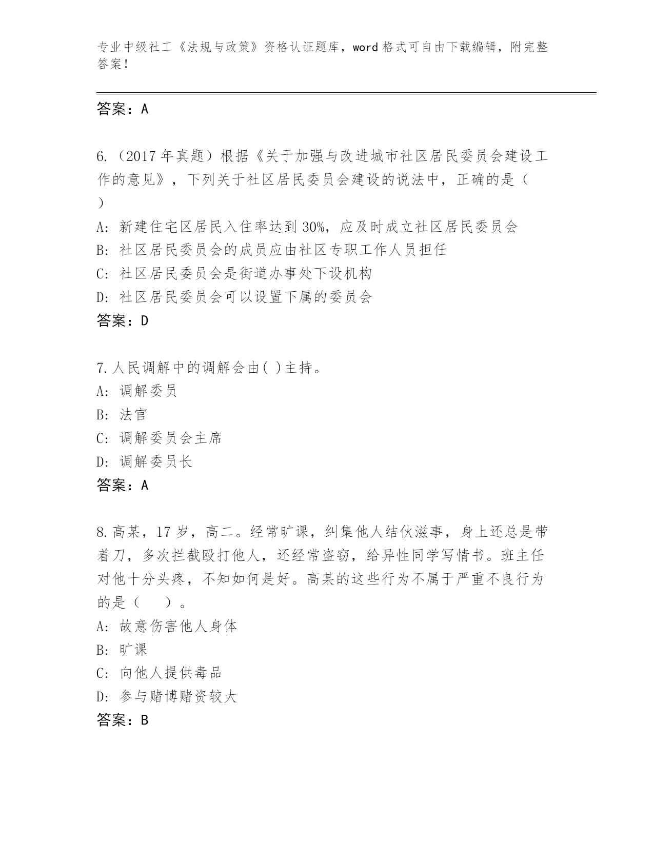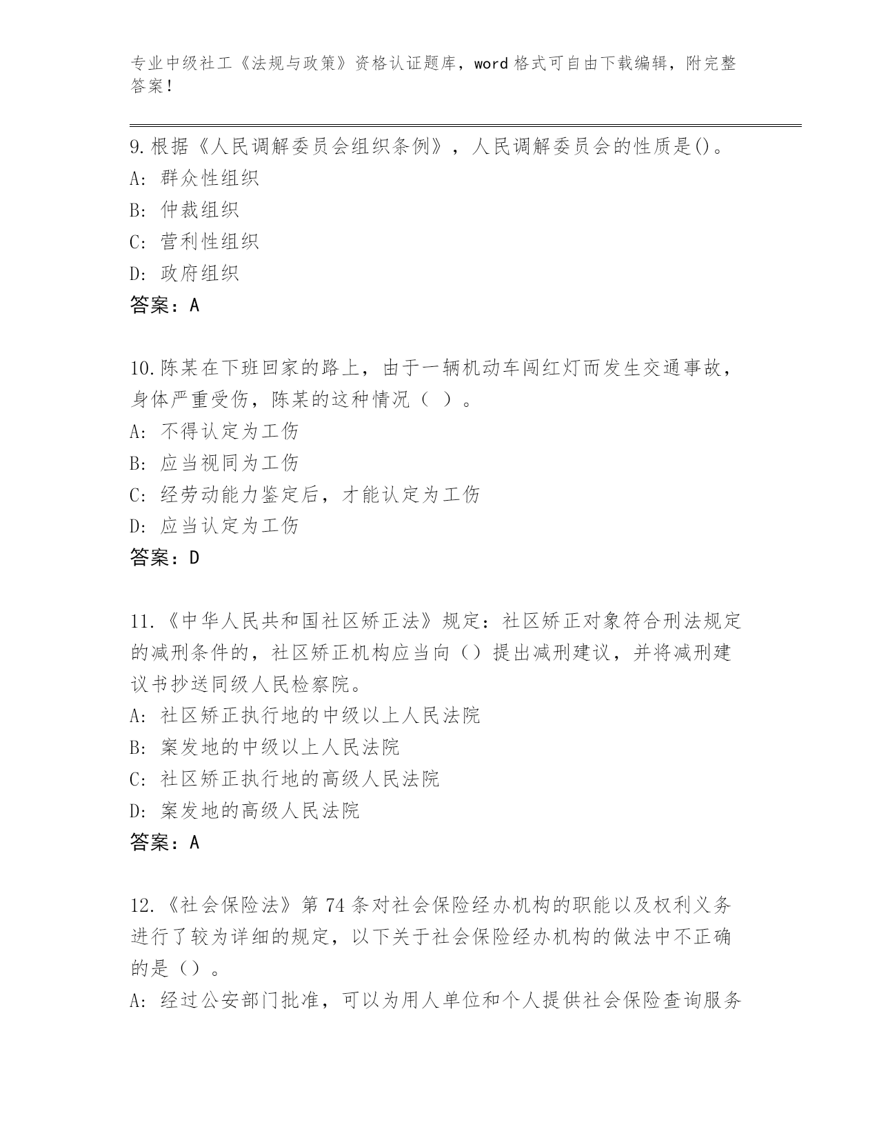 专业中级社工《法规与政策》资格认证题库,word格式可自由下载编辑,附完整答案!2024年江西省南康区中级社工《法规与政策》资格认证真题题库【考试直接用】第I部分单选题(100题)1.根据《国务院关于建立城镇职工基本医疗保险制度的决定》,基本医疗保险费由用人单位与职工共同缴纳,具体比例是()。A:用人单位缴费率控制在职工工资总额的5%左右,职工缴费率一般为本人工资收入的1.5%B:用人单位缴费率控制在职工工资总额的6%左右,职工缴费率一般为本人工资收入的2.5%C:用人单位缴费率控制在职工工资总额的8%左右,职工缴费率一般为本人工资收入的2%D:用人单位缴费率控制在职工工资总额的6%左右,职工缴费率一般为本人工资收入的2%答案:D2.公安机关认为暂缓执行行政拘留不致发生社会危险的,由被处罚人或者其近亲属提出符合《中华人民共和国治安管理处罚法》规定条件的担保人,或者按每日行政拘留200元的标准交纳保证金,行政拘留的处罚决定暂缓执行。不属于担保人应该符合的条件是()。A:有能力履行担保义务B:与被处罚者有血缘关系C:与本案无牵连D:享有政治权利,人身自由未受到限制答案:B3.小张的父母由于意外事故造成父亲残疾,母亲去世,留下未成年的小张,父亲为了小张能更好地生活想将他送养给别人,这时候小张的舅舅一家,姑姑一家,姥姥一家,社会好心人都想抚养小张,那么谁应该优先获得小张的抚养权呢?()A:姑姑一家B:舅舅一家C:姥姥一家D:社会好心人答案:C4.李勇是战备航空飞行员,在执行飞行任务时不幸牺牲。服现役期间,李勇所在部队为其缴纳了工伤保险费,李勇牺牲当年的一次性工亡补助金标准为50000元。服现役期间,李勇每月的工资津贴为3000元,且李勇牺牲时上一年度全国城镇居民人均可支配收入为20000元。根据《烈士褒扬条例》的规定,除烈士褒扬金外,其遗属能享受的一次性抚恤金为()。A:5万元B:60万元C:52万元D:17万元答案:C5.(2016年真题)根据《女职工劳动保护特别规定》,下列女职工中,用人单位不得延长劳动时间或安排夜班劳动的是()。A:小刘,孩子9个月,哺乳期B:小杨,孩子1岁多,哺乳期C:小马,怀孕3个月D:小孙,怀孕6个月答案:A6.(2017年真题)根据《关于加强与改进城市社区居民委员会建设工作的意见》,下列关于社区居民委员会建设的说法中,正确的是()A:新建住宅区居民入住率达到30%,应及时成立社区居民委员会B:社区居民委员会的成员应由社区专职工作人员担任C:社区居民委员会是街道办事处下设机构D:社区居民委员会可以设置下属的委员会答案:D7.人民调解中的调解会由()主持。A:调解委员B:法官C:调解委员会主席D:调解委员长答案:A8.高某,17岁,高二。经常旷课,纠集他人结伙滋事,身上还总是带着刀,多次拦截殴打他人,还经常盗窃,给异性同学写情书。班主任对他十分头疼,不知如何是好。高某的这些行为不属于严重不良行为的是()。A:故意伤害他人身体B:旷课C:向他人提供毒品D:参与赌博赌资较大答案:B9.根据《人民调解委员会组织条例》,人民调解委员会的性质是()。A:群众性组织B:仲裁组织C:营利性组织D:政府组织答案:A10.陈某在下班回家的路上,由于一辆机动车闯红灯而发生交通事故,身体严重受伤,陈某的这种情况()。A:不得认定为工伤B:应当视同为工伤C:经劳动能力鉴定后,才能认定为工伤D:应当认定为工伤答案:D11.《中华人民共和国社区矫正法》规定:社区矫正对象符合刑法规定的减刑条件的,社区矫正机构应当向()提出减刑建议,并将减刑建议书抄送同级人民检察院。A:社区矫正执行地的中级以上人民法院B:案发地的中级以上人民法院C:社区矫正执行地的高级人民法院D:案发地的高级人民法院答案:A12.《社会保险法》第74条对社会保险经办机构的职能以及权利义务进行了较为详细的规定,以下关于社会保险经办机构的做法中不正确的是()。A:经过公安部门批准,可以为用人单位和个人提供社会保险查询服务B:及时、完整、准确地记录社会保险的缴费C:及时为用人单位建立档案,保存社会保险的相关数据和凭证D:通过调查获取社会保险工作所需的数据答案:A13.()是政府提供的一项重要公共卫生服务,是预防、控制传染病的有效手段。A:国家免疫规划B:地方病防治C:职业病防治D:精神卫生工作答案:A14.根据《突发公共卫生事件应急条例》,省级人民政府成立省突发公共卫生事件应急处理指挥部时,总指挥应由()担任。A:省人民政府卫生行政部门主要负责人B:省人民政府主要领导人C:省人民政府民政部门主要负责人D:省人民政府分管领导任答案:B15.到()年,基本实现食品安全领域国家治理体系和治理能力现代化。A:2030B:2025C:2035D:2020答案:C16.法定继承人是指根据法