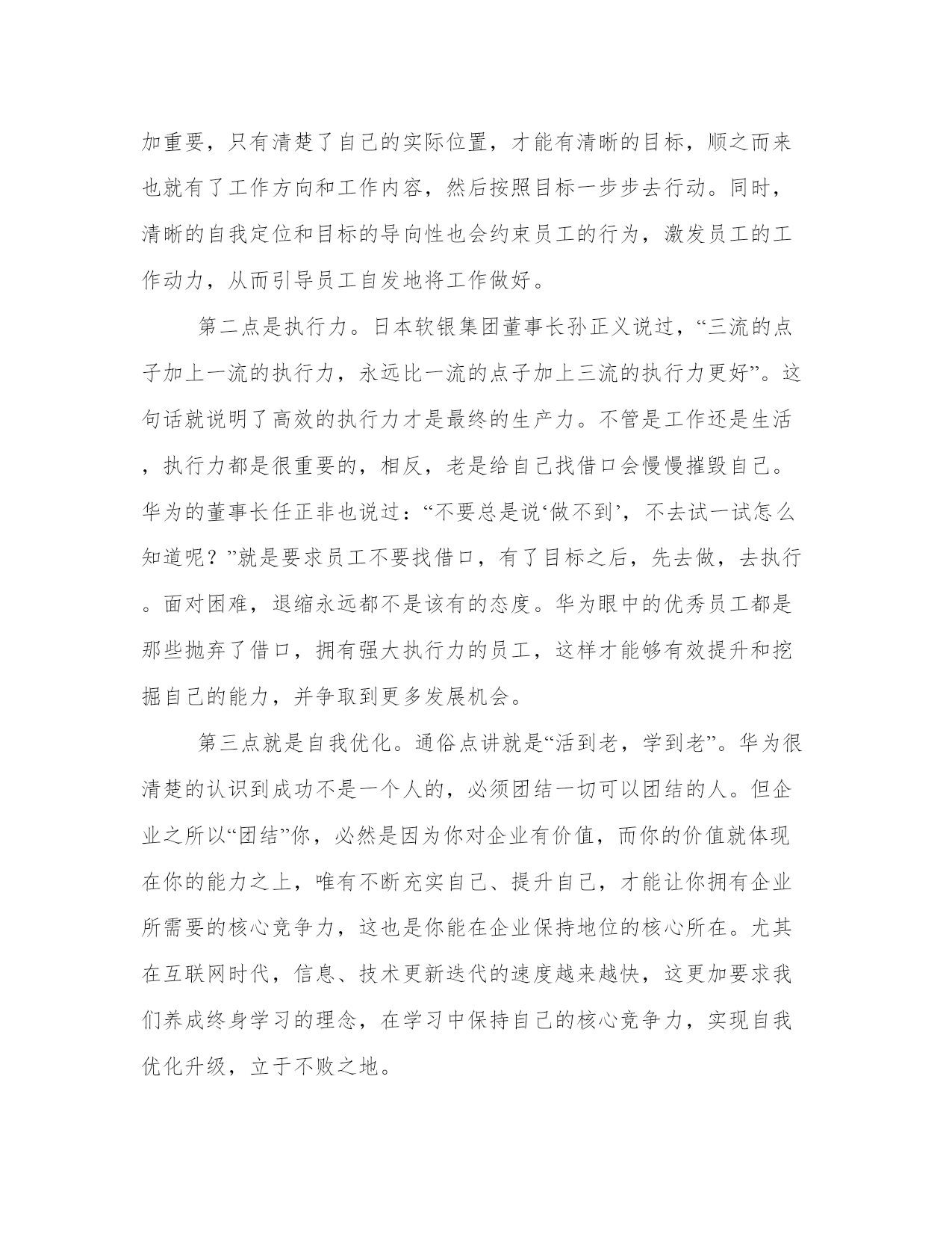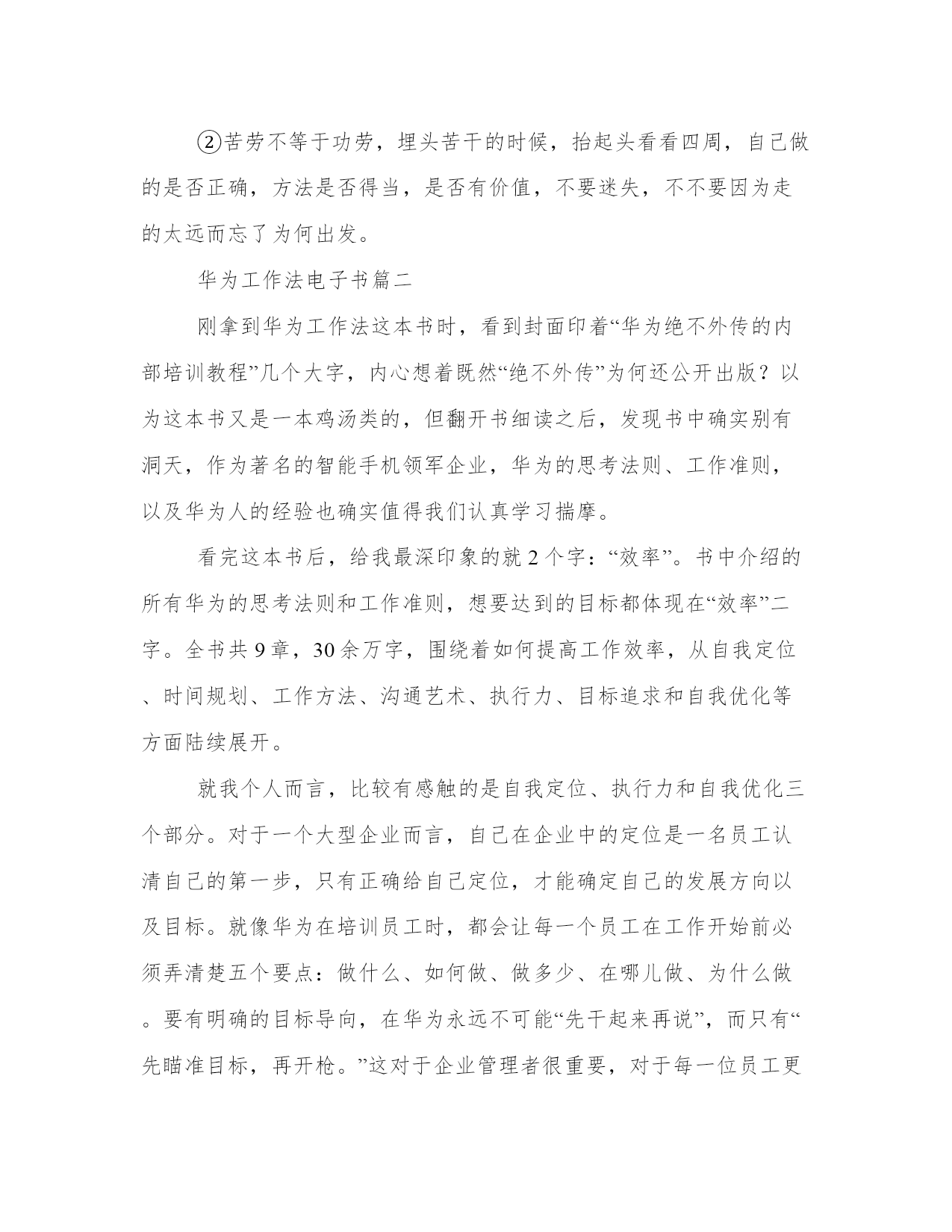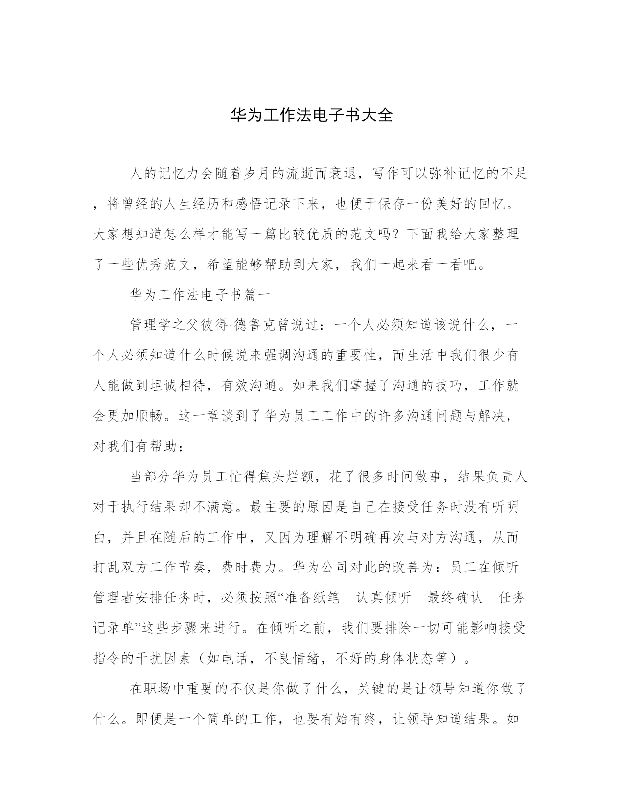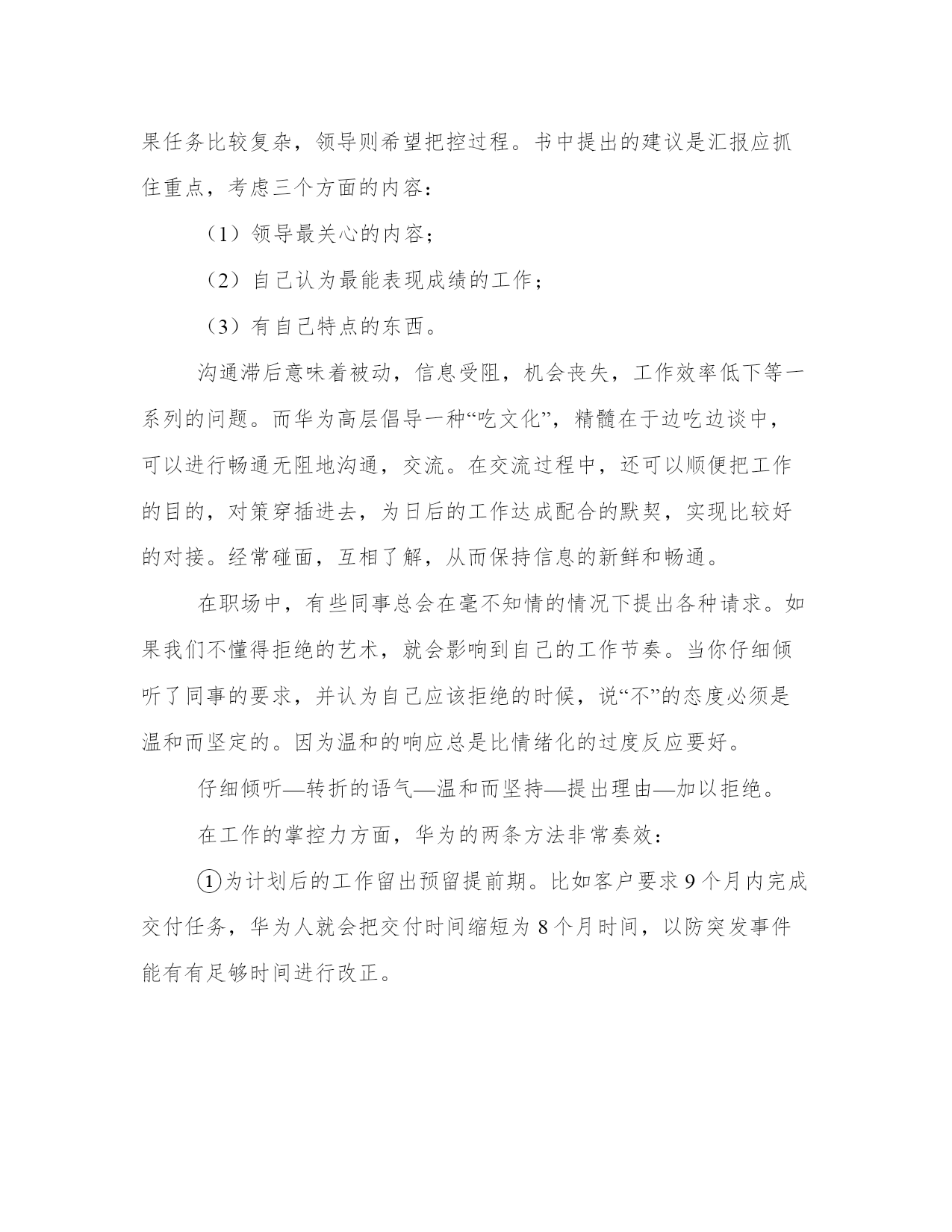 华为工作法电子书大全人的记忆力会随着岁月的流逝而衰退,写作可以弥补记忆的不足,将曾经的人生经历和感悟记录下来,也便于保存一份美好的回忆。大家想知道怎么样才能写一篇比较优质的范文吗?下面我给大家整理了一些优秀范文,希望能够帮助到大家,我们一起来看一看吧。华为工作法电子书篇一管理学之父彼得·德鲁克曾说过:一个人必须知道该说什么,一个人必须知道什么时候说来强调沟通的重要性,而生活中我们很少有人能做到坦诚相待,有效沟通。如果我们掌握了沟通的技巧,工作就会更加顺畅。这一章谈到了华为员工工作中的许多沟通问题与解决,对我们有帮助:当部分华为员工忙得焦头烂额,花了很多时间做事,结果负责人对于执行结果却不满意。最主要的原因是自己在接受任务时没有听明白,并且在随后的工作中,又因为理解不明确再次与对方沟通,从而打乱双方工作节奏,费时费力。华为公司对此的改善为:员工在倾听管理者安排任务时,必须按照“准备纸笔—认真倾听—最终确认—任务记录单”这些步骤来进行。在倾听之前,我们要排除一切可能影响接受指令的干扰因素(如电话,不良情绪,不好的身体状态等)。在职场中重要的不仅是你做了什么,关键的是让领导知道你做了什么。即便是一个简单的工作,也要有始有终,让领导知道结果。如果任务比较复杂,领导则希望把控过程。书中提出的建议是汇报应抓住重点,考虑三个方面的内容:(1)领导最关心的内容;(2)自己认为最能表现成绩的工作;(3)有自己特点的东西。沟通滞后意味着被动,信息受阻,机会丧失,工作效率低下等一系列的问题。而华为高层倡导一种“吃文化”,精髓在于边吃边谈中,可以进行畅通无阻地沟通,交流。在交流过程中,还可以顺便把工作的目的,对策穿插进去,为日后的工作达成配合的默契,实现比较好的对接。经常碰面,互相了解,从而保持信息的新鲜和畅通。在职场中,有些同事总会在毫不知情的情况下提出各种请求。如果我们不懂得拒绝的艺术,就会影响到自己的工作节奏。当你仔细倾听了同事的要求,并认为自己应该拒绝的时候,说“不”的态度必须是温和而坚定的。因为温和的响应总是比情绪化的过度反应要好。仔细倾听—转折的语气—温和而坚持—提出理由—加以拒绝。在工作的掌控力方面,华为的两条方法非常奏效:①为计划后的工作留出预留提前期。比如客户要求9个月内完成交付任务,华为人就会把交付时间缩短为8个月时间,以防突发事件能有有足够时间进行改正。②苦劳不等于功劳,埋头苦干的时候,抬起头看看四周,自己做的是否正确,方法是否得当,是否有价值,不要迷失,不不要因为走的太远而忘了为何出发。华为工作法电子书篇二刚拿到华为工作法这本书时,看到封面印着“华为绝不外传的内部培训教程”几个大字,内心想着既然“绝不外传”为何还公开出版?以为这本书又是一本鸡汤类的,但翻开书细读之后,发现书中确实别有洞天,作为著名的智能手机领军企业,华为的思考法则、工作准则,以及华为人的经验也确实值得我们认真学习揣摩。看完这本书后,给我最深印象的就2个字:“效率”。书中介绍的所有华为的思考法则和工作准则,想要达到的目标都体现在“效率”二字。全书共9章,30余万字,围绕着如何提高工作效率,从自我定位、时间规划、工作方法、沟通艺术、执行力、目标追求和自我优化等方面陆续展开。就我个人而言,比较有感触的是自我定位、执行力和自我优化三个部分。对于一个大型企业而言,自己在企业中的定位是一名员工认清自己的第一步,只有正确给自己定位,才能确定自己的发展方向以及目标。就像华为在培训员工时,都会让每一个员工在工作开始前必须弄清楚五个要点:做什么、如何做、做多少、在哪儿做、为什么做。要有明确的目标导向,在华为永远不可能“先干起来再说”,而只有“先瞄准目标,再开枪。”这对于企业管理者很重要,对于每一位员工更加重要,只有清楚了自己的实际位置,才能有清晰的目标,顺之而来也就有了工作方向和工作内容,然后按照目标一步步去行动。同时,清晰的自我定位和目标的导向性也会约束员工的行为,激发员工的工作动力,从而引导员工自发地将工作做好。第二点是执行力。日本软银集团董事长孙正义说过,“三流的点子加上一流的执行力,永远比一流的点子加上三流的执行力更好”。这句话就说明了高效的执行力才是最终的生产力。不管是工作还是生活,执行力都是很重要的,相反,老是给自己找借口会慢慢摧毁自己。华为的董事长任正非也说过:“不要总是说‘做不到’,不去试一试怎么知道呢?”就是要求员工不要找借口,有了目标之后,先去做,去执行。面对困难,退缩永远都不是该有的态度。华为眼中的优秀员工都是那些抛弃了借口,拥有强大执行力的员工,这样才能够有效提升和挖掘自己的能力,并争取到更多发展机会。第三点就是自我优化。通俗点讲就是“活到老,学到老”。华为很清楚的认识到成功不是一个人的,必须团结一切可以团结的人。但企业之所以“团结”你,必然是因为你对企业