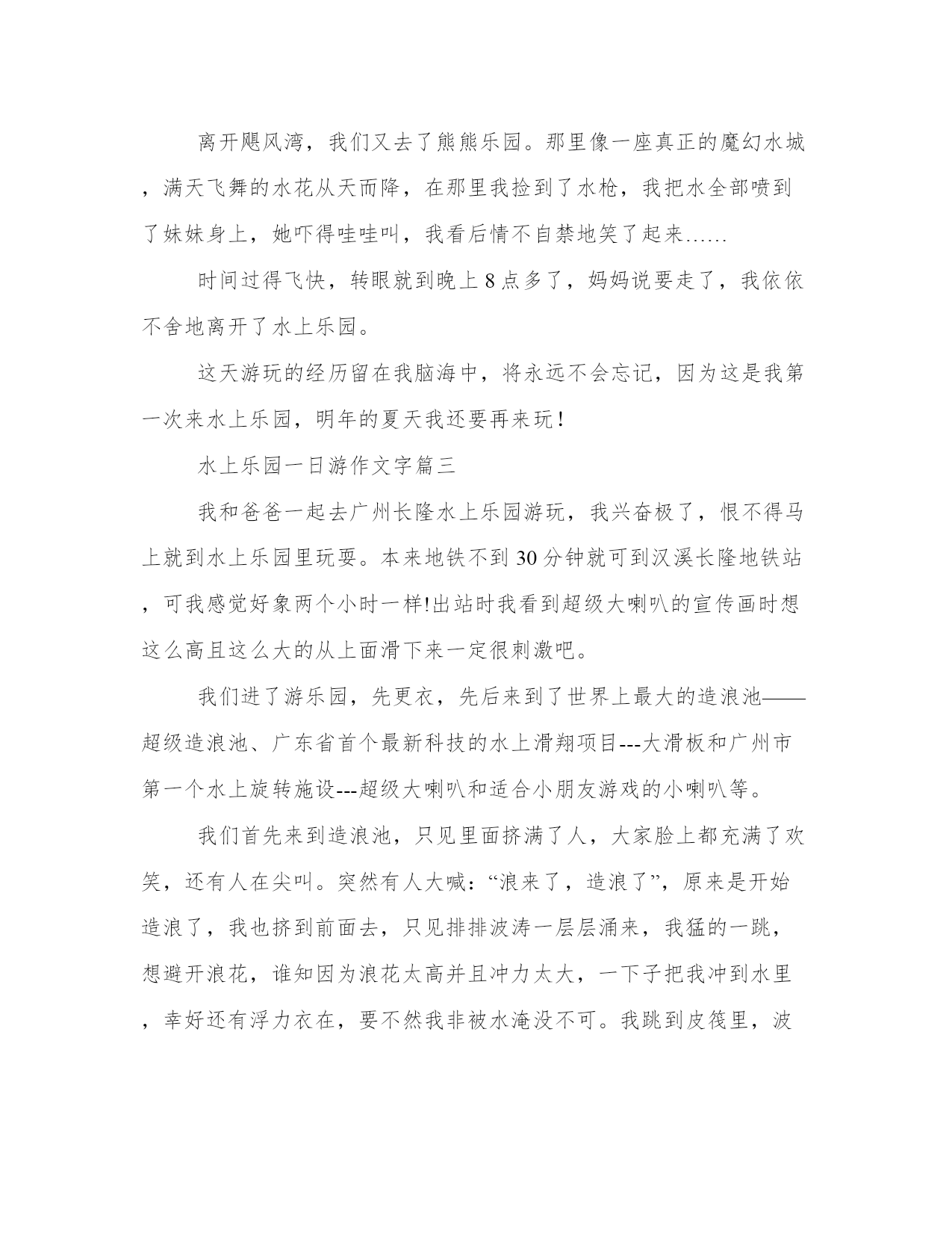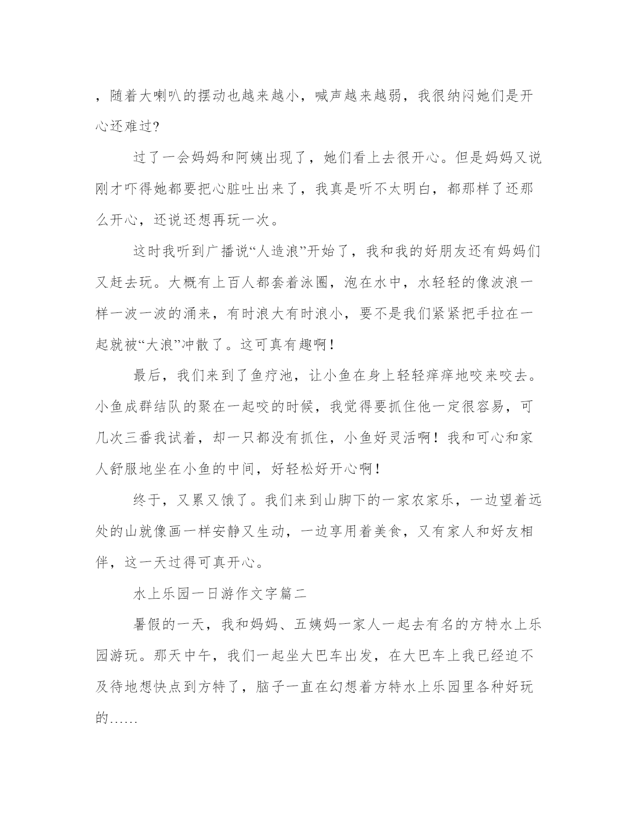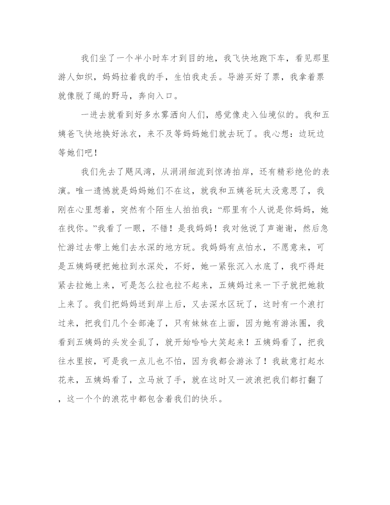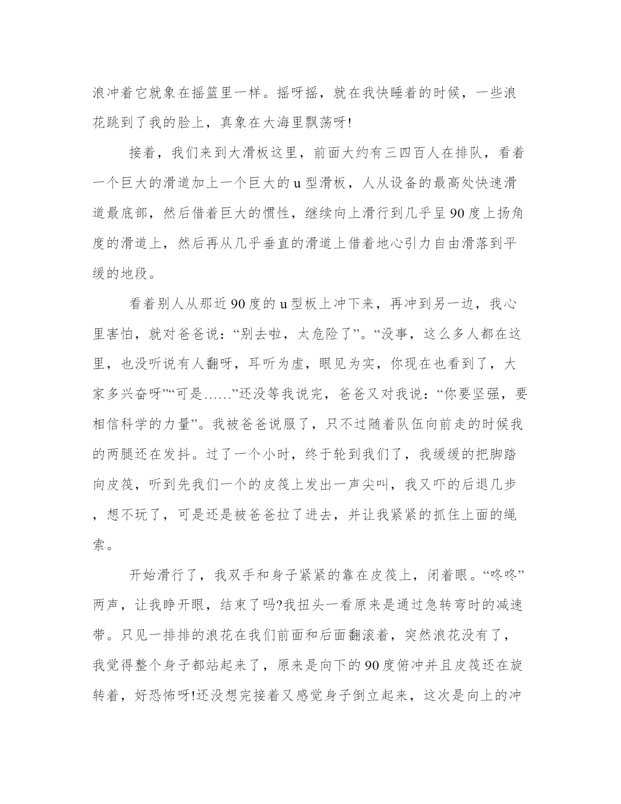 最新水上乐园一日游作文字二十篇(优秀)在日常学习、工作或生活中,大家总少不了接触作文或者范文吧,通过文章可以把我们那些零零散散的思想,聚集在一块。写范文的时候需要注意什么呢?有哪些格式需要注意呢?下面是小编帮大家整理的优质范文,仅供参考,大家一起来看看吧。水上乐园一日游作文字篇一妈妈迅速的收拾好所有需要的东西后我们一家就出发了。过了大约四十分钟我们就到了目的地。还没进去就感受到了水的愉悦:到处是卖泳衣、泳圈的,琳琅满目,样式繁多。我心中的开心已经开始像大海边的波浪,一浪拍打一浪地。很顺利地换了泳衣进入水上乐园。里面的人可真多,我迫不及待地和我的好朋友进入了“玛雅森林”就是由各种花样的水上滑梯组成。当然由于是专门提供给儿童玩耍的,所以高度和惊险度不是很高,但对于我们来说已经很“怕怕”了!我和可心在“玛雅森林”尝试了所有的滑梯,上上下下,一遍又一遍的突然落入水中,“惊险、刺激”。过了一会,我们找不到我们的妈妈了。爸爸说妈妈们去玩“大喇叭”了。“啊?大喇叭?就是那些叔叔阿姨抬着个四方皮艇似的东西排队的那个东西吗?……”我们赶紧朝那个地方赶去,顺着爸爸手指的方向观看了一下玩大喇叭的叔叔阿姨,几乎每一次他们都是尖叫着冲下来,随着大喇叭的摆动也越来越小,喊声越来越弱,我很纳闷她们是开心还难过?过了一会妈妈和阿姨出现了,她们看上去很开心。但是妈妈又说刚才吓得她都要把心脏吐出来了,我真是听不太明白,都那样了还那么开心,还说还想再玩一次。这时我听到广播说“人造浪”开始了,我和我的好朋友还有妈妈们又赶去玩。大概有上百人都套着泳圈,泡在水中,水轻轻的像波浪一样一波一波的涌来,有时浪大有时浪小,要不是我们紧紧把手拉在一起就被“大浪”冲散了。这可真有趣啊!最后,我们来到了鱼疗池,让小鱼在身上轻轻痒痒地咬来咬去。小鱼成群结队的聚在一起咬的时候,我觉得要抓住他一定很容易,可几次三番我试着,却一只都没有抓住,小鱼好灵活啊!我和可心和家人舒服地坐在小鱼的中间,好轻松好开心啊!终于,又累又饿了。我们来到山脚下的一家农家乐,一边望着远处的山就像画一样安静又生动,一边享用着美食,又有家人和好友相伴,这一天过得可真开心。水上乐园一日游作文字篇二暑假的一天,我和妈妈、五姨妈一家人一起去有名的方特水上乐园游玩。那天中午,我们一起坐大巴车出发,在大巴车上我已经迫不及待地想快点到方特了,脑子一直在幻想着方特水上乐园里各种好玩的……我们坐了一个半小时车才到目的地,我飞快地跑下车,看见那里游人如织,妈妈拉着我的手,生怕我走丢。导游买好了票,我拿着票就像脱了绳的野马,奔向入口。一进去就看到好多水雾洒向人们,感觉像走入仙境似的。我和五姨爸飞快地换好泳衣,来不及等妈妈她们就去玩了。我心想:边玩边等她们吧!我们先去了飓风湾,从涓涓细流到惊涛拍岸,还有精彩绝伦的表演。唯一遗憾就是妈妈她们不在这,就我和五姨爸玩太没意思了,我刚在心里想着,突然有个陌生人拍拍我:“那里有个人说是你妈妈,她在找你。”我看了一眼,不错!是我妈妈!我对他说了声谢谢,然后急忙游过去带上她们去水深的地方玩。我妈妈有点怕水,不愿意来,可是五姨妈硬把她拉到水深处,不好,她一紧张沉入水底了,我吓得赶紧去拉她上来,可是怎么拉也拉不起来,五姨妈过来一下子就把她救上来了。我们把妈妈送到岸上后,又去深水区玩了,这时有一个浪打过来,把我们几个全部淹了,只有妹妹在上面,因为她有游泳圈,我看到五姨妈的头发全乱了,就开始哈哈大笑起来!五姨妈看了,把我往水里按,可是我一点儿也不怕,因为我都会游泳了!我故意打起水花来,五姨妈看了,立马放了手,就在这时又一波浪把我们都打翻了,这一个个的浪花中都包含着我们的快乐。离开飓风湾,我们又去了熊熊乐园。那里像一座真正的魔幻水城,满天飞舞的水花从天而降,在那里我捡到了水枪,我把水全部喷到了妹妹身上,她吓得哇哇叫,我看后情不自禁地笑了起来……时间过得飞快,转眼就到晚上8点多了,妈妈说要走了,我依依不舍地离开了水上乐园。这天游玩的经历留在我脑海中,将永远不会忘记,因为这是我第一次来水上乐园,明年的夏天我还要再来玩!水上乐园一日游作文字篇三我和爸爸一起去广州长隆水上乐园游玩,我兴奋极了,恨不得马上就到水上乐园里玩耍。本来地铁不到30分钟就可到汉溪长隆地铁站,可我感觉好象两个小时一样!出站时我看到超级大喇叭的宣传画时想这么高且这么大的从上面滑下来一定很刺激吧。我们进了游乐园,先更衣,先后来到了世界上最大的造浪池——超级造浪池、广东省首个最新科技的水上滑翔项目---大滑板和广州市第一个水上旋转施设---超级大喇叭和适合小朋友游戏的小喇叭等。我们首先来到造浪池,只见里面挤满了人,大家脸上都充满了欢笑,还有人在尖叫。突然有人大喊:“浪来了,造浪了”,原来是开始造浪了,我也挤到前面去,只见排排波涛一层层涌来,我猛的一跳,想避开