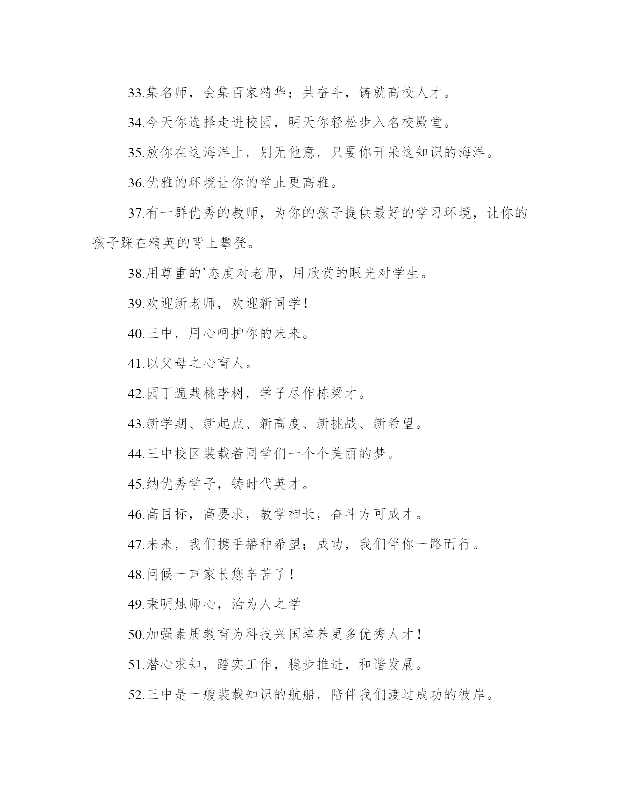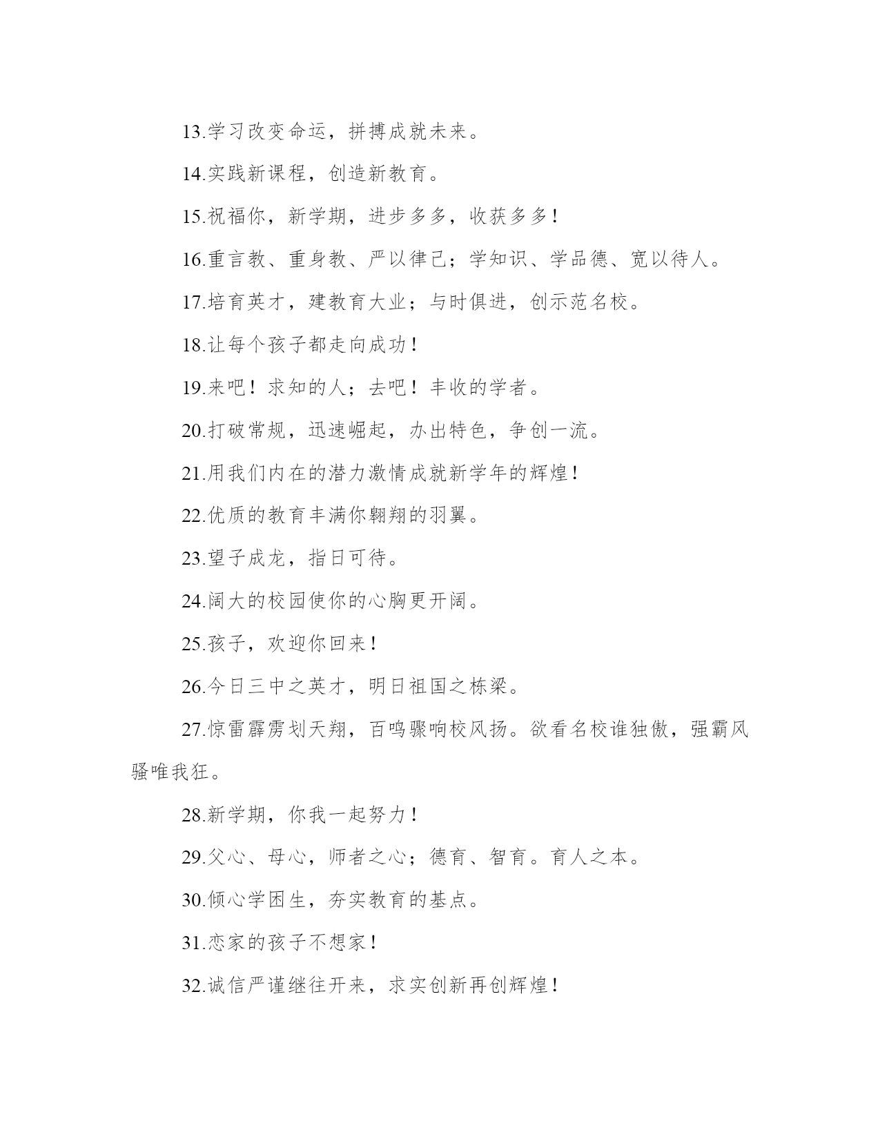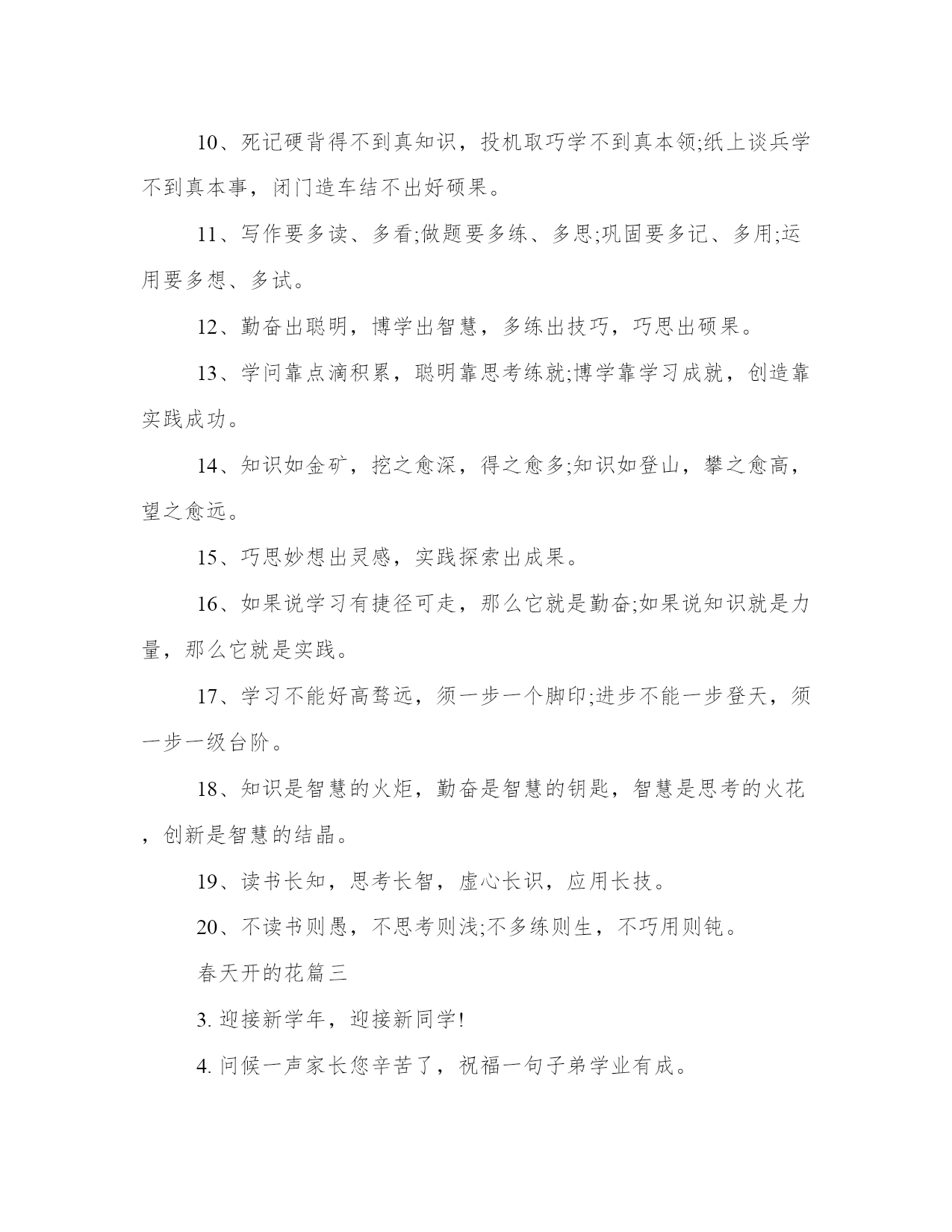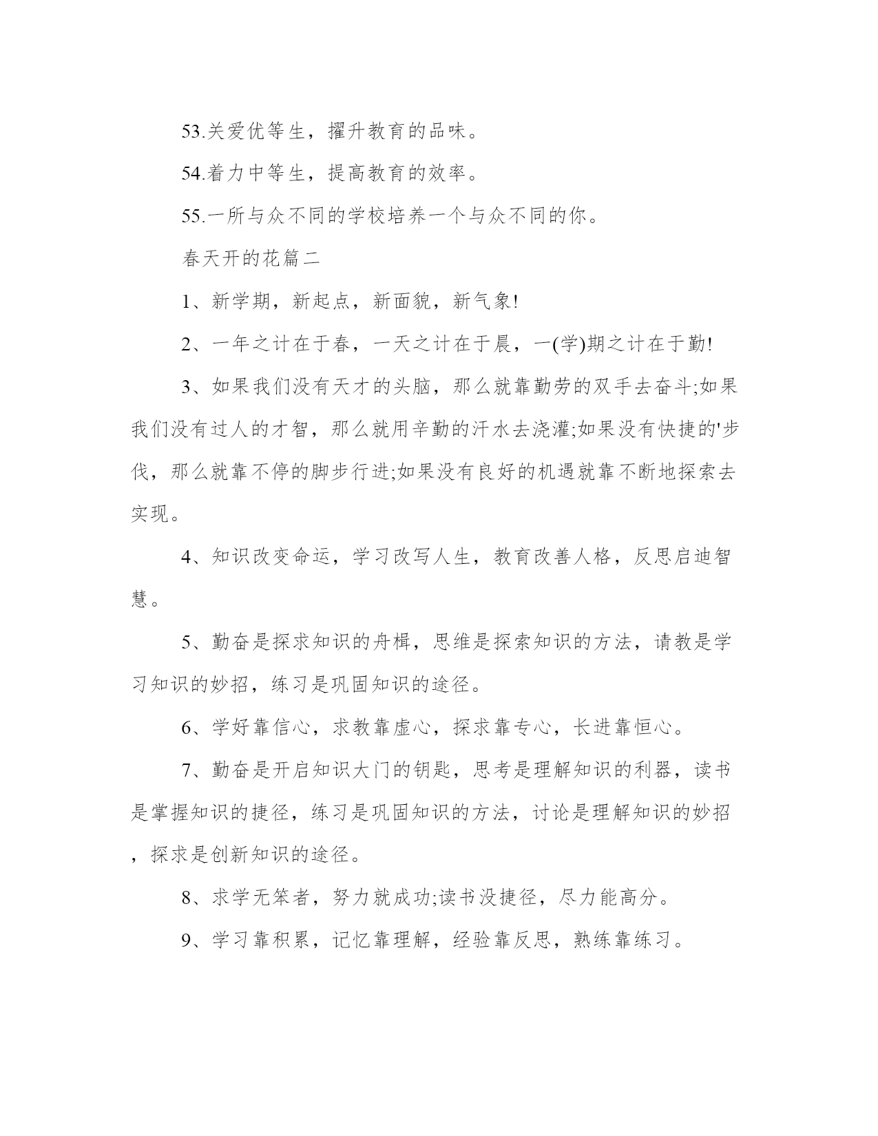 最新春天开的花(9篇)无论是身处学校还是步入社会,大家都尝试过写作吧,借助写作也可以提高我们的语言组织能力。大家想知道怎么样才能写一篇比较优质的范文吗?下面是小编帮大家整理的优质范文,仅供参考,大家一起来看看吧。春天开的花篇一1.老师如同父母亲,同学都有手足情。2.新学期,新举措,师生共进,拼搏才能收获。3.新的学年,新的起点,新的付出,新的收获!4.实施素质教育,勇立时代潮头;落实科教兴国,谱写八中华章。5.宝剑锋从磨砺出,梅花香自苦寒来!6.先进的设施奠定你成才的基点。7.假如失败和成功是杠杆的两端,到这里来寻找你的砝码。8.得天独厚的环境,无微不至的亲情;井然有序的管理,有口皆碑的质量。9.重德重才,潜心造就新一代;重教重学,全面培育栋梁才。10.滨海三中,托起未来之手,举起明天的太阳。11.用严谨的态度做工作,用宽容的胸怀待同事。12.推进学校活动文化建设,实现孩子健康快乐成长。13.学习改变命运,拼搏成就未来。14.实践新课程,创造新教育。15.祝福你,新学期,进步多多,收获多多!16.重言教、重身教、严以律己;学知识、学品德、宽以待人。17.培育英才,建教育大业;与时俱进,创示范名校。18.让每个孩子都走向成功!19.来吧!求知的人;去吧!丰收的学者。20.打破常规,迅速崛起,办出特色,争创一流。21.用我们内在的潜力激情成就新学年的辉煌!22.优质的教育丰满你翱翔的羽翼。23.望子成龙,指日可待。24.阔大的校园使你的心胸更开阔。25.孩子,欢迎你回来!26.今日三中之英才,明日祖国之栋梁。27.惊雷霹雳划天翔,百鸣骤响校风扬。欲看名校谁独傲,强霸风骚唯我狂。28.新学期,你我一起努力!29.父心、母心,师者之心;德育、智育。育人之本。30.倾心学困生,夯实教育的基点。31.恋家的孩子不想家!32.诚信严谨继往开来,求实创新再创辉煌!33.集名师,会集百家精华;共奋斗,铸就高校人才。34.今天你选择走进校园,明天你轻松步入名校殿堂。35.放你在这海洋上,别无他意,只要你开采这知识的海洋。36.优雅的环境让你的举止更高雅。37.有一群优秀的教师,为你的孩子提供最好的学习环境,让你的孩子踩在精英的背上攀登。38.用尊重的`态度对老师,用欣赏的眼光对学生。39.欢迎新老师,欢迎新同学!40.三中,用心呵护你的未来。41.以父母之心育人。42.园丁遍栽桃李树,学子尽作栋梁才。43.新学期、新起点、新高度、新挑战、新希望。44.三中校区装载着同学们一个个美丽的梦。45.纳优秀学子,铸时代英才。46.高目标,高要求,教学相长,奋斗方可成才。47.未来,我们携手播种希望;成功,我们伴你一路而行。48.问候一声家长您辛苦了!49.秉明烛师心,治为人之学50.加强素质教育为科技兴国培养更多优秀人才!51.潜心求知,踏实工作,稳步推进,和谐发展。52.三中是一艘装载知识的航船,陪伴我们渡过成功的彼岸。53.关爱优等生,擢升教育的品味。54.着力中等生,提高教育的效率。55.一所与众不同的学校培养一个与众不同的你。春天开的花篇二1、新学期,新起点,新面貌,新气象!2、一年之计在于春,一天之计在于晨,一(学)期之计在于勤!3、如果我们没有天才的头脑,那么就靠勤劳的双手去奋斗;如果我们没有过人的才智,那么就用辛勤的汗水去浇灌;如果没有快捷的'步伐,那么就靠不停的脚步行进;如果没有良好的机遇就靠不断地探索去实现。4、知识改变命运,学习改写人生,教育改善人格,反思启迪智慧。5、勤奋是探求知识的舟楫,思维是探索知识的方法,请教是学习知识的妙招,练习是巩固知识的途径。6、学好靠信心,求教靠虚心,探求靠专心,长进靠恒心。7、勤奋是开启知识大门的钥匙,思考是理解知识的利器,读书是掌握知识的捷径,练习是巩固知识的方法,讨论是理解知识的妙招,探求是创新知识的途径。8、求学无笨者,努力就成功;读书没捷径,尽力能高分。9、学习靠积累,记忆靠理解,经验靠反思,熟练靠练习。10、死记硬背得不到真知识,投机取巧学不到真本领;纸上谈兵学不到真本事,闭门造车结不出好硕果。11、写作要多读、多看;做题要多练、多思;巩固要多记、多用;运用要多想、多试。12、勤奋出聪明,博学出智慧,多练出技巧,巧思出硕果。13、学问靠点滴积累,聪明靠思考练就;博学靠学习成就,创造靠实践成功。14、知识如金矿,挖之愈深,得之愈多;知识如登山,攀之愈高,望之愈远。15、巧思妙想出灵感,实践探索出成果。16、如果说学习有捷径可走,那么它就是勤奋;如果说知识就是力量,那么它就是实践。17、学习不能好高骛远,须一步一个脚印;进步不能一步登天,须一步一级台阶。18、知识是智慧的火炬,勤奋是智慧的钥匙,智慧是思考的火花,创新是智慧的结晶。19、读书长知,思考长智,虚心长识,应用长技。20、不读书则愚,不