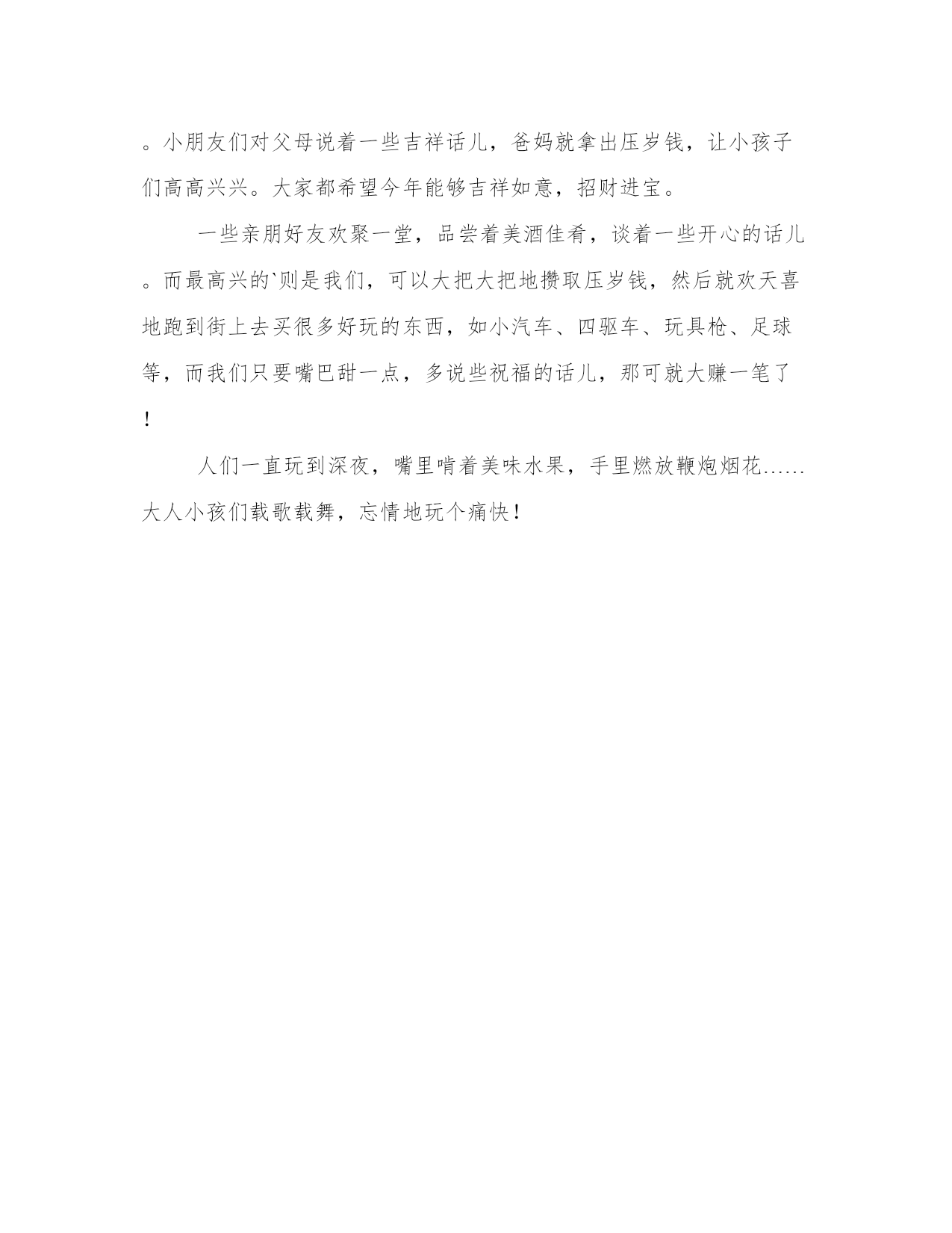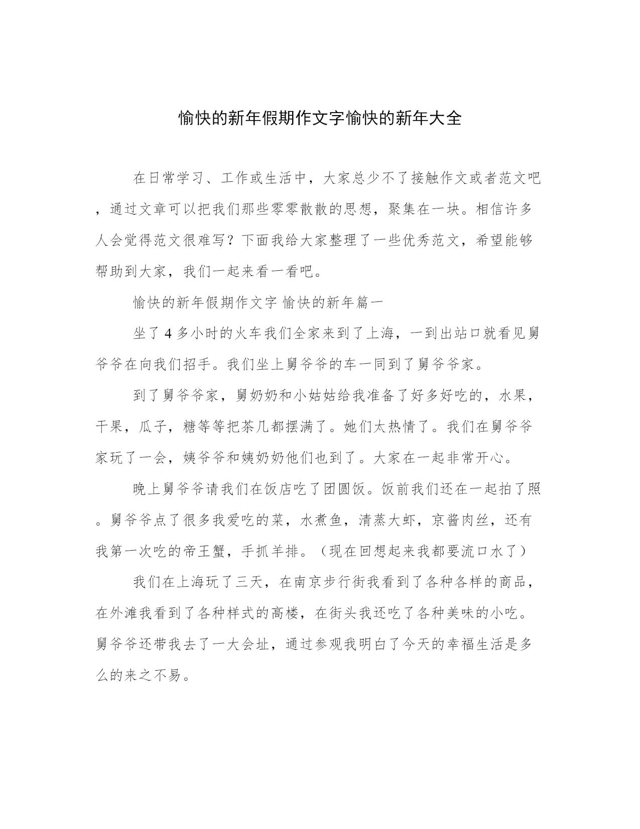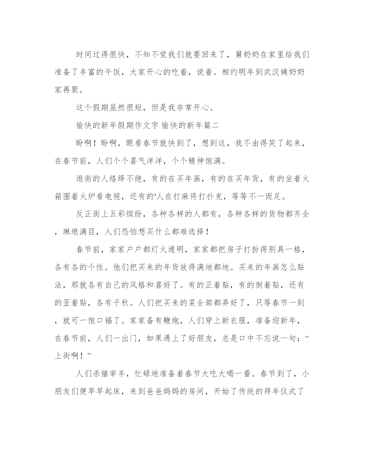 愉快的新年假期作文字愉快的新年大全在日常学习、工作或生活中,大家总少不了接触作文或者范文吧,通过文章可以把我们那些零零散散的思想,聚集在一块。相信许多人会觉得范文很难写?下面我给大家整理了一些优秀范文,希望能够帮助到大家,我们一起来看一看吧。愉快的新年假期作文字愉快的新年篇一坐了4多小时的火车我们全家来到了上海,一到出站口就看见舅爷爷在向我们招手。我们坐上舅爷爷的车一同到了舅爷爷家。到了舅爷爷家,舅奶奶和小姑姑给我准备了好多好吃的,水果,干果,瓜子,糖等等把茶几都摆满了。她们太热情了。我们在舅爷爷家玩了一会,姨爷爷和姨奶奶他们也到了。大家在一起非常开心。晚上舅爷爷请我们在饭店吃了团圆饭。饭前我们还在一起拍了照。舅爷爷点了很多我爱吃的菜,水煮鱼,清蒸大虾,京酱肉丝,还有我第一次吃的帝王蟹,手抓羊排。(现在回想起来我都要流口水了)我们在上海玩了三天,在南京步行街我看到了各种各样的商品,在外滩我看到了各种样式的高楼,在街头我还吃了各种美味的小吃。舅爷爷还带我去了一大会址,通过参观我明白了今天的幸福生活是多么的来之不易。时间过得很快,不知不觉我们就要回来了,舅奶奶在家里给我们准备了丰富的午饭,大家开心的吃着,说着。相约明年到武汉姨奶奶家再聚。这个假期虽然很短,但是我非常开心。愉快的新年假期作文字愉快的新年篇二盼啊!盼啊,眼看春节就快到了,想到这,我不由得笑了起来,在春节前,人们个个喜气洋洋,个个精神饱满。逛街的人络绎不绝,有的在买年画,有的在买年货,有的坐着火箱围着火炉看电视,还有的'人在打麻将打扑克,等等不一而足。反正街上五彩缤纷,各种各样的人都有,各种各样的货物都齐全,琳琅满目,人们恐怕想买什么都难选择!春节前,家家户户都灯火通明,家家都把房子打扮得别具一格,各有各的个性。他们把买来的年货放得满地都地。买来的年画怎么贴法,那就各有自己的风格和喜好了。有的正着贴,有的倒着贴,还有的歪着贴,各有千秋。人们把买来的菜全部都弄好了,只等春节一到,就可一饱口福了。家家备有鞭炮,人们穿上新衣服,准备迎新年,在春节前,人们一出门,如果遇上了好朋友,总是口中不忘说一句:“上街啊!”人们杀猪宰羊,忙碌地准备着春节大吃大喝一番。春节到了,小朋友们便早早起床,来到爸爸妈妈的房间,开始了传统的拜年仪式了。小朋友们对父母说着一些吉祥话儿,爸妈就拿出压岁钱,让小孩子们高高兴兴。大家都希望今年能够吉祥如意,招财进宝。一些亲朋好友欢聚一堂,品尝着美酒佳肴,谈着一些开心的话儿。而最高兴的`则是我们,可以大把大把地攒取压岁钱,然后就欢天喜地跑到街上去买很多好玩的东西,如小汽车、四驱车、玩具枪、足球等,而我们只要嘴巴甜一点,多说些祝福的话儿,那可就大赚一笔了!人们一直玩到深夜,嘴里啃着美味水果,手里燃放鞭炮烟花……大人小孩们载歌载舞,忘情地玩个痛快!