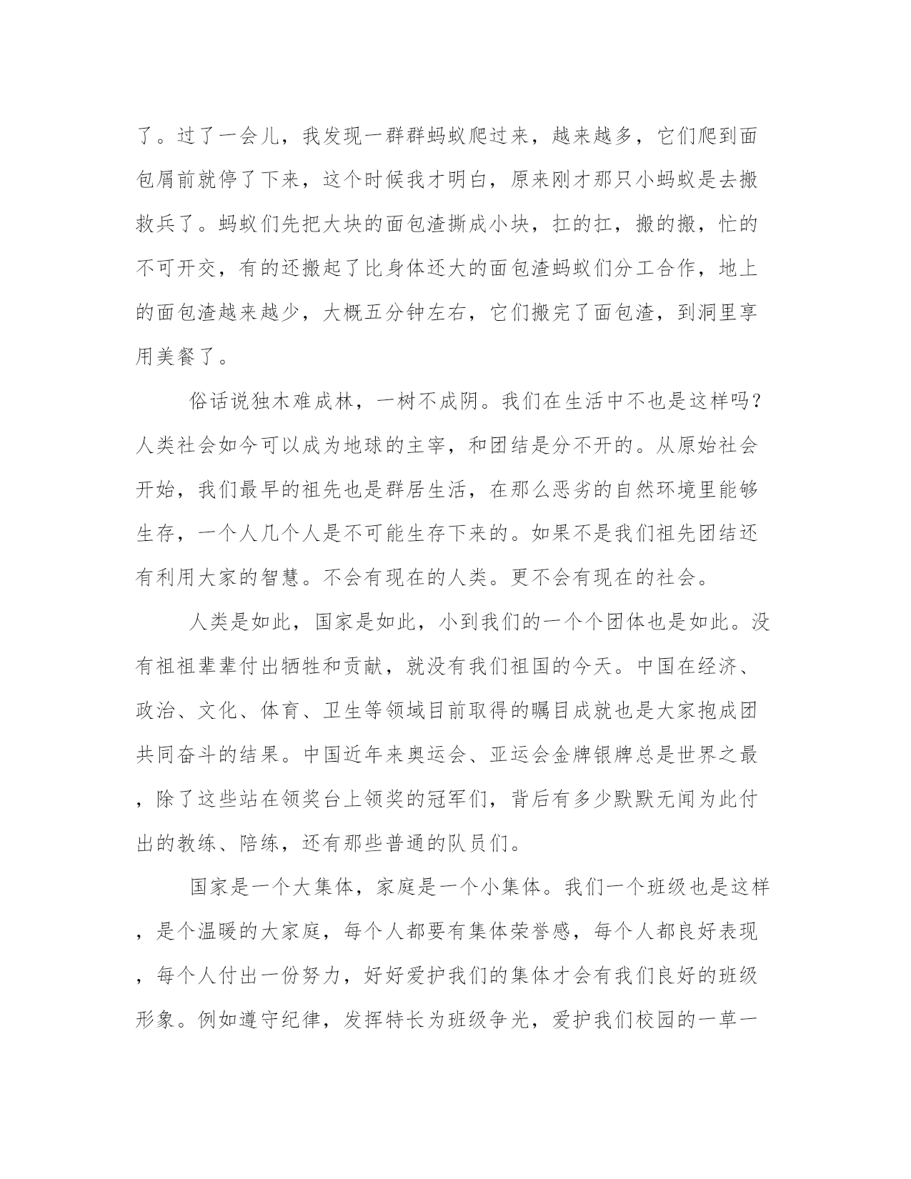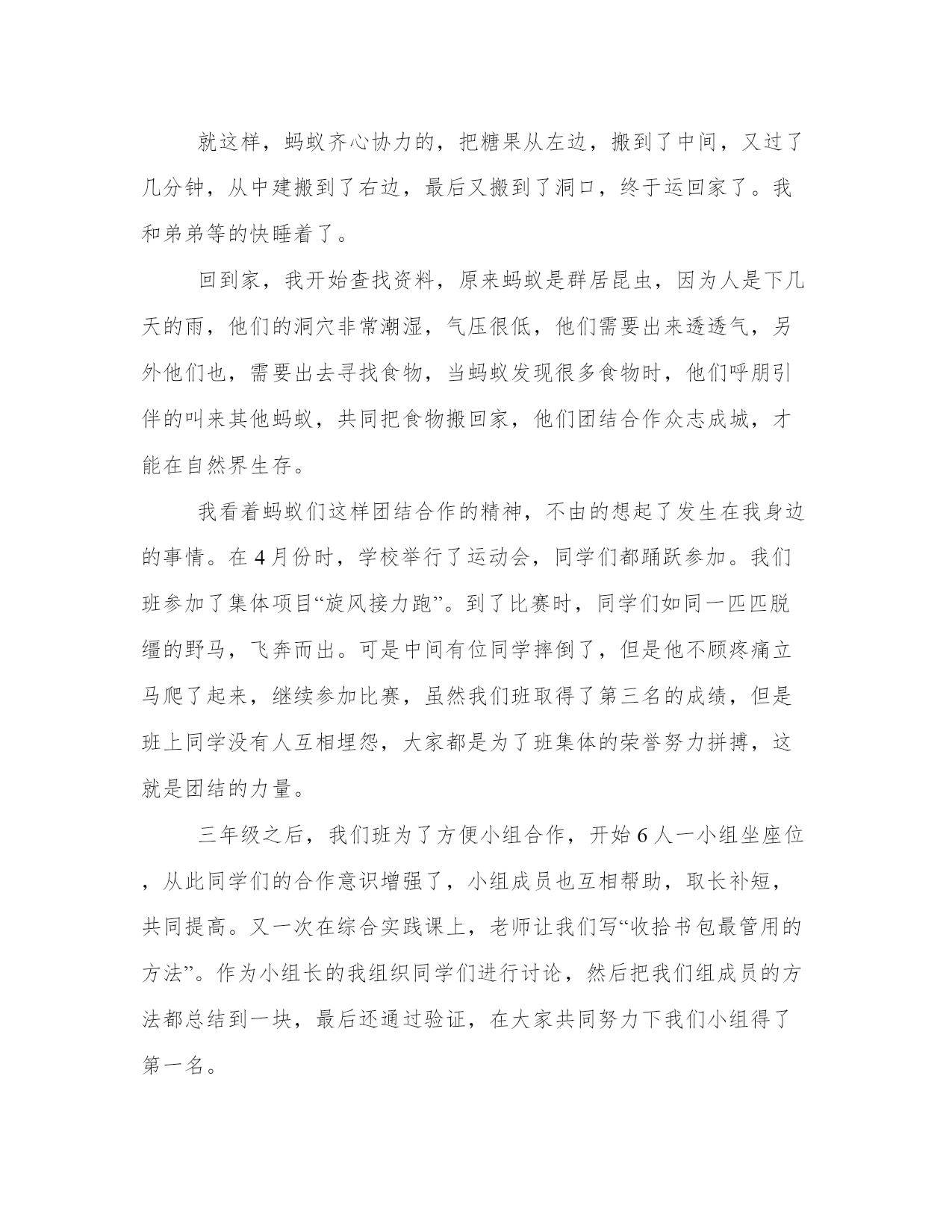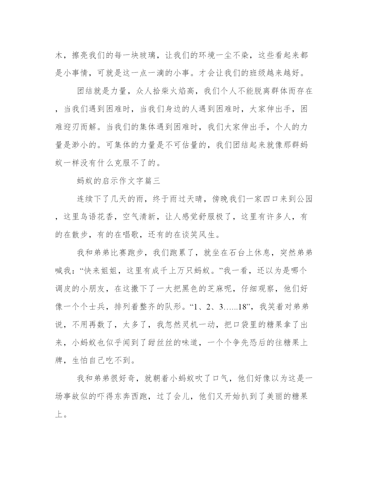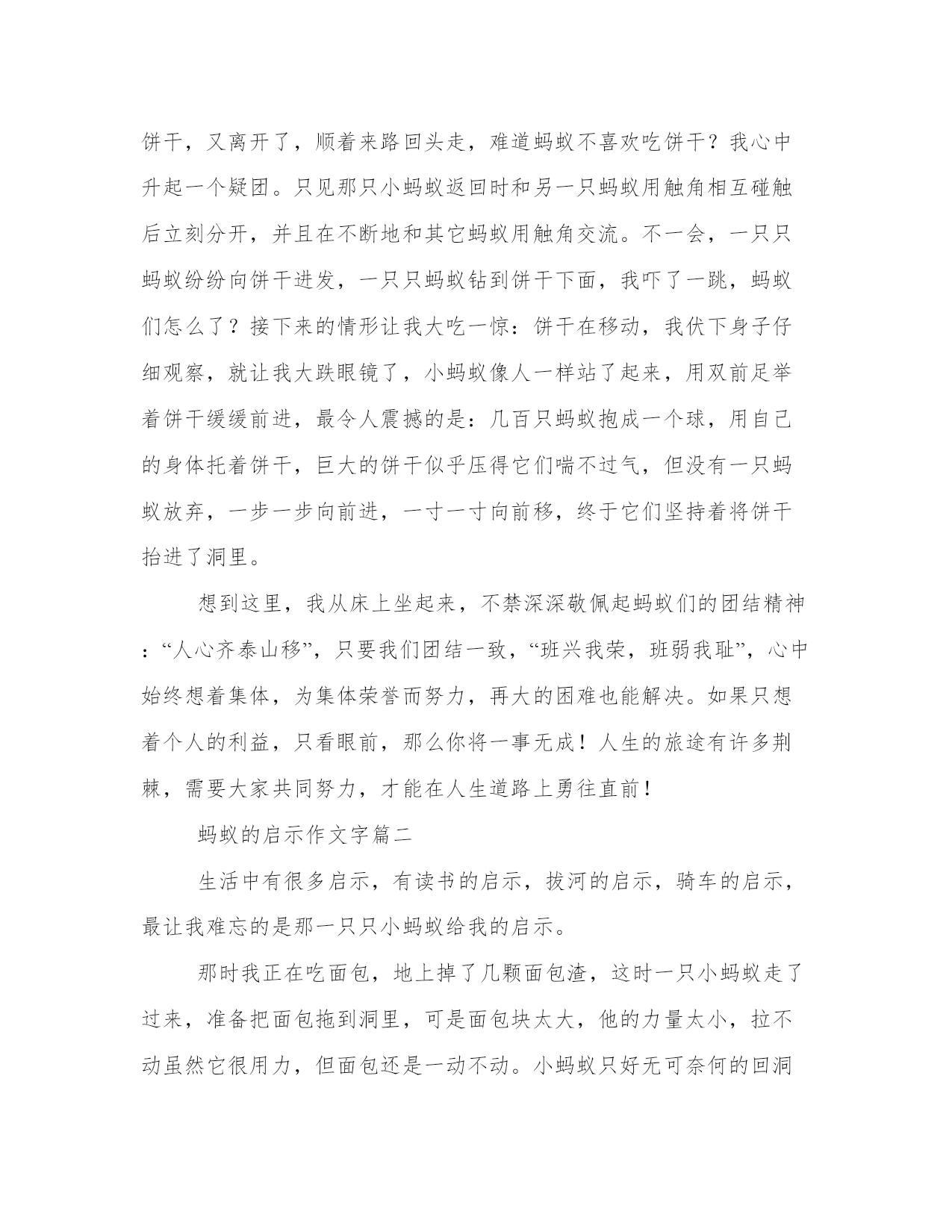 2023年蚂蚁的启示作文字精选(12篇)无论是身处学校还是步入社会,大家都尝试过写作吧,借助写作也可以提高我们的语言组织能力。那么我们该如何写一篇较为完美的范文呢?下面是小编为大家收集的优秀范文,供大家参考借鉴,希望可以帮助到有需要的朋友。蚂蚁的启示作文字篇一夜深了,皎洁的月光洒在窗帘上,像镀上了一层银边,空气中弥漫着淡淡的藏香,四周一片寂静,我却难以入睡,下午的一幕又浮现在我的眼前。下午,我在楼下的花坛边玩耍,突然,一群小蚂蚁映入我的眼帘:它们在地上爬来爬去,还用触角相互碰触交流,看那样子,视乎是饿得发慌,在为食物而焦急奔走。我摸了摸口袋,找到一块小小的饼干,我把它放在小蚂蚁的边上,心想:听说蚂蚁是“大力士”,能搬起比自身重几十倍的东西,这次我的好好瞧瞧!就这样,我抱着看戏的心态在旁边坐了下来。但小蚂蚁似乎并不领我的情,依旧忙忙碌碌,爬来爬去找吃的,我大惑不解,心里也有点不快,我好心好意给你们吃的,竟然视而不见,但无奈于蚂蚁听不懂我的话,我说的再多也等于对牛弹琴,只好作罢。我起身准备离开,突然我看到一只小蚂蚁发现了饼干,我的心中立刻闪起一丝光亮,重新燃起希望,但发现饼干的那只小蚂蚁推了推饼干,又离开了,顺着来路回头走,难道蚂蚁不喜欢吃饼干?我心中升起一个疑团。只见那只小蚂蚁返回时和另一只蚂蚁用触角相互碰触后立刻分开,并且在不断地和其它蚂蚁用触角交流。不一会,一只只蚂蚁纷纷向饼干进发,一只只蚂蚁钻到饼干下面,我吓了一跳,蚂蚁们怎么了?接下来的情形让我大吃一惊:饼干在移动,我伏下身子仔细观察,就让我大跌眼镜了,小蚂蚁像人一样站了起来,用双前足举着饼干缓缓前进,最令人震撼的是:几百只蚂蚁抱成一个球,用自己的身体托着饼干,巨大的饼干似乎压得它们喘不过气,但没有一只蚂蚁放弃,一步一步向前进,一寸一寸向前移,终于它们坚持着将饼干抬进了洞里。想到这里,我从床上坐起来,不禁深深敬佩起蚂蚁们的团结精神:“人心齐泰山移”,只要我们团结一致,“班兴我荣,班弱我耻”,心中始终想着集体,为集体荣誉而努力,再大的困难也能解决。如果只想着个人的利益,只看眼前,那么你将一事无成!人生的旅途有许多荆棘,需要大家共同努力,才能在人生道路上勇往直前!蚂蚁的启示作文字篇二生活中有很多启示,有读书的启示,拔河的启示,骑车的启示,最让我难忘的是那一只只小蚂蚁给我的启示。那时我正在吃面包,地上掉了几颗面包渣,这时一只小蚂蚁走了过来,准备把面包拖到洞里,可是面包块太大,他的力量太小,拉不动虽然它很用力,但面包还是一动不动。小蚂蚁只好无可奈何的回洞了。过了一会儿,我发现一群群蚂蚁爬过来,越来越多,它们爬到面包屑前就停了下来,这个时候我才明白,原来刚才那只小蚂蚁是去搬救兵了。蚂蚁们先把大块的面包渣撕成小块,扛的扛,搬的搬,忙的不可开交,有的还搬起了比身体还大的面包渣蚂蚁们分工合作,地上的面包渣越来越少,大概五分钟左右,它们搬完了面包渣,到洞里享用美餐了。俗话说独木难成林,一树不成阴。我们在生活中不也是这样吗?人类社会如今可以成为地球的主宰,和团结是分不开的。从原始社会开始,我们最早的祖先也是群居生活,在那么恶劣的自然环境里能够生存,一个人几个人是不可能生存下来的。如果不是我们祖先团结还有利用大家的智慧。不会有现在的人类。更不会有现在的社会。人类是如此,国家是如此,小到我们的一个个团体也是如此。没有祖祖辈辈付出牺牲和贡献,就没有我们祖国的今天。中国在经济、政治、文化、体育、卫生等领域目前取得的瞩目成就也是大家抱成团共同奋斗的结果。中国近年来奥运会、亚运会金牌银牌总是世界之最,除了这些站在领奖台上领奖的冠军们,背后有多少默默无闻为此付出的教练、陪练,还有那些普通的队员们。国家是一个大集体,家庭是一个小集体。我们一个班级也是这样,是个温暖的大家庭,每个人都要有集体荣誉感,每个人都良好表现,每个人付出一份努力,好好爱护我们的集体才会有我们良好的班级形象。例如遵守纪律,发挥特长为班级争光,爱护我们校园的一草一木,擦亮我们的每一块玻璃,让我们的环境一尘不染,这些看起来都是小事情,可就是这一点一滴的小事。才会让我们的班级越来越好。团结就是力量,众人拾柴火焰高,我们个人不能脱离群体而存在,当我们遇到困难时,当我们身边的人遇到困难时,大家伸出手,困难迎刃而解。当我们的集体遇到困难时,我们大家伸出手,个人的力量是渺小的。可集体的力量是不可估量的,我们团结起来就像那群蚂蚁一样没有什么克服不了的。蚂蚁的启示作文字篇三连续下了几天的雨,终于雨过天晴,傍晚我们一家四口来到公园,这里鸟语花香,空气清新,让人感觉舒服极了,这里有许多人,有的在散步,有的在唱歌,还有的在谈笑风生。我和弟弟比赛跑步,我们跑累了,就坐在石台上休息,突然弟弟喊我:“快来姐姐,这里有成千上万只蚂蚁。”我一看,还以为是哪个调皮的小朋友,