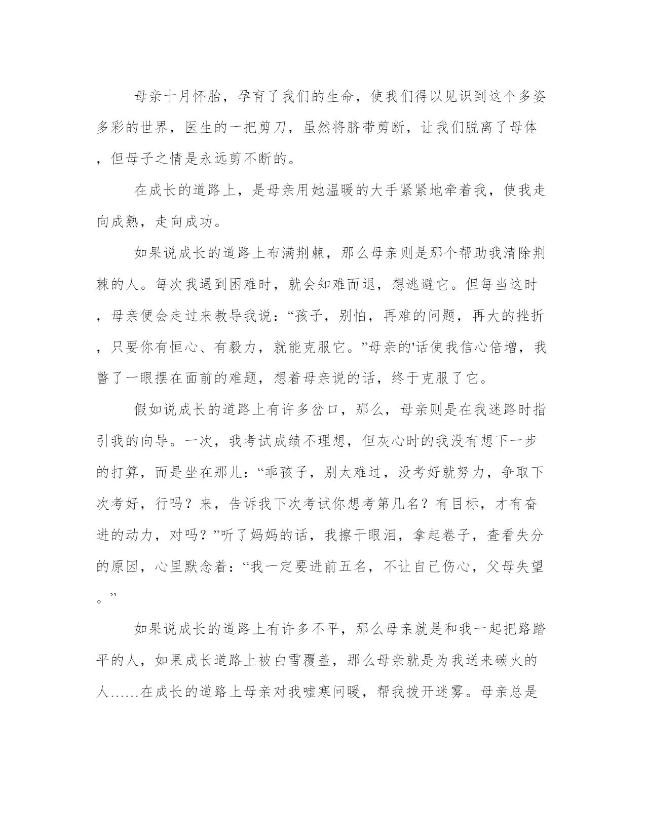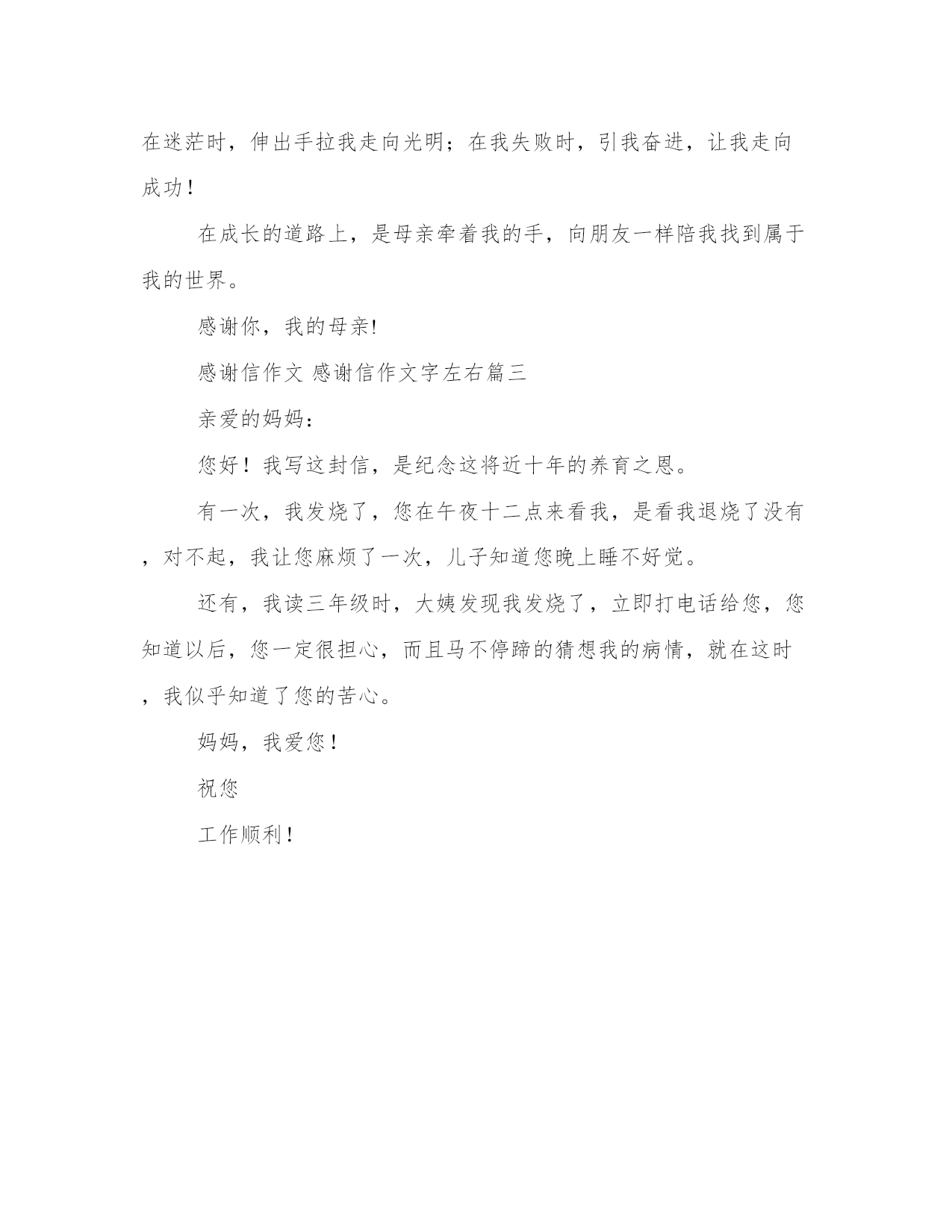 2023年感谢信作文感谢信作文字左右(三篇)每个人都曾试图在平淡的学习、工作和生活中写一篇文章。写作是培养人的观察、联想、想象、思维和记忆的重要手段。那么我们该如何写一篇较为完美的范文呢?下面我给大家整理了一些优秀范文,希望能够帮助到大家,我们一起来看一看吧。感谢信作文感谢信作文字左右篇一星期一的那一天,我在班读书,突然,我的肚子痛。你的家刚好在学校的旁边,你马上冲到家里拿药,帮我搽肚子的时候,我感到一种温暖直射入我的心田。我很感谢老师你,你教我做人的道理,还教我读书。你不仅是个有责任感的人,还是个非常好的老师。你是我心目中最好老师,我会好好的学习的,将来会好好的报答你的。祝你祝你心想事成吴启雄20xx年7月25日四年级:吴启雄感谢信作文感谢信作文字左右篇二母亲十月怀胎,孕育了我们的生命,使我们得以见识到这个多姿多彩的世界,医生的一把剪刀,虽然将脐带剪断,让我们脱离了母体,但母子之情是永远剪不断的。在成长的道路上,是母亲用她温暖的大手紧紧地牵着我,使我走向成熟,走向成功。如果说成长的道路上布满荆棘,那么母亲则是那个帮助我清除荆棘的人。每次我遇到困难时,就会知难而退,想逃避它。但每当这时,母亲便会走过来教导我说:“孩子,别怕,再难的问题,再大的挫折,只要你有恒心、有毅力,就能克服它。”母亲的'话使我信心倍增,我瞥了一眼摆在面前的难题,想着母亲说的话,终于克服了它。假如说成长的道路上有许多岔口,那么,母亲则是在我迷路时指引我的向导。一次,我考试成绩不理想,但灰心时的我没有想下一步的打算,而是坐在那儿:“乖孩子,别太难过,没考好就努力,争取下次考好,行吗?来,告诉我下次考试你想考第几名?有目标,才有奋进的动力,对吗?”听了妈妈的话,我擦干眼泪,拿起卷子,查看失分的原因,心里默念着:“我一定要进前五名,不让自己伤心,父母失望。”如果说成长的道路上有许多不平,那么母亲就是和我一起把路踏平的人,如果成长道路上被白雪覆盖,那么母亲就是为我送来碳火的人……在成长的道路上母亲对我嘘寒问暖,帮我拨开迷雾。母亲总是在迷茫时,伸出手拉我走向光明;在我失败时,引我奋进,让我走向成功!在成长的道路上,是母亲牵着我的手,向朋友一样陪我找到属于我的世界。感谢你,我的母亲!感谢信作文感谢信作文字左右篇三亲爱的妈妈:您好!我写这封信,是纪念这将近十年的养育之恩。有一次,我发烧了,您在午夜十二点来看我,是看我退烧了没有,对不起,我让您麻烦了一次,儿子知道您晚上睡不好觉。还有,我读三年级时,大姨发现我发烧了,立即打电话给您,您知道以后,您一定很担心,而且马不停蹄的猜想我的病情,就在这时,我似乎知道了您的苦心。妈妈,我爱您!祝您工作顺利!