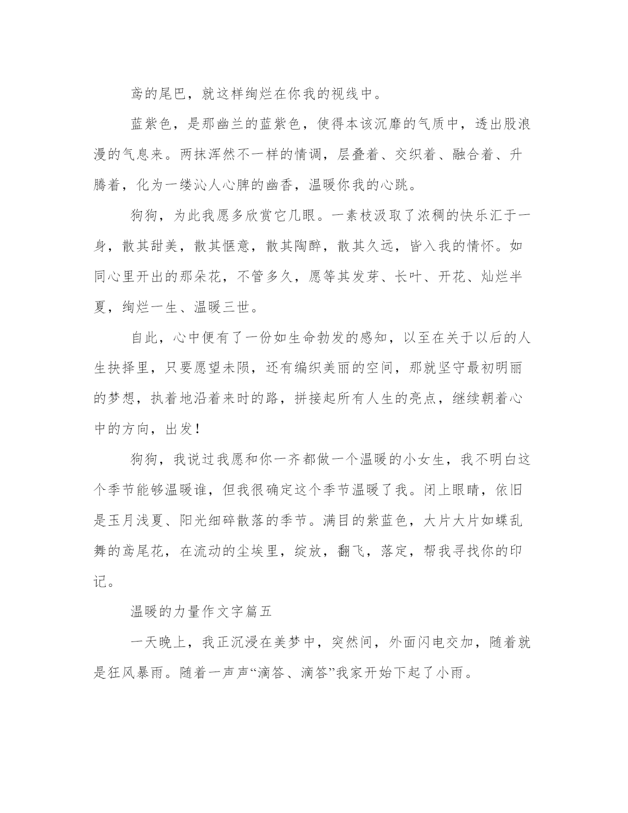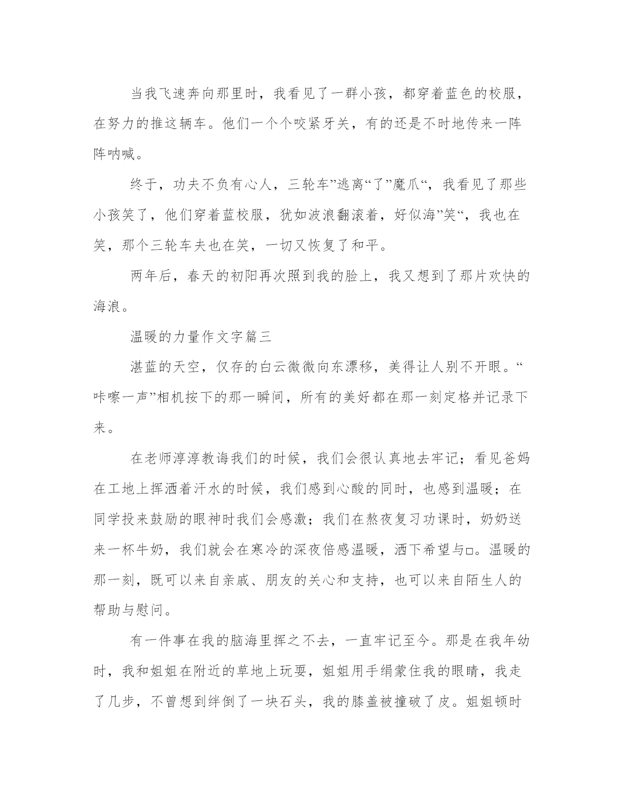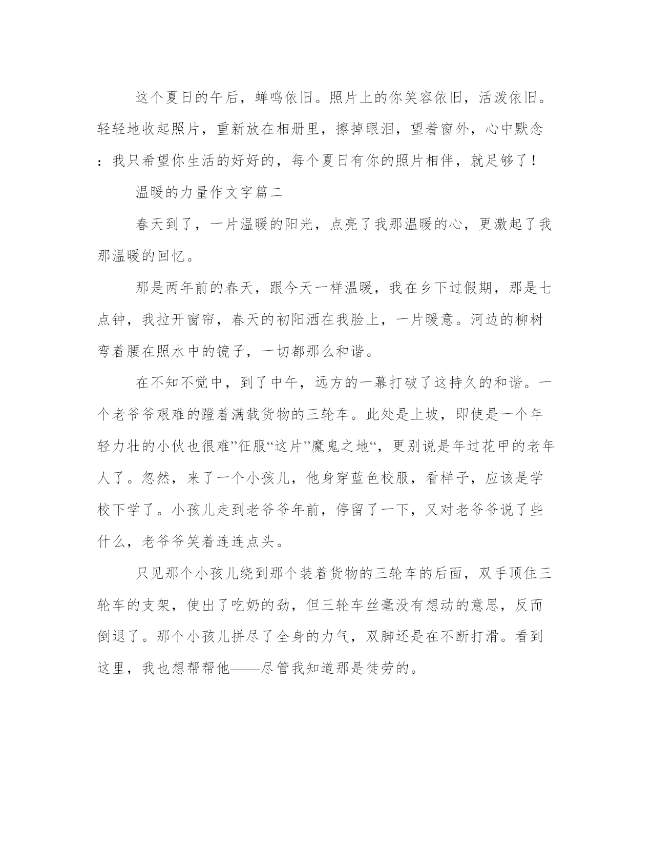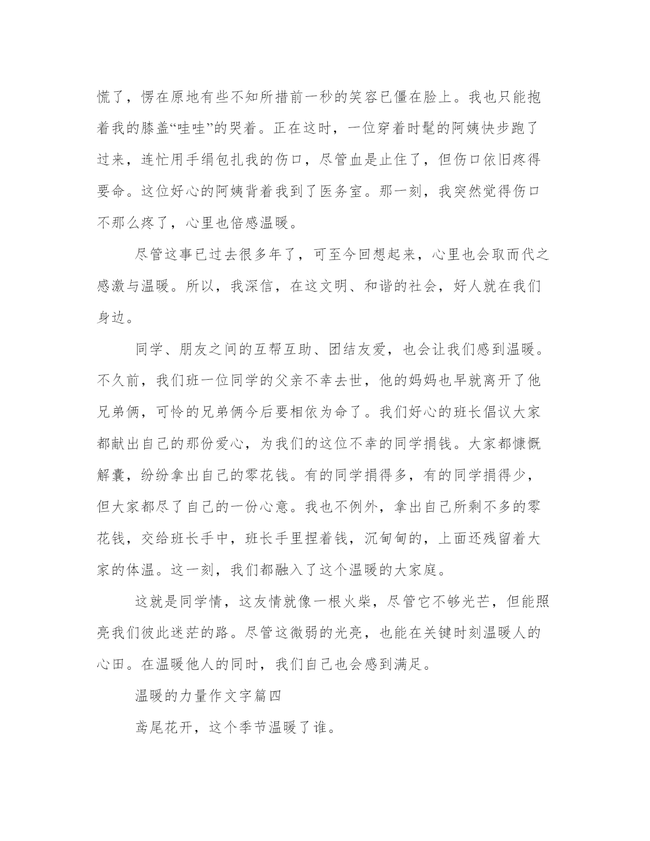 2023年温暖的力量作文字(十一篇)无论是身处学校还是步入社会,大家都尝试过写作吧,借助写作也可以提高我们的语言组织能力。相信许多人会觉得范文很难写?下面是小编帮大家整理的优质范文,仅供参考,大家一起来看看吧。温暖的力量作文字篇一夏日,虫鸣。清晰地记得那个曾经是我“铁哥们”的女孩。我从相册里拿出一张旧照片,使得记忆的匣门葛然打开,宛如时光倒流。是的,镜头记录的,恰恰就是小学生活里的美好。那天是新的一学期开学,你转到我们班上,成了我们班里的一份子,渐渐地还成了我的“铁哥们”。你的脸上总是挂着灿烂的笑容,如夏日炽热的阳光般温暖着我。风把你的秀发吹起,似乎还散发着淡淡的清香,阳光下的你,热情、活泼、洒脱!渐渐地,我们彼此都熟悉了,友谊也变得更深厚、更坚固了。记得有一次,我生病了,终于熬到了吃饭的时间,同学们都争先恐后的去打饭吃,只有我还呆呆地趴在课桌上,我的“铁哥们”走过来,对我说:“你不舒服,还是要吃饭呀!我去帮我打饭吧."你不容我回答,便帮我打饭去了。这时,我的心上涌起一股暖流,仿佛病从身上走了似的。这个夏日的午后,蝉鸣依旧。照片上的你笑容依旧,活泼依旧。轻轻地收起照片,重新放在相册里,擦掉眼泪,望着窗外,心中默念:我只希望你生活的好好的,每个夏日有你的照片相伴,就足够了!温暖的力量作文字篇二春天到了,一片温暖的阳光,点亮了我那温暖的心,更激起了我那温暖的回忆。那是两年前的春天,跟今天一样温暖,我在乡下过假期,那是七点钟,我拉开窗帘,春天的初阳洒在我脸上,一片暖意。河边的柳树弯着腰在照水中的镜子,一切都那么和谐。在不知不觉中,到了中午,远方的一幕打破了这持久的和谐。一个老爷爷艰难的蹬着满载货物的三轮车。此处是上坡,即使是一个年轻力壮的小伙也很难”征服“这片”魔鬼之地“,更别说是年过花甲的老年人了。忽然,来了一个小孩儿,他身穿蓝色校服,看样子,应该是学校下学了。小孩儿走到老爷爷年前,停留了一下,又对老爷爷说了些什么,老爷爷笑着连连点头。只见那个小孩儿绕到那个装着货物的三轮车的后面,双手顶住三轮车的支架,使出了吃奶的劲,但三轮车丝毫没有想动的意思,反而倒退了。那个小孩儿拼尽了全身的力气,双脚还是在不断打滑。看到这里,我也想帮帮他——尽管我知道那是徒劳的。当我飞速奔向那里时,我看见了一群小孩,都穿着蓝色的校服,在努力的推这辆车。他们一个个咬紧牙关,有的还是不时地传来一阵阵呐喊。终于,功夫不负有心人,三轮车”逃离“了”魔爪“,我看见了那些小孩笑了,他们穿着蓝校服,犹如波浪翻滚着,好似海”笑“,我也在笑,那个三轮车夫也在笑,一切又恢复了和平。两年后,春天的初阳再次照到我的脸上,我又想到了那片欢快的海浪。温暖的力量作文字篇三湛蓝的天空,仅存的白云微微向东漂移,美得让人别不开眼。“咔嚓一声”相机按下的那一瞬间,所有的美好都在那一刻定格并记录下来。在老师淳淳教诲我们的时候,我们会很认真地去牢记;看见爸妈在工地上挥洒着汗水的时候,我们感到心酸的同时,也感到温暖;在同学投来鼓励的眼神时我们会感激;我们在熬夜复习功课时,奶奶送来一杯牛奶,我们就会在寒冷的深夜倍感温暖,洒下希望与□。温暖的那一刻,既可以来自亲戚、朋友的关心和支持,也可以来自陌生人的帮助与慰问。有一件事在我的脑海里挥之不去,一直牢记至今。那是在我年幼时,我和姐姐在附近的草地上玩耍,姐姐用手绢蒙住我的眼睛,我走了几步,不曾想到绊倒了一块石头,我的膝盖被撞破了皮。姐姐顿时慌了,愣在原地有些不知所措前一秒的笑容已僵在脸上。我也只能抱着我的膝盖“哇哇”的哭着。正在这时,一位穿着时髦的阿姨快步跑了过来,连忙用手绢包扎我的伤口,尽管血是止住了,但伤口依旧疼得要命。这位好心的阿姨背着我到了医务室。那一刻,我突然觉得伤口不那么疼了,心里也倍感温暖。尽管这事已过去很多年了,可至今回想起来,心里也会取而代之感激与温暖。所以,我深信,在这文明、和谐的社会,好人就在我们身边。同学、朋友之间的互帮互助、团结友爱,也会让我们感到温暖。不久前,我们班一位同学的父亲不幸去世,他的妈妈也早就离开了他兄弟俩,可怜的兄弟俩今后要相依为命了。我们好心的班长倡议大家都献出自己的那份爱心,为我们的这位不幸的同学捐钱。大家都慷慨解囊,纷纷拿出自己的零花钱。有的同学捐得多,有的同学捐得少,但大家都尽了自己的一份心意。我也不例外,拿出自己所剩不多的零花钱,交给班长手中,班长手里捏着钱,沉甸甸的,上面还残留着大家的体温。这一刻,我们都融入了这个温暖的大家庭。这就是同学情,这友情就像一根火柴,尽管它不够光芒,但能照亮我们彼此迷茫的路。尽管这微弱的光亮,也能在关键时刻温暖人的心田。在温暖他人的同时,我们自己也会感到满足。温暖的力量作文字篇四鸢尾花开,这个季节温暖了谁。鸢的尾巴,就这样绚烂在你我的视线中。蓝紫色,是那幽兰的蓝紫色,使得本该沉靡的