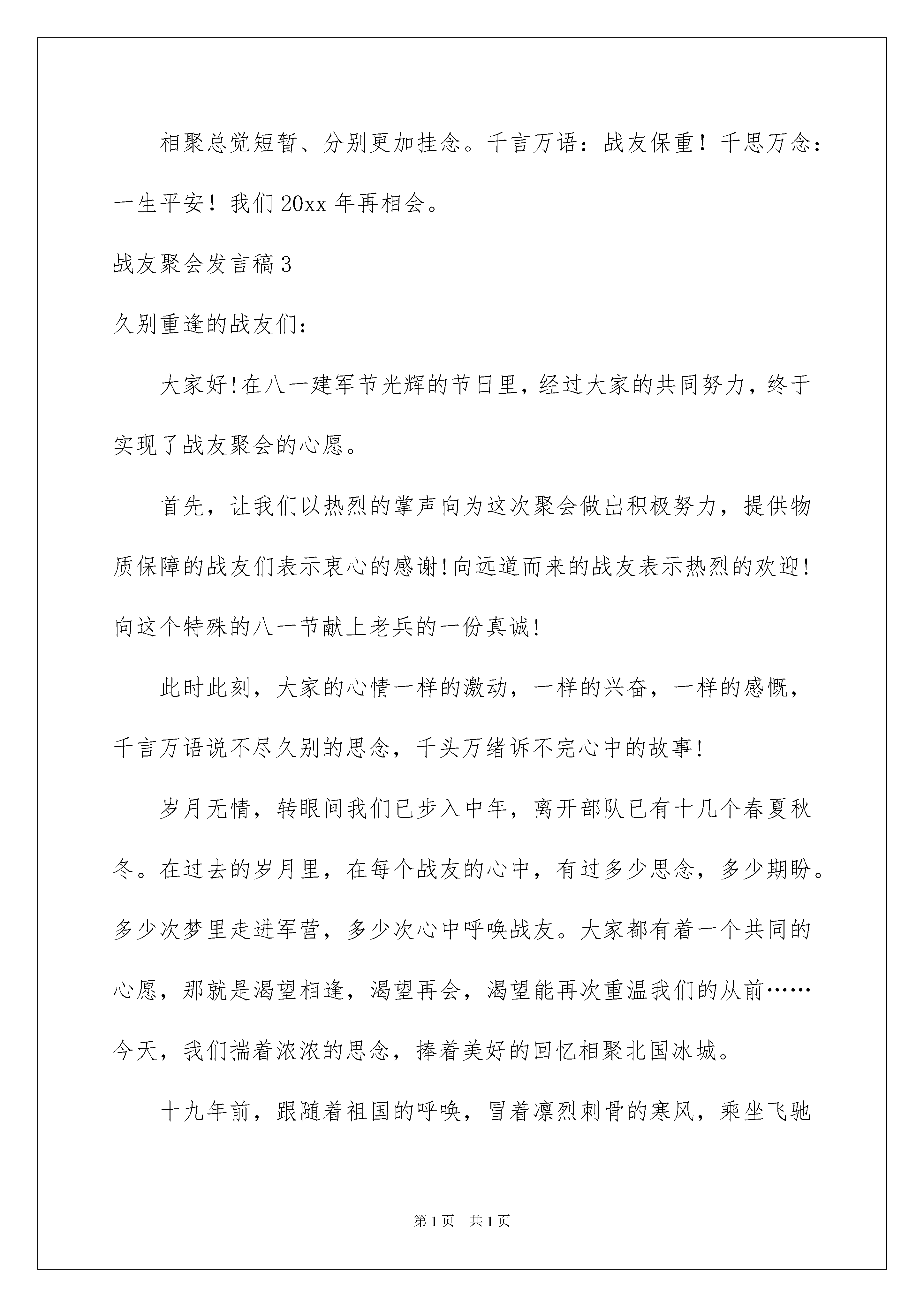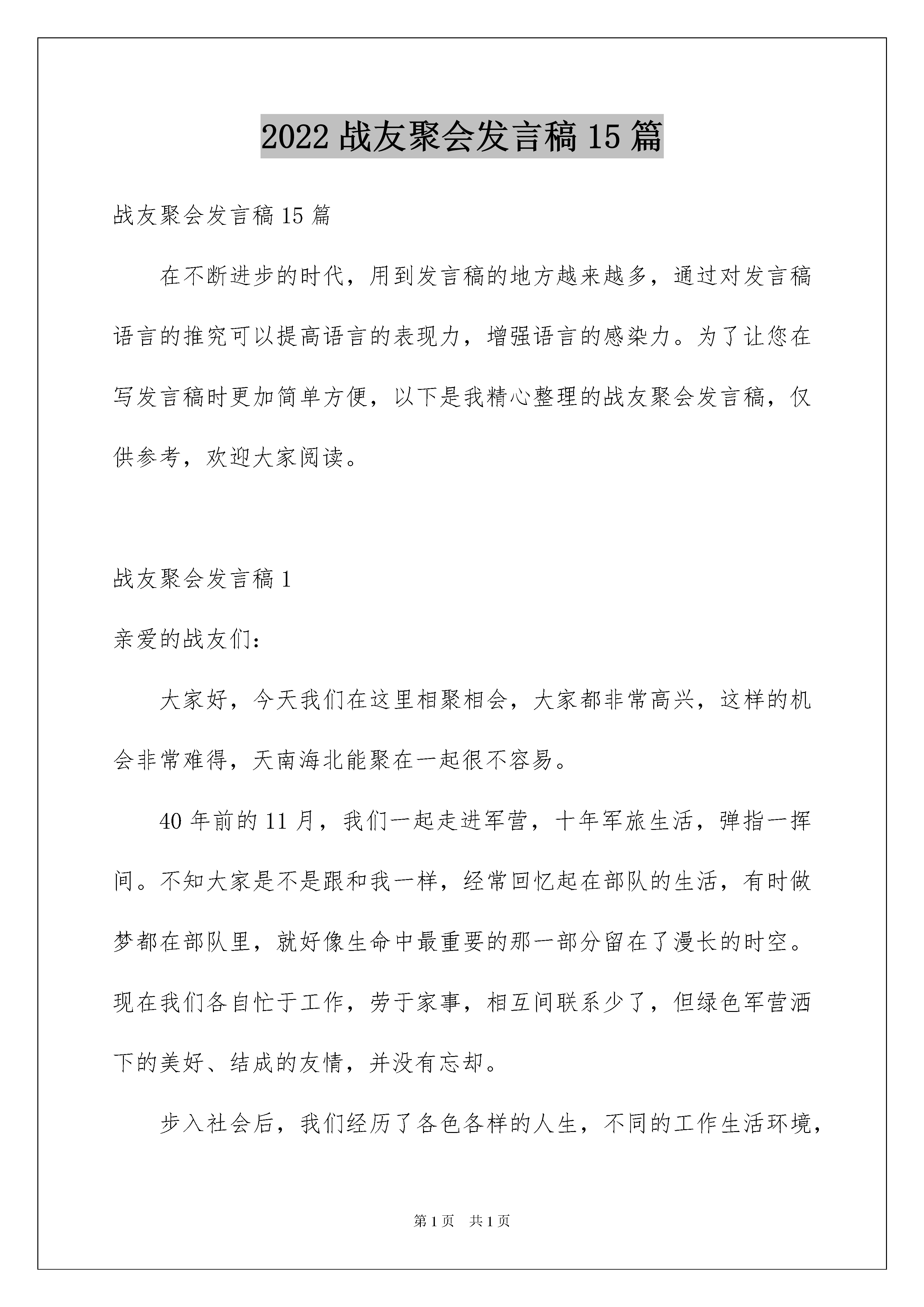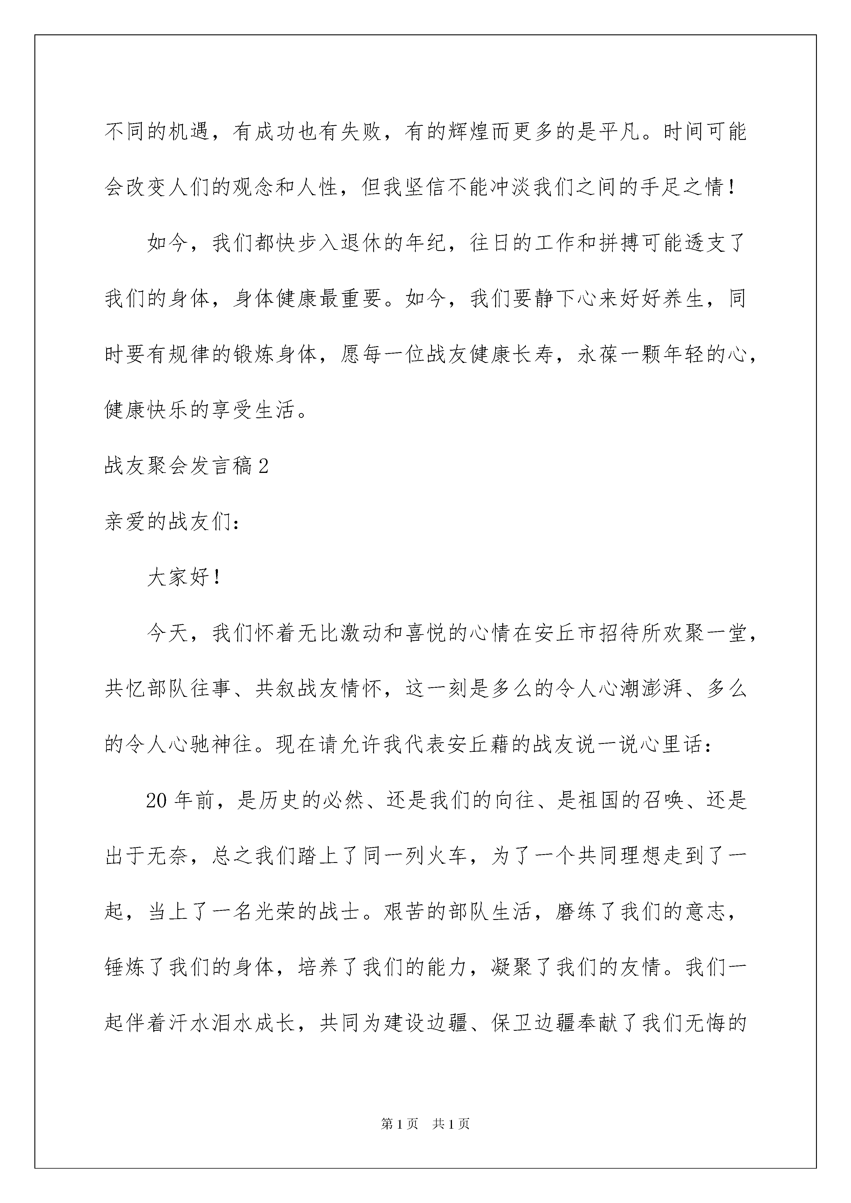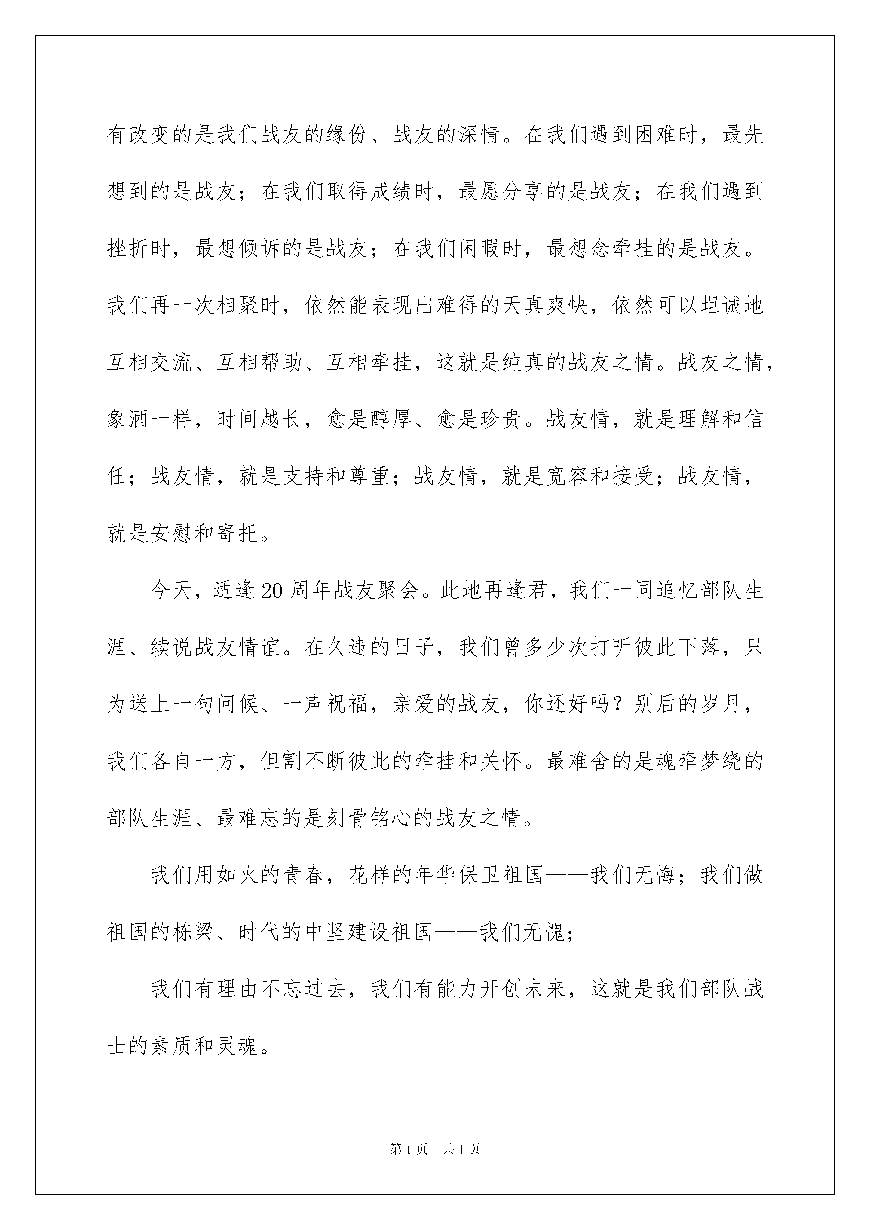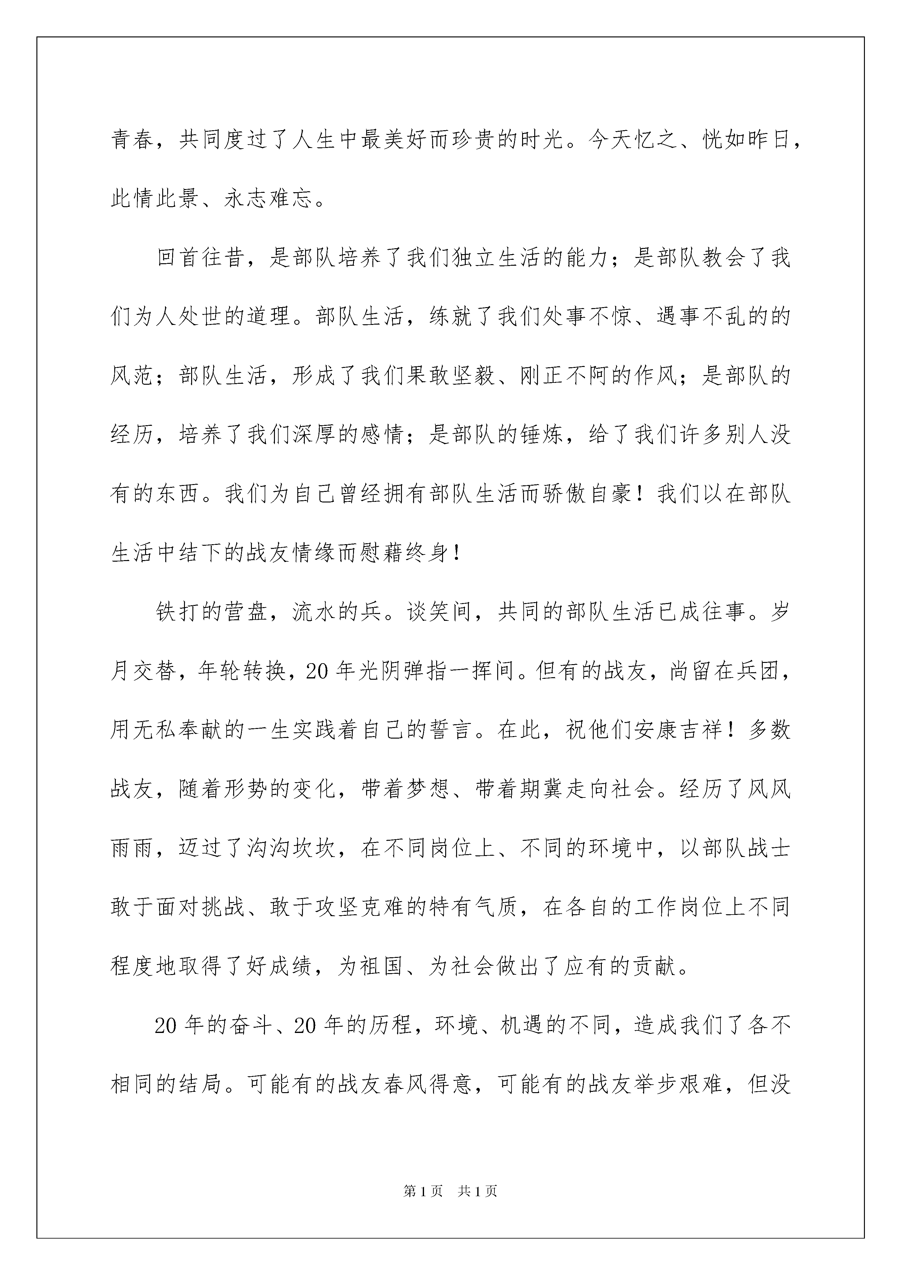 2022战友聚会发言稿15篇战友聚会发言稿15篇在不断进步的时代,用到发言稿的地方越来越多,通过对发言稿语言的推究可以提高语言的表现力,增强语言的感染力。为了让您在写发言稿时更加简单方便,以下是我精心整理的战友聚会发言稿,仅供参考,欢迎大家阅读。战友聚会发言稿1亲爱的战友们:大家好,今天我们在这里相聚相会,大家都非常高兴,这样的机会非常难得,天南海北能聚在一起很不容易。40年前的11月,我们一起走进军营,十年军旅生活,弹指一挥间。不知大家是不是跟和我一样,经常回忆起在部队的生活,有时做梦都在部队里,就好像生命中最重要的那一部分留在了漫长的时空。现在我们各自忙于工作,劳于家事,相互间联系少了,但绿色军营洒下的美好、结成的友情,并没有忘却。步入社会后,我们经历了各色各样的人生,不同的工作生活环境,不同的机遇,有成功也有失败,有的辉煌而更多的是平凡。时间可能会改变人们的观念和人性,但我坚信不能冲淡我们之间的手足之情!如今,我们都快步入退休的年纪,往日的工作和拼搏可能透支了我们的身体,身体健康最重要。如今,我们要静下心来好好养生,同时要有规律的锻炼身体,愿每一位战友健康长寿,永葆一颗年轻的心,健康快乐的享受生活。战友聚会发言稿2亲爱的战友们:大家好!今天,我们怀着无比激动和喜悦的心情在安丘市招待所欢聚一堂,共忆部队往事、共叙战友情怀,这一刻是多么的令人心潮澎湃、多么的令人心驰神往。现在请允许我代表安丘藉的战友说一说心里话:20年前,是历史的必然、还是我们的向往、是祖国的召唤、还是出于无奈,总之我们踏上了同一列火车,为了一个共同理想走到了一起,当上了一名光荣的战士。艰苦的部队生活,磨练了我们的意志,锤炼了我们的身体,培养了我们的能力,凝聚了我们的友情。我们一起伴着汗水泪水成长,共同为建设边疆、保卫边疆奉献了我们无悔的青春,共同度过了人生中最美好而珍贵的时光。今天忆之、恍如昨日,此情此景、永志难忘。回首往昔,是部队培养了我们独立生活的能力;是部队教会了我们为人处世的道理。部队生活,练就了我们处事不惊、遇事不乱的的风范;部队生活,形成了我们果敢坚毅、刚正不阿的作风;是部队的经历,培养了我们深厚的感情;是部队的锤炼,给了我们许多别人没有的东西。我们为自己曾经拥有部队生活而骄傲自豪!我们以在部队生活中结下的战友情缘而慰藉终身!铁打的营盘,流水的兵。谈笑间,共同的部队生活已成往事。岁月交替,年轮转换,20年光阴弹指一挥间。但有的战友,尚留在兵团,用无私奉献的一生实践着自己的誓言。在此,祝他们安康吉祥!多数战友,随着形势的变化,带着梦想、带着期冀走向社会。经历了风风雨雨,迈过了沟沟坎坎,在不同岗位上、不同的环境中,以部队战士敢于面对挑战、敢于攻坚克难的特有气质,在各自的工作岗位上不同程度地取得了好成绩,为祖国、为社会做出了应有的贡献。20年的奋斗、20年的历程,环境、机遇的不同,造成我们了各不相同的结局。可能有的战友春风得意,可能有的战友举步艰难,但没有改变的是我们战友的缘份、战友的深情。在我们遇到困难时,最先想到的是战友;在我们取得成绩时,最愿分享的是战友;在我们遇到挫折时,最想倾诉的是战友;在我们闲暇时,最想念牵挂的是战友。我们再一次相聚时,依然能表现出难得的天真爽快,依然可以坦诚地互相交流、互相帮助、互相牵挂,这就是纯真的战友之情。战友之情,象酒一样,时间越长,愈是醇厚、愈是珍贵。战友情,就是理解和信任;战友情,就是支持和尊重;战友情,就是宽容和接受;战友情,就是安慰和寄托。今天,适逢20周年战友聚会。此地再逢君,我们一同追忆部队生涯、续说战友情谊。在久违的日子,我们曾多少次打听彼此下落,只为送上一句问候、一声祝福,亲爱的战友,你还好吗?别后的岁月,我们各自一方,但割不断彼此的牵挂和关怀。最难舍的是魂牵梦绕的部队生涯、最难忘的是刻骨铭心的战友之情。我们用如火的青春,花样的年华保卫祖国——我们无悔;我们做祖国的栋梁、时代的中坚建设祖国——我们无愧;我们有理由不忘过去,我们有能力开创未来,这就是我们部队战士的素质和灵魂。相聚总觉短暂、分别更加挂念。千言万语:战友保重!千思万念:一生平安!我们20xx年再相会。战友聚会发言稿3久别重逢的战友们:大家好!在八一建军节光辉的节日里,经过大家的共同努力,终于实现了战友聚会的心愿。首先,让我们以热烈的掌声向为这次聚会做出积极努力,提供物质保障的战友们表示衷心的感谢!向远道而来的战友表示热烈的欢迎!向这个特殊的八一节献上老兵的一份真诚!此时此刻,大家的心情一样的激动,一样的兴奋,一样的感慨,千言万语说不尽久别的思念,千头万绪诉不完心中的故事!岁月无情,转