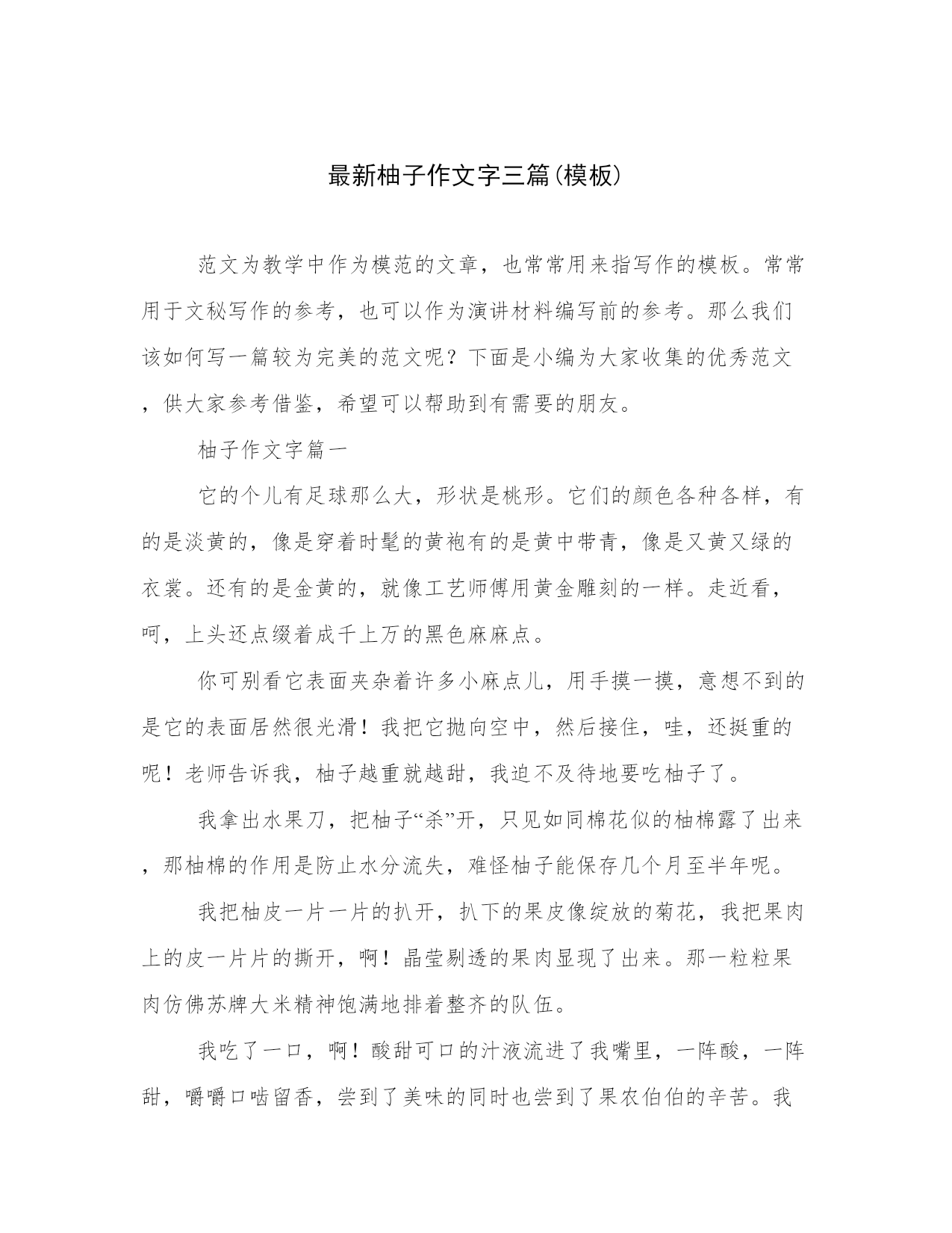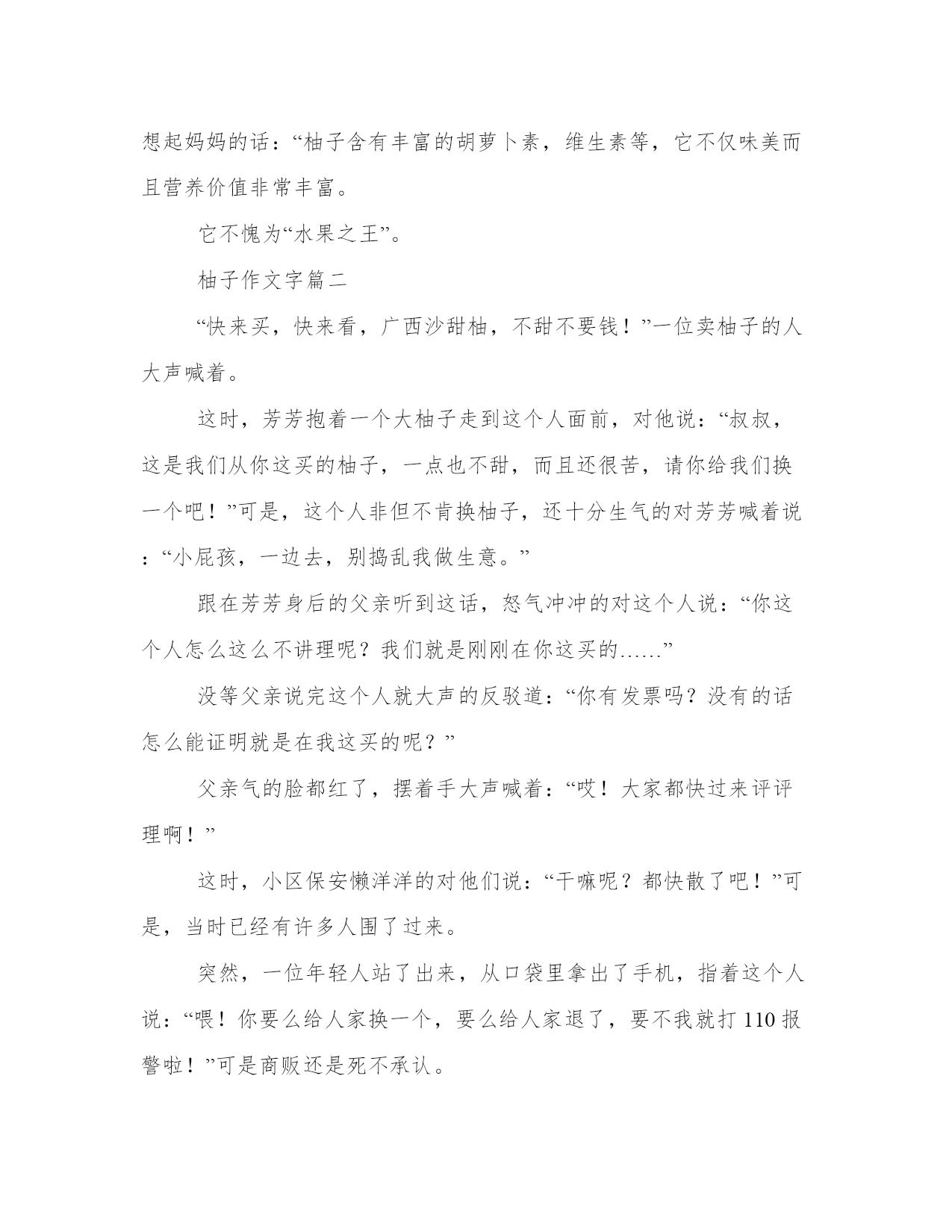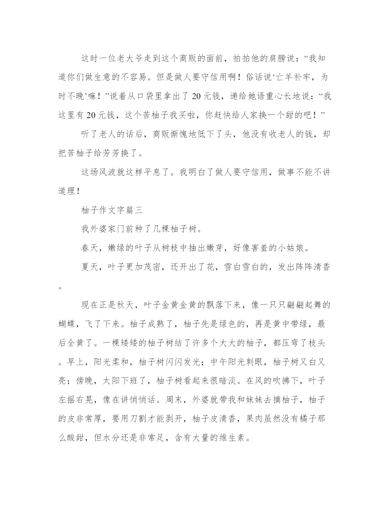 最新柚子作文字三篇(模板)范文为教学中作为模范的文章,也常常用来指写作的模板。常常用于文秘写作的参考,也可以作为演讲材料编写前的参考。那么我们该如何写一篇较为完美的范文呢?下面是小编为大家收集的优秀范文,供大家参考借鉴,希望可以帮助到有需要的朋友。柚子作文字篇一它的个儿有足球那么大,形状是桃形。它们的颜色各种各样,有的是淡黄的,像是穿着时髦的黄袍有的是黄中带青,像是又黄又绿的衣裳。还有的是金黄的,就像工艺师傅用黄金雕刻的一样。走近看,呵,上头还点缀着成千上万的黑色麻麻点。你可别看它表面夹杂着许多小麻点儿,用手摸一摸,意想不到的是它的表面居然很光滑!我把它抛向空中,然后接住,哇,还挺重的呢!老师告诉我,柚子越重就越甜,我迫不及待地要吃柚子了。我拿出水果刀,把柚子“杀”开,只见如同棉花似的柚棉露了出来,那柚棉的作用是防止水分流失,难怪柚子能保存几个月至半年呢。我把柚皮一片一片的扒开,扒下的果皮像绽放的菊花,我把果肉上的皮一片片的撕开,啊!晶莹剔透的果肉显现了出来。那一粒粒果肉仿佛苏牌大米精神饱满地排着整齐的队伍。我吃了一口,啊!酸甜可口的汁液流进了我嘴里,一阵酸,一阵甜,嚼嚼口啮留香,尝到了美味的同时也尝到了果农伯伯的辛苦。我想起妈妈的话:“柚子含有丰富的胡萝卜素,维生素等,它不仅味美而且营养价值非常丰富。它不愧为“水果之王”。柚子作文字篇二“快来买,快来看,广西沙甜柚,不甜不要钱!”一位卖柚子的人大声喊着。这时,芳芳抱着一个大柚子走到这个人面前,对他说:“叔叔,这是我们从你这买的柚子,一点也不甜,而且还很苦,请你给我们换一个吧!”可是,这个人非但不肯换柚子,还十分生气的对芳芳喊着说:“小屁孩,一边去,别捣乱我做生意。”跟在芳芳身后的父亲听到这话,怒气冲冲的对这个人说:“你这个人怎么这么不讲理呢?我们就是刚刚在你这买的……”没等父亲说完这个人就大声的反驳道:“你有发票吗?没有的话怎么能证明就是在我这买的呢?”父亲气的脸都红了,摆着手大声喊着:“哎!大家都快过来评评理啊!”这时,小区保安懒洋洋的对他们说:“干嘛呢?都快散了吧!”可是,当时已经有许多人围了过来。突然,一位年轻人站了出来,从口袋里拿出了手机,指着这个人说:“喂!你要么给人家换一个,要么给人家退了,要不我就打110报警啦!”可是商贩还是死不承认。这时一位老大爷走到这个商贩的面前,拍拍他的肩膀说:“我知道你们做生意的不容易。但是做人要守信用啊!俗话说‘亡羊补牢,为时不晚’嘛!”说着从口袋里拿出了20元钱,递给她语重心长地说:“我这里有20元钱,这个苦柚子我买啦,你赶快给人家换一个甜的吧!”听了老人的话后,商贩惭愧地低下了头,他没有收老人的钱,却把苦柚子给芳芳换了。这场风波就这样平息了。我明白了做人要守信用,做事不能不讲道理!柚子作文字篇三我外婆家门前种了几棵柚子树。春天,嫩绿的叶子从树枝中抽出嫩芽,好像害羞的小姑娘。夏天,叶子更加茂密,还开出了花,雪白雪白的,发出阵阵清香。现在正是秋天,叶子金黄金黄的飘落下来,像一只只翩翩起舞的蝴蝶,飞了下来。柚子成熟了,柚子先是绿色的,再是黄中带绿,最后全黄了。一棵矮矮的柚子树结了许多个大大的柚子,都压弯了枝头。早上,阳光柔和,柚子树闪闪发光;中午阳光刺眼,柚子树又白又亮;傍晚,太阳下班了,柚子树看起来很暗淡。在风的吹拂下,叶子左摇右晃,像在讲悄悄话。周末,外婆就带我和妹妹去摘柚子,柚子的皮非常厚,要用刀割才能剥开,柚子皮清香,果肉虽然没有橘子那么酸甜,但水分还是非常足,含有大量的维生素。到了冬天,其他树的叶子都会飘落,光秃秃的,只有柚子树四季常绿。我爱你,柚子树!