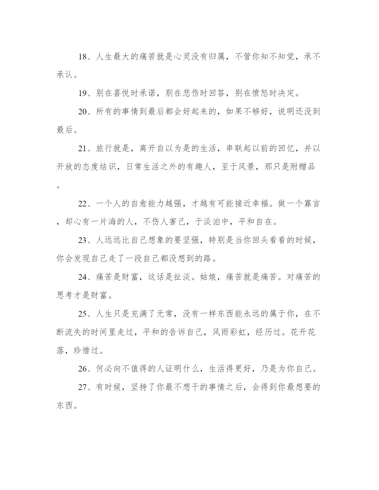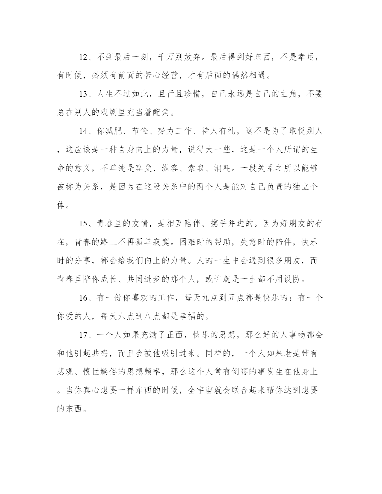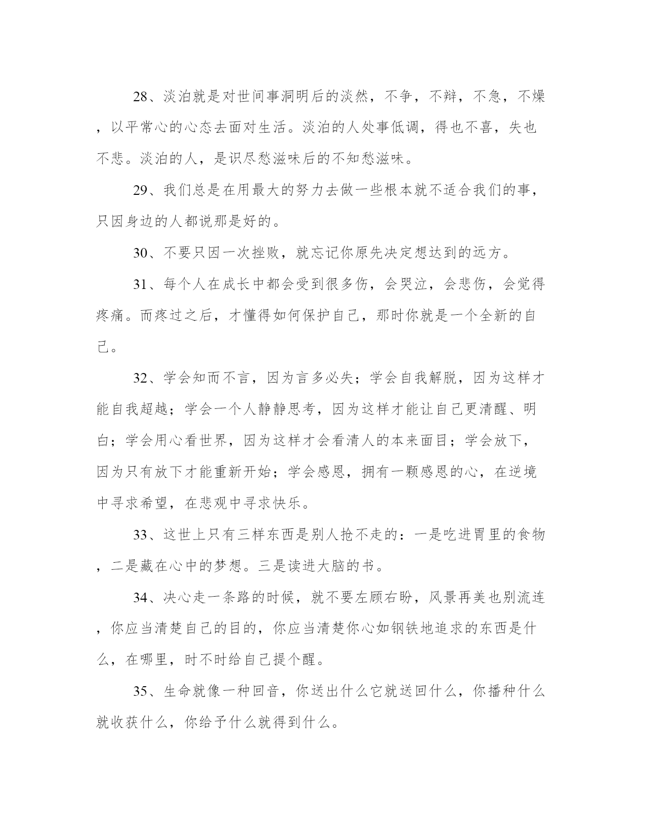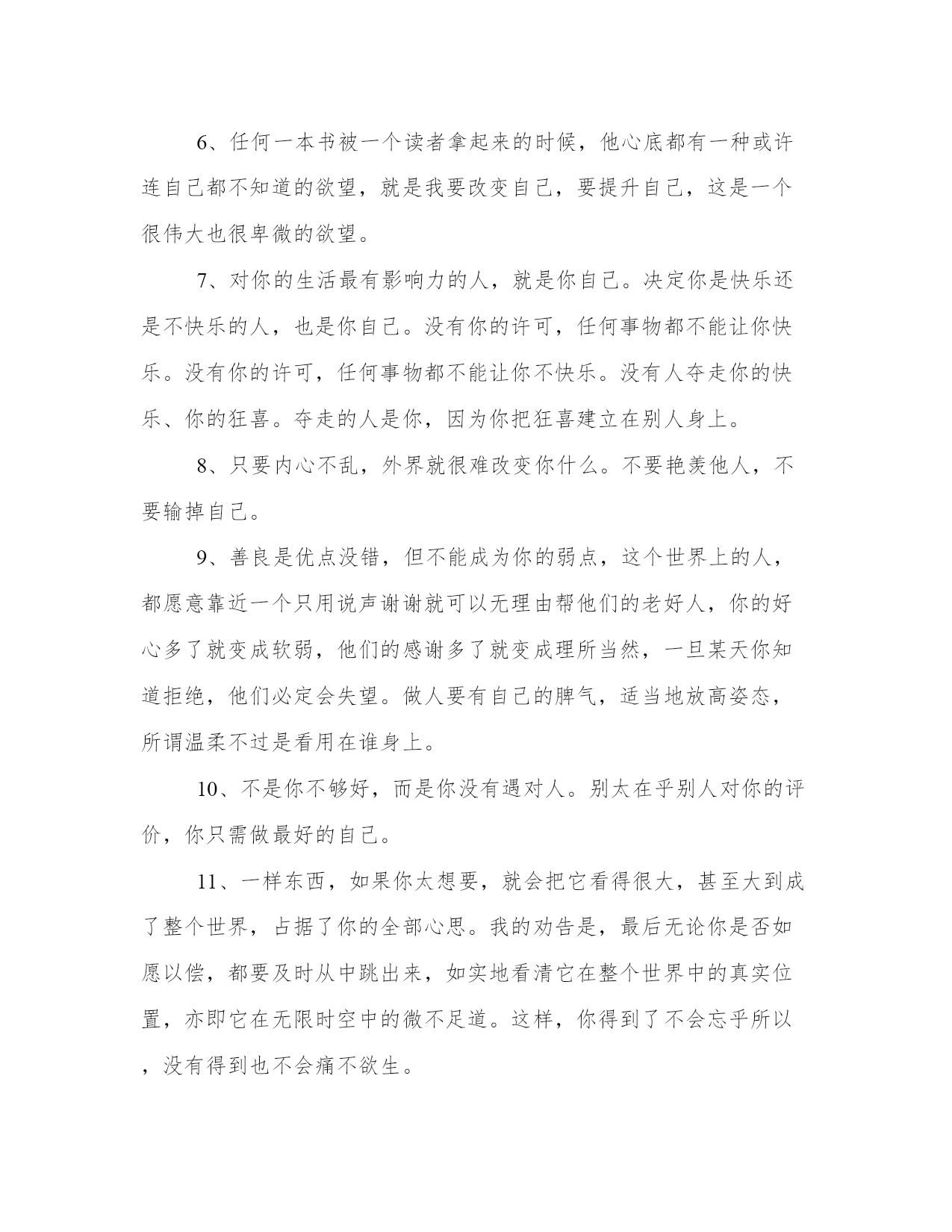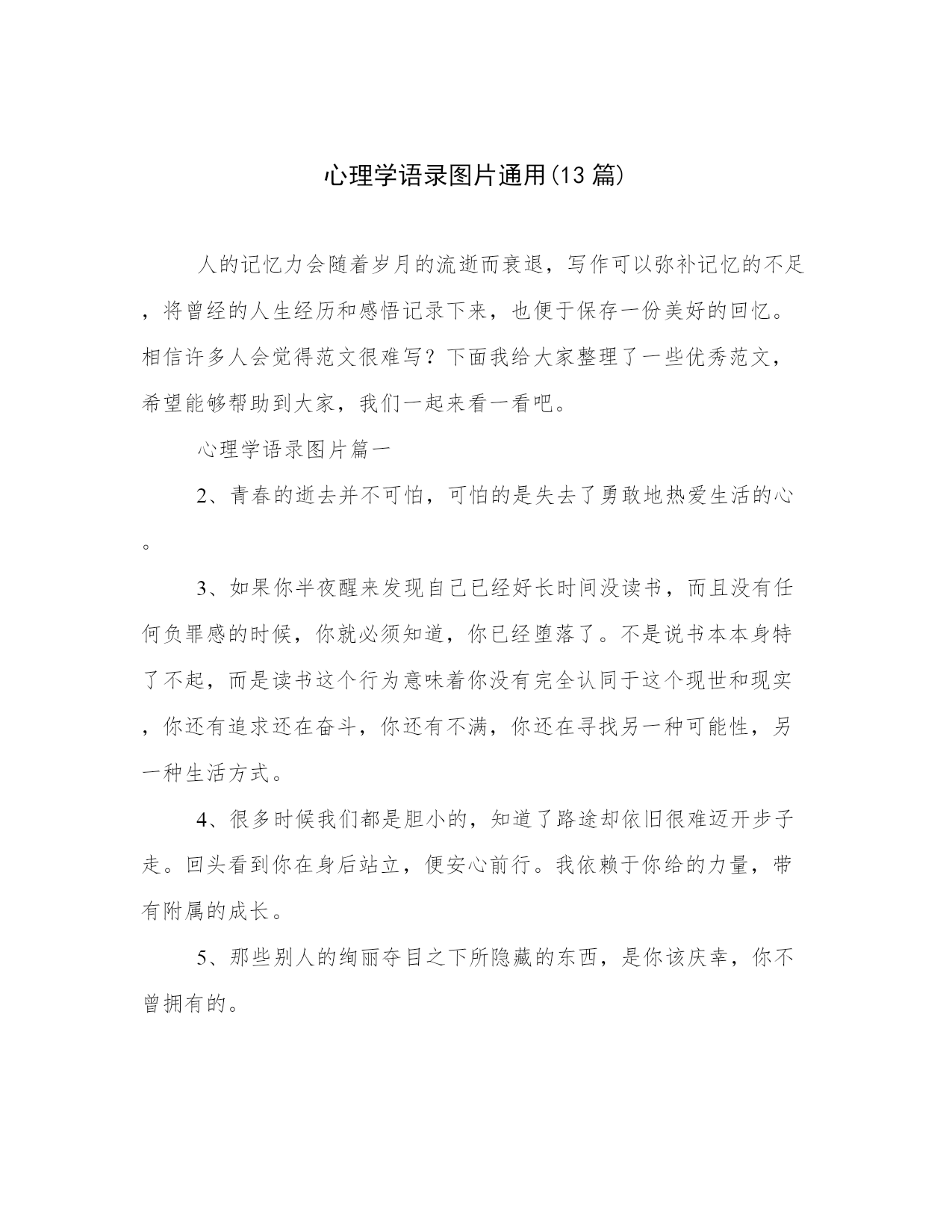心理学语录图片通用(13篇)人的记忆力会随着岁月的流逝而衰退,写作可以弥补记忆的不足,将曾经的人生经历和感悟记录下来,也便于保存一份美好的回忆。相信许多人会觉得范文很难写?下面我给大家整理了一些优秀范文,希望能够帮助到大家,我们一起来看一看吧。心理学语录图片篇一2、青春的逝去并不可怕,可怕的是失去了勇敢地热爱生活的心。3、如果你半夜醒来发现自己已经好长时间没读书,而且没有任何负罪感的时候,你就必须知道,你已经堕落了。不是说书本本身特了不起,而是读书这个行为意味着你没有完全认同于这个现世和现实,你还有追求还在奋斗,你还有不满,你还在寻找另一种可能性,另一种生活方式。4、很多时候我们都是胆小的,知道了路途却依旧很难迈开步子走。回头看到你在身后站立,便安心前行。我依赖于你给的力量,带有附属的成长。5、那些别人的绚丽夺目之下所隐藏的东西,是你该庆幸,你不曾拥有的。6、任何一本书被一个读者拿起来的时候,他心底都有一种或许连自己都不知道的欲望,就是我要改变自己,要提升自己,这是一个很伟大也很卑微的欲望。7、对你的生活最有影响力的人,就是你自己。决定你是快乐还是不快乐的人,也是你自己。没有你的许可,任何事物都不能让你快乐。没有你的许可,任何事物都不能让你不快乐。没有人夺走你的快乐、你的狂喜。夺走的人是你,因为你把狂喜建立在别人身上。8、只要内心不乱,外界就很难改变你什么。不要艳羡他人,不要输掉自己。9、善良是优点没错,但不能成为你的弱点,这个世界上的人,都愿意靠近一个只用说声谢谢就可以无理由帮他们的老好人,你的好心多了就变成软弱,他们的感谢多了就变成理所当然,一旦某天你知道拒绝,他们必定会失望。做人要有自己的脾气,适当地放高姿态,所谓温柔不过是看用在谁身上。10、不是你不够好,而是你没有遇对人。别太在乎别人对你的评价,你只需做最好的自己。11、一样东西,如果你太想要,就会把它看得很大,甚至大到成了整个世界,占据了你的全部心思。我的劝告是,最后无论你是否如愿以偿,都要及时从中跳出来,如实地看清它在整个世界中的真实位置,亦即它在无限时空中的微不足道。这样,你得到了不会忘乎所以,没有得到也不会痛不欲生。12、不到最后一刻,千万别放弃。最后得到好东西,不是幸运,有时候,必须有前面的苦心经营,才有后面的偶然相遇。13、人生不过如此,且行且珍惜,自己永远是自己的主角,不要总在别人的戏剧里充当着配角。14、你减肥、节俭、努力工作、待人有礼,这不是为了取悦别人,这应该是一种自身向上的力量,说得大一些,这是一个人所谓的生命的意义,不单纯是享受、纵容、索取、消耗。一段关系之所以能够被称为关系,是因为在这段关系中的两个人是能对自己负责的独立个体。15、青春里的友情,是相互陪伴、携手并进的。因为好朋友的存在,青春的路上不再孤单寂寞。困难时的帮助,失意时的陪伴,快乐时的分享,都会给我们向上的力量。人的一生中会遇到很多朋友,而青春里陪你成长、共同进步的那个人,或许就是一生都不用设防。16、有一份你喜欢的工作,每天九点到五点都是快乐的;有一个你爱的人,每天六点到八点都是幸福的。17、一个人如果充满了正面,快乐的思想,那么好的人事物都会和他引起共鸣,而且会被他吸引过来。同样的,一个人如果老是带有悲观、愤世嫉俗的思想频率,那么这个人常有倒霉的事发生在他身上。当你真心想要一样东西的时候,全宇宙就会联合起来帮你达到想要的东西。18、人生最大的痛苦就是心灵没有归属,不管你知不知觉,承不承认。19、别在喜悦时承诺,别在悲伤时回答,别在愤怒时决定。20、所有的事情到最后都会好起来的,如果不够好,说明还没到最后。21、旅行就是,离开自以为是的生活,串联起以前的回忆,并以开放的态度结识,日常生活之外的有趣人,至于风景,那只是附赠品。22、一个人的自愈能力越强,才越有可能接近幸福。做一个寡言,却心有一片海的人,不伤人害己,于淡泊中,平和自在。23、人远远比自己想象的要坚强,特别是当你回头看看的时候,你会发现自己走了一段自己都没想到的路。24、痛苦是财富,这话是扯淡。姑娘,痛苦就是痛苦。对痛苦的思考才是财富。25、人生只是充满了无常,没有一样东西能永远的属于你,在不断流失的时间里走过,平和的告诉自己,风雨彩虹,经历过。花开花落,珍惜过。26、何必向不值得的人证明什么,生活得更好,乃是为你自己。27、有时候,坚持了你最不想干的事情之后,会得到你最想要的东西。28、淡泊就是对世间事洞明后的淡然,不争,不辩,不急,不燥,以平常心的心态去面对生活。淡泊的人处事低调,得也不喜,失也不悲。淡泊的人,是识尽愁滋味后的不知愁滋味。29、我们总是在用最大的努力去做一些根本就不适合我们的事,只因身边的人都说那是好的。30、不要只因一次挫败,就忘记你原先决定想达到的远方。31、每个人在成长中都会受到很多伤,会哭泣
