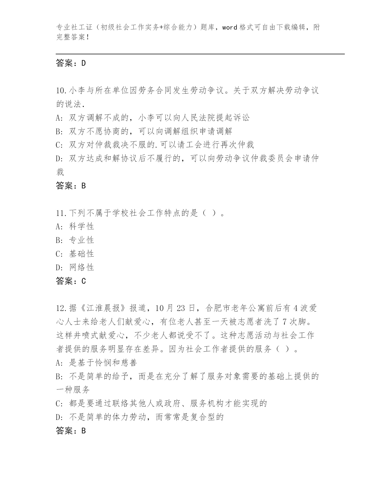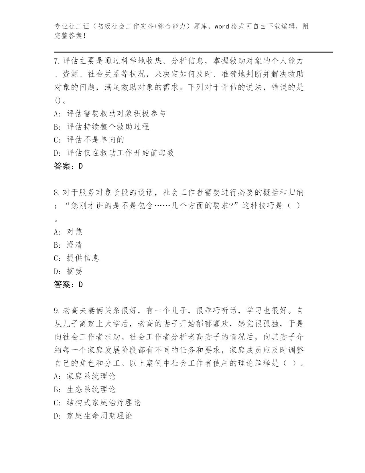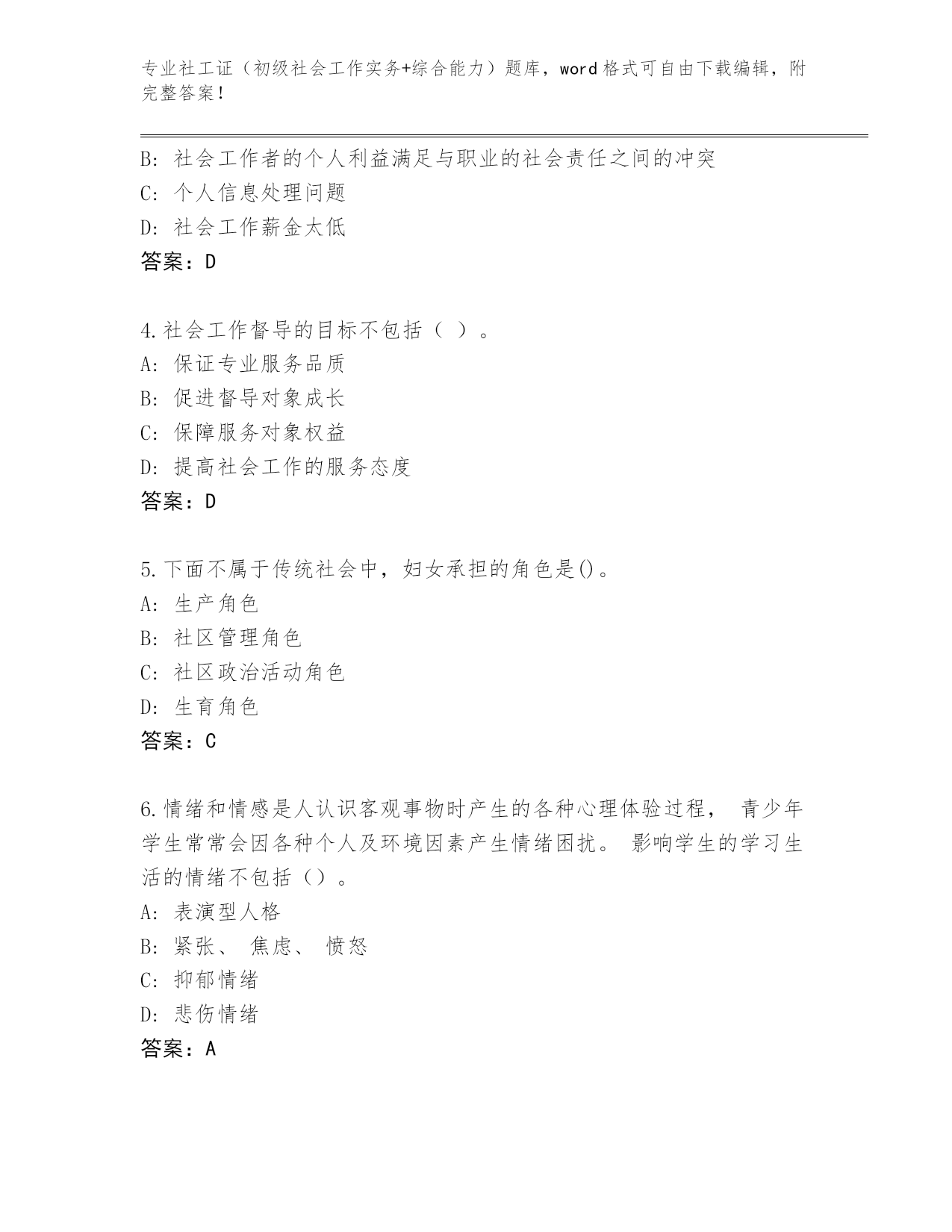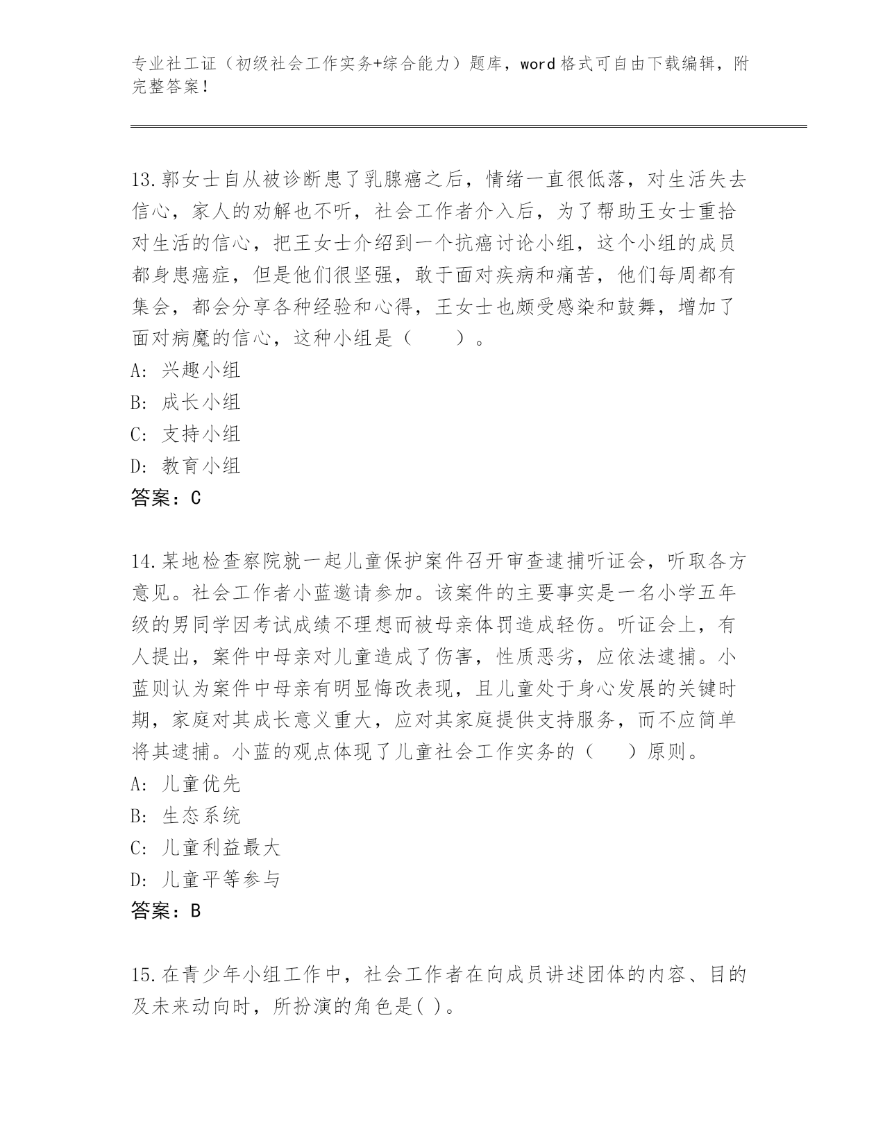 专业社工证(初级社会工作实务+综合能力)题库,word格式可自由下载编辑,附完整答案!浙江省东阳市社工证(初级社会工作实务+综合能力)题库有解析答案第I部分单选题(100题)1.老李是一位老红军,2000年被安置在某地方军队离退休干部休养所,可进来以后始终郁郁不乐,他觉得自己为部队工作了大半辈子,老了没用了,被当作“包袱”扔了出来,当年“最可爱的人”和现在“最可怜的人”一起成了民政部门管理的对象,有一种强烈的被抛弃感和失落感。作为社会工作者,对于军休社会工作的介入重点是()。A:危机干预B:社会再适应C:生命回顾与哀伤辅导D:认知和情绪问题的处理答案:D2.在小组初期,需要以“小组契约”的方式来帮助小组形成规范。小组契约是社会工作者与组员之间的一种协议约定,下列内容中,属于小组契约的是()。A:出席会议的注意事项B:破冰游戏的活动安排C:组员之问的互动行为规范D:小组活动的具体实施方案答案:A3.社会工作实践中面临的伦理难题内容不包括()。A:专业关系B:社会工作者的个人利益满足与职业的社会责任之间的冲突C:个人信息处理问题D:社会工作薪金太低答案:D4.社会工作督导的目标不包括()。A:保证专业服务品质B:促进督导对象成长C:保障服务对象权益D:提高社会工作的服务态度答案:D5.下面不属于传统社会中,妇女承担的角色是()。A:生产角色B:社区管理角色C:社区政治活动角色D:生育角色答案:C6.情绪和情感是人认识客观事物时产生的各种心理体验过程,青少年学生常常会因各种个人及环境因素产生情绪困扰。影响学生的学习生活的情绪不包括()。A:表演型人格B:紧张、焦虑、愤怒C:抑郁情绪D:悲伤情绪答案:A7.评估主要是通过科学地收集、分析信息,掌握救助对象的个人能力、资源、社会关系等状况,来决定如何及时、准确地判断并解决救助对象的问题,满足救助对象的需求。下列对于评估的说法,错误的是()。A:评估需要救助对象积极参与B:评估持续整个救助过程C:评估不是单向的D:评估仅在救助工作开始前起效答案:D8.对于服务对象长段的谈话,社会工作者需要进行必要的概括和归纳:“您刚才讲的是不是包含……几个方面的要求?”这种技巧是()。A:对焦B:澄清C:提供信息D:摘要答案:D9.老高夫妻俩关系很好,有一个儿子,很乖巧听话,学习也很好。自从儿子离家上大学后,老高的妻子开始郁郁寡欢,感觉很孤独,于是向社会工作者求助。社会工作者分析老高妻子的情况后,向其妻子介绍每一个家庭发展阶段都有不同的任务和要求,家庭成员应及时调整自己的角色和分工。以上案例中社会工作者使用的理论解释是()。A:家庭系统理论B:生态系统理论C:结构式家庭治疗理论D:家庭生命周期理论答案:D10.小李与所在单位因劳务合同发生劳动争议。关于双方解决劳动争议的说法.A:双方调解不成的,小李可以向人民法院提起诉讼B:双方不愿协商的,可以向调解组织申请调解C:双方对仲裁裁决不服的.可以请工会进行再次仲裁D:双方达成和解协议后不履行的,可以向劳动争议仲裁委员会申请仲裁答案:B11.下列不属于学校社会工作特点的是()。A:科学性B:专业性C:基础性D:网络性答案:C12.据《江淮晨报》报道,10月23日,合肥市老年公寓前后有4波爱心人士来给老人们献爱心,有位老人甚至一天被志愿者洗了7次脚。这样井喷式献爱心,不少老人都说受不了。这种志愿活动与社会工作者提供的服务明显存在差异。因为社会工作者提供的服务()。A:是基于怜悯和慈善B:不是简单的给予,而是在充分了解了服务对象需要的基础上提供的一种服务C:都是要通过联络其他人或政府、服务机构才能实现的D:不是简单的体力劳动,而常常是复合型的答案:B13.郭女士自从被诊断患了乳腺癌之后,情绪一直很低落,对生活失去信心,家人的劝解也不听,社会工作者介入后,为了帮助王女士重拾对生活的信心,把王女士介绍到一个抗癌讨论小组,这个小组的成员都身患癌症,但是他们很坚强,敢于面对疾病和痛苦,他们每周都有集会,都会分享各种经验和心得,王女士也颇受感染和鼓舞,增加了面对病魔的信心,这种小组是()。A:兴趣小组B:成长小组C:支持小组D:教育小组答案:C14.某地检查察院就一起儿童保护案件召开审查逮捕听证会,听取各方意见。社会工作者小蓝邀请参加。该案件的主要事实是一名小学五年级的男同学因考试成绩不理想而被母亲体罚造成轻伤。听证会上,有人提出,案件中母亲对儿童造成了伤害,性质恶劣,应依法逮捕。小蓝则认为案件中母亲有明显悔改表现,且儿童处于身心发展的关键时期,家庭对其成长意义重大,应对其家庭提供支持服务,而不应简单将其逮捕。小蓝的观点体现了儿童社会工作实务的()原则。A:儿童优先B:生态系统C:儿童利益最大D:儿童平等参与答案:B15.在青少年小组工作中,社会工作者在向成员讲述团体的内容、