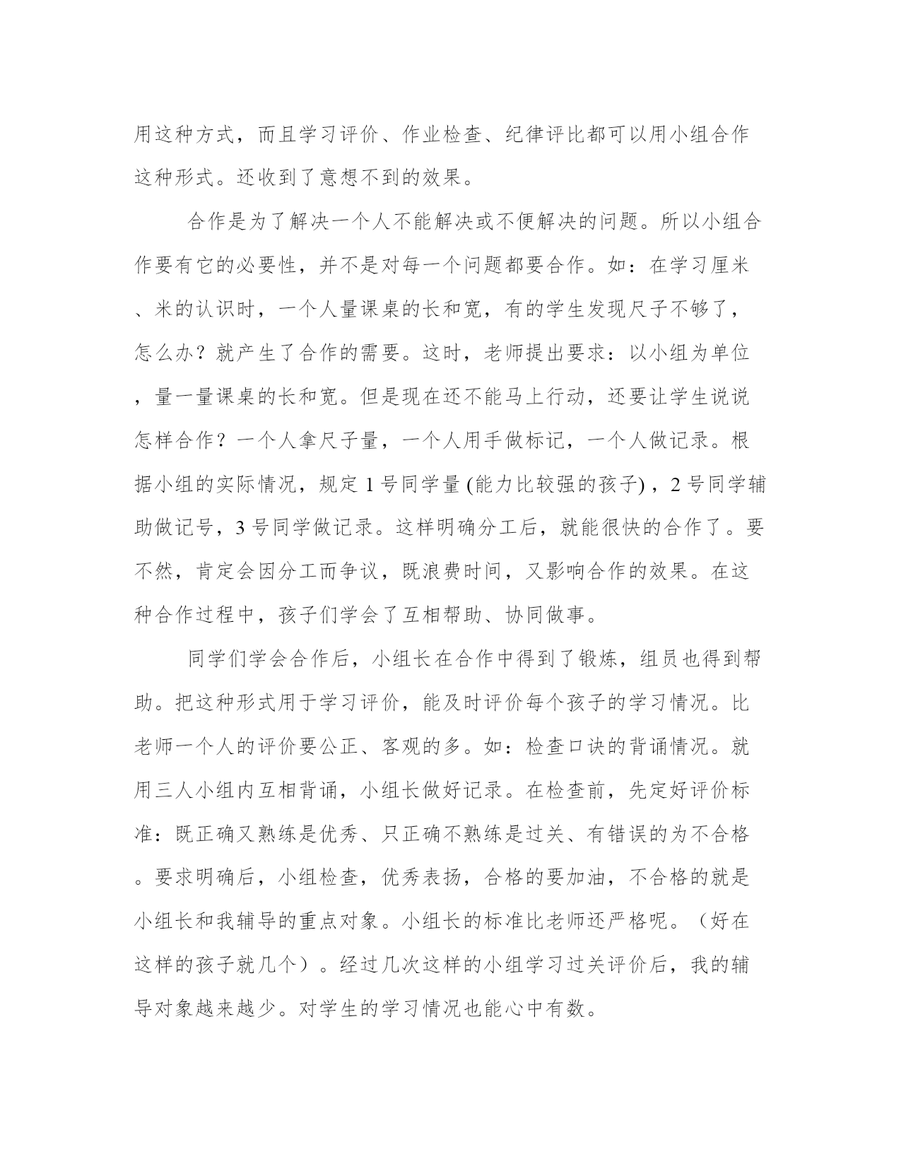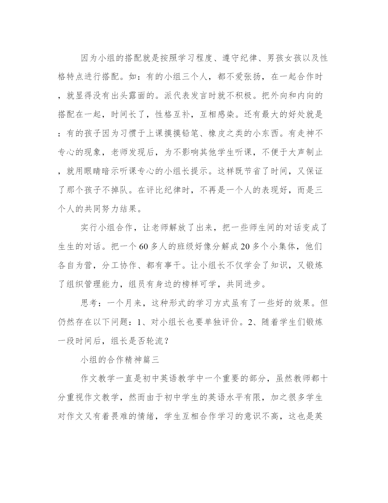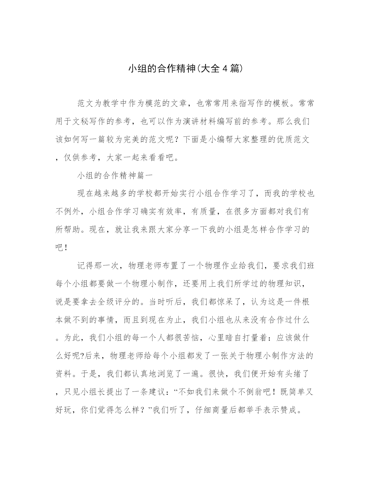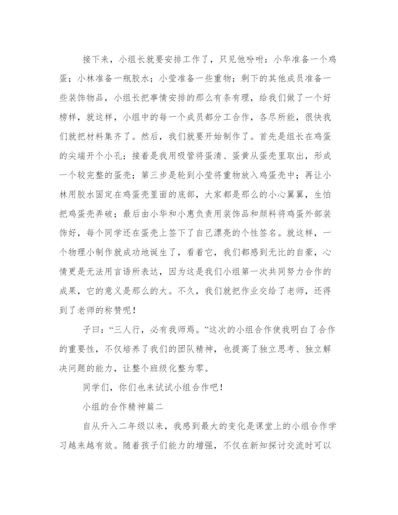 小组的合作精神(大全4篇)范文为教学中作为模范的文章,也常常用来指写作的模板。常常用于文秘写作的参考,也可以作为演讲材料编写前的参考。那么我们该如何写一篇较为完美的范文呢?下面是小编帮大家整理的优质范文,仅供参考,大家一起来看看吧。小组的合作精神篇一现在越来越多的学校都开始实行小组合作学习了,而我的学校也不例外,小组合作学习确实有效率,有质量,在很多方面都对我们有所帮助。现在,就让我来跟大家分享一下我的小组是怎样合作学习的吧!记得那一次,物理老师布置了一个物理作业给我们,要求我们班每个小组都要做一个物理小制作,还要用上我们所学过的物理知识,说是要拿去全级评分的。当时听后,我们都惊呆了,认为这是一件根本做不到的事情,而且到现在为止,我们小组也从来没有合作过什么。为此,我们小组的每一个人都很苦恼,心里暗自打量着:应该做什么好呢?后来,物理老师给每个小组都发了一张关于物理小制作方法的资料。于是,我们都认真地浏览了一遍。很快,我们便开始有头绪了,只见小组长提出了一条建议:“不如我们来做个不倒翁吧!既简单又好玩,你们觉得怎么样?”我们听了,仔细商量后都举手表示赞成。接下来,小组长就要安排工作了,只见他吩咐:小华准备一个鸡蛋;小林准备一瓶胶水;小莹准备一些重物;剩下的其他成员准备一些装饰物品,小组长把事情安排的那么有条有理,给我们做了一个好榜样,就这样,小组中的每一个成员都分工合作,各尽所能,很快我们就把材料集齐了。然后,我们就要开始制作了。首先是组长在鸡蛋的尖端开个小孔;接着是我用吸管将蛋清、蛋黄从蛋壳里取出,形成一个较完整的蛋壳;第三步是轮到小莹将重物放入鸡蛋壳中;再让小林用胶水固定在鸡蛋壳里面的底部,大家都是那么的小心翼翼,生怕把鸡蛋壳弄破;最后由小华和小惠负责用装饰品和颜料将鸡蛋外部装饰好,每个同学还在蛋壳上签下了自己漂亮的个性签名。就这样,一个物理小制作就成功地诞生了,看着它,我们都感到无比的自豪,心情更是无法用言语所表达,因为这是我们小组第一次共同努力合作的成果,它的意义是那么的大。不久,我们就把作业交给了老师,还得到了老师的称赞呢!子曰:“三人行,必有我师焉。”这次的小组合作使我明白了合作的重要性,不仅培养了我们的团队精神,也提高了独立思考、独立解决问题的能力,让整个班级化整为零。同学们,你们也来试试小组合作吧!小组的合作精神篇二自从升入二年级以来,我感到最大的变化是课堂上的小组合作学习越来越有效。随着孩子们能力的增强,不仅在新知探讨交流时可以用这种方式,而且学习评价、作业检查、纪律评比都可以用小组合作这种形式。还收到了意想不到的效果。合作是为了解决一个人不能解决或不便解决的问题。所以小组合作要有它的必要性,并不是对每一个问题都要合作。如:在学习厘米、米的认识时,一个人量课桌的长和宽,有的学生发现尺子不够了,怎么办?就产生了合作的需要。这时,老师提出要求:以小组为单位,量一量课桌的长和宽。但是现在还不能马上行动,还要让学生说说怎样合作?一个人拿尺子量,一个人用手做标记,一个人做记录。根据小组的实际情况,规定1号同学量(能力比较强的孩子),2号同学辅助做记号,3号同学做记录。这样明确分工后,就能很快的合作了。要不然,肯定会因分工而争议,既浪费时间,又影响合作的效果。在这种合作过程中,孩子们学会了互相帮助、协同做事。同学们学会合作后,小组长在合作中得到了锻炼,组员也得到帮助。把这种形式用于学习评价,能及时评价每个孩子的学习情况。比老师一个人的评价要公正、客观的多。如:检查口诀的背诵情况。就用三人小组内互相背诵,小组长做好记录。在检查前,先定好评价标准:既正确又熟练是优秀、只正确不熟练是过关、有错误的为不合格。要求明确后,小组检查,优秀表扬,合格的要加油,不合格的就是小组长和我辅导的重点对象。小组长的标准比老师还严格呢。(好在这样的孩子就几个)。经过几次这样的小组学习过关评价后,我的辅导对象越来越少。对学生的学习情况也能心中有数。因为小组的搭配就是按照学习程度、遵守纪律、男孩女孩以及性格特点进行搭配。如:有的小组三个人,都不爱张扬,在一起合作时,就显得没有出头露面的。派代表发言时就不积极。把外向和内向的搭配在一起,时间长了,性格互补,互相感染。还有最大的好处就是:有的孩子因为习惯于上课摸摸铅笔、橡皮之类的小东西。有走神不专心的现象,老师发现后,为不影响其他学生听课,不便于大声制止,就用眼睛暗示听课专心的小组长提示。这样既节省了时间,又保证了那个孩子不掉队。在评比纪律时,不再是一个人的表现好,而是三个人的共同努力结果。实行小组合作,让老师解放了出来,把一些师生间的对话变成了生生的对话。把一个60多人的班级好像分解成20多个小集体,他们各自为营,分工协作、都有事干。让小组长不仅学会了知识,又锻炼了组织管理能力,组员有身边的榜样可学,共