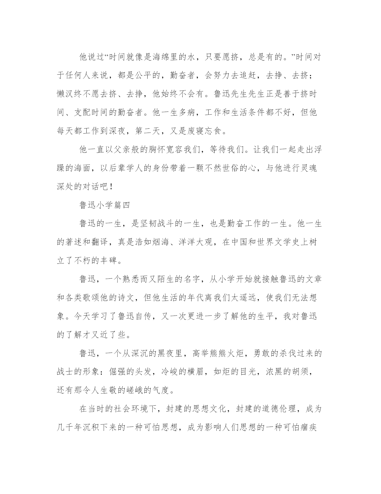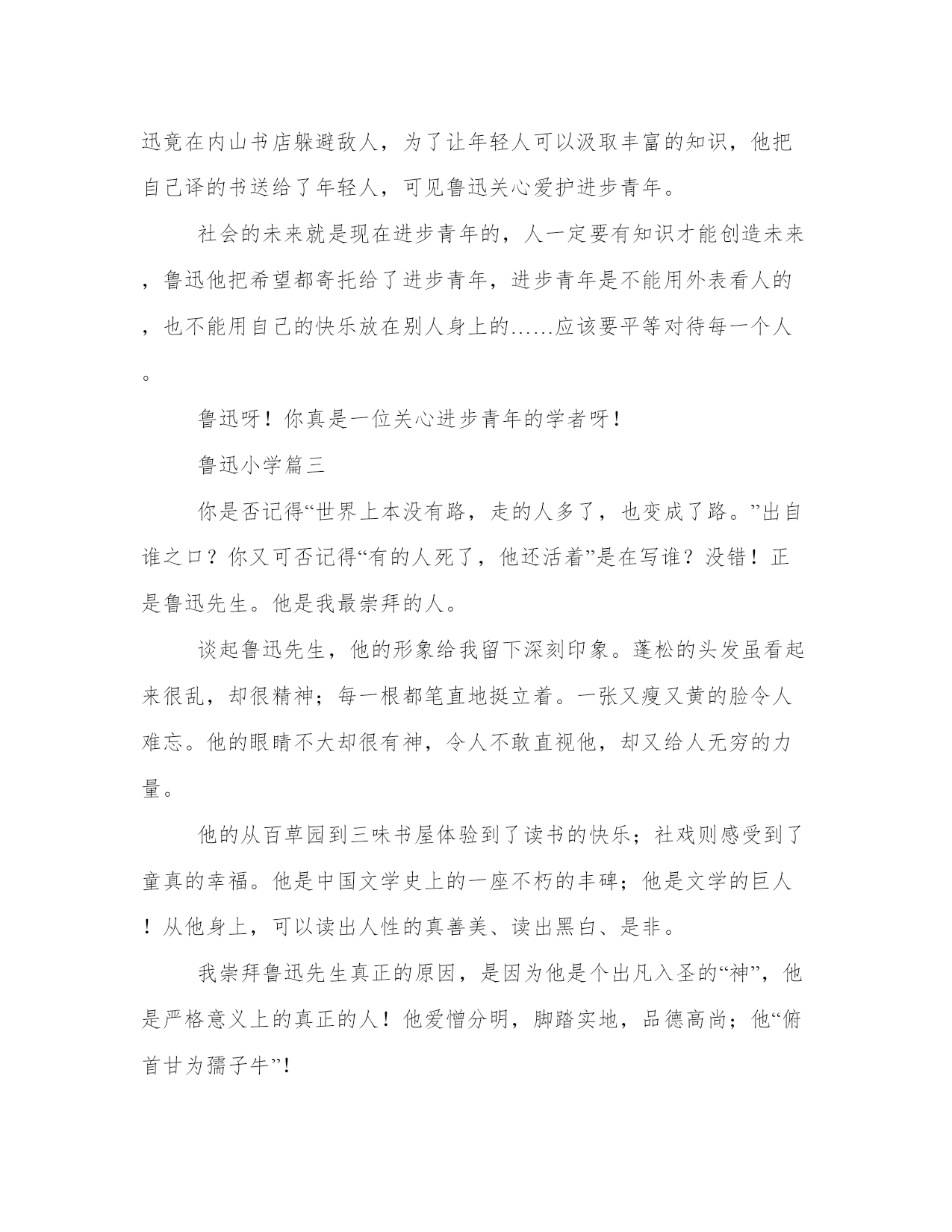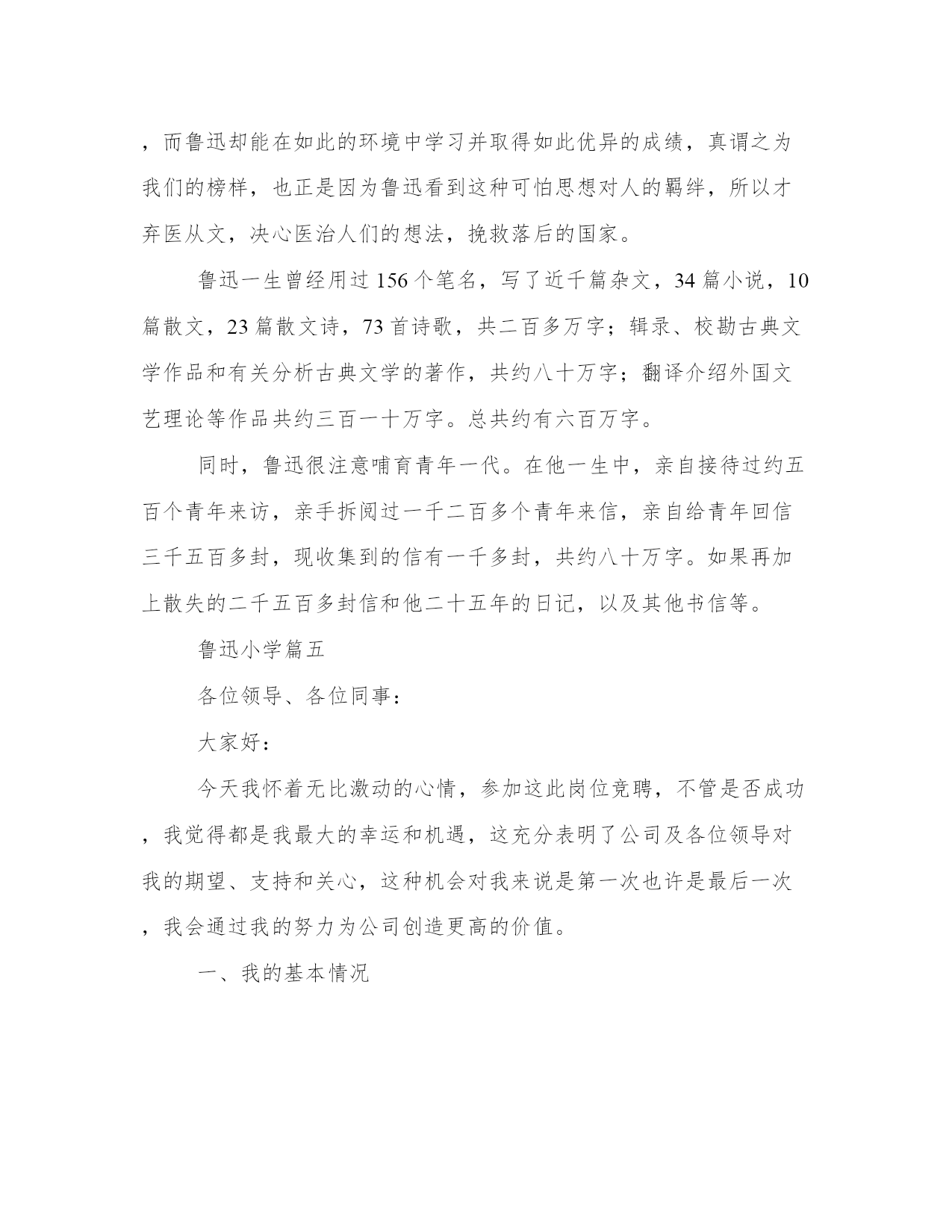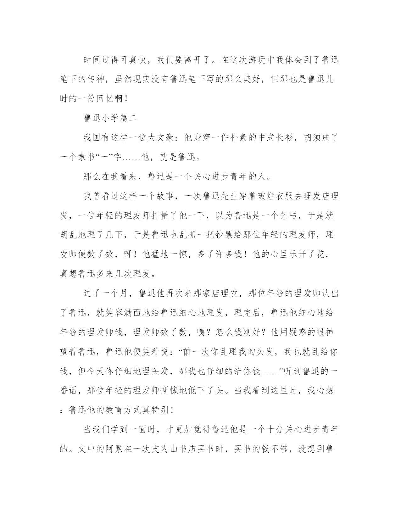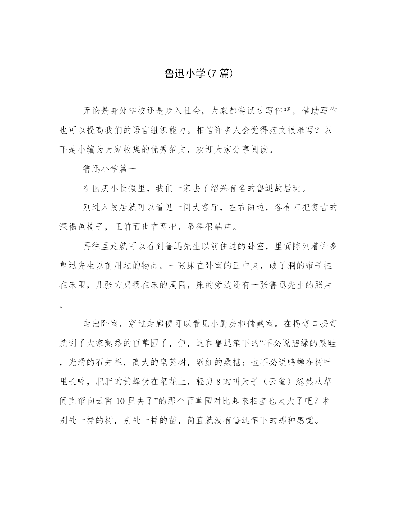 鲁迅小学(7篇)无论是身处学校还是步入社会,大家都尝试过写作吧,借助写作也可以提高我们的语言组织能力。相信许多人会觉得范文很难写?以下是小编为大家收集的优秀范文,欢迎大家分享阅读。鲁迅小学篇一在国庆小长假里,我们一家去了绍兴有名的鲁迅故居玩。刚进入故居就可以看见一间大客厅,左右两边,各有四把复古的深褐色椅子,正前面也有两把,显得很端庄。再往里走就可以看到鲁迅先生以前住过的卧室,里面陈列着许多鲁迅先生以前用过的物品。一张床在卧室的正中央,破了洞的帘子挂在床围,几张方桌摆在床的周围,床的旁边还有一张鲁迅先生的照片。走出卧室,穿过走廊便可以看见小厨房和储藏室。在拐弯口拐弯就到了大家熟悉的百草园了,但,这和鲁迅笔下的“不必说碧绿的菜畦,光滑的石井栏,高大的皂荚树,紫红的桑椹;也不必说鸣蝉在树叶里长吟,肥胖的黄蜂伏在菜花上,轻捷8的叫天子(云雀)忽然从草间直窜向云霄10里去了”的那个百草园对比起来相差也太大了吧?和别处一样的树,别处一样的苗,简直就没有鲁迅笔下的那种感觉。时间过得可真快,我们要离开了。在这次游玩中我体会到了鲁迅笔下的传神,虽然现实没有鲁迅笔下写的那么美好,但那也是鲁迅儿时的一份回忆啊!鲁迅小学篇二我国有这样一位大文豪:他身穿一件朴素的中式长衫,胡须成了一个隶书“一”字……他,就是鲁迅。那么在我看来,鲁迅是一个关心进步青年的人。我曾看过这样一个故事,一次鲁迅先生穿着破烂衣服去理发店理发,一位年轻的理发师打量了他一下,以为鲁迅是一个乞丐,于是就胡乱地理了几下,于是鲁迅也乱抓一把钞票给那位年轻的理发师,理发师便数了数,呀!他猛地一惊,多了许多钱!他的心里乐开了花,真想鲁迅多来几次理发。过了一个月,鲁迅他再次来那家店理发,那位年轻的理发师认出了鲁迅,就笑容满面地给鲁迅细心地理发,理完后,鲁迅他细心地给年轻的理发师钱,理发师数了数,咦?怎么钱刚好?他用疑惑的眼神望着鲁迅,鲁迅他便笑着说:“前一次你乱理我的头发,我也就乱给你钱,但今天你仔细地理头发,那我也仔细的给你钱……“听到鲁迅的一番话,那位年轻的理发师惭愧地低下了头。当我看到这里时,我心想:鲁迅他的教育方式真特别!当我们学到一面时,才更加觉得鲁迅他是一个十分关心进步青年的。文中的阿累在一次支内山书店买书时,买书的钱不够,没想到鲁迅竟在内山书店躲避敌人,为了让年轻人可以汲取丰富的知识,他把自己译的书送给了年轻人,可见鲁迅关心爱护进步青年。社会的未来就是现在进步青年的,人一定要有知识才能创造未来,鲁迅他把希望都寄托给了进步青年,进步青年是不能用外表看人的,也不能用自己的快乐放在别人身上的……应该要平等对待每一个人。鲁迅呀!你真是一位关心进步青年的学者呀!鲁迅小学篇三你是否记得“世界上本没有路,走的人多了,也变成了路。”出自谁之口?你又可否记得“有的人死了,他还活着”是在写谁?没错!正是鲁迅先生。他是我最崇拜的人。谈起鲁迅先生,他的形象给我留下深刻印象。蓬松的头发虽看起来很乱,却很精神;每一根都笔直地挺立着。一张又瘦又黄的脸令人难忘。他的眼睛不大却很有神,令人不敢直视他,却又给人无穷的力量。他的从百草园到三味书屋体验到了读书的快乐;社戏则感受到了童真的幸福。他是中国文学史上的一座不朽的丰碑;他是文学的巨人!从他身上,可以读出人性的真善美、读出黑白、是非。我崇拜鲁迅先生真正的原因,是因为他是个出凡入圣的“神”,他是严格意义上的真正的人!他爱憎分明,脚踏实地,品德高尚;他“俯首甘为孺子牛”!他说过“时间就像是海绵里的水,只要愿挤,总是有的。”时间对于任何人来说,都是公平的,勤奋者,会努力去追赶,去挣、去挤;懒汉终不愿去挤、去挣,他始终不会有。鲁迅先生先生正是善于挤时间、支配时间的勤奋者。他一生多病,工作和生活条件都不好,但他每天都工作到深夜,第二天,又是废寝忘食。他一直以父亲般的胸怀宽容我们,等待我们。让我们一起走出浮躁的海面,以后辈学人的身份带着一颗不然世俗的心,与他进行灵魂深处的对话吧!鲁迅小学篇四鲁迅的一生,是坚韧战斗的一生,也是勤奋工作的一生。他一生的著述和翻译,真是浩如烟海、洋洋大观,在中国和世界文学史上树立了不朽的丰碑。鲁迅,一个熟悉而又陌生的名字,从小学开始就接触鲁迅的文章和各类歌颂他的诗文,但他生活的年代离我们太遥远,使我们无法想象。今天学习了鲁迅自传,又一次更进一步了解他的生平,我对鲁迅的了解才又近了些。鲁迅,一个从深沉的黑夜里,高举熊熊火炬,勇敢的杀伐过来的战士的形象:倔强的头发,冷峻的横眉,如炬的目光,浓黑的胡须,还有那令人生敬的嵯峨的气度。在当时的社会环境下,封建的思想文化,封建的道德伦理,成为几千年沉积下来的一种可怕思想,成为影响人们思想的一种可怕痼疾,而鲁迅却能在如此的环境中学习并取得如此优异的成绩,真谓之为我们的榜样,也正是因为鲁迅看到这种可怕思想对人的羁绊