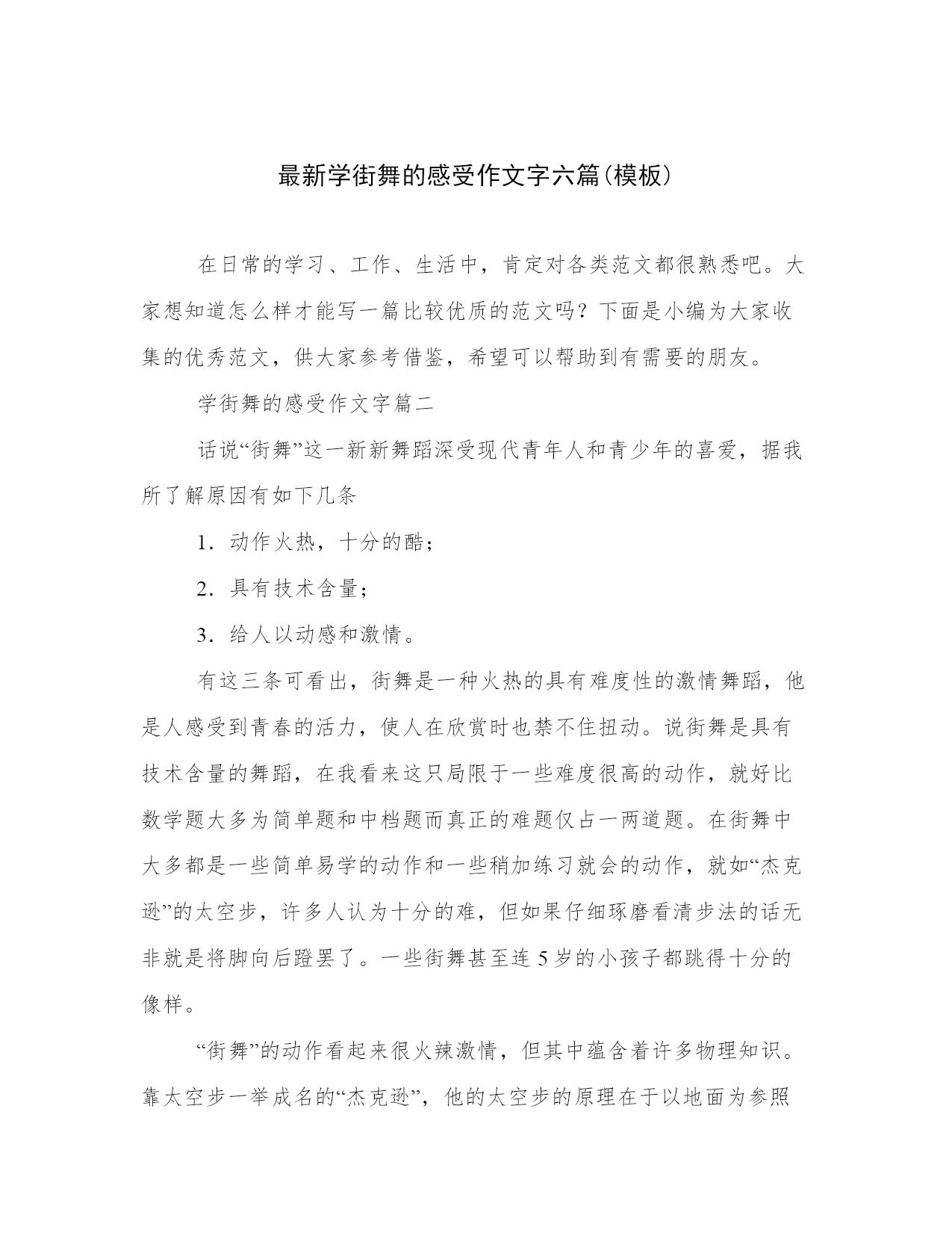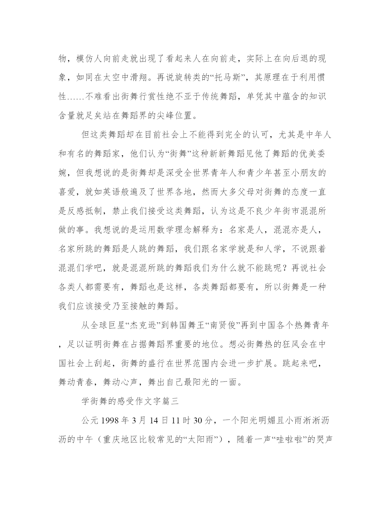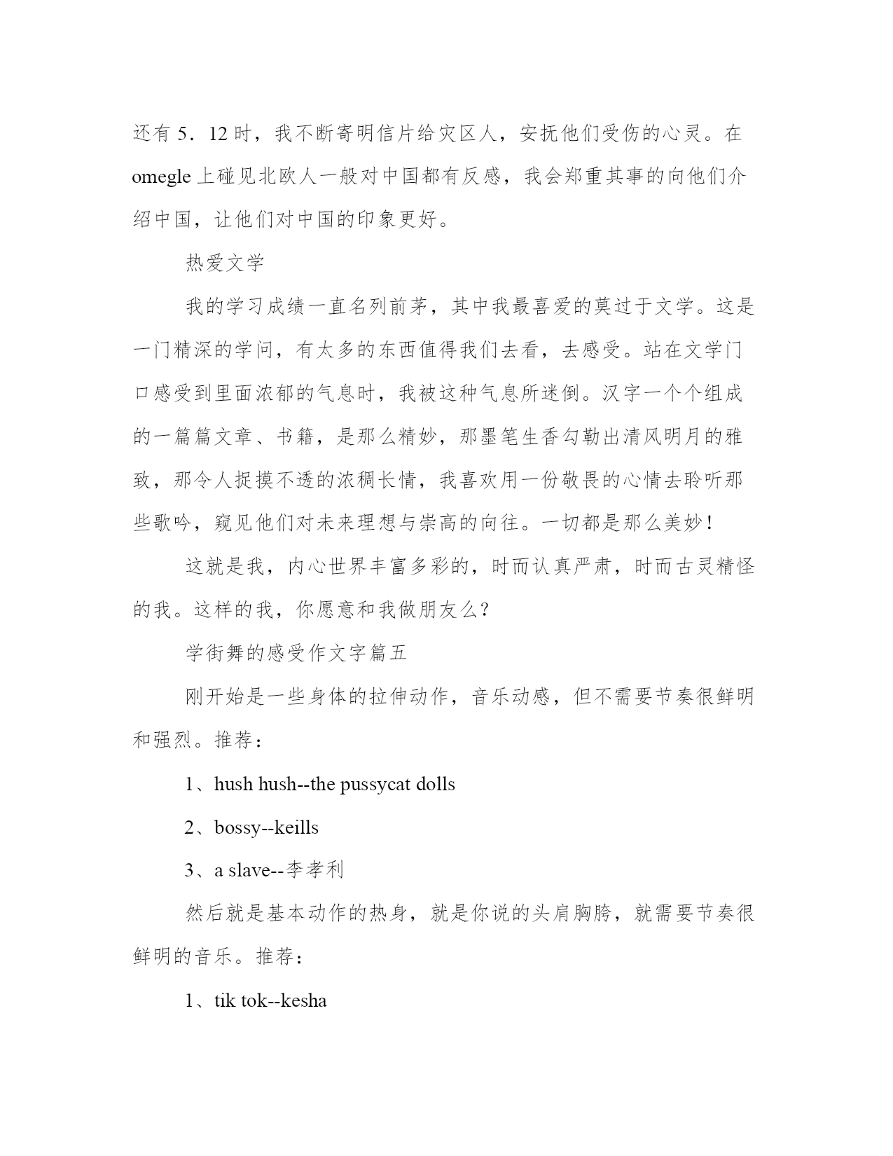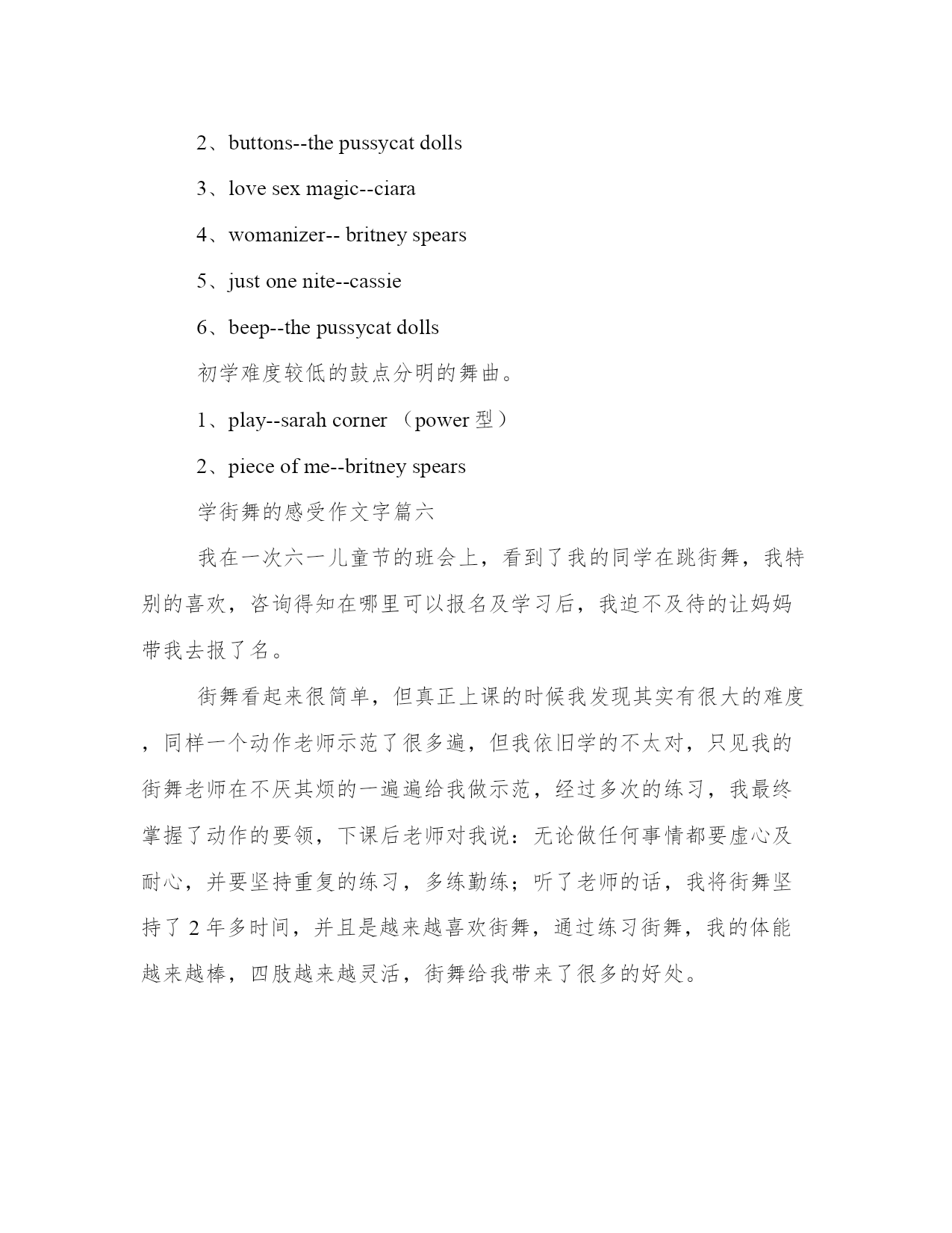 最新学街舞的感受作文字六篇(模板)在日常的学习、工作、生活中,肯定对各类范文都很熟悉吧。大家想知道怎么样才能写一篇比较优质的范文吗?下面是小编为大家收集的优秀范文,供大家参考借鉴,希望可以帮助到有需要的朋友。学街舞的感受作文字篇二话说“街舞”这一新新舞蹈深受现代青年人和青少年的喜爱,据我所了解原因有如下几条1.动作火热,十分的酷;2.具有技术含量;3.给人以动感和激情。有这三条可看出,街舞是一种火热的具有难度性的激情舞蹈,他是人感受到青春的活力,使人在欣赏时也禁不住扭动。说街舞是具有技术含量的舞蹈,在我看来这只局限于一些难度很高的动作,就好比数学题大多为简单题和中档题而真正的难题仅占一两道题。在街舞中大多都是一些简单易学的动作和一些稍加练习就会的动作,就如“杰克逊”的太空步,许多人认为十分的难,但如果仔细琢磨看清步法的话无非就是将脚向后蹬罢了。一些街舞甚至连5岁的小孩子都跳得十分的像样。“街舞”的动作看起来很火辣激情,但其中蕴含着许多物理知识。靠太空步一举成名的“杰克逊”,他的太空步的原理在于以地面为参照物,模仿人向前走就出现了看起来人在向前走,实际上在向后退的现象,如同在太空中滑翔。再说旋转类的“托马斯”,其原理在于利用惯性……不难看出街舞行赏性绝不亚于传统舞蹈,单凭其中蕴含的知识含量就足矣站在舞蹈界的尖峰位置。但这类舞蹈却在目前社会上不能得到完全的认可,尤其是中年人和有名的舞蹈家,他们认为“街舞”这种新新舞蹈见他了舞蹈的优美委婉,但我想说的是街舞却是深受全世界青年人和青少年甚至小朋友的喜爱,就如英语般遍及了世界各地,然而大多父母对街舞的态度一直是反感抵制,禁止我们接受这类舞蹈,认为这是不良少年街市混混所做的事。我想说的是运用数学理念解释为:名家是人,混混亦是人,名家所跳的舞蹈是人跳的舞蹈,我们跟名家学就是和人学,不说跟着混混们学吧,就是混混所跳的舞蹈我们为什么就不能跳呢?再说社会各类人都需要有,舞蹈也是这样,各类舞蹈都要有,所以街舞是一种我们应该接受乃至接触的舞蹈。从全球巨星“杰克逊”到韩国舞王“南贤俊”再到中国各个热舞青年,足以证明街舞在占据舞蹈界重要的地位。想必街舞热的狂风会在中国社会上刮起,街舞的盛行在世界范围内会进一步扩展。跳起来吧,舞动青春,舞动心声,舞出自己最阳光的一面。学街舞的感受作文字篇三公元1998年3月14日11时30分,一个阳光明媚且小雨淅淅沥沥的中午(重庆地区比较常见的“太阳雨”),随着一声“哇啦啦”的哭声,一个婴儿降临人世。光阴似箭,日月如梭,如今她已经11岁了。她额前一撮斜刘海,高挺的鼻子,明晰的眼睛上挂着一幅“心灵的窗户玻璃”。今天我们来解剖的这个她就是我——陶举曦。......”在学校里,我和同学时常就围成一堆,在同学的一个个问题与交流之间,我不小心会流露一些风趣的语言,逗得大家捧腹大笑,我却没反应过来。在家里,我和爸妈亲密无间,常常把整天所经历的事情如泄洪似的滔滔不绝,将事情略有文学加工再加上眉飞色舞的功力,弄的爸妈合不拢嘴来。歌舞精灵我这个活蹦乱跳的孩子酷爱听歌、唱歌。近到华语的抒情歌,再到日韩的嘻哈风;远到欧洲的民谣风,再到美洲非洲的摇滚乐、爵士乐。我整天嘴里都是歌词,不论中文、韩文、英文,我的名言是:“走遍天下,唱遍天下。”我有很多喜欢的歌星,如:郭静、蔡淳佳、superjunior、东方神起、shinee、bigbang、2pm、wondergirls、滨崎步、kerenann、sting、jastin、avril....我沉浸在音符中,也免不了跳舞。我从三岁开始接触舞蹈,民族舞、国标舞、街舞........只要有我喜欢的音乐响起,我便会情不自禁的舞动起来。热爱国家我虽说淘气,但娱乐归娱乐,我还是很关心国家大事。特别是一旦有人侵犯祖国时,我的爱国心会极其强烈,时而又感伤的不得了。还有5.12时,我不断寄明信片给灾区人,安抚他们受伤的心灵。在omegle上碰见北欧人一般对中国都有反感,我会郑重其事的向他们介绍中国,让他们对中国的印象更好。热爱文学我的学习成绩一直名列前茅,其中我最喜爱的莫过于文学。这是一门精深的学问,有太多的东西值得我们去看,去感受。站在文学门口感受到里面浓郁的气息时,我被这种气息所迷倒。汉字一个个组成的一篇篇文章、书籍,是那么精妙,那墨笔生香勾勒出清风明月的雅致,那令人捉摸不透的浓稠长情,我喜欢用一份敬畏的心情去聆听那些歌吟,窥见他们对未来理想与崇高的向往。一切都是那么美妙!这就是我,内心世界丰富多彩的,时而认真严肃,时而古灵精怪的我。这样的我,你愿意和我做朋友么?学街舞的感受作文字篇五刚开始是一些身体的拉伸动作,音乐动感,但不需要节奏很鲜明和强烈。推荐:1、hushhush--thepussycatdolls2、bossy--keills3、aslave--李孝利