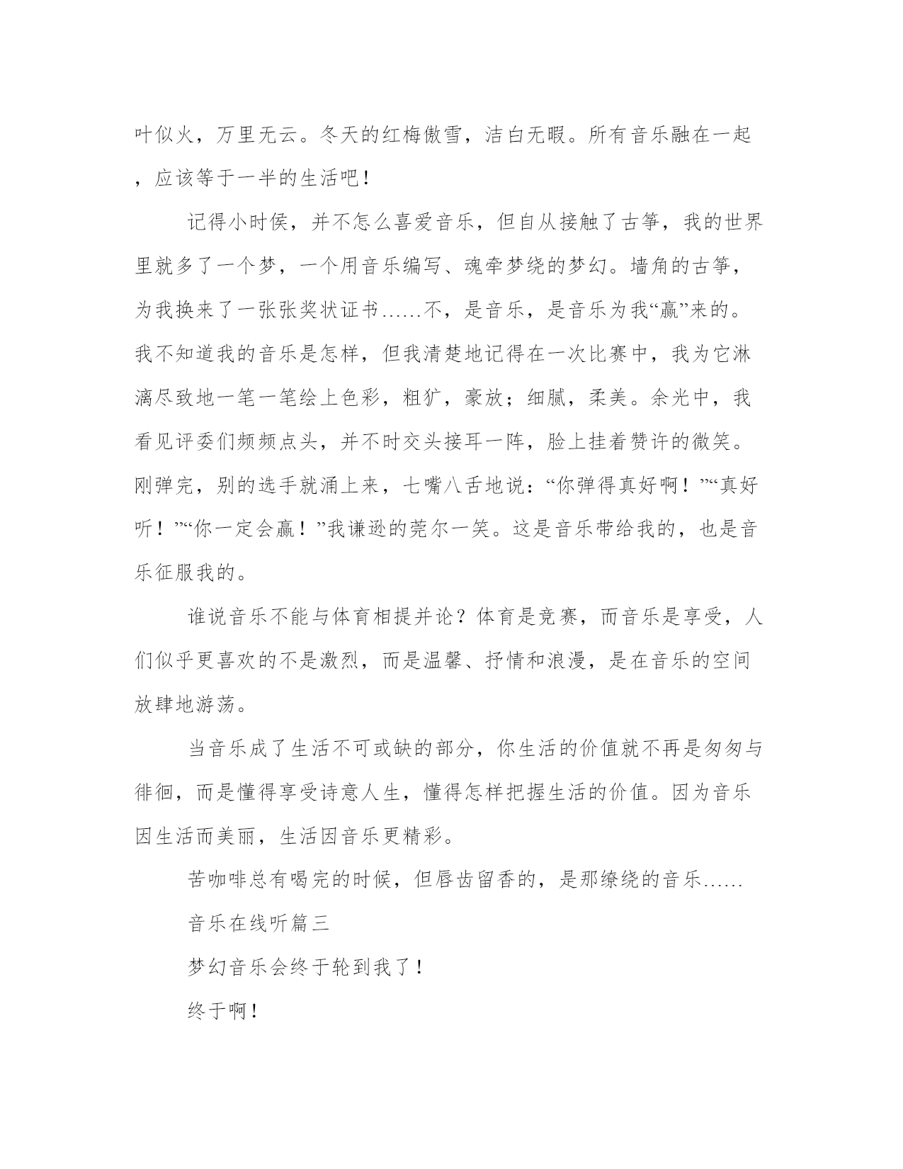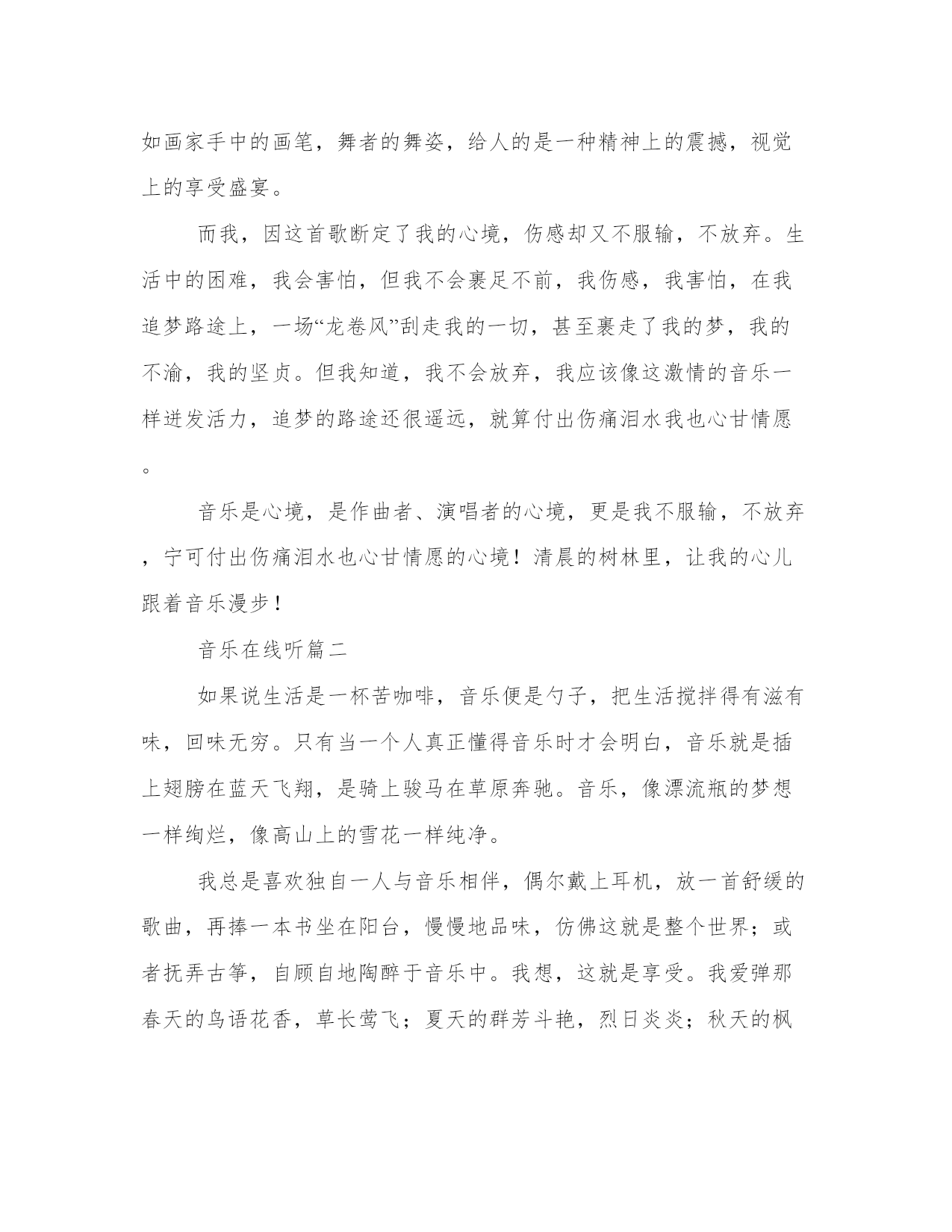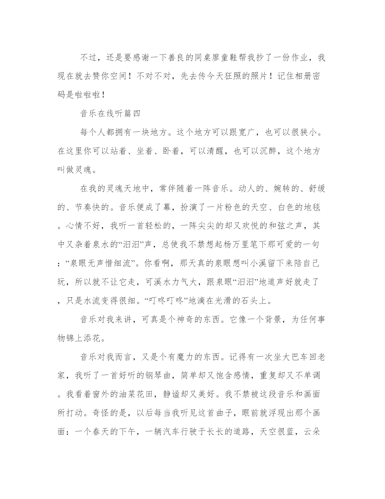 最新音乐在线听(优秀45篇)每个人都曾试图在平淡的学习、工作和生活中写一篇文章。写作是培养人的观察、联想、想象、思维和记忆的重要手段。相信许多人会觉得范文很难写?下面是小编为大家收集的优秀范文,供大家参考借鉴,希望可以帮助到有需要的朋友。音乐在线听篇一——题记我想,会听音乐的人必定是一个“优雅”的人,一个会听音乐,能从音乐中升华中憬悟的人,必然能从音乐中听出心境,作曲者﹑演唱者的心境,而恰恰是我们自己的心境。看快乐男声听了一首追梦赤子心,想必这位作曲者一定是一个有梦想,有追求的人。伴着朝阳听这首歌,是一种享受,你能够感受到一股来自音乐和朝阳相结合的力量。蓬勃的生机恰好配上追梦的不懈坚持。不禁,我被触动了。我不是也有梦想吗?我不应该也像这音乐一样,对梦想守着一份不渝和坚贞。这十二位快男,因为对音乐梦的执着追求,才站在了台上唱出了这般触动人心的音乐,他们的背后,汗水是坚贞,努力是不渝。至于作曲者,一定是一个有故事的人,他把自己的心境用音乐描摹出来,我们仿佛看到了:碧水、蓝天、红花、绿叶,但更多的是对音乐的热爱,对梦想的追求,音乐是他们借以表达情感的东西,就宛如画家手中的画笔,舞者的舞姿,给人的是一种精神上的震撼,视觉上的享受盛宴。而我,因这首歌断定了我的心境,伤感却又不服输,不放弃。生活中的困难,我会害怕,但我不会裹足不前,我伤感,我害怕,在我追梦路途上,一场“龙卷风”刮走我的一切,甚至裹走了我的梦,我的不渝,我的坚贞。但我知道,我不会放弃,我应该像这激情的音乐一样迸发活力,追梦的路途还很遥远,就算付出伤痛泪水我也心甘情愿。音乐是心境,是作曲者、演唱者的心境,更是我不服输,不放弃,宁可付出伤痛泪水也心甘情愿的心境!清晨的树林里,让我的心儿跟着音乐漫步!音乐在线听篇二如果说生活是一杯苦咖啡,音乐便是勺子,把生活搅拌得有滋有味,回味无穷。只有当一个人真正懂得音乐时才会明白,音乐就是插上翅膀在蓝天飞翔,是骑上骏马在草原奔驰。音乐,像漂流瓶的梦想一样绚烂,像高山上的雪花一样纯净。我总是喜欢独自一人与音乐相伴,偶尔戴上耳机,放一首舒缓的歌曲,再捧一本书坐在阳台,慢慢地品味,仿佛这就是整个世界;或者抚弄古筝,自顾自地陶醉于音乐中。我想,这就是享受。我爱弹那春天的鸟语花香,草长莺飞;夏天的群芳斗艳,烈日炎炎;秋天的枫叶似火,万里无云。冬天的红梅傲雪,洁白无暇。所有音乐融在一起,应该等于一半的生活吧!记得小时侯,并不怎么喜爱音乐,但自从接触了古筝,我的世界里就多了一个梦,一个用音乐编写、魂牵梦绕的梦幻。墙角的古筝,为我换来了一张张奖状证书……不,是音乐,是音乐为我“赢”来的。我不知道我的音乐是怎样,但我清楚地记得在一次比赛中,我为它淋漓尽致地一笔一笔绘上色彩,粗犷,豪放;细腻,柔美。余光中,我看见评委们频频点头,并不时交头接耳一阵,脸上挂着赞许的微笑。刚弹完,别的选手就涌上来,七嘴八舌地说:“你弹得真好啊!”“真好听!”“你一定会赢!”我谦逊的莞尔一笑。这是音乐带给我的,也是音乐征服我的。谁说音乐不能与体育相提并论?体育是竞赛,而音乐是享受,人们似乎更喜欢的不是激烈,而是温馨、抒情和浪漫,是在音乐的空间放肆地游荡。当音乐成了生活不可或缺的部分,你生活的价值就不再是匆匆与徘徊,而是懂得享受诗意人生,懂得怎样把握生活的价值。因为音乐因生活而美丽,生活因音乐更精彩。苦咖啡总有喝完的时候,但唇齿留香的,是那缭绕的音乐……音乐在线听篇三梦幻音乐会终于轮到我了!终于啊!不过这是最后一场的,所以就没什么惊奇的了。挺高兴的就是中午我和w一起化的妆,我们还疯狂合照。由于我铭记去年梦幻音乐会的教训,就是我刚在琴凳上坐好,陈总就突然冲上来夺走了我的眼镜。所以今年我表演的时候就坚决不戴眼镜,再说头上还带个特别硬的花环,戴上眼镜更是难受。去学校的这一路上都有不少人跟我打招呼,我只好敷衍地应付着——我根本不知道这是谁!走路的时候还得让w拉着我的手。话说,没戴眼镜就是不爽。不过我有了一个惊人的发现——虽然我在台下看不清楚,但是只要我打开手机为w录像,屏幕上就会清楚地显示台上的情景。这身衣服穿着实在是热,再加上我的头发也没梳为了戴那个戴着特别难受的花环,所以一脖子都是汗。实在是太热了!台上所谓的电子琴也特别坑爹。本来我是弹钢琴的,结果因为一个什么什么原因(虽然游老师解释了但我就是听不懂)换成了一家堪称破烂的电子琴,每一个音弹下去都像是跳奏,我弹的还是c小调夜曲,结果那个题目就被硬生生地念成了小调夜曲!不说这个,电子琴和钢琴就是不一样,一首略带忧伤的曲子就被蹂躏成了这样!都像奏鸣曲似的!我自己都是紧闭双眼弹完的曲子,太恶心了!后来又听王宇辰说什么第一节课被拿来训练五年级的集体舞,由于我们班有5个女生去了梦幻音乐会,所以相对应就有一些男生被委屈了。但是听说我们不用跳万恶的集体舞我还
