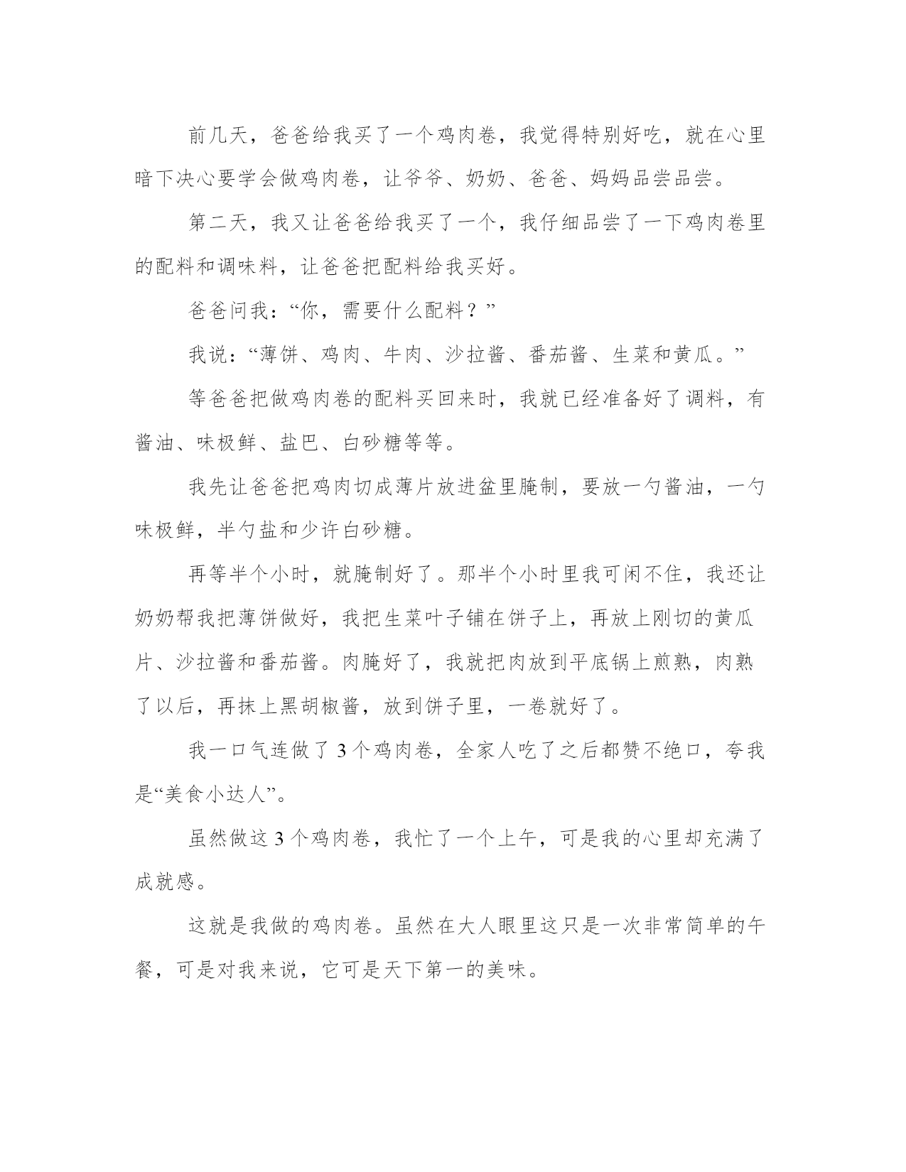 最新我学会了什么作文字汇总范文为教学中作为模范的文章,也常常用来指写作的模板。常常用于文秘写作的参考,也可以作为演讲材料编写前的参考。相信许多人会觉得范文很难写?以下是小编为大家收集的优秀范文,欢迎大家分享阅读。我学会了什么作文字篇一豆豆姐说:“我们比赛吧!”“我会踢的呀!”我急忙答道。“我教你,不难的`,你先看着哦,我踢一遍给你看。”说着,豆豆姐一边踢,一边认真耐心地教我。只见她先把毽子轻轻往上一扔说:“不能太高,也不能太低,大概大自己胸口的位置,等毽子往下落的时候,用自己的右脚的内侧往上踢,但是不能用太大的力!”我边听边摹仿豆豆姐的动作。可是我不是把毽子踢飞了就是踢了个空,急得我涨红了脸。豆豆姐在一边鼓励我说:“多练练就会了。”经过努力,我终于可以连续踢四个了,连小毽子也在一边向我“微笑”。豆豆姐看我踢得满脸大汗,笑着说:“下次再练吧!”于是我们高兴得回家了。我想:“我终于学会了踢毽子,今天的收获可不小。”我学会了什么作文字篇二前几天,爸爸给我买了一个鸡肉卷,我觉得特别好吃,就在心里暗下决心要学会做鸡肉卷,让爷爷、奶奶、爸爸、妈妈品尝品尝。第二天,我又让爸爸给我买了一个,我仔细品尝了一下鸡肉卷里的配料和调味料,让爸爸把配料给我买好。爸爸问我:“你,需要什么配料?”我说:“薄饼、鸡肉、牛肉、沙拉酱、番茄酱、生菜和黄瓜。”等爸爸把做鸡肉卷的配料买回来时,我就已经准备好了调料,有酱油、味极鲜、盐巴、白砂糖等等。我先让爸爸把鸡肉切成薄片放进盆里腌制,要放一勺酱油,一勺味极鲜,半勺盐和少许白砂糖。再等半个小时,就腌制好了。那半个小时里我可闲不住,我还让奶奶帮我把薄饼做好,我把生菜叶子铺在饼子上,再放上刚切的黄瓜片、沙拉酱和番茄酱。肉腌好了,我就把肉放到平底锅上煎熟,肉熟了以后,再抹上黑胡椒酱,放到饼子里,一卷就好了。我一口气连做了3个鸡肉卷,全家人吃了之后都赞不绝口,夸我是“美食小达人”。虽然做这3个鸡肉卷,我忙了一个上午,可是我的心里却充满了成就感。这就是我做的鸡肉卷。虽然在大人眼里这只是一次非常简单的午餐,可是对我来说,它可是天下第一的美味。以后,我只要吃到可口的美味,就要用心记住它的味道和配料,回家做给全家人品尝。学习做美味真的让我感到很快乐啊!