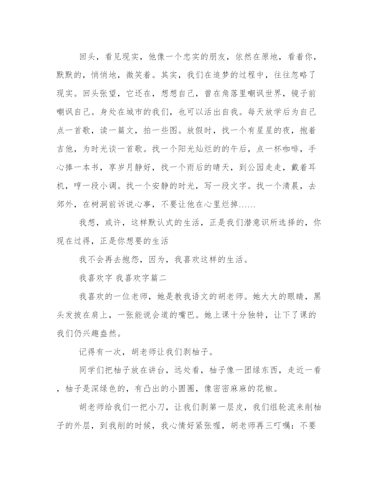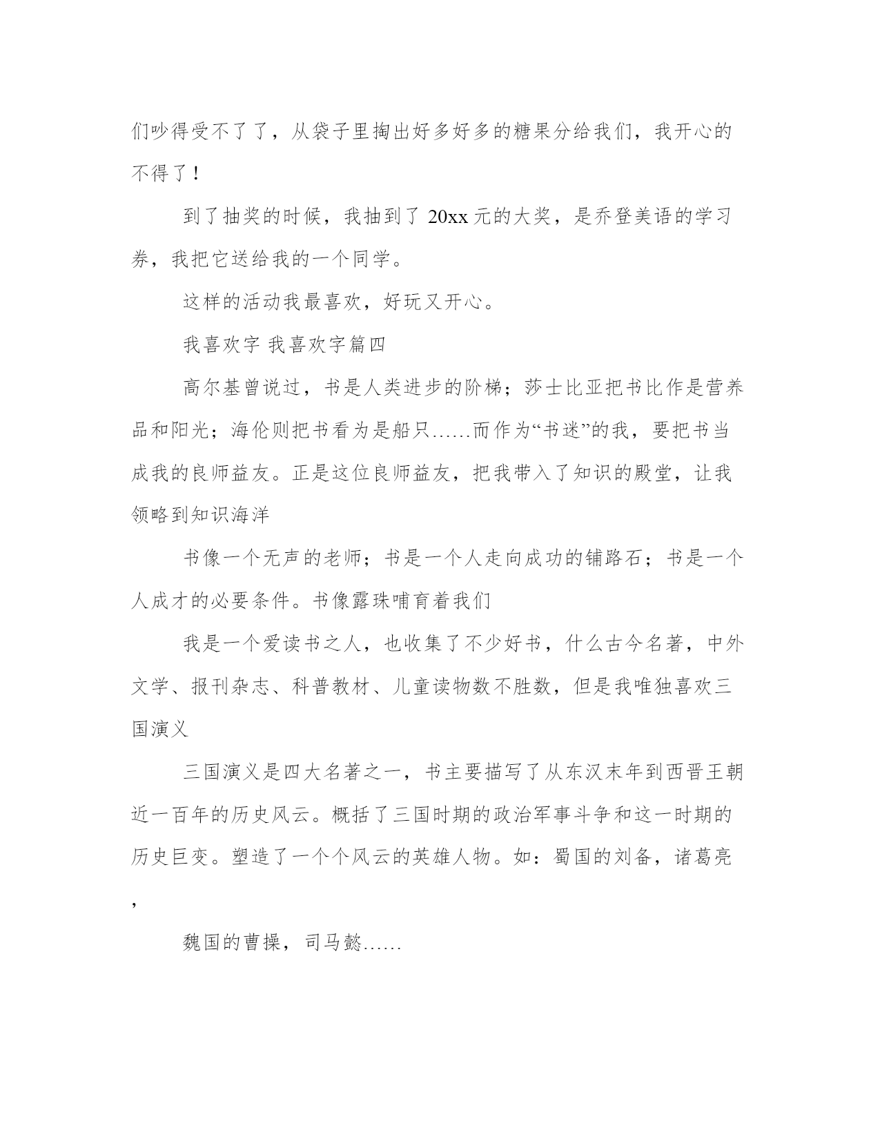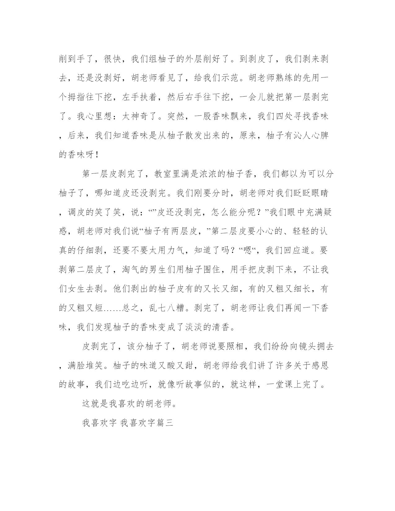 我喜欢字我喜欢字7篇(精选)人的记忆力会随着岁月的流逝而衰退,写作可以弥补记忆的不足,将曾经的人生经历和感悟记录下来,也便于保存一份美好的回忆。写范文的时候需要注意什么呢?有哪些格式需要注意呢?下面我给大家整理了一些优秀范文,希望能够帮助到大家,我们一起来看一看吧。我喜欢字我喜欢字篇一新面孔,一张张或天使或魔鬼的脸,新环境,冷淡的无法言说。我,一个以回忆为酒,将自己灌的烂醉的人,早已熟悉了颓废的生活。一个声音在耳边回荡,去寻找属于自己的生活,生活?不禁冷笑,这不是我想要的,车水马龙的街,人山人海的城……我要的自由呢?自由呢?问时光,时光静默不语。无比萧瑟的心痛。茫然,不知道灵魂该去往何处。夜深人静,面对内心的荒芜,我有无尽的落寞,无尽的凄凉,无尽的苦涩。我想要的生活,一个背包,一台相机,一个本,一支笔,一踏钞票,一颗心,一份心情,一双脚,一个梦。可现实就像一把锤子,蒋梦打的支离破碎。活在现实中的我们。失望,颓废,在一出生就被扣上的枷锁。属于我们的悲哀,时代少年的悲哀。回头,看见现实,他像一个忠实的朋友,依然在原地,看着你,默默的,悄悄地,微笑着。其实,我们在追梦的过程中,往往忽略了现实。回头张望,它还在,想想自己,曾在角落里嘲讽世界,镜子前嘲讽自己。身处在城市的我们,也可以活出自我。每天放学后为自己点一首歌,读一篇文,拍一些图。放假时,找一个有星星的夜,抱着吉他,为时光谈一首歌。找一个阳光灿烂的的午后,点一杯咖啡,手心捧一本书,享岁月静好,找一个雨后的晴天,到公园走走,戴着耳机,哼一段小调。找一个安静的时光,写一段文字。找一个清晨,去郊外,在树洞前诉说心事,不要让他在心里烂掉……我想,或许,这样默认式的生活,正是我们潜意识所选择的,你现在过得,正是你想要的生活我不会再去抱怨,因为,我喜欢这样的生活。我喜欢字我喜欢字篇二我喜欢的一位老师,她是教我语文的胡老师。她大大的眼睛,黑头发披在肩上,一张能说会道的嘴巴。她上课十分独特,让下了课的我们仍兴趣盎然。记得有一次,胡老师让我们剥柚子。同学们把柚子放在讲台,远处看,柚子像一团绿东西,走近一看,柚子是深绿色的,有凸出的小圆圈,像密密麻麻的花椒。胡老师给我们一把小刀,让我们剥第一层皮,我们组轮流来削柚子的外层,到我削的时候,我心情好紧张喔,胡老师再三叮嘱:不要削到手了,很快,我们组柚子的外层削好了。到剥皮了,我们剥来剥去,还是没剥好,胡老师看见了,给我们示范。胡老师熟练的先用一个拇指往下挖,左手扶着,然后右手往下挖,一会儿就把第一层剥完了。我心里想:太神奇了。突然,一股香味飘来,我们四处寻找香味,后来,我们知道香味是从柚子散发出来的,原来,柚子有沁人心脾的香味呀!第一层皮剥完了,教室里满是浓浓的柚子香,我们都以为可以分柚子了,哪知道皮还没剥完。我们刚要分时,胡老师对我们眨眨眼睛,调皮的笑了笑,说:“”皮还没剥完,怎么能分呢?”我们眼中充满疑惑,胡老师对我们说“柚子有两层皮,”第二层皮要小心的、轻轻的认真的仔细剥,还要不要太用力气,知道了吗?“嗯“,我们回应道。要剥第二层皮了,淘气的男生们用柚子围住,用手把皮剥下来,不让我们女生去剥。他们剥出的柚子皮有的又长又细,有的又粗又细长,有的又粗又短……总之,乱七八糟。剥完了,胡老师让我们再闻一下香味,我们发现柚子的香味变成了淡淡的清香。皮剥完了,该分柚子了,胡老师说要照相,我们纷纷向镜头拥去,满脸堆笑。柚子的味道又酸又甜,胡老师给我们讲了许多关于感恩的故事,我们边吃边听,就像听故事似的,就这样,一堂课上完了。这就是我喜欢的胡老师。我喜欢字我喜欢字篇三万圣节让人联想到的就有南瓜脸、巫师、魔鬼等等千奇百怪的东西,这次我们日报小记者们也参加了万圣节活动,我早早地报名参加,然后准备了服装,嘿嘿……我的装扮是一个海盗。到了会场,哇,好恐怖!一个男孩子把自己打扮成一个魔鬼的样子,还一直追着我跑,我被追得有点怕了,想着,我是海盗,我要怕他吗?于是我就站住不跑了,用刀跟他砍起来,然后魔鬼就走了。我被分到a队,我们去参加第一个活动“咬苹果”。我想:这样简单的游戏他们怎么玩不好呢?等到我玩了,我咬,我咬,我咬咬咬,苹果没咬到,水是喝了不少。接下来是圈南瓜,不幸的是我一个都没圈中,哎!看起来简单,做起来难,我以为我一定能圈到呢!英语游戏我收获多多。我们一大群孩子在老师的带领下,转圈圈,然后听到老师说到哪个数字,然后我们就几个人抱在一起。我和刘馨怡一直跟着,把她当成我的目标,只要老师一说数字,我不管三七二十一就赶紧抱住她,最后我们都胜出了,拿到了老师奖励的糖果,太高兴了!然后我们去画南瓜头脸谱,唰唰唰,没多少时间,脸谱就完成了,湿湿的,我就交给妈妈,让她帮我保管。最好玩的就是去要糖果,我们到了外面的保安亭,冲着保安叔叔大声喊着:“不给糖果就捣乱,不给糖果就捣乱……!”保