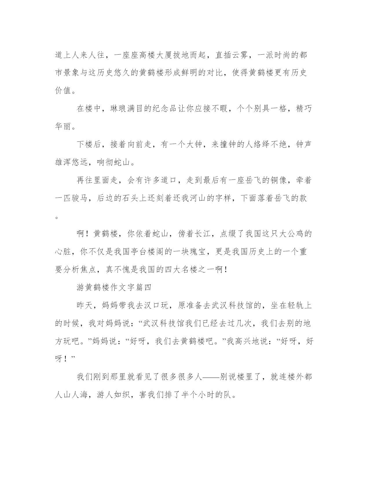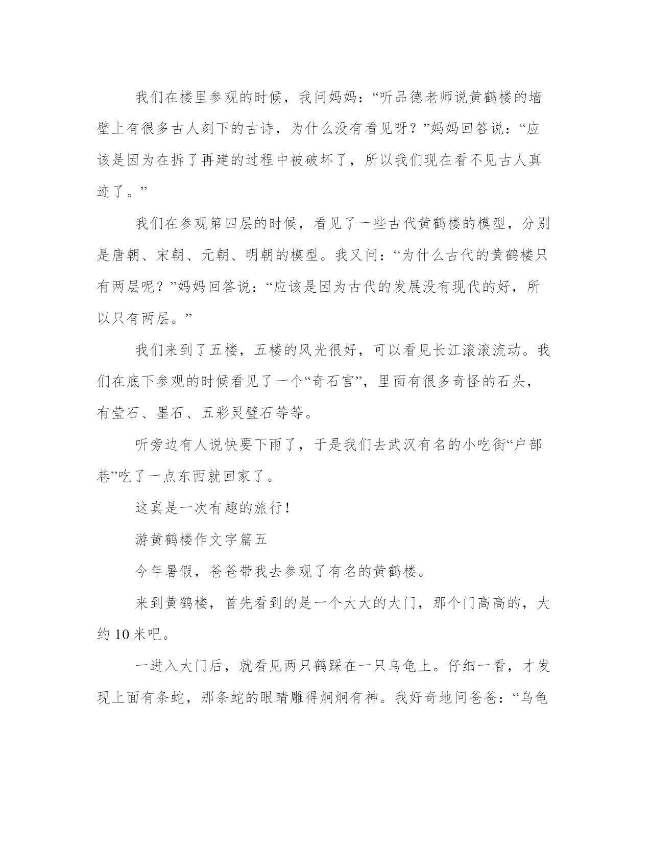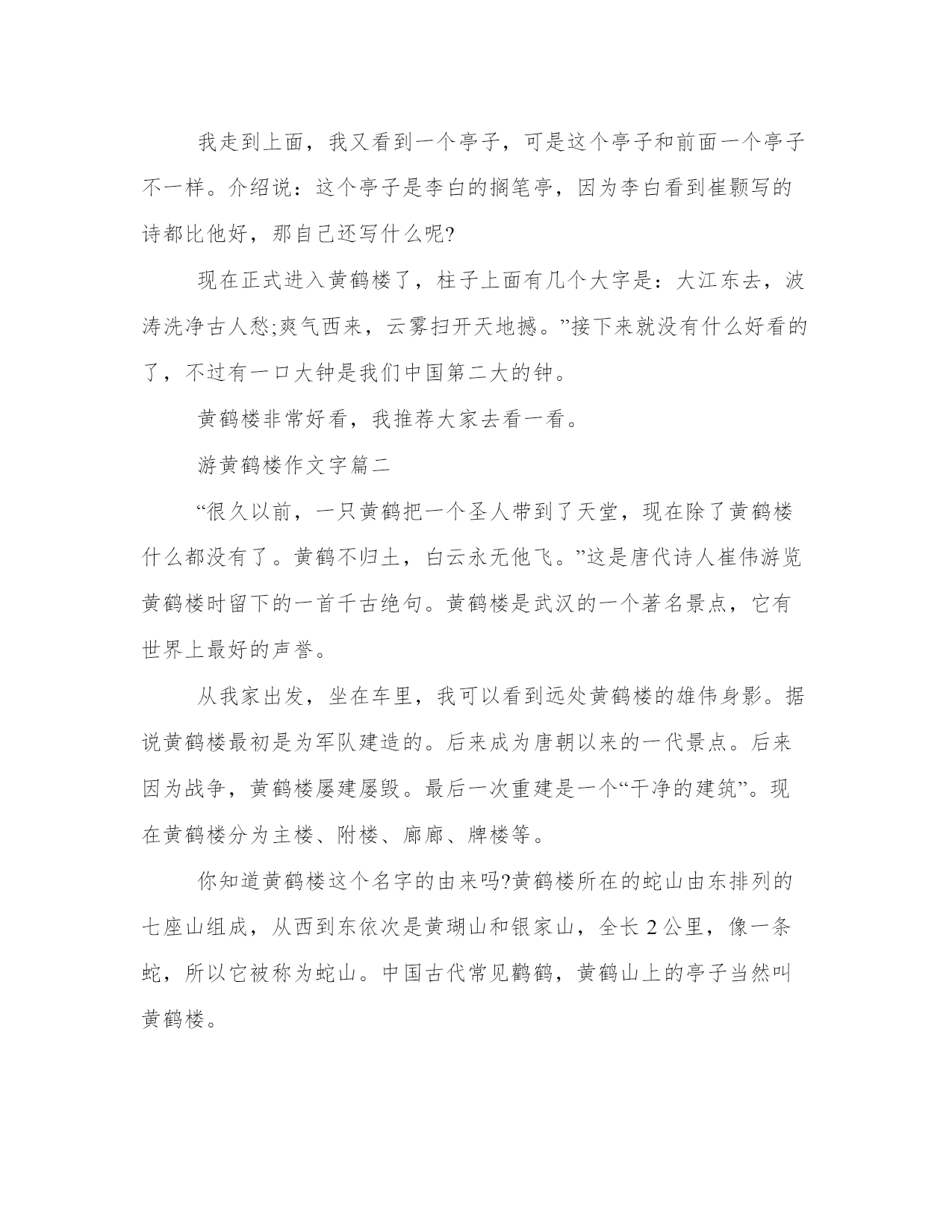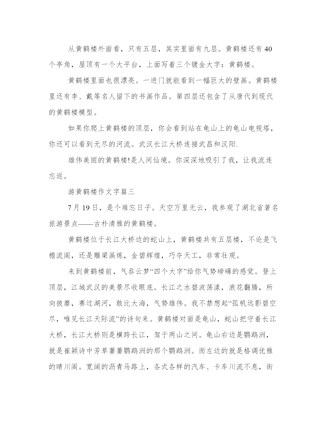 游黄鹤楼作文字六篇(通用)在日常的学习、工作、生活中,肯定对各类范文都很熟悉吧。写范文的时候需要注意什么呢?有哪些格式需要注意呢?下面是小编帮大家整理的优质范文,仅供参考,大家一起来看看吧。游黄鹤楼作文字篇一关于黄鹤楼有一个神话传说,你们想知道吗?你们真的想知道啊!那我就告诉你们吧:据说八仙之一的吕洞宾,来到一个餐馆。“吃香喝辣”的,吃完扭头就走,可是那个店主也没有向他索要饭钱,吕洞宾就这样白吃白喝了一个多月。有一天,吕洞宾又来这家餐馆,对店主说:我欠你的钱实在是太多了。于是他用橙子在墙壁上画了一只黄鹤,只要拍拍手,那只黄鹤就会飞下来。就这样,那位店主只用了几年,就拥有了上百万资产。有一天,吕洞宾又来到了那个酒店,把黄鹤给收走了。那位老板为了纪念那只黄鹤,就在一座山上建了一座黄鹤楼。我一开始进去黄鹤楼,就看见一个亭子,那个亭子的介绍上说:这个亭子里面有一个大书法家王羲之写的鹅字,我进去一看果然有一个鹅字。我走到上面,我又看到一个亭子,可是这个亭子和前面一个亭子不一样。介绍说:这个亭子是李白的搁笔亭,因为李白看到崔颢写的诗都比他好,那自己还写什么呢?现在正式进入黄鹤楼了,柱子上面有几个大字是:大江东去,波涛洗净古人愁;爽气西来,云雾扫开天地撼。”接下来就没有什么好看的了,不过有一口大钟是我们中国第二大的钟。黄鹤楼非常好看,我推荐大家去看一看。游黄鹤楼作文字篇二“很久以前,一只黄鹤把一个圣人带到了天堂,现在除了黄鹤楼什么都没有了。黄鹤不归土,白云永无他飞。”这是唐代诗人崔伟游览黄鹤楼时留下的一首千古绝句。黄鹤楼是武汉的一个著名景点,它有世界上最好的声誉。从我家出发,坐在车里,我可以看到远处黄鹤楼的雄伟身影。据说黄鹤楼最初是为军队建造的。后来成为唐朝以来的一代景点。后来因为战争,黄鹤楼屡建屡毁。最后一次重建是一个“干净的建筑”。现在黄鹤楼分为主楼、附楼、廊廊、牌楼等。你知道黄鹤楼这个名字的由来吗?黄鹤楼所在的蛇山由东排列的七座山组成,从西到东依次是黄瑚山和银家山,全长2公里,像一条蛇,所以它被称为蛇山。中国古代常见鹳鹤,黄鹤山上的亭子当然叫黄鹤楼。从黄鹤楼外面看,只有五层,其实里面有九层。黄鹤楼还有40个亭角,屋顶有一个大平台,上面写着三个镀金大字:黄鹤楼。黄鹤楼里面也很漂亮。一进门就能看到一幅巨大的壁画。黄鹤楼里还有李、戴等名人留下的书画作品。第四层还包含了从唐代到现代的黄鹤楼模型。如果你爬上黄鹤楼的顶层,你会看到站在龟山上的龟山电视塔,你还可以看到无尽的河流。武汉长江大桥连接武昌和汉阳.雄伟美丽的黄鹤楼!是人间仙境。你深深地吸引了我,让我流连忘返。游黄鹤楼作文字篇三7月19日,是个难忘日子。天空万里无云,我参观了湖北省著名旅游景点——古朴清雅的黄鹤楼。黄鹤楼位于长江大桥边的蛇山上,黄鹤楼共有五层楼,不论是飞檐流阁,还是雕梁画炼,金碧辉煌,巧夺天工,非常壮观。来到黄鹤楼前,气吞云梦“四个大字”给你气势磅礴的感觉。登上顶层,江城武汉的美景尽收眼底。长江之水碧波荡漾,浪花翻腾,所向披靡,赛过湖河,敢比大海,气势雄伟。我不禁想起“孤帆远影碧空尽,唯见长江天际流”的诗句来。黄鹤楼对面是龟山,蛇山把守着长江大桥,长江大桥则是横跨长江,驾于两山之间。龟山右边是鹦鹉洲,就是崔颖诗中芳草萋萋鹦鹉洲的那个鹦鹉洲。而左边的就是格调优雅的晴川阁。宽阔的沥青马路上,各式各样的汽车、卡车川流不息,街道上人来人往,一座座高楼大厦拔地而起,直插云雾,一派时尚的都市景象与这历史悠久的黄鹤楼形成鲜明的对比,使得黄鹤楼更有历史价值。在楼中,琳琅满目的纪念品让你应接不暇,个个别具一格,精巧华丽。下楼后,接着向前走,有一个大钟,来撞钟的人络绎不绝,钟声雄浑悠远,响彻蛇山。再往里面走,会有许多道口,走到最后有一座岳飞的铜像,牵着一匹骏马,后边的石头上还刻着还我河山的字样,下面落着岳飞的款。啊!黄鹤楼,你依着蛇山,傍着长江,点缀了我国这只大公鸡的心脏,你不仅是我国亭台楼阁的一块瑰宝,更是我国历史上的一个重要分析焦点,真不愧是我国的四大名楼之一啊!游黄鹤楼作文字篇四昨天,妈妈带我去汉口玩,原准备去武汉科技馆的,坐在轻轨上的时候,我对妈妈说:“武汉科技馆我们已经去过几次,我们去别的地方玩吧。”妈妈说:“好呀,我们去黄鹤楼吧。”我高兴地说:“好呀,好呀!”我们刚到那里就看见了很多很多人——别说楼里了,就连楼外都人山人海,游人如织,害我们排了半个小时的队。我们在楼里参观的时候,我问妈妈:“听品德老师说黄鹤楼的墙壁上有很多古人刻下的古诗,为什么没有看见呀?”妈妈回答说:“应该是因为在拆了再建的过程中被破坏了,所以我们现在看不见古人真迹了。”我们在参观第四层的时候,看见了一些古代黄鹤楼的模型,分别是唐朝、宋朝、元朝、明朝的模型。我又问:“为什么古代的黄鹤楼只有两层呢?”妈妈回答说:“应