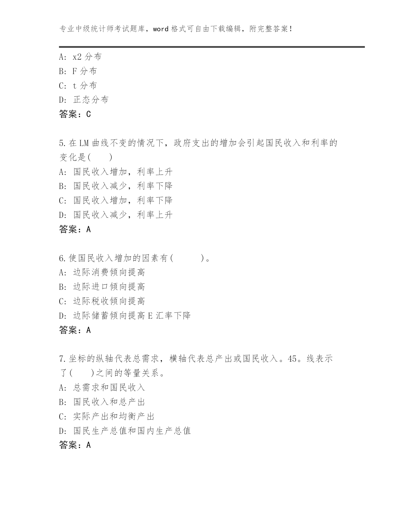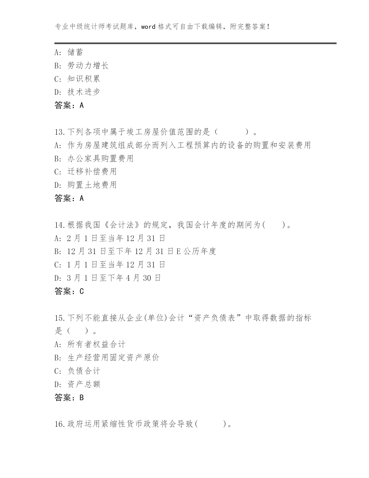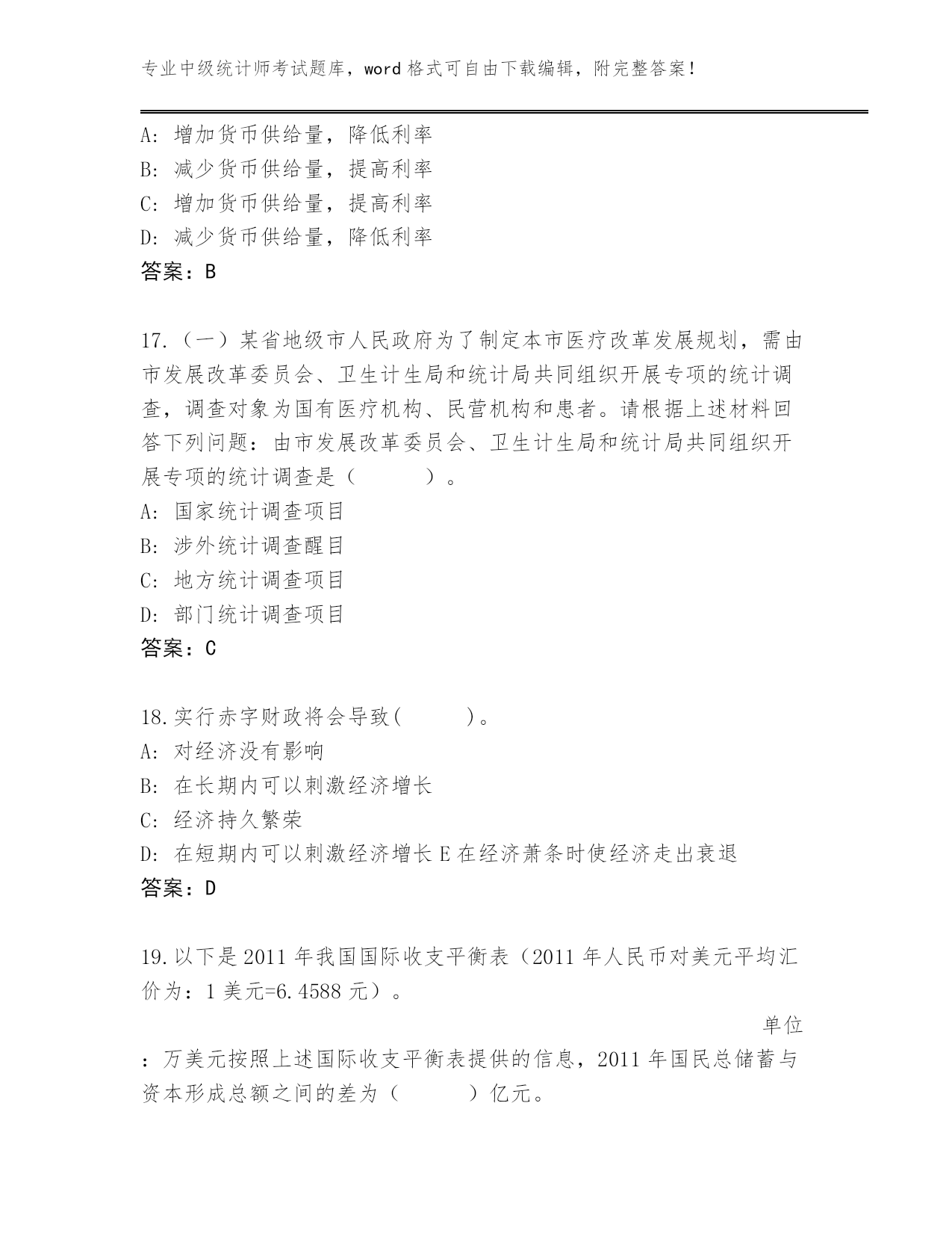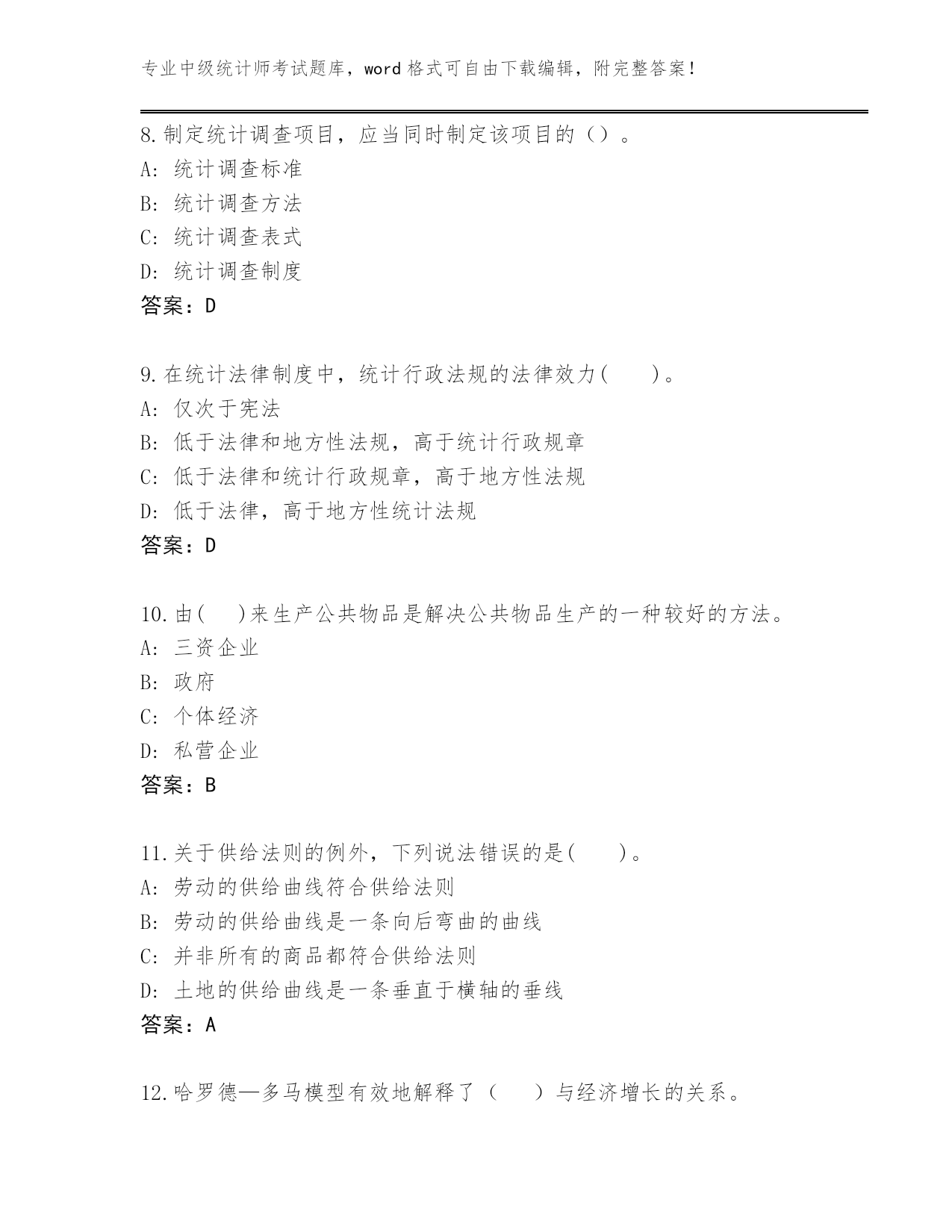 专业中级统计师考试题库,word格式可自由下载编辑,附完整答案!2024年山东省微山县中级统计师考试完整题库及答案【】第I部分单选题(100题)1.按我国现行会计准则的规定,()一般由财政部统一制定。A:会计科目B:账户C:总分类科目D:明细分类科目答案:C2.下列各项中不属于劳动者报酬范围的是()。A:小费B:单位替雇员缴纳的社会保险缴款C:财政对社保基金的补贴D:雇员自己交纳的社会保险缴款答案:C3.账户的基本结构可以简称为()。A:“土字账户”B:“丁字账户”C:“左右账户”D:“一字账户”答案:B4.当正态总体的方差未知,且为小样本条件下,构造总体均值的置信区间使用的分布是()。A:x2分布B:F分布C:t分布D:正态分布答案:C5.在LM曲线不变的情况下,政府支出的增加会引起国民收入和利率的变化是()A:国民收入增加,利率上升B:国民收入减少,利率下降C:国民收入增加,利率下降D:国民收入减少,利率上升答案:A6.使国民收入增加的因素有()。A:边际消费倾向提高B:边际进口倾向提高C:边际税收倾向提高D:边际储蓄倾向提高E汇率下降答案:A7.坐标的纵轴代表总需求,横轴代表总产出或国民收入。45。线表示了()之间的等量关系。A:总需求和国民收入B:国民收入和总产出C:实际产出和均衡产出D:国民生产总值和国内生产总值答案:A8.制定统计调查项目,应当同时制定该项目的()。A:统计调查标准B:统计调查方法C:统计调查表式D:统计调查制度答案:D9.在统计法律制度中,统计行政法规的法律效力()。A:仅次于宪法B:低于法律和地方性法规,高于统计行政规章C:低于法律和统计行政规章,高于地方性法规D:低于法律,高于地方性统计法规答案:D10.由()来生产公共物品是解决公共物品生产的一种较好的方法。A:三资企业B:政府C:个体经济D:私营企业答案:B11.关于供给法则的例外,下列说法错误的是()。A:劳动的供给曲线符合供给法则B:劳动的供给曲线是一条向后弯曲的曲线C:并非所有的商品都符合供给法则D:土地的供给曲线是一条垂直于横轴的垂线答案:A12.哈罗德—多马模型有效地解释了()与经济增长的关系。A:储蓄B:劳动力增长C:知识积累D:技术进步答案:A13.下列各项中属于竣工房屋价值范围的是()。A:作为房屋建筑组成部分而列入工程预算内的设备的购置和安装费用B:办公家具购置费用C:迁移补偿费用D:购置土地费用答案:A14.根据我国《会计法》的规定,我国会计年度的期间为()。A:2月1日至当年12月31日B:12月31日至下年12月31日E公历年度C:1月1日至当年12月31日D:3月1日至下年4月30日答案:C15.下列不能直接从企业(单位)会计“资产负债表”中取得数据的指标是()。A:所有者权益合计B:生产经营用固定资产原价C:负债合计D:资产总额答案:B16.政府运用紧缩性货币政策将会导致()。A:增加货币供给量,降低利率B:减少货币供给量,提高利率C:增加货币供给量,提高利率D:减少货币供给量,降低利率答案:B17.(一)某省地级市人民政府为了制定本市医疗改革发展规划,需由市发展改革委员会、卫生计生局和统计局共同组织开展专项的统计调查,调查对象为国有医疗机构、民营机构和患者。请根据上述材料回答下列问题:由市发展改革委员会、卫生计生局和统计局共同组织开展专项的统计调查是()。A:国家统计调查项目B:涉外统计调查醒目C:地方统计调查项目D:部门统计调查项目答案:C18.实行赤字财政将会导致()。A:对经济没有影响B:在长期内可以刺激经济增长C:经济持久繁荣D:在短期内可以刺激经济增长E在经济萧条时使经济走出衰退答案:D19.以下是2011年我国国际收支平衡表(2011年人民币对美元平均汇价为:1美元=6.4588元)。单位:万美元按照上述国际收支平衡表提供的信息,2011年国民总储蓄与资本形成总额之间的差为()亿元。A:13028.3B:27305.9C:12163.3D:14277.6答案:A20.房地产中介服务不包括()。A:房地产咨询B:房产测绘C:房地产评估D:房地产居间答案:B21.玉米价格下降一般会导致()。A:玉米片供给曲线左移B:玉米供给量增加C:玉米供给量沿着供给曲线增加D:玉米片供给曲线右移答案:D22.对某地区失业人员进行调查,得到有关失业周数、失业者年龄和受教育年限等资料,对此资料进行相关与回归分析后所得的结果如表1、表2所示:回归分析表可知,失业周数与年龄拟合的回归方程方差分析检验结果说明()。A:Y与X之间存在显著线性相关关系B:Y与X之间不存在非线性相关关系C:Y与X之间存在线性相关,但关系不显著D:Y与X之间不存在线性相关关系答案:A23.企业长期资产的构建活动属于现金流量表上的()。A:不属于上述任