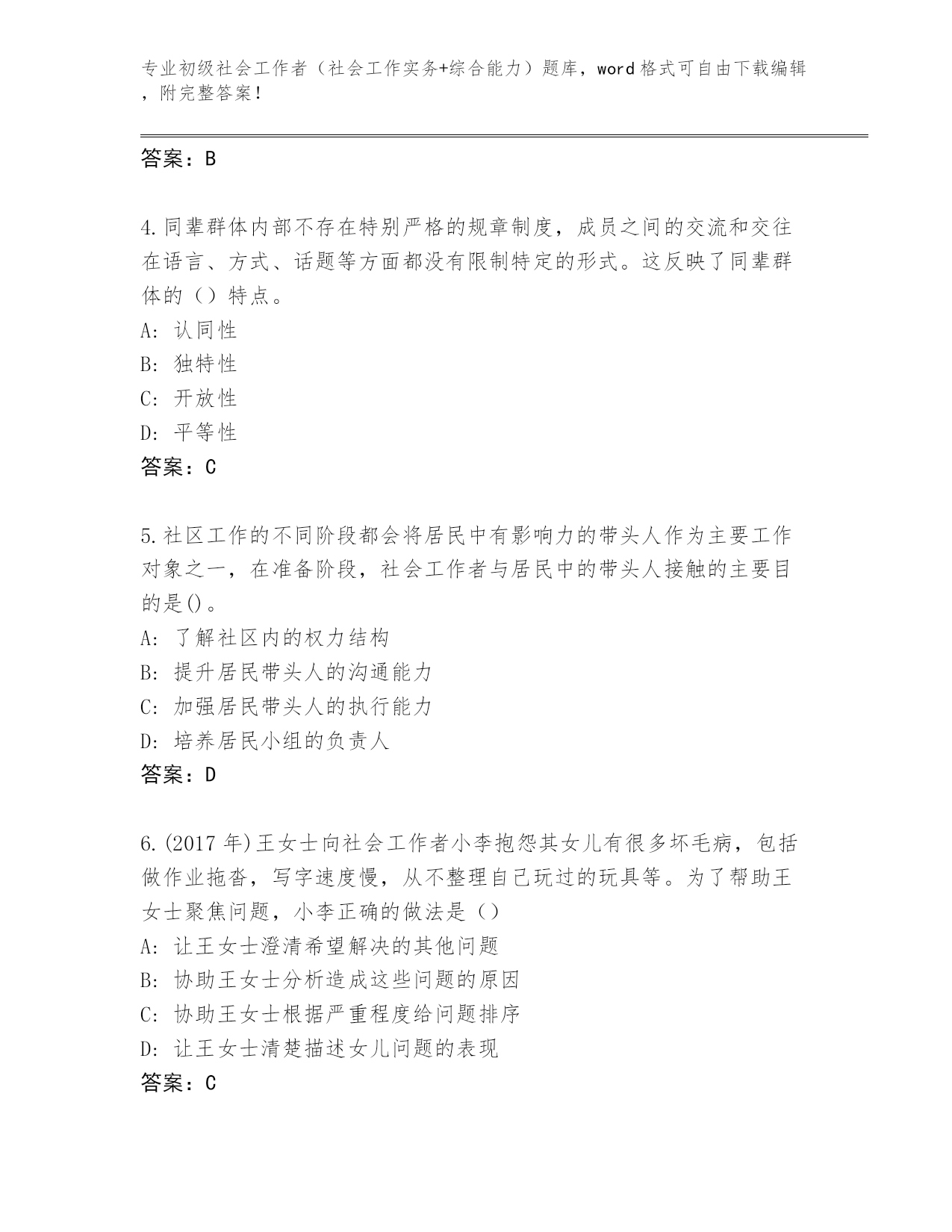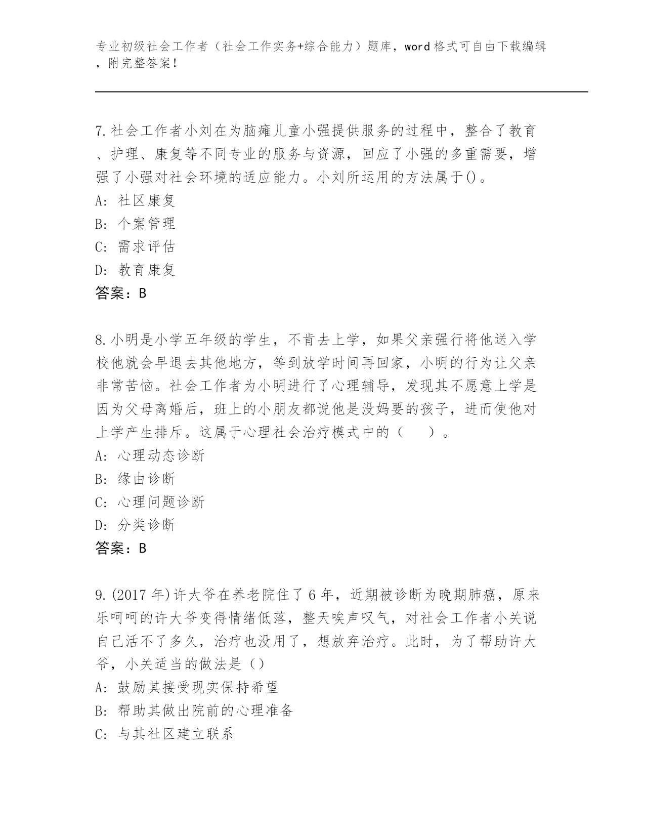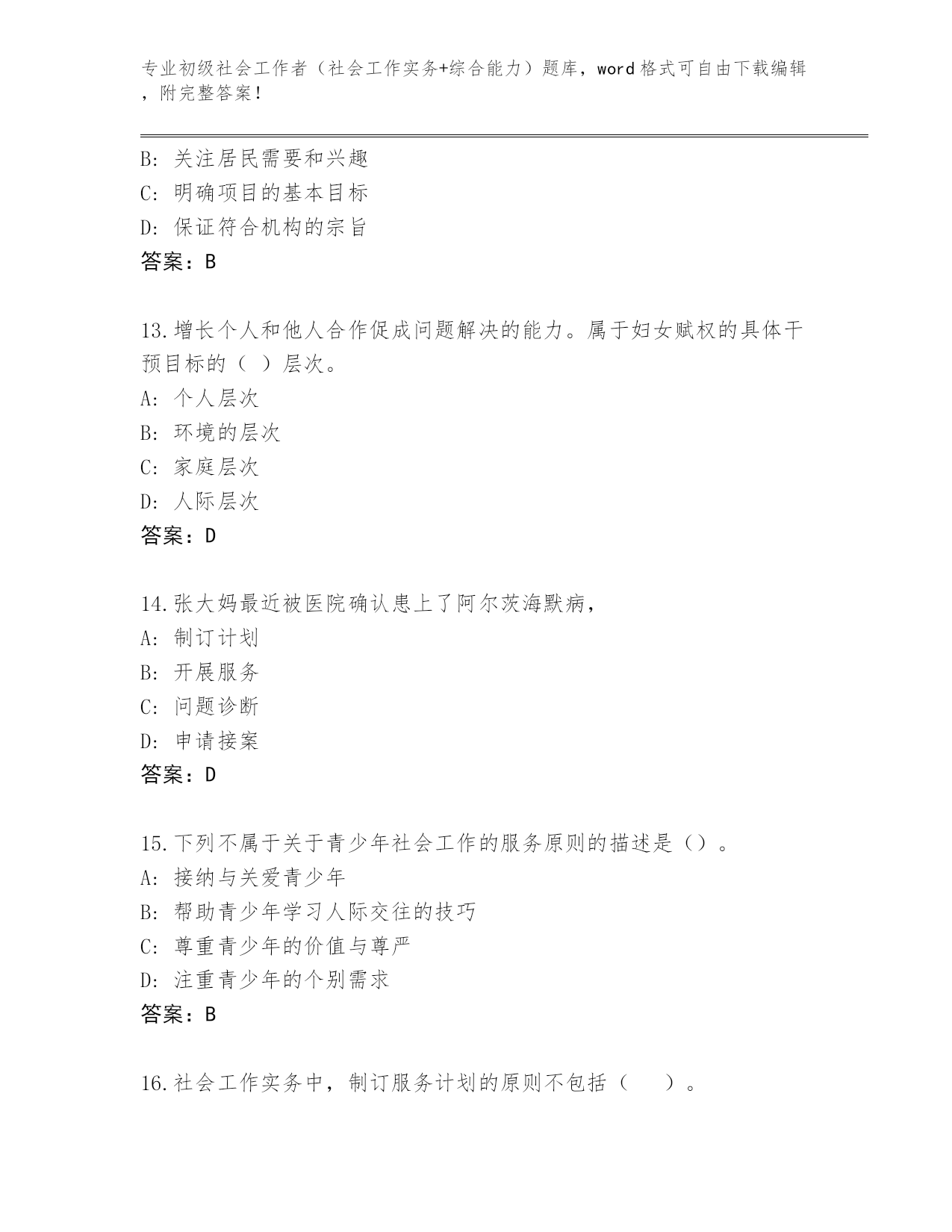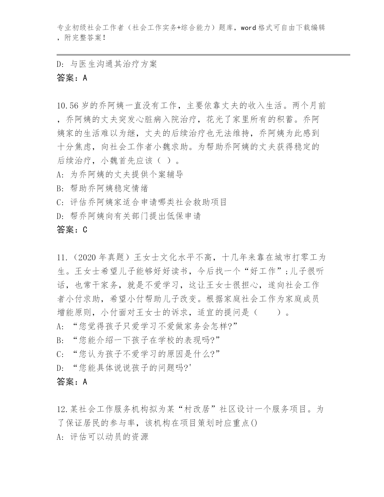 专业初级社会工作者(社会工作实务+综合能力)题库,word格式可自由下载编辑,附完整答案!内部使用福建省仓山区初级社会工作者(社会工作实务+综合能力)题库附参考答案(模拟题)第I部分单选题(100题)1.关于在学校开展个案工作的做法,正确的是()。A:学校个案工作适用对象不包括家长B:学校个案工作也就是学校的德育工作C:学校个案工作以学生为主要对象D:心理咨询可以替代学校个案工作答案:C2.老年人社区照顾的特点不包括()。A:基于评估结果制订的社区照顾方案通常都是综合性的B:社区照顾方案的设计需要有明确的介入目的、介入对象、介入内容、预期介入效果、工作成效的评估方法等C:社区照顾正在由服务导向型向需求导向型转变D:社区照顾基于社会工作者的意见来提供服务答案:D3.()一般是指国家对因公伤残人员、因公死亡以及病故人员家属所采取的一种物质抚慰形式。A:奖励B:抚恤C:安置D:优待答案:B4.同辈群体内部不存在特别严格的规章制度,成员之间的交流和交往在语言、方式、话题等方面都没有限制特定的形式。这反映了同辈群体的()特点。A:认同性B:独特性C:开放性D:平等性答案:C5.社区工作的不同阶段都会将居民中有影响力的带头人作为主要工作对象之一,在准备阶段,社会工作者与居民中的带头人接触的主要目的是()。A:了解社区内的权力结构B:提升居民带头人的沟通能力C:加强居民带头人的执行能力D:培养居民小组的负责人答案:D6.(2017年)王女士向社会工作者小李抱怨其女儿有很多坏毛病,包括做作业拖沓,写字速度慢,从不整理自己玩过的玩具等。为了帮助王女士聚焦问题,小李正确的做法是()A:让王女士澄清希望解决的其他问题B:协助王女士分析造成这些问题的原因C:协助王女士根据严重程度给问题排序D:让王女士清楚描述女儿问题的表现答案:C7.社会工作者小刘在为脑瘫儿童小强提供服务的过程中,整合了教育、护理、康复等不同专业的服务与资源,回应了小强的多重需要,增强了小强对社会环境的适应能力。小刘所运用的方法属于()。A:社区康复B:个案管理C:需求评估D:教育康复答案:B8.小明是小学五年级的学生,不肯去上学,如果父亲强行将他送入学校他就会早退去其他地方,等到放学时间再回家,小明的行为让父亲非常苦恼。社会工作者为小明进行了心理辅导,发现其不愿意上学是因为父母离婚后,班上的小朋友都说他是没妈要的孩子,进而使他对上学产生排斥。这属于心理社会治疗模式中的()。A:心理动态诊断B:缘由诊断C:心理问题诊断D:分类诊断答案:B9.(2017年)许大爷在养老院住了6年,近期被诊断为晚期肺癌,原来乐呵呵的许大爷变得情绪低落,整天唉声叹气,对社会工作者小关说自己活不了多久,治疗也没用了,想放弃治疗。此时,为了帮助许大爷,小关适当的做法是()A:鼓励其接受现实保持希望B:帮助其做出院前的心理准备C:与其社区建立联系D:与医生沟通其治疗方案答案:A10.56岁的乔阿姨一直没有工作,主要依靠丈夫的收入生活。两个月前,乔阿姨的丈夫突发心脏病入院治疗,花光了家里所有的积蓄。乔阿姨家的生活难以为继,丈夫的后续治疗也无法维持,乔阿姨为此感到十分焦虑,向社会工作者小魏求助。为帮助乔阿姨的丈夫获得稳定的后续治疗,小魏首先应该()。A:为乔阿姨的丈夫提供个案辅导B:帮助乔阿姨稳定情绪C:评估乔阿姨家适合申请哪类社会救助项目D:帮乔阿姨向有关部门提出低保申请答案:C11.(2020年真题)王女士文化水平不高,十几年来靠在城市打零工为生。王女士希望儿子能够好好读书,今后找一个“好工作”;儿子很听话,也常干家务,就是不爱学习,这让王女士很担心,遂向社会工作者小付求助,希望小付帮助儿子改变。根据家庭社会工作为家庭成员增能原则,小付面对王女士的诉求,适宜的提问是()。A:“您觉得孩子只爱学习不爱做家务会怎样?”B:“您能介绍一下孩子在学校的表现吗?”C:“您认为孩子不爱学习的原因是什么?”D:“您能具体说说孩子的问题吗?'答案:A12.某社会工作服务机构拟为某“村改居”社区设计一个服务项目。为了保证居民的参与率,该机构在项目策划时应重点()A:评估可以动员的资源B:关注居民需要和兴趣C:明确项目的基本目标D:保证符合机构的宗旨答案:B13.增长个人和他人合作促成问题解决的能力。属于妇女赋权的具体干预目标的()层次。A:个人层次B:环境的层次C:家庭层次D:人际层次答案:D14.张大妈最近被医院确认患上了阿尔茨海默病,A:制订计划B:开展服务C:问题诊断D:申请接案答案:D15.下列不属于关于青少年社会工作的服务原则的描述是()。A:接纳与关爱青少年B:帮助青少年学习人际交往的技巧C:尊重青少年的价值与尊严D:注重青少年的个别需求答案:B16.社会工作实务中,制订服务计划的原则不包括()。A:有服务对象的参与