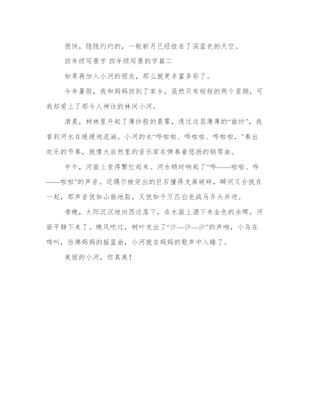 2023年四年级写景字四年级写景的字优质在日常的学习、工作、生活中,肯定对各类范文都很熟悉吧。大家想知道怎么样才能写一篇比较优质的范文吗?以下是小编为大家收集的优秀范文,欢迎大家分享阅读。四年级写景字四年级写景的字篇一这喝多了酒的醉汉也有秀美恬静的一面,仿佛是沉醉了一般。海岛的黄昏时,路边的花花草草都在微风的抚摸之下,安安静静的睡去了。连绵的群山上笔直挺立的一座座白色的风车还没停歇,绚丽的晚霞照在风车旋转不停的叶子上,像是涂了嫣红的胭脂的娇媚脸蛋,亭亭玉立的躯干也披上了金色夕阳做成的长裙,那腰肢显得格外柔美。群山脚下的田涂渔村沉浸在安逸的气息中。潮水慢慢涨了上来,一朵朵洁白的浪花转眼间变成七彩的了,像是五光十色的梦幻球翻滚在堤岸。另一边的岸边,围栏旁种满了树,我也说不上它到底是什么树,只有那晚风吹拂下沙沙声,让听着的人觉得心情舒畅,像是它们在讲悄悄话。“日落西山鸟归林。”鸟儿扑打着翅膀,带着声声鸣啭,飞过稻田,掠过小河回巢去了。在村子里补网的阿姨们带着劳动工具,说说笑笑地结伴回家了,背着书包的学生排着整齐的队伍结束了一天的学习也高高兴兴的往家跑。零零落落的村庄,开始升腾其袅袅的'炊烟。很快,隐隐约约的,一轮新月已经挂在了深蓝色的天空。四年级写景字四年级写景的字篇二如果再加入小河的朋友,那么就更丰富多彩了。今年暑假,我和妈妈回到了家乡,虽然只有短短的两个星期,可我却爱上了那令人神往的林间小河。清晨,树林里升起了薄纱般的晨雾,透过这层薄薄的“面纱”,我看到河水在缓缓地流淌。小河的水“哗啦啦、哗啦啦、哗啦啦,”奏出欢乐的节奏,就像大自然里的音乐家在弹奏着悠扬的钢琴曲。中午,河面上变得繁忙起来。河水顿时响起了“哗——啦啦、哗——啦啦”的声音。还偶尔被突出的巨石撞得支离破碎,瞬间又合拢在一起,那声音犹如山崩地裂,又犹如千万匹白色战马齐头并进。旁晚,太阳沉沉地向西边落下,在水面上洒下来金色的余晖,河面平静下来了。晚风吹过,树叶发出了“沙—沙—沙”的声响,小鸟在鸣叫,仿佛妈妈的摇篮曲,小河就在妈妈的歌声中入睡了。美丽的小河,你真美!