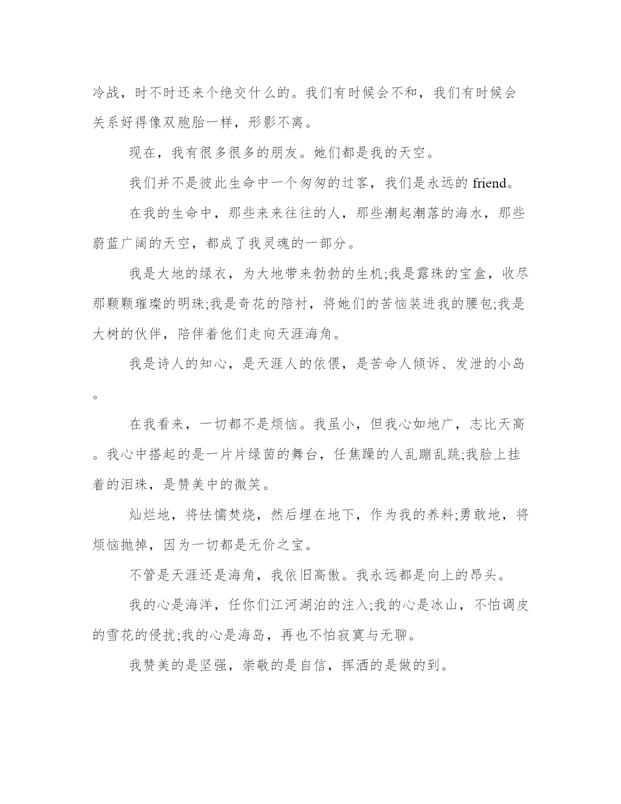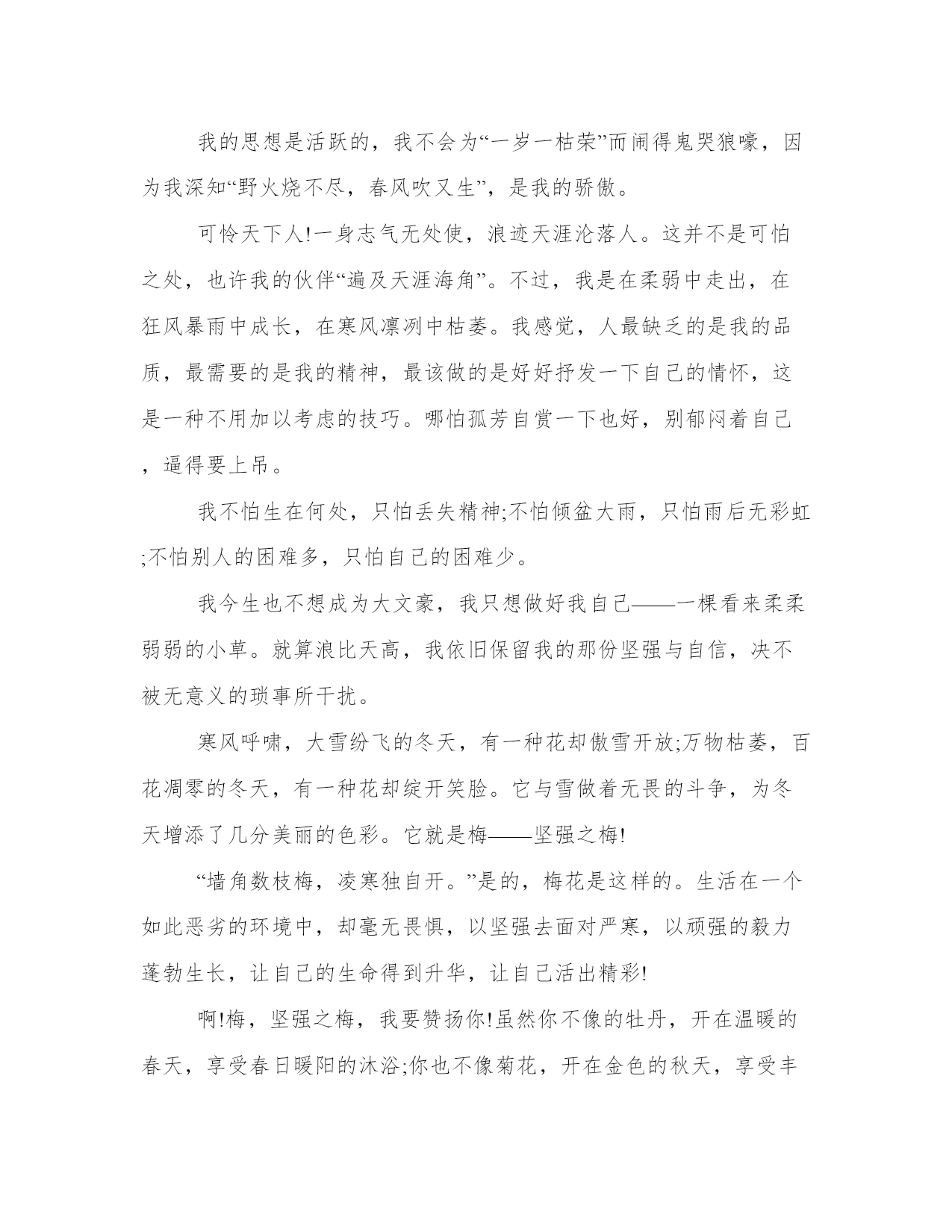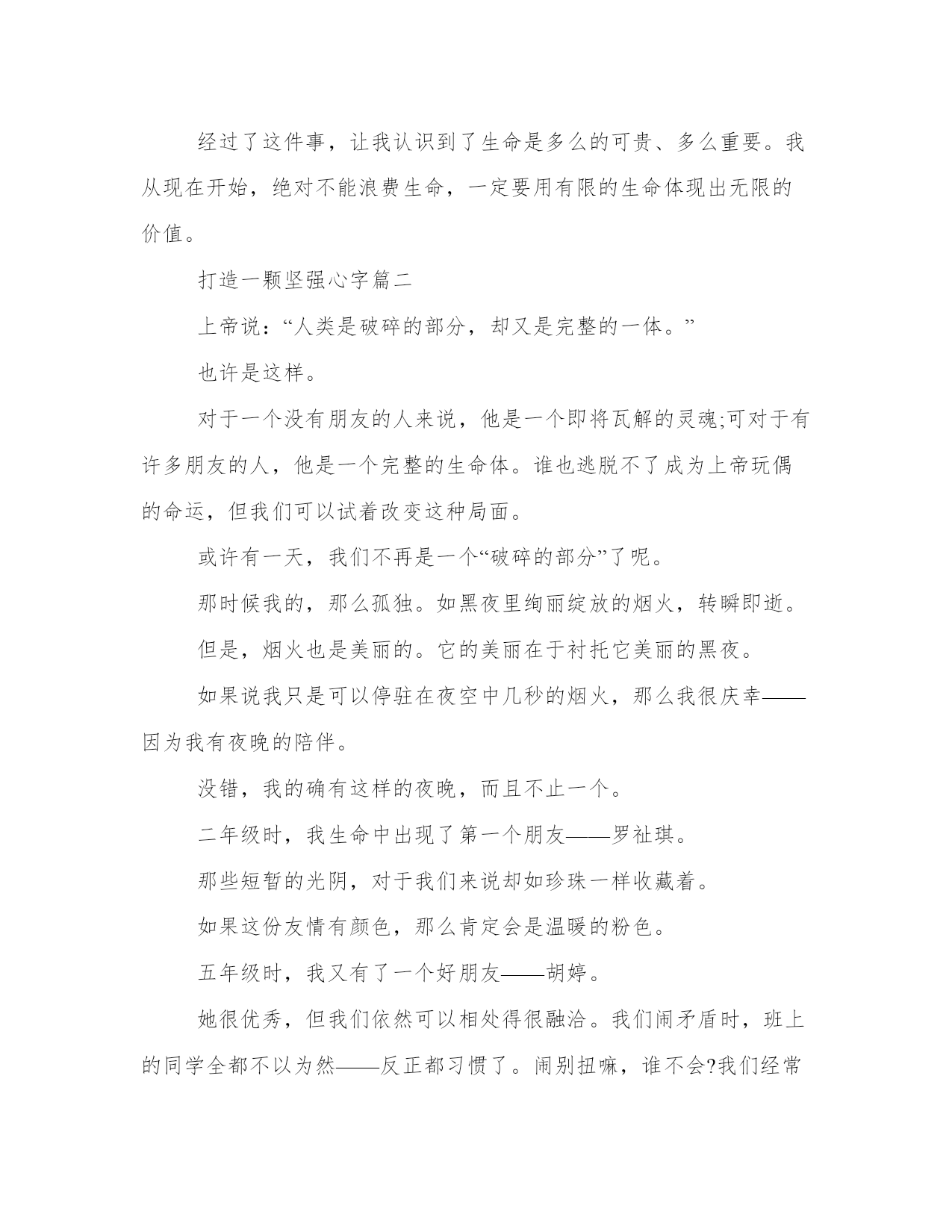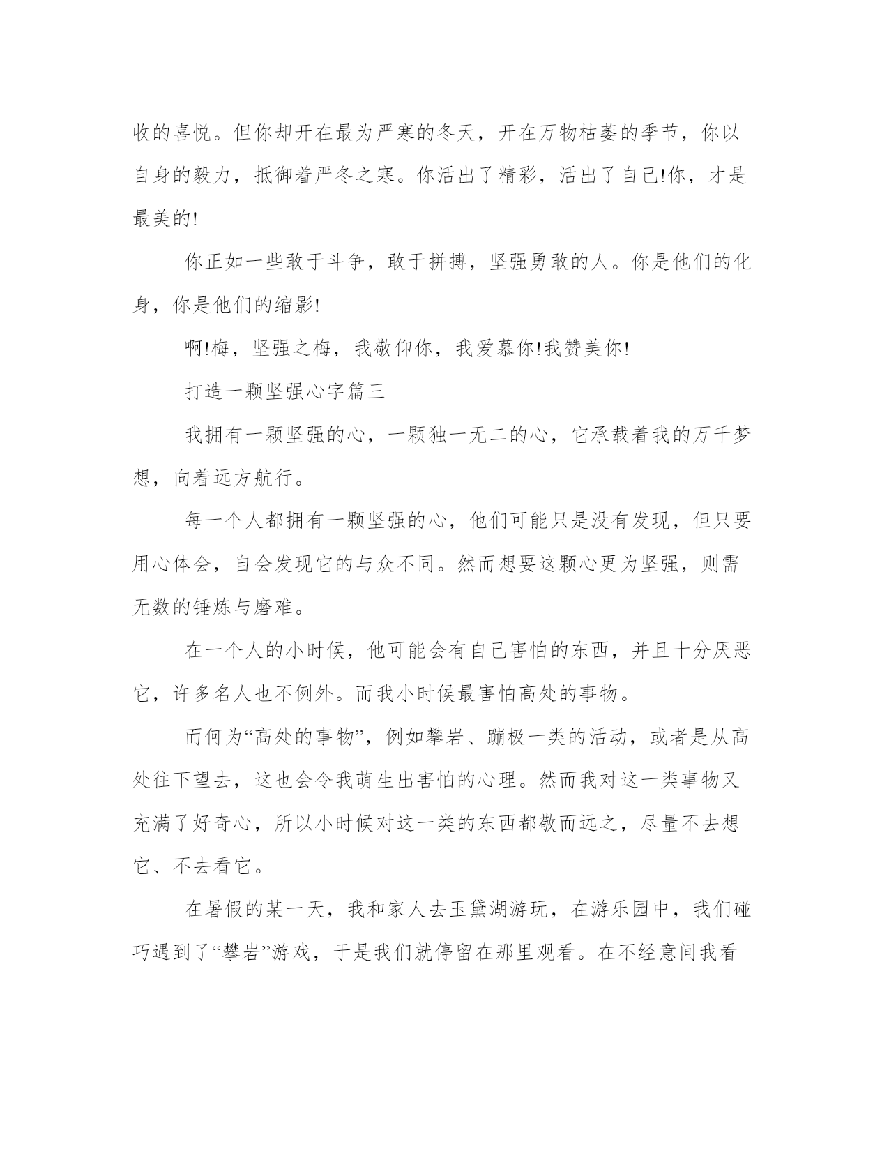 2023年打造一颗坚强心作文字(7篇)范文为教学中作为模范的文章,也常常用来指写作的模板。常常用于文秘写作的参考,也可以作为演讲材料编写前的参考。相信许多人会觉得范文很难写?下面是小编帮大家整理的优质范文,仅供参考,大家一起来看看吧。打造一颗坚强心字篇一自从经过三年级的事件,我终于明白了生命的意义是什么,是——坚强!那天,我的同学张芷欣过生日,她让我去参加她的生日会,我答应了。当天下午,我拿了20元钱买了两只小鸡,她一只、我一只,我们玩得很开心。过了一天,我去看小鸡,我的小鸡在家里,没事儿,可是她的小鸡,不知道是被老鼠还是猫咬了,左半身是好的,右半身翅膀下被咬伤了,都快看到骨头了,鲜血直往下滴,我跟张芷欣说我先把它带回家,她答应了。于是我拿起笼子抱在怀里冲回家,把它和我的小鸡放在一起,它无精打采的眼睛闭着,身体直发抖,可我也没办法,只好给它一点食物和水让它吃。第二天,起床后直奔阳台,发现受伤的小鸡还没死,这让我即放心、又震惊,我震惊是因为它受了那么重的伤,却仍不放弃这个世界,拼命和死神做斗争。经过了这件事,让我认识到了生命是多么的可贵、多么重要。我从现在开始,绝对不能浪费生命,一定要用有限的生命体现出无限的价值。打造一颗坚强心字篇二上帝说:“人类是破碎的部分,却又是完整的一体。”也许是这样。对于一个没有朋友的人来说,他是一个即将瓦解的灵魂;可对于有许多朋友的人,他是一个完整的生命体。谁也逃脱不了成为上帝玩偶的命运,但我们可以试着改变这种局面。或许有一天,我们不再是一个“破碎的部分”了呢。那时候我的,那么孤独。如黑夜里绚丽绽放的烟火,转瞬即逝。但是,烟火也是美丽的。它的美丽在于衬托它美丽的黑夜。如果说我只是可以停驻在夜空中几秒的烟火,那么我很庆幸——因为我有夜晚的陪伴。没错,我的确有这样的夜晚,而且不止一个。二年级时,我生命中出现了第一个朋友——罗祉琪。那些短暂的光阴,对于我们来说却如珍珠一样收藏着。如果这份友情有颜色,那么肯定会是温暖的粉色。五年级时,我又有了一个好朋友——胡婷。她很优秀,但我们依然可以相处得很融洽。我们闹矛盾时,班上的同学全都不以为然——反正都习惯了。闹别扭嘛,谁不会?我们经常冷战,时不时还来个绝交什么的。我们有时候会不和,我们有时候会关系好得像双胞胎一样,形影不离。现在,我有很多很多的朋友。她们都是我的天空。我们并不是彼此生命中一个匆匆的过客,我们是永远的friend。在我的生命中,那些来来往往的人,那些潮起潮落的海水,那些蔚蓝广阔的天空,都成了我灵魂的一部分。我是大地的绿衣,为大地带来勃勃的生机;我是露珠的宝盒,收尽那颗颗璀璨的明珠;我是奇花的陪衬,将她们的苦恼装进我的腰包;我是大树的伙伴,陪伴着他们走向天涯海角。我是诗人的知心,是天涯人的依偎,是苦命人倾诉、发泄的小岛。在我看来,一切都不是烦恼。我虽小,但我心如地广,志比天高。我心中搭起的是一片片绿茵的舞台,任焦躁的人乱蹦乱跳;我脸上挂着的泪珠,是赞美中的微笑。灿烂地,将怯懦焚烧,然后埋在地下,作为我的养料;勇敢地,将烦恼抛掉,因为一切都是无价之宝。不管是天涯还是海角,我依旧高傲。我永远都是向上的昂头。我的心是海洋,任你们江河湖泊的注入;我的心是冰山,不怕调皮的雪花的侵扰;我的心是海岛,再也不怕寂寞与无聊。我赞美的是坚强,崇敬的是自信,挥洒的是做的到。我的思想是活跃的,我不会为“一岁一枯荣”而闹得鬼哭狼嚎,因为我深知“野火烧不尽,春风吹又生”,是我的骄傲。可怜天下人!一身志气无处使,浪迹天涯沦落人。这并不是可怕之处,也许我的伙伴“遍及天涯海角”。不过,我是在柔弱中走出,在狂风暴雨中成长,在寒风凛冽中枯萎。我感觉,人最缺乏的是我的品质,最需要的是我的精神,最该做的是好好抒发一下自己的情怀,这是一种不用加以考虑的技巧。哪怕孤芳自赏一下也好,别郁闷着自己,逼得要上吊。我不怕生在何处,只怕丢失精神;不怕倾盆大雨,只怕雨后无彩虹;不怕别人的困难多,只怕自己的困难少。我今生也不想成为大文豪,我只想做好我自己——一棵看来柔柔弱弱的小草。就算浪比天高,我依旧保留我的那份坚强与自信,决不被无意义的琐事所干扰。寒风呼啸,大雪纷飞的冬天,有一种花却傲雪开放;万物枯萎,百花凋零的冬天,有一种花却绽开笑脸。它与雪做着无畏的斗争,为冬天增添了几分美丽的色彩。它就是梅——坚强之梅!“墙角数枝梅,凌寒独自开。”是的,梅花是这样的。生活在一个如此恶劣的环境中,却毫无畏惧,以坚强去面对严寒,以顽强的毅力蓬勃生长,让自己的生命得到升华,让自己活出精彩!啊!梅,坚强之梅,我要赞扬你!虽然你不像的牡丹,开在温暖的春天,享受春日暖阳的沐浴;你也不像菊花,开在金色的秋天,享受丰收的喜悦。但你却开在最为严寒的冬天,开在万物枯萎的季节,你以自身的毅力,抵御着严冬之寒。你活出了精彩,活出了自己!你,才是最