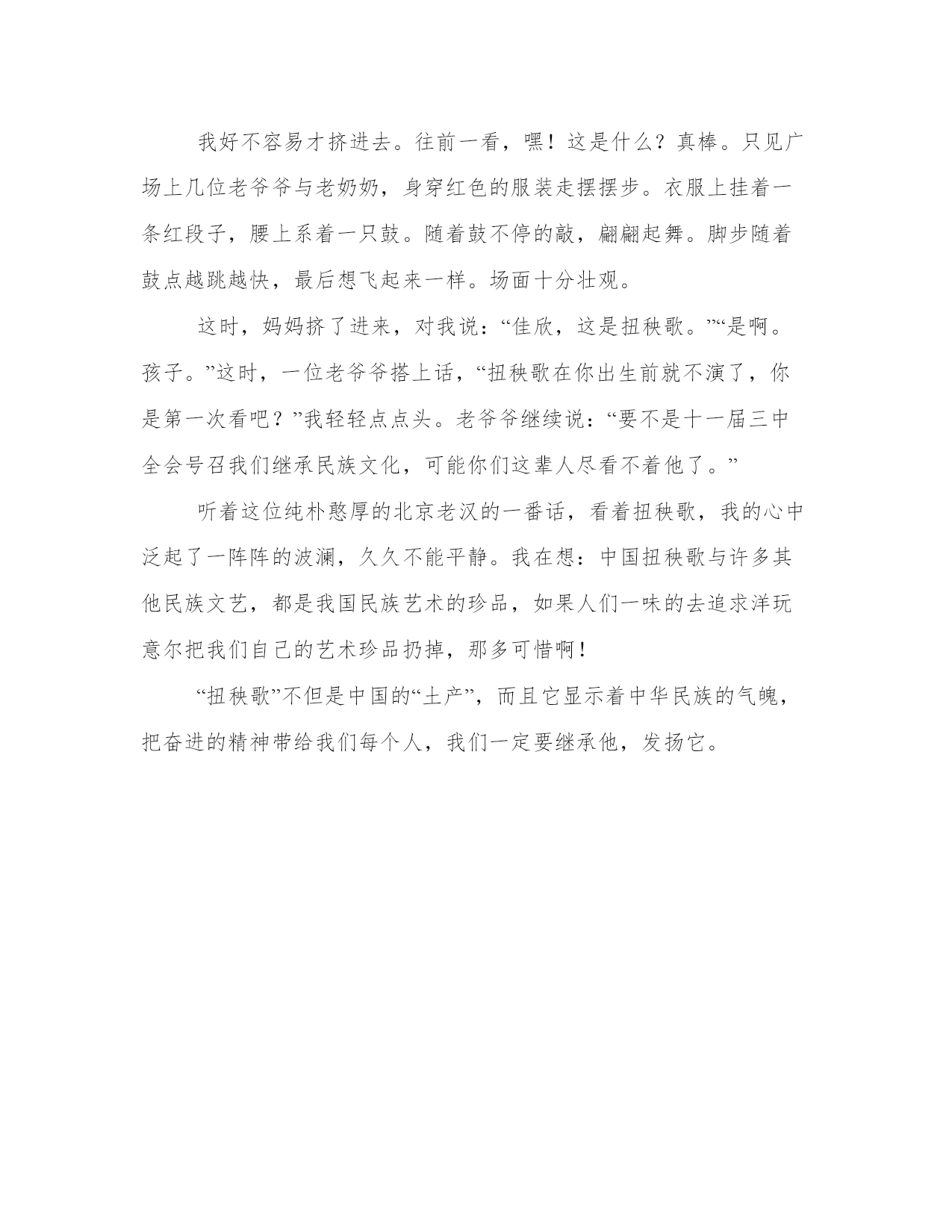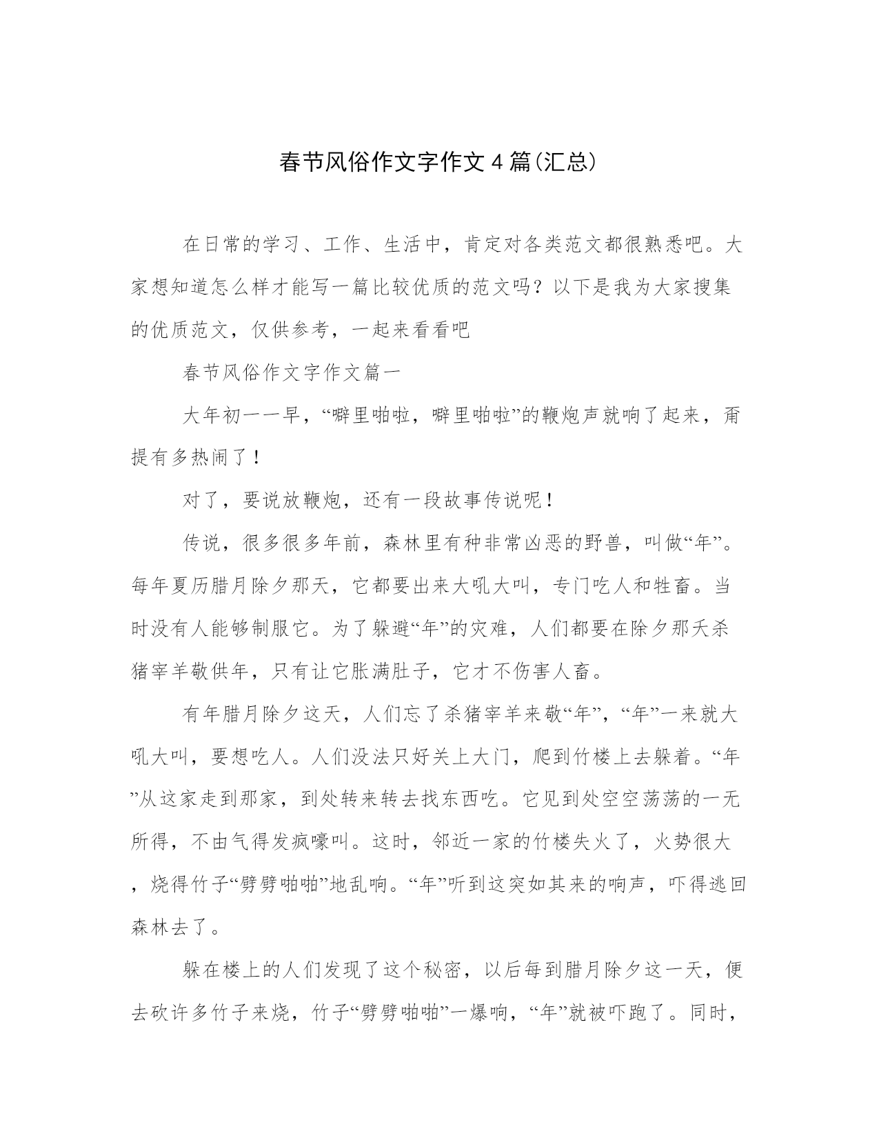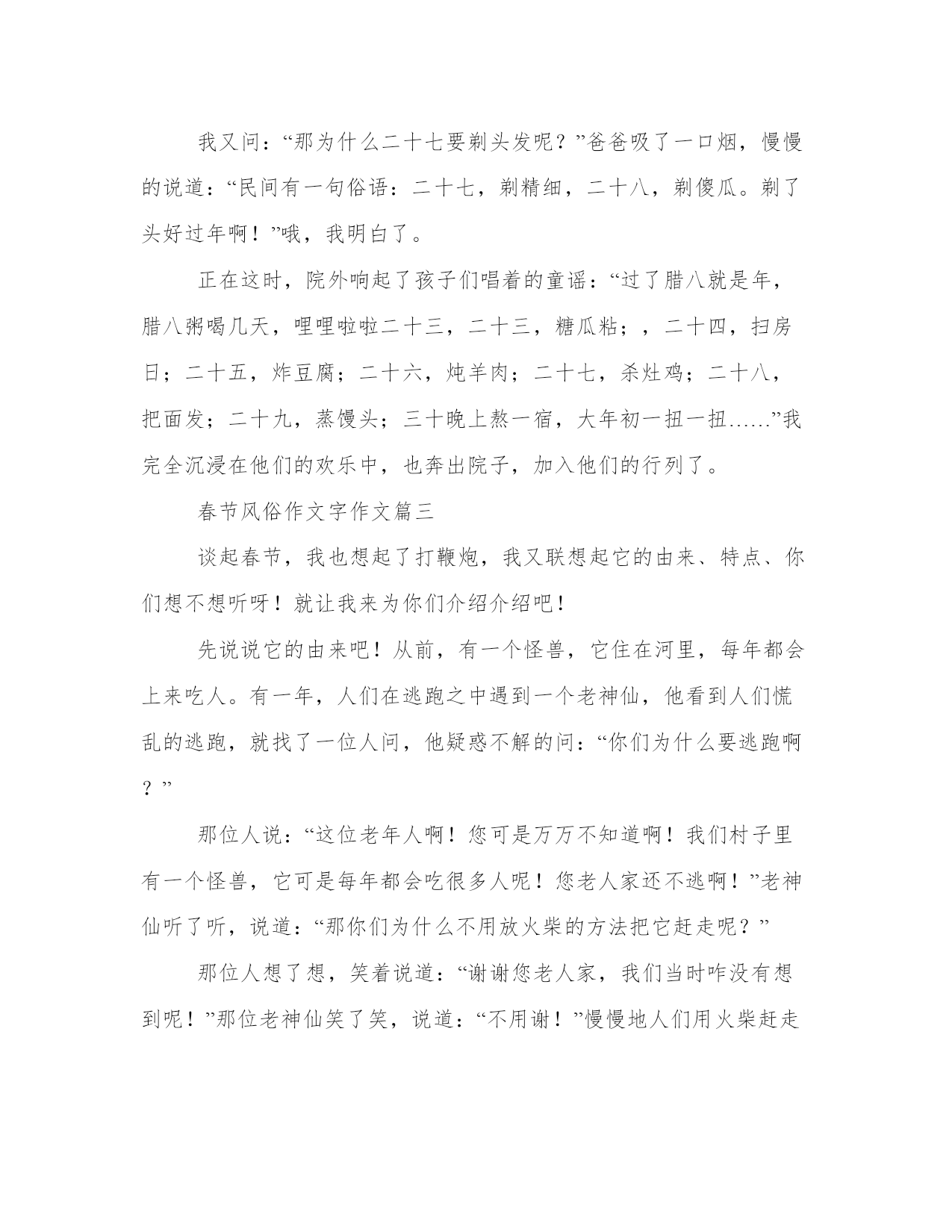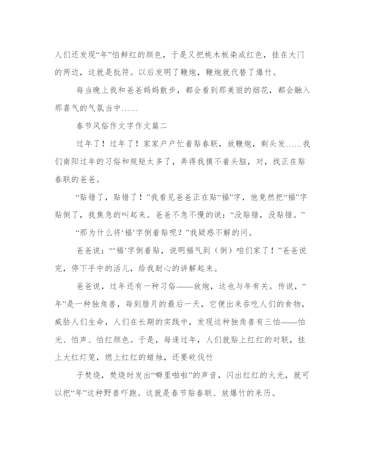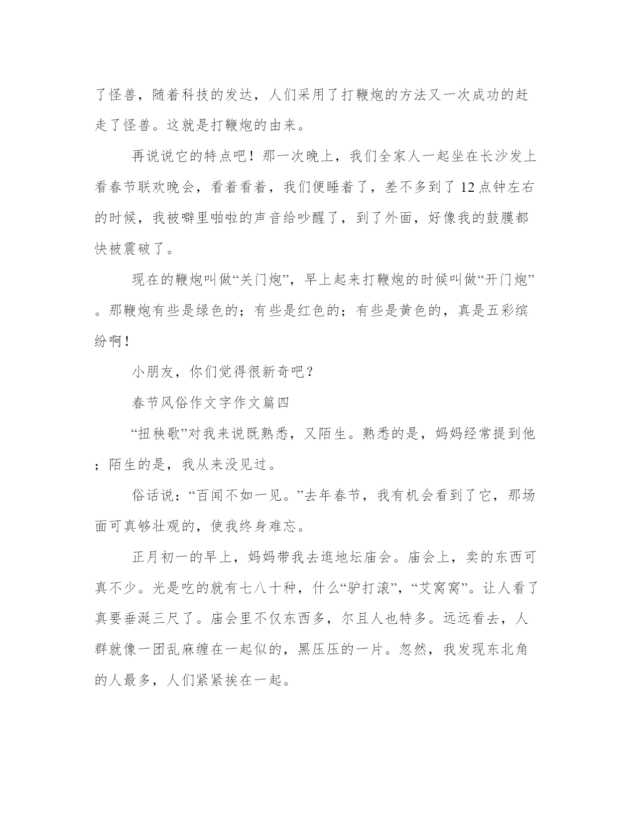 春节风俗作文字作文4篇(汇总)在日常的学习、工作、生活中,肯定对各类范文都很熟悉吧。大家想知道怎么样才能写一篇比较优质的范文吗?以下是我为大家搜集的优质范文,仅供参考,一起来看看吧春节风俗作文字作文篇一大年初一一早,“噼里啪啦,噼里啪啦”的鞭炮声就响了起来,甭提有多热闹了!对了,要说放鞭炮,还有一段故事传说呢!传说,很多很多年前,森林里有种非常凶恶的野兽,叫做“年”。每年夏历腊月除夕那天,它都要出来大吼大叫,专门吃人和牲畜。当时没有人能够制服它。为了躲避“年”的灾难,人们都要在除夕那夭杀猪宰羊敬供年,只有让它胀满肚子,它才不伤害人畜。有年腊月除夕这天,人们忘了杀猪宰羊来敬“年”,“年”一来就大吼大叫,要想吃人。人们没法只好关上大门,爬到竹楼上去躲着。“年”从这家走到那家,到处转来转去找东西吃。它见到处空空荡荡的一无所得,不由气得发疯嚎叫。这时,邻近一家的竹楼失火了,火势很大,烧得竹子“劈劈啪啪”地乱响。“年”听到这突如其来的响声,吓得逃回森林去了。躲在楼上的人们发现了这个秘密,以后每到腊月除夕这一天,便去砍许多竹子来烧,竹子“劈劈啪啪”一爆响,“年”就被吓跑了。同时,人们还发现“年”怕鲜红的颜色,于是又把桃木板染成红色,挂在大门的两边,这就是批符。以后发明了鞭炮,鞭炮就代替了爆竹。每当晚上我和爸爸妈妈散步,都会看到那美丽的烟花,都会融入那喜气的气氛当中……春节风俗作文字作文篇二过年了!过年了!家家户户忙着贴春联,放鞭炮,剃头发……我们南阳过年的习俗和规矩太多了,弄得我摸不着头脑,对,找正在贴春联的爸爸。“贴错了,贴错了!”我看见爸爸正在贴“福”字,他竟然把“福”字贴倒了,我焦急的叫起来。爸爸不急不慢的说:“没贴错,没贴错。”“那为什么将‘福’字倒着贴呢?”我疑惑不解的问。爸爸说:“‘福’字倒着贴,说明福气到(倒)咱们家了!”爸爸说完,停下手中的活儿,给我耐心的讲解起来。爸爸说,过年还有一种习俗——放炮,这也与年有关。传说,“年”是一种独角兽,每到腊月的最后一天,它便出来吞吃人们的食物,威胁人们生命,人们在长期的实践中,发现这种独角兽有三怕——怕光、怕声、怕红颜色。于是,每逢过年,人们就贴上红红的对联,挂上大红灯笼,燃上红红的蜡烛,还要砍伐竹子焚烧,焚烧时发出“噼里啪啦”的声音,闪出红红的火光,就可以把“年”这种野兽吓跑。这就是春节贴春联、放爆竹的来历。我又问:“那为什么二十七要剃头发呢?”爸爸吸了一口烟,慢慢的说道:“民间有一句俗语:二十七,剃精细,二十八,剃傻瓜。剃了头好过年啊!”哦,我明白了。正在这时,院外响起了孩子们唱着的童谣:“过了腊八就是年,腊八粥喝几天,哩哩啦啦二十三,二十三,糖瓜粘;,二十四,扫房日;二十五,炸豆腐;二十六,炖羊肉;二十七,杀灶鸡;二十八,把面发;二十九,蒸馒头;三十晚上熬一宿,大年初一扭一扭……”我完全沉浸在他们的欢乐中,也奔出院子,加入他们的行列了。春节风俗作文字作文篇三谈起春节,我也想起了打鞭炮,我又联想起它的由来﹑特点﹑你们想不想听呀!就让我来为你们介绍介绍吧!先说说它的由来吧!从前,有一个怪兽,它住在河里,每年都会上来吃人。有一年,人们在逃跑之中遇到一个老神仙,他看到人们慌乱的逃跑,就找了一位人问,他疑惑不解的问:“你们为什么要逃跑啊?”那位人说:“这位老年人啊!您可是万万不知道啊!我们村子里有一个怪兽,它可是每年都会吃很多人呢!您老人家还不逃啊!”老神仙听了听,说道:“那你们为什么不用放火柴的方法把它赶走呢?”那位人想了想,笑着说道:“谢谢您老人家,我们当时咋没有想到呢!”那位老神仙笑了笑,说道:“不用谢!”慢慢地人们用火柴赶走了怪兽,随着科技的发达,人们采用了打鞭炮的方法又一次成功的赶走了怪兽。这就是打鞭炮的由来。再说说它的特点吧!那一次晚上,我们全家人一起坐在长沙发上看春节联欢晚会,看着看着,我们便睡着了,差不多到了12点钟左右的时候,我被噼里啪啦的声音给吵醒了,到了外面,好像我的鼓膜都快被震破了。现在的鞭炮叫做“关门炮”,早上起来打鞭炮的时候叫做“开门炮”。那鞭炮有些是绿色的;有些是红色的;有些是黄色的,真是五彩缤纷啊!小朋友,你们觉得很新奇吧?春节风俗作文字作文篇四“扭秧歌”对我来说既熟悉,又陌生。熟悉的是,妈妈经常提到他;陌生的是,我从来没见过。俗话说:“百闻不如一见。”去年春节,我有机会看到了它,那场面可真够壮观的,使我终身难忘。正月初一的早上,妈妈带我去逛地坛庙会。庙会上,卖的东西可真不少。光是吃的就有七八十种,什么“驴打滚”,“艾窝窝”。让人看了真要垂涎三尺了。庙会里不仅东西多,尔且人也特多。远远看去,人群就像一团乱麻缠在一起似的,黑压压的一片。忽然,我发现东北角的人最多,人们紧紧挨在一起。我好不容易才挤进去。往前一看,嘿!这是什么?真棒。只见广场上几位老爷爷与老奶奶,