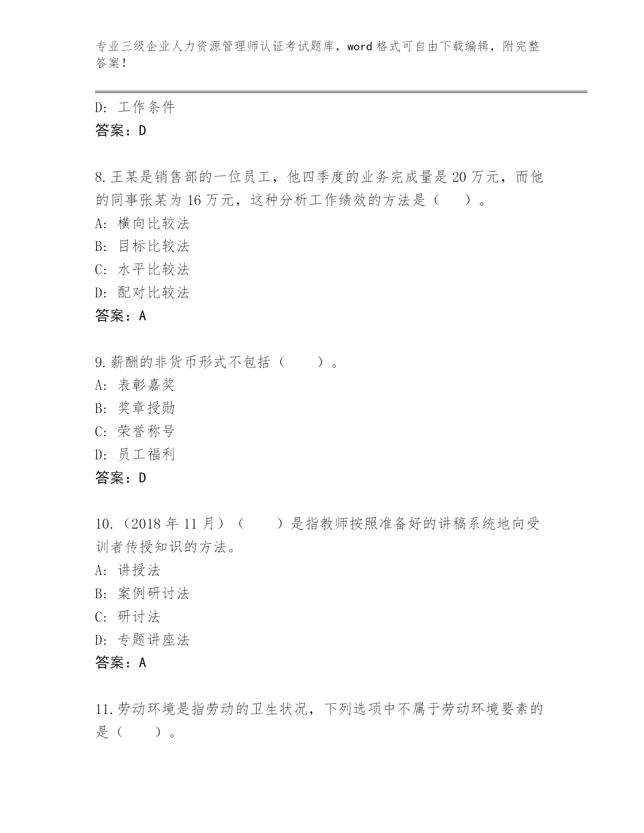 专业三级企业人力资源管理师认证考试题库,word格式可自由下载编辑,附完整答案!浙江省莲都区2024三级企业人力资源管理师认证考试题库大全带答案(预热题)第I部分单选题(100题)1.申请鉴定的单位或者个人对设区的市级劳动能力鉴定委员会作出的鉴定结论不服的,可以在收到该鉴定结论之日起()日内向省、自治区、直辖市劳动能力鉴定委员会提出再次鉴定申请。A:10B:15C:20D:30答案:B2.正式通报的优点不包括()。A:信息不易受到歪曲B:利于双向沟通C:信息传递准确D:沟通内容容易保存答案:B3.根据生产任务、员工的劳动效率和出勤率来计算定员人数的方法属于()。A:按岗位定员B:按机器设备定员C:按比例定员D:按劳动效率定员答案:D4.下列选项中属于影响员工个人薪酬水平的因素是()。A:产品的需求弹性B:工会的力量C:劳动绩效D:企业的薪酬策略答案:C5.社会学习理论的创始人是()A:爱德华·桑代克B:班杜拉C:英文泽尔D:弗洛姆答案:B6.(2017年5月)劳动标准按照适用层次划分,不包括()。A:国家标准B:企业标准C:基础标准D:行业标准答案:C7.(2015年11月)影响企业整体薪酬水平的主要因素,不包括()。A:劳动力市场供求关系B:薪酬策略C:地区、行业工资水平D:工作条件答案:D8.王某是销售部的一位员工,他四季度的业务完成量是20万元,而他的同事张某为16万元,这种分析工作绩效的方法是()。A:横向比较法B:目标比较法C:水平比较法D:配对比较法答案:A9.薪酬的非货币形式不包括()。A:表彰嘉奖B:奖章授勋C:荣誉称号D:员工福利答案:D10.(2018年11月)()是指教师按照准备好的讲稿系统地向受训者传授知识的方法。A:讲授法B:案例研讨法C:研讨法D:专题讲座法答案:A11.劳动环境是指劳动的卫生状况,下列选项中不属于劳动环境要素的是()。A:噪声危害程度B:劳动姿势C:高温危害程度D:粉尘危害程度答案:B12.()统计汇总产品实耗工时的方法,适用于生产稳定、大批大量生产的企业采用。A:按照重点产品、重点零部件和主要工序B:按产品零件逐道工序C:按产品投入批量D:按照生产单位和生产者个人答案:D13.()可以有效地测量人的某种潜能,从而预测他在某职业领域中成功和适应的可能性,或判断哪项工作适合他。A:人格测试B:情境模拟测试C:能力测试D:兴趣测试答案:C14.某商厦的服务人员应保持愉悦的笑容和友善的态度,他们的绩效考评最好采用()考评。A:行为主导型B:效果主导型C:思维主导型D:品质主导型答案:A15.劳动功能障碍分为()伤残等级。最重的为一级。A:5B:20C:10D:15答案:C16.(2016年5月)()是用一系列的形容性或描述性的语句,说明员工的各种具体的工作行为和表现,并将这些语句分别列入量表中,作为考评者评定的依据。A:加权选择量表法B:关键事件法C:行为锚定量表法D:行为观察法答案:A17.岗位安全卫生教育的内容包括遵守劳动安全卫生规范教育和()A:安全卫生知识教育B:安全操作知识教育C:提高工作效率培训D:个人卫生知识教育答案:A18.()可以是漫谈式的,面试考官与应聘者随意交谈。A:非结构化面试B:初步面试C:诊断面试D:结构化面试答案:A19.下列关于集体合同的说法,不正确的是()。A:集体合同为定期合同B:现阶段我国法定集体合同的附件主要是工资协议C项,集体合同均为定期集体合同,我国劳动立法规定集体合同的期限为1~3年。企业订立集体合同可以在1~3年中确定适应本企业的集体合同期限。C:口头形式的集体合同不具有法律效力D:我国立法规定集体合同的期限为3~5年答案:D20.人力资源的一般特点不包括()A:客观规律性B:主观能动性C:时间性D:消费性答案:A21.()是指确认组织或员工作绩效的不足和差距,查明产生的原因,制定并实施有针对性的改进策略,不断提高企业员工竞争优势的过程。A:绩效评估B:绩效访谈C:绩效发展D:绩效改进答案:D22.工作岗位评价标准不包括()标准。A:指标的分级B:评价的流程C:评价的方法D:指标的量化答案:B23.假如公司领导近来对你的工作有所不满,你想和领导谈谈,但你又没有机会接触领导,你会()。A:等待见面的机会B:给领导写封信说明C:就按照这样做下去D:电话与领导沟通答案:B24.关于不同的学习风格,下列描述错误的是()。A:反思型学习喜欢从实际工作与生活中学习,讨厌单向的灌输式教学B:理论型学习不喜欢和别人一起学习,喜欢自己专注工作C:主动型学习以经验与感觉为基础D:应用型学习以理论和实践相结合为基础答案:A25.下列关于关键事件法的叙述,不正确的是()。A:该方法要考虑行为的情景B:关键事件对事不对人C:关键事件是指有效和无效的工作行为D:该方法