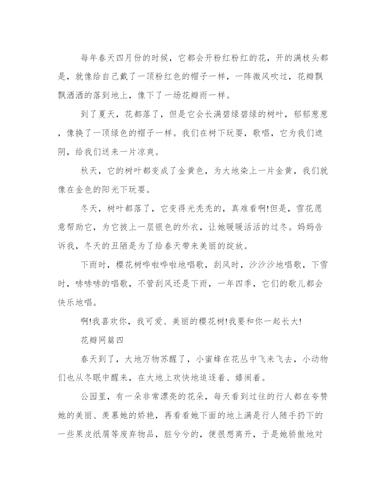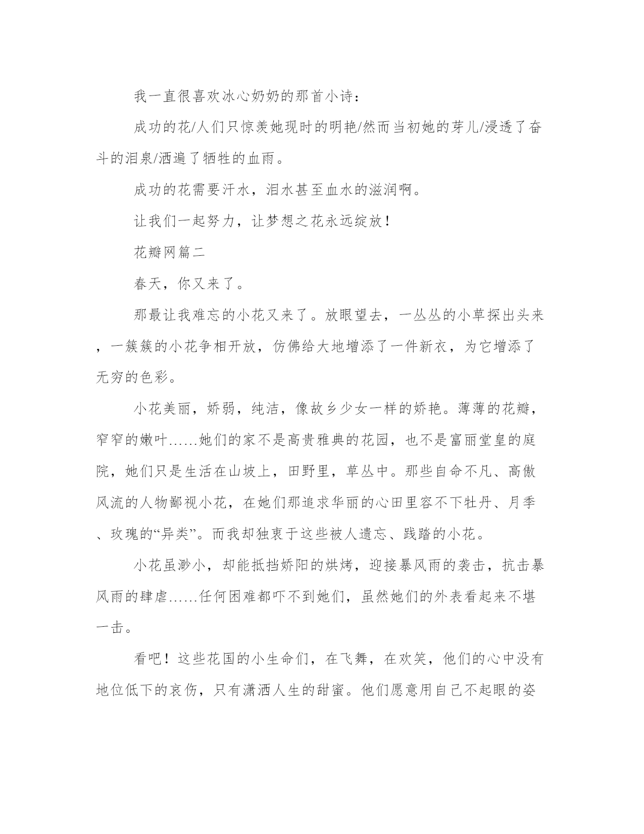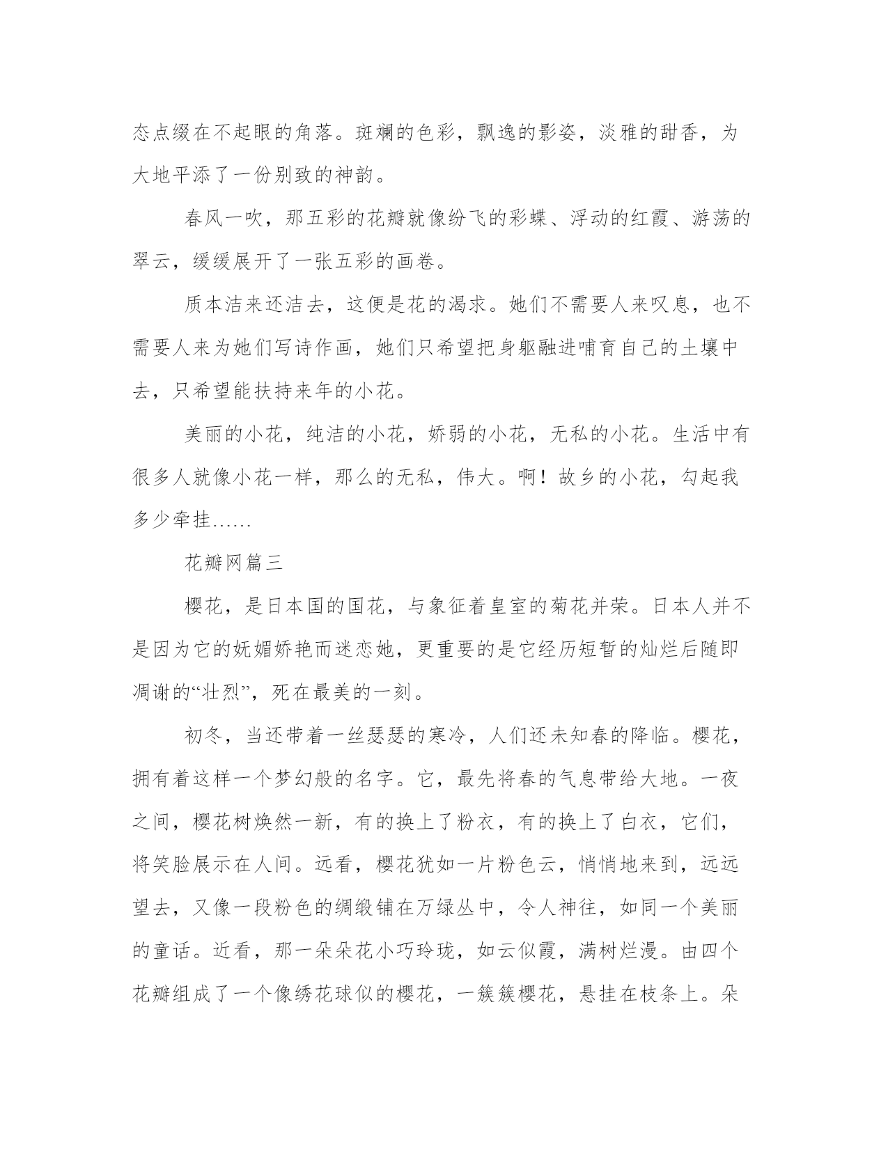 最新花瓣网通用(九篇)每个人都曾试图在平淡的学习、工作和生活中写一篇文章。写作是培养人的观察、联想、想象、思维和记忆的重要手段。范文怎么写才能发挥它最大的作用呢?这里我整理了一些优秀的范文,希望对大家有所帮助,下面我们就来了解一下吧。花瓣网篇一众所周知,邓亚萍从小就酷爱打乒乓球,梦想着有朝一日能够在世界赛场上大显身手。可是因为身材矮小手脚粗短,她被拒于国家队的大门之外。她并没有因此而气馁,反而把失败转化为动力,苦练球技。最终,持之以恒的努力催开了梦想的花蕾——她如愿以偿地走上了世界冠军的领奖台。在她的运动生涯中,总共夺得了18枚世界冠军奖牌。她出色的成就,不仅为自己带来了巨大的荣耀,也改变了世界乒坛只在高个子中选拔运动员的传统观念。在刘翔之前,谁能想到黄种人有一天会登上110米栏的冠军领奖台呢?2004年8月27日在雅典奥运会男子110米栏决赛上,刘翔也12秒91的优异成绩平了由英国选手科林。杰克逊创造的记录夺得了金牌,创造了中国人在短道项目上的奇迹和神话!经过废寝忘食的训练,他又在国际田联超级大奖赛中以12秒88的成绩夺得金牌,并打破了男子110米栏世界记录!当初幼小的花芽,经过汗水的浸泡已经散发出满世界的芬芳了!我一直很喜欢冰心奶奶的那首小诗:成功的花/人们只惊羡她现时的明艳/然而当初她的芽儿/浸透了奋斗的泪泉/洒遍了牺牲的血雨。成功的花需要汗水,泪水甚至血水的滋润啊。让我们一起努力,让梦想之花永远绽放!花瓣网篇二春天,你又来了。那最让我难忘的小花又来了。放眼望去,一丛丛的小草探出头来,一簇簇的小花争相开放,仿佛给大地增添了一件新衣,为它增添了无穷的色彩。小花美丽,娇弱,纯洁,像故乡少女一样的娇艳。薄薄的花瓣,窄窄的嫩叶……她们的家不是高贵雅典的花园,也不是富丽堂皇的庭院,她们只是生活在山坡上,田野里,草丛中。那些自命不凡、高傲风流的人物鄙视小花,在她们那追求华丽的心田里容不下牡丹、月季、玫瑰的“异类”。而我却独衷于这些被人遗忘、践踏的小花。小花虽渺小,却能抵挡娇阳的烘烤,迎接暴风雨的袭击,抗击暴风雨的肆虐……任何困难都吓不到她们,虽然她们的外表看起来不堪一击。看吧!这些花国的小生命们,在飞舞,在欢笑,他们的心中没有地位低下的哀伤,只有潇洒人生的甜蜜。他们愿意用自己不起眼的姿态点缀在不起眼的角落。斑斓的色彩,飘逸的影姿,淡雅的甜香,为大地平添了一份别致的神韵。春风一吹,那五彩的花瓣就像纷飞的彩蝶、浮动的红霞、游荡的翠云,缓缓展开了一张五彩的画卷。质本洁来还洁去,这便是花的渴求。她们不需要人来叹息,也不需要人来为她们写诗作画,她们只希望把身躯融进哺育自己的土壤中去,只希望能扶持来年的小花。美丽的小花,纯洁的小花,娇弱的小花,无私的小花。生活中有很多人就像小花一样,那么的无私,伟大。啊!故乡的小花,勾起我多少牵挂……花瓣网篇三樱花,是日本国的国花,与象征着皇室的菊花并荣。日本人并不是因为它的妩媚娇艳而迷恋她,更重要的是它经历短暂的灿烂后随即凋谢的“壮烈”,死在最美的一刻。初冬,当还带着一丝瑟瑟的寒冷,人们还未知春的降临。樱花,拥有着这样一个梦幻般的名字。它,最先将春的气息带给大地。一夜之间,樱花树焕然一新,有的换上了粉衣,有的换上了白衣,它们,将笑脸展示在人间。远看,樱花犹如一片粉色云,悄悄地来到,远远望去,又像一段粉色的绸缎铺在万绿丛中,令人神往,如同一个美丽的童话。近看,那一朵朵花小巧玲珑,如云似霞,满树烂漫。由四个花瓣组成了一个像绣花球似的樱花,一簇簇樱花,悬挂在枝条上。朵朵花都有一个个绿绿的花蕊,它们极细,看起来似乎非常精致,淡淡的幽香扑鼻而来,让人心旷神怡。最漂亮的是枝垂樱,枝垂樱又称瀑布樱花,如粉红瀑布一样悬挂下来,构成了一幅大自然的画。让人沉醉,让人着迷,真是“舟行碧波上,人在画中游”。傍晚的红霞染红天际,小朋友还在公园里双手捧着樱花,将樱花撒上天去,为天空铺上一件粉色的丝绸,他们还在树下观赏着迷人的樱花雨。我迷恋你,樱花!春天来了,天气渐渐变得暖和起来了,小树也渐渐的开花长大了,我最熟悉也最喜欢的就是我们院子里面的樱花树了!我从4岁就认识它了。它每天看着我和我的好朋友一起玩耍,看着我骑自行车,陪伴着我慢慢长大。刚才,妈妈带我去看它,我用我的小手轻轻地摸了摸它的身体,它的皮肤已经很粗燥了,就像一位满脸沧桑的老人一样。它到底有多少岁了呢?我也不知道。它首先有一个树干,然后在树干上分了三个杈,之后又在这三个树杈上分了很多的小树杈,给自己形成了一个天然的大帽子。最后,在每个枝头上都长上了三个饱满的小花苞,就像马上要玻壳的鸡蛋一样,等着春姑娘为它送去一片温暖,它马上就绽放了。每年春天四月份的时候,它都会开粉红粉红的花,开的满枝头都是,就像给自己戴了一顶粉红色的帽子一样,一阵微风吹过,花瓣飘飘洒洒的落到地上,像下了一场花瓣