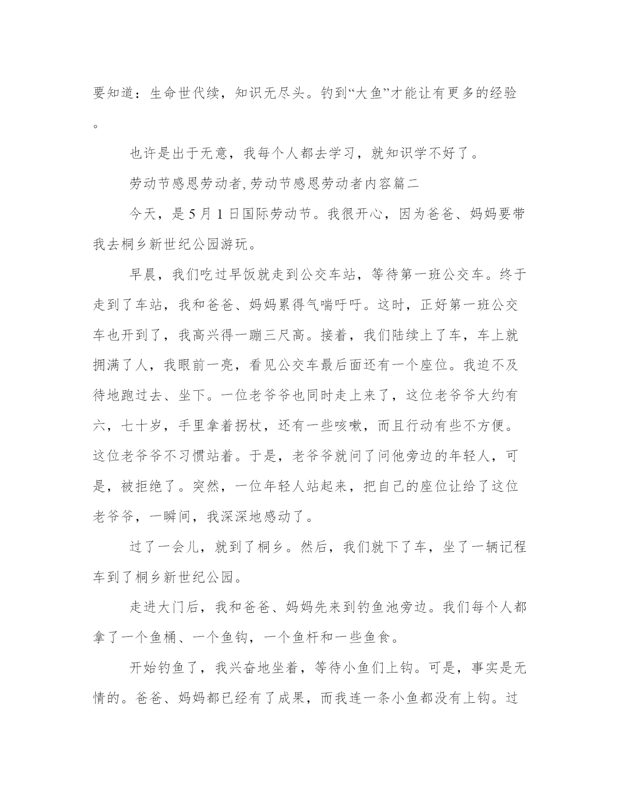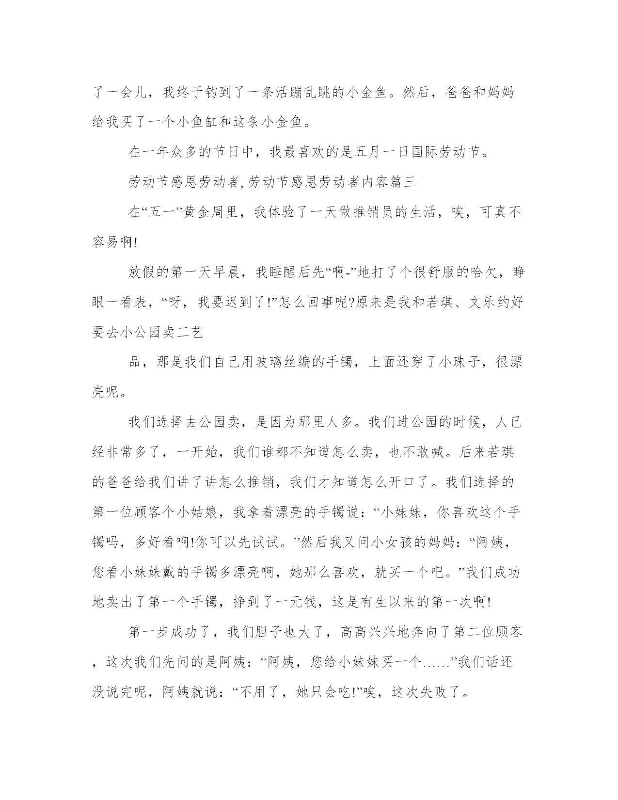 2023年劳动节感恩劳动者,劳动节感恩劳动者内容3篇(大全)在日常的学习、工作、生活中,肯定对各类范文都很熟悉吧。相信许多人会觉得范文很难写?下面是小编为大家收集的优秀范文,供大家参考借鉴,希望可以帮助到有需要的朋友。劳动节感恩劳动者,劳动节感恩劳动者内容篇一广场旁有绿树成荫,鲜花遍地的小山坡,上坡下有许多人在钓鱼。我满怀好奇地走近一位拿着长长的鱼竿的老伯伯,只见他身旁的桶里装着十几条大大小小的鱼儿,它们在装满水的桶里游来游去,还不时溅出水花。只见老伯伯提起了鱼竿,拿起一团鱼饵,轻轻地取出一,在手里揉成小团挂在鱼钩上,然后用力一抛,鱼线飞得远远的,就老伯伯静静地等着。过了一会儿,旁边的钓鱼的人们都钓到了不同的鱼儿,有鲫鱼、猫鱼、窜条鱼,还有许多不知名的小鱼也纷纷上钩,可这位老伯伯这里还鱼,我看着有点不耐烦了。突然鱼竿抖动起来,那是充满希望的抖动,也许是一条馋嘴的大鱼被钩住了,也许是一条倒霉的小鱼在拼命挣扎。鱼儿被提了,啊!这条鱼有语文书那么大,我为老伯伯而高兴,可老伯伯却不感到惊喜钓鱼。我沉思起来:钓鱼和学习一样吗?学习要有耐心,看见别人而不耐烦就放弃,到底才是胜利;学习要去追求,学到一点点知识就自满,要知道:生命世代续,知识无尽头。钓到“大鱼”才能让有更多的经验。也许是出于无意,我每个人都去学习,就知识学不好了。劳动节感恩劳动者,劳动节感恩劳动者内容篇二今天,是5月1日国际劳动节。我很开心,因为爸爸、妈妈要带我去桐乡新世纪公园游玩。早晨,我们吃过早饭就走到公交车站,等待第一班公交车。终于走到了车站,我和爸爸、妈妈累得气喘吁吁。这时,正好第一班公交车也开到了,我高兴得一蹦三尺高。接着,我们陆续上了车,车上就拥满了人,我眼前一亮,看见公交车最后面还有一个座位。我迫不及待地跑过去、坐下。一位老爷爷也同时走上来了,这位老爷爷大约有六,七十岁,手里拿着拐杖,还有一些咳嗽,而且行动有些不方便。这位老爷爷不习惯站着。于是,老爷爷就问了问他旁边的年轻人,可是,被拒绝了。突然,一位年轻人站起来,把自己的座位让给了这位老爷爷,一瞬间,我深深地感动了。过了一会儿,就到了桐乡。然后,我们就下了车,坐了一辆记程车到了桐乡新世纪公园。走进大门后,我和爸爸、妈妈先来到钓鱼池旁边。我们每个人都拿了一个鱼桶、一个鱼钩,一个鱼杆和一些鱼食。开始钓鱼了,我兴奋地坐着,等待小鱼们上钩。可是,事实是无情的。爸爸、妈妈都已经有了成果,而我连一条小鱼都没有上钩。过了一会儿,我终于钓到了一条活蹦乱跳的小金鱼。然后,爸爸和妈妈给我买了一个小鱼缸和这条小金鱼。在一年众多的节日中,我最喜欢的是五月一日国际劳动节。劳动节感恩劳动者,劳动节感恩劳动者内容篇三在“五一”黄金周里,我体验了一天做推销员的生活,唉,可真不容易啊!放假的第一天早晨,我睡醒后先“啊-”地打了个很舒服的哈欠,睁眼一看表,“呀,我要迟到了!”怎么回事呢?原来是我和若琪、文乐约好要去小公园卖工艺品,那是我们自己用玻璃丝编的手镯,上面还穿了小珠子,很漂亮呢。我们选择去公园卖,是因为那里人多。我们进公园的时候,人已经非常多了,一开始,我们谁都不知道怎么卖,也不敢喊。后来若琪的爸爸给我们讲了讲怎么推销,我们才知道怎么开口了。我们选择的第一位顾客个小姑娘,我拿着漂亮的手镯说:“小妹妹,你喜欢这个手镯吗,多好看啊!你可以先试试。”然后我又问小女孩的妈妈:“阿姨,您看小妹妹戴的手镯多漂亮啊,她那么喜欢,就买一个吧。”我们成功地卖出了第一个手镯,挣到了一元钱,这是有生以来的第一次啊!第一步成功了,我们胆子也大了,高高兴兴地奔向了第二位顾客,这次我们先问的是阿姨:“阿姨,您给小妹妹买一个……”我们话还没说完呢,阿姨就说:“不用了,她只会吃!”唉,这次失败了。通过一天的卖手镯活动,我感到挣钱真不容易。以后我不能再浪费妈妈辛辛苦苦挣来的工资了,我还要好好地孝敬妈妈。