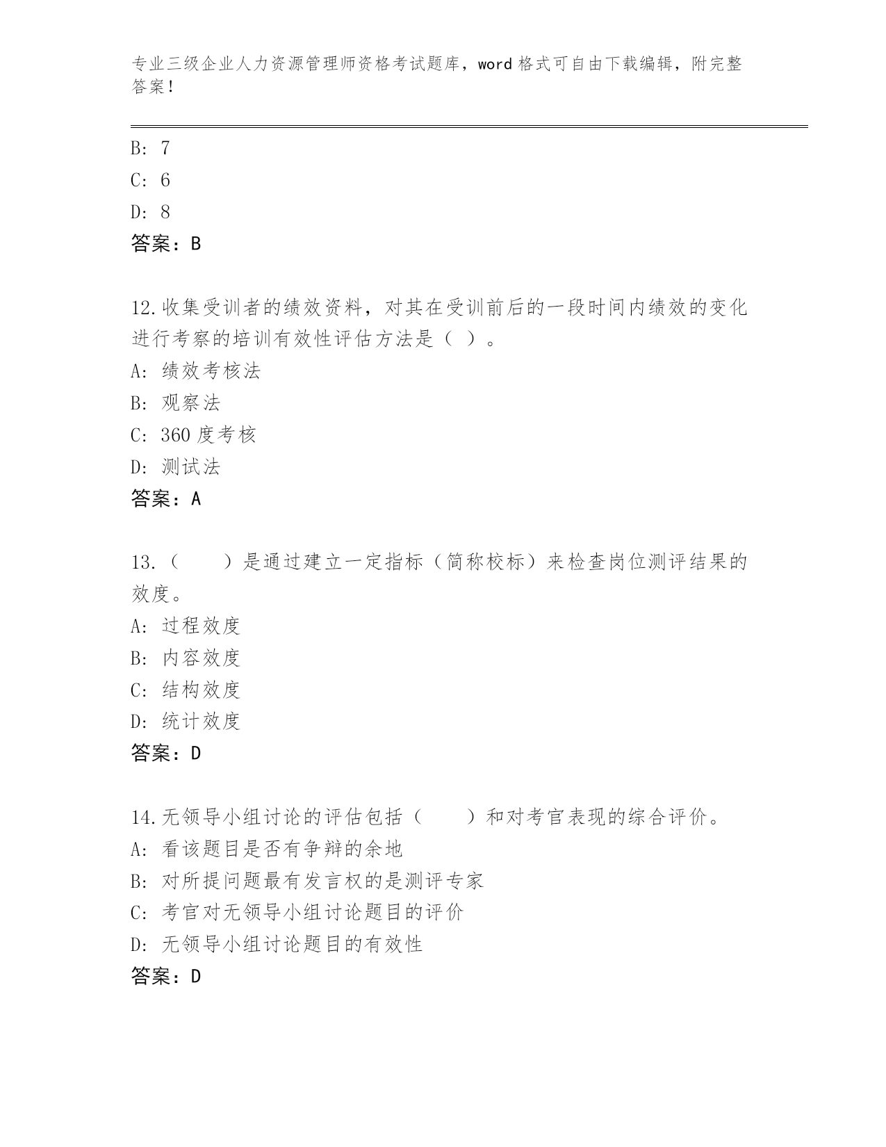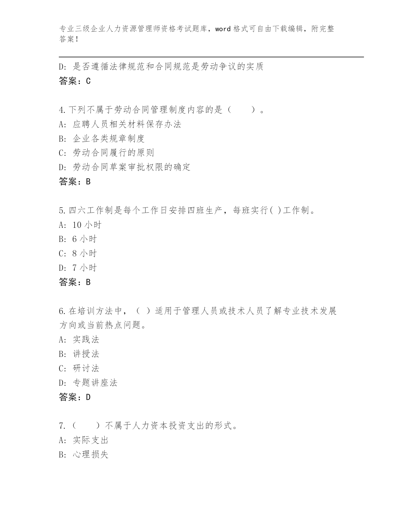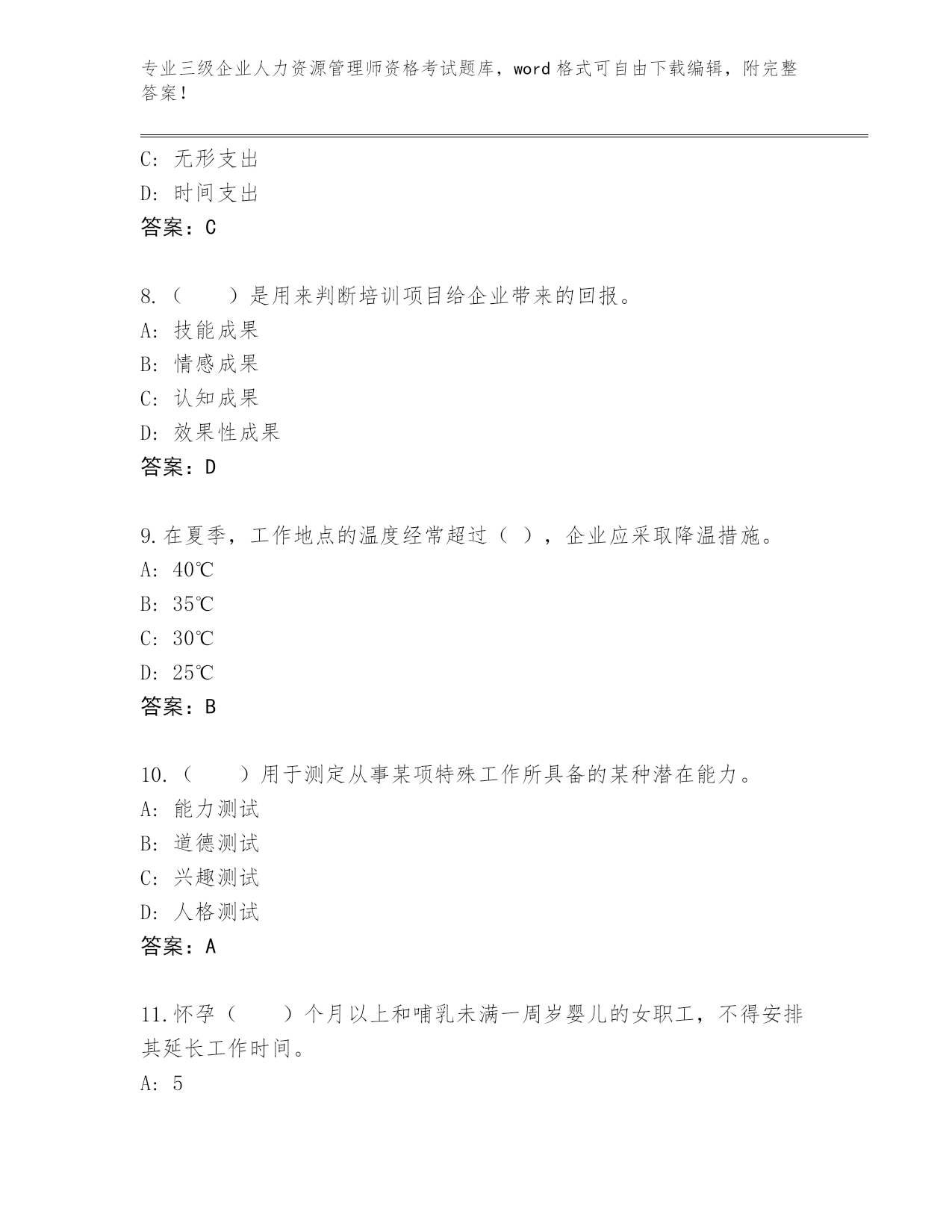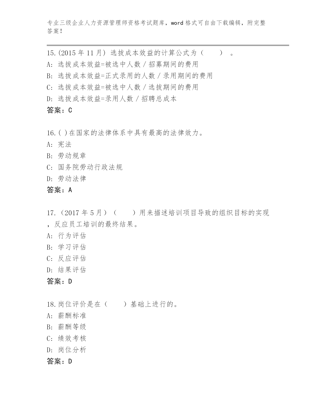 专业三级企业人力资源管理师资格考试题库,word格式可自由下载编辑,附完整答案!广西壮族自治区环江毛南族自治县2023-2024年三级企业人力资源管理师资格考试及参考答案(能力提升)第I部分单选题(100题)1.素养即教养,努力提高员工的素养,养成良好的作业习惯,严格遵守行为规范,而不需要别人督促。不需要领导检查。这是()活动的核心。A:3SB:5SC:4SD:6S答案:B2.同一种测试方法对同一组应聘者在两个不同时间进行测试,其测试结果的一致性称为()A:稳定系数B:外在一致性系数C:内在一致性系数D:等值系数答案:A3.以下关于劳动争议的说法正确的是()。A:不存在劳动关系的劳动者可能成为劳动争议的当事人B:只有存在劳动关系的情况下才会发生利益争议C:劳动争议产生的直接原因是是否遵循法律规范和合同规范D:是否遵循法律规范和合同规范是劳动争议的实质答案:C4.下列不属于劳动合同管理制度内容的是()。A:应聘人员相关材料保存办法B:企业各类规章制度C:劳动合同履行的原则D:劳动合同草案审批权限的确定答案:B5.四六工作制是每个工作日安排四班生产,每班实行()工作制。A:10小时B:6小时C:8小时D:7小时答案:B6.在培训方法中,()适用于管理人员或技术人员了解专业技术发展方向或当前热点问题。A:实践法B:讲授法C:研讨法D:专题讲座法答案:D7.()不属于人力资本投资支出的形式。A:实际支出B:心理损失C:无形支出D:时间支出答案:C8.()是用来判断培训项目给企业带来的回报。A:技能成果B:情感成果C:认知成果D:效果性成果答案:D9.在夏季,工作地点的温度经常超过(),企业应采取降温措施。A:40℃B:35℃C:30℃D:25℃答案:B10.()用于测定从事某项特殊工作所具备的某种潜在能力。A:能力测试B:道德测试C:兴趣测试D:人格测试答案:A11.怀孕()个月以上和哺乳未满一周岁婴儿的女职工,不得安排其延长工作时间。A:5B:7C:6D:8答案:B12.收集受训者的绩效资料,对其在受训前后的一段时间内绩效的变化进行考察的培训有效性评估方法是()。A:绩效考核法B:观察法C:360度考核D:测试法答案:A13.()是通过建立一定指标(简称校标)来检查岗位测评结果的效度。A:过程效度B:内容效度C:结构效度D:统计效度答案:D14.无领导小组讨论的评估包括()和对考官表现的综合评价。A:看该题目是否有争辩的余地B:对所提问题最有发言权的是测评专家C:考官对无领导小组讨论题目的评价D:无领导小组讨论题目的有效性答案:D15.(2015年11月)选拔成本效益的计算公式为()。A:选拔成本效益=被选中人数/招募期间的费用B:选拔成本效益=正式录用的人数/录用期间的费用C:选拔成本效益=被选中人数/选拔期间的费用D:选拔成本效益=录用人数/招聘总成本答案:C16.()在国家的法律体系中具有最高的法律效力。A:宪法B:劳动规章C:国务院劳动行政法规D:劳动法律答案:A17.(2017年5月)()用来描述培训项目导致的组织目标的实现,反应员工培训的最终结果。A:行为评估B:学习评估C:反应评估D:结果评估答案:D18.岗位评价是在()基础上进行的。A:薪酬标准B:薪酬等级C:绩效考核D:岗位分析答案:D19.企业微观薪酬水平即企业员工个体的()。A:薪酬总量B:薪酬额度C:薪酬等级D:薪酬标准答案:B20.下列对劳动定员标准概述部分表述错误的是()A:便于读者了解标准产生的背景B:由一般要素和技术要素构成C:便于读者识别标准D:能帮助读者了解标准的主要技术内容答案:B21.()为企业岗位归级列等奠定了基础。A:岗位评价B:绩效考核C:培训开发D:岗位分析答案:A22.()是以实现劳动关系双方的沟通。但不一定达成协议为目的的企业民主管理制度。A:职工代表大会B:平等协商制度C:个人参与D:组织参与答案:B23.下列选项中不属于劳动强度要素的是()。A:劳动姿势B:工时利用率C:技术知识要求D:工作轮班制答案:C24.(2017年5月)以掌握技能为目的的实践性培训方法,不包括()A:特别任务法B:教练法C:研讨法D:工作轮换法答案:C25.柯克帕特里克四级评估模式的四级评估是()。A:反应评估B:学习评估C:结果评估D:行为评估答案:C26.(2018年5月)()适合在企业中高层管理者培训需求分析中应用。A:前瞻性培训需求评估模型B:三维培训需求分析模型C:组织培训需求分析模型D:培训需求循环评估模型答案:B27.心理运动机能测试的内容主要包括()。A:体质素质B:想象能力C:思维能力D:身体能力答案:D28.国家法律法规规定的工作时间长度称之为制度工作时间。对其具体内容和形式的规定简称为()。A:工时制度B:作业制度C:劳动时间制度