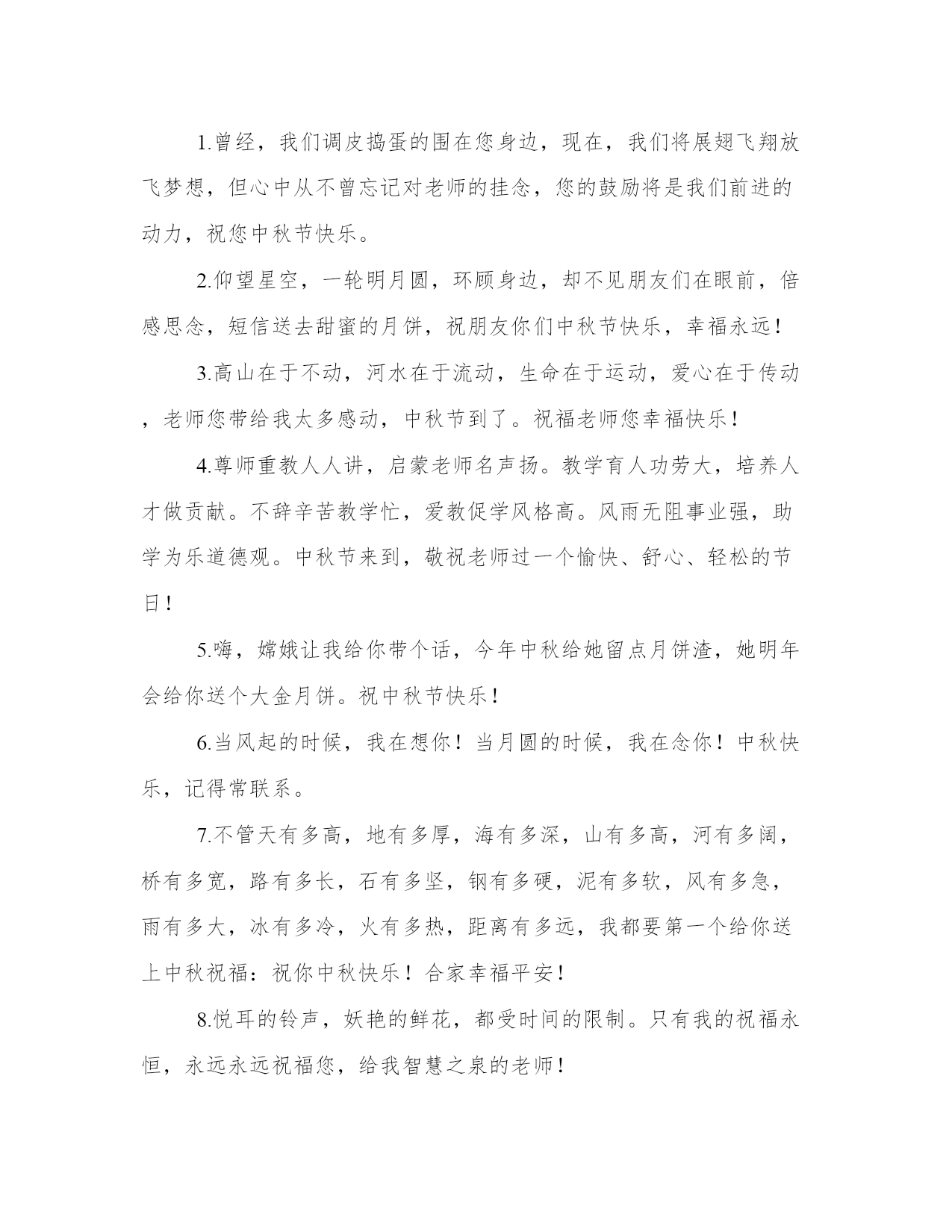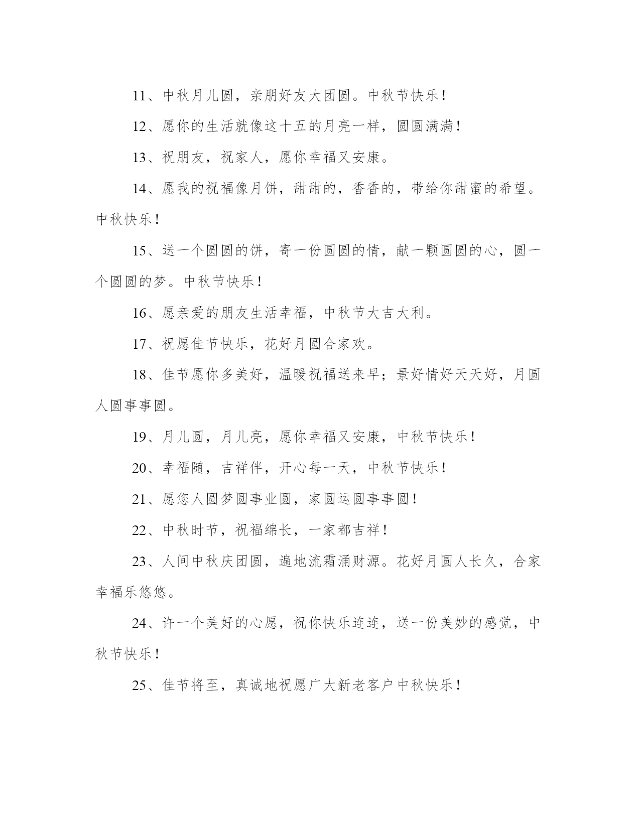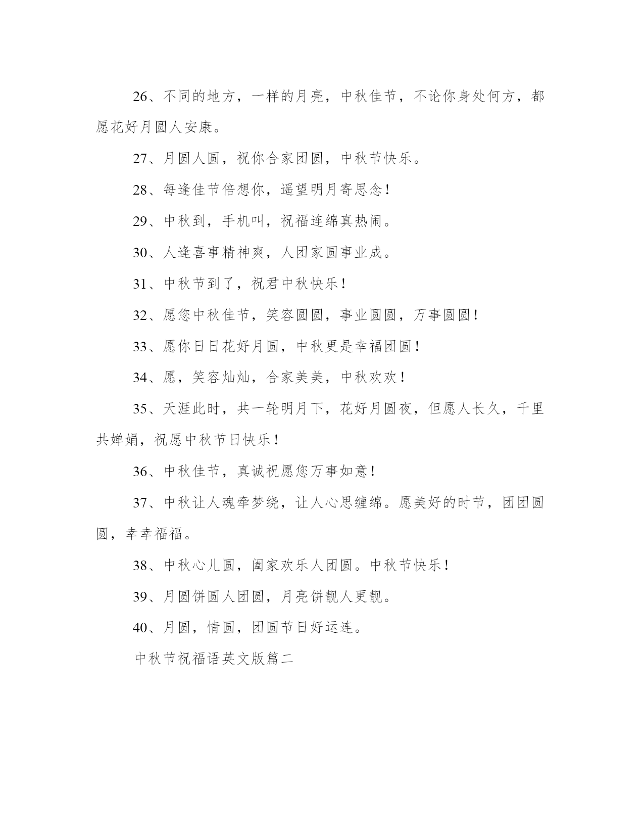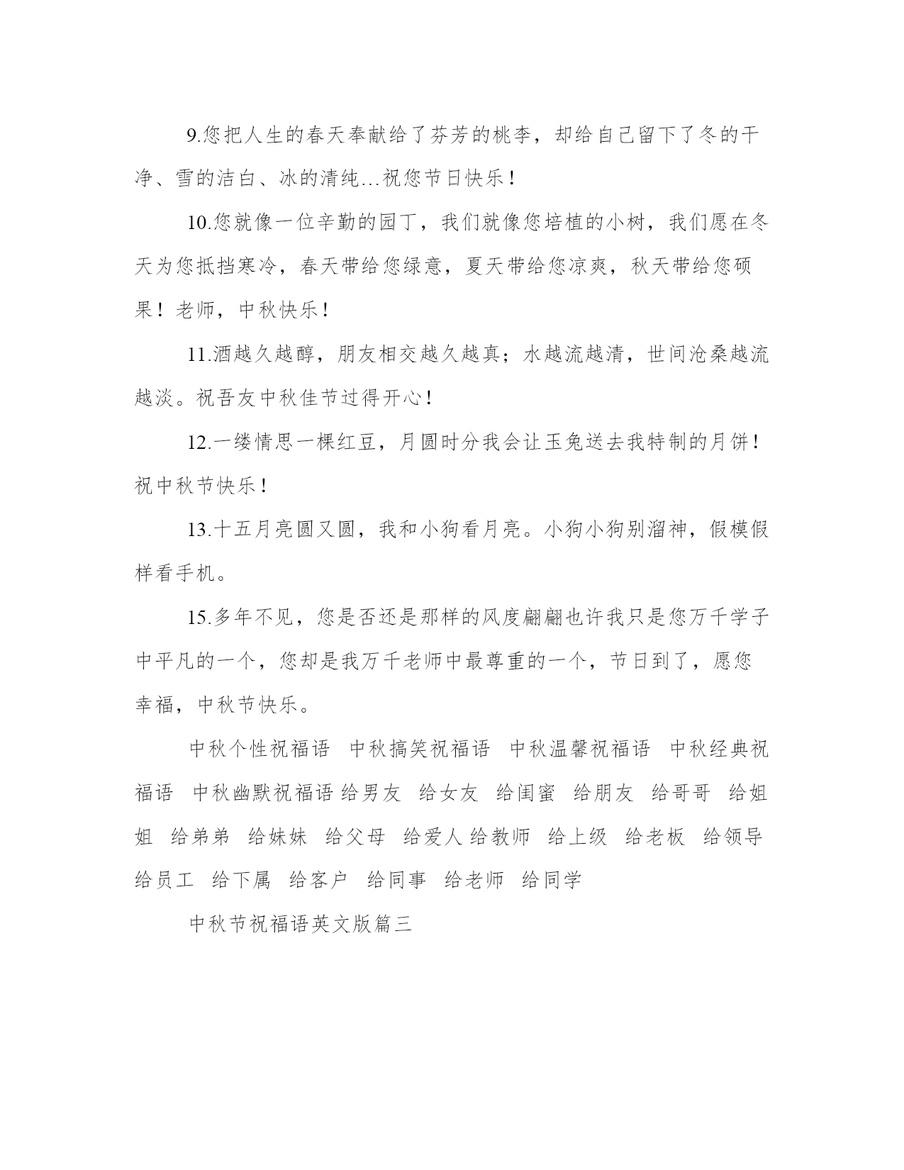 最新中秋节祝福语英文版(14篇)在日常学习、工作或生活中,大家总少不了接触作文或者范文吧,通过文章可以把我们那些零零散散的思想,聚集在一块。那么我们该如何写一篇较为完美的范文呢?以下是小编为大家收集的优秀范文,欢迎大家分享阅读。中秋节祝福语英文版篇一2、希望从今天起月亮永远是圆的,你永远是快乐的!祝你中秋节愉快!3、中秋到,月亮圆圆,圆出全家欢乐聚一堂。4、中秋来临花好月圆,祝福披星戴月送身边。5、中秋月明寄遥思,字字句句写真情。6、中秋节到了,让那圆圆的月儿捎去我几缕的思念,愿你每一年的中秋节,都能与家人共团圆。7、八月中秋月儿圆,合家团聚乐无边。8、愿你:花容月貌笑容甜,风花雪月爱圆满,众星捧月总耀眼。9、许一个美好的心愿,祝你万事圆圆,传一份短短的祝福,祝你微笑甜甜。中秋节快乐!10、八月十五月儿圆,在这月圆人不圆的时候,远方的我衷心祝你万事如意。11、中秋月儿圆,亲朋好友大团圆。中秋节快乐!12、愿你的生活就像这十五的月亮一样,圆圆满满!13、祝朋友,祝家人,愿你幸福又安康。14、愿我的祝福像月饼,甜甜的,香香的,带给你甜蜜的希望。中秋快乐!15、送一个圆圆的饼,寄一份圆圆的情,献一颗圆圆的心,圆一个圆圆的梦。中秋节快乐!16、愿亲爱的朋友生活幸福,中秋节大吉大利。17、祝愿佳节快乐,花好月圆合家欢。18、佳节愿你多美好,温暖祝福送来早;景好情好天天好,月圆人圆事事圆。19、月儿圆,月儿亮,愿你幸福又安康,中秋节快乐!20、幸福随,吉祥伴,开心每一天,中秋节快乐!21、愿您人圆梦圆事业圆,家圆运圆事事圆!22、中秋时节,祝福绵长,一家都吉祥!23、人间中秋庆团圆,遍地流霜涌财源。花好月圆人长久,合家幸福乐悠悠。24、许一个美好的心愿,祝你快乐连连,送一份美妙的感觉,中秋节快乐!25、佳节将至,真诚地祝愿广大新老客户中秋快乐!26、不同的地方,一样的月亮,中秋佳节,不论你身处何方,都愿花好月圆人安康。27、月圆人圆,祝你合家团圆,中秋节快乐。28、每逢佳节倍想你,遥望明月寄思念!29、中秋到,手机叫,祝福连绵真热闹。30、人逢喜事精神爽,人团家圆事业成。31、中秋节到了,祝君中秋快乐!32、愿您中秋佳节,笑容圆圆,事业圆圆,万事圆圆!33、愿你日日花好月圆,中秋更是幸福团圆!34、愿,笑容灿灿,合家美美,中秋欢欢!35、天涯此时,共一轮明月下,花好月圆夜,但愿人长久,千里共婵娟,祝愿中秋节日快乐!36、中秋佳节,真诚祝愿您万事如意!37、中秋让人魂牵梦绕,让人心思缠绵。愿美好的时节,团团圆圆,幸幸福福。38、中秋心儿圆,阖家欢乐人团圆。中秋节快乐!39、月圆饼圆人团圆,月亮饼靓人更靓。40、月圆,情圆,团圆节日好运连。中秋节祝福语英文版篇二1.曾经,我们调皮捣蛋的围在您身边,现在,我们将展翅飞翔放飞梦想,但心中从不曾忘记对老师的挂念,您的鼓励将是我们前进的动力,祝您中秋节快乐。2.仰望星空,一轮明月圆,环顾身边,却不见朋友们在眼前,倍感思念,短信送去甜蜜的月饼,祝朋友你们中秋节快乐,幸福永远!3.高山在于不动,河水在于流动,生命在于运动,爱心在于传动,老师您带给我太多感动,中秋节到了。祝福老师您幸福快乐!4.尊师重教人人讲,启蒙老师名声扬。教学育人功劳大,培养人才做贡献。不辞辛苦教学忙,爱教促学风格高。风雨无阻事业强,助学为乐道德观。中秋节来到,敬祝老师过一个愉快、舒心、轻松的节日!5.嗨,嫦娥让我给你带个话,今年中秋给她留点月饼渣,她明年会给你送个大金月饼。祝中秋节快乐!6.当风起的时候,我在想你!当月圆的时候,我在念你!中秋快乐,记得常联系。7.不管天有多高,地有多厚,海有多深,山有多高,河有多阔,桥有多宽,路有多长,石有多坚,钢有多硬,泥有多软,风有多急,雨有多大,冰有多冷,火有多热,距离有多远,我都要第一个给你送上中秋祝福:祝你中秋快乐!合家幸福平安!8.悦耳的铃声,妖艳的鲜花,都受时间的限制。只有我的祝福永恒,永远永远祝福您,给我智慧之泉的老师!9.您把人生的春天奉献给了芬芳的桃李,却给自己留下了冬的干净、雪的洁白、冰的清纯…祝您节日快乐!10.您就像一位辛勤的园丁,我们就像您培植的小树,我们愿在冬天为您抵挡寒冷,春天带给您绿意,夏天带给您凉爽,秋天带给您硕果!老师,中秋快乐!11.酒越久越醇,朋友相交越久越真;水越流越清,世间沧桑越流越淡。祝吾友中秋佳节过得开心!12.一缕情思一棵红豆,月圆时分我会让玉兔送去我特制的月饼!祝中秋节快乐!13.十五月亮圆又圆,我和小狗看月亮。小狗小狗别溜神,假模假样看手机。15.多年不见,您是否还是那样的风度翩翩也许我只是您万千学子中平凡的一个,您却是我万千老师中最尊重的一个,节日到了,愿您幸福,中秋节快乐。中秋个性祝福语中秋搞笑祝福语中秋温馨祝福语中秋经典祝福语中秋幽默祝福语