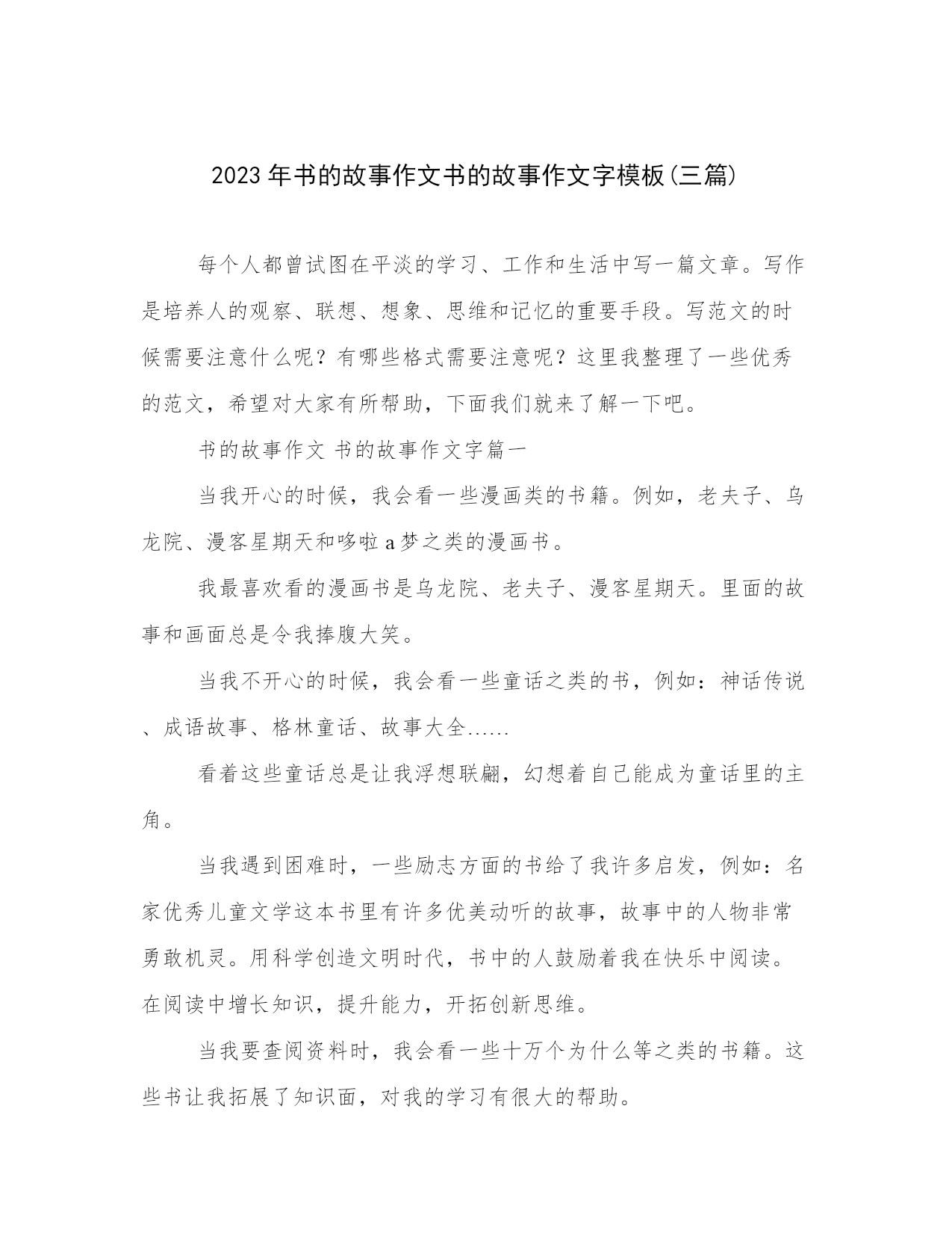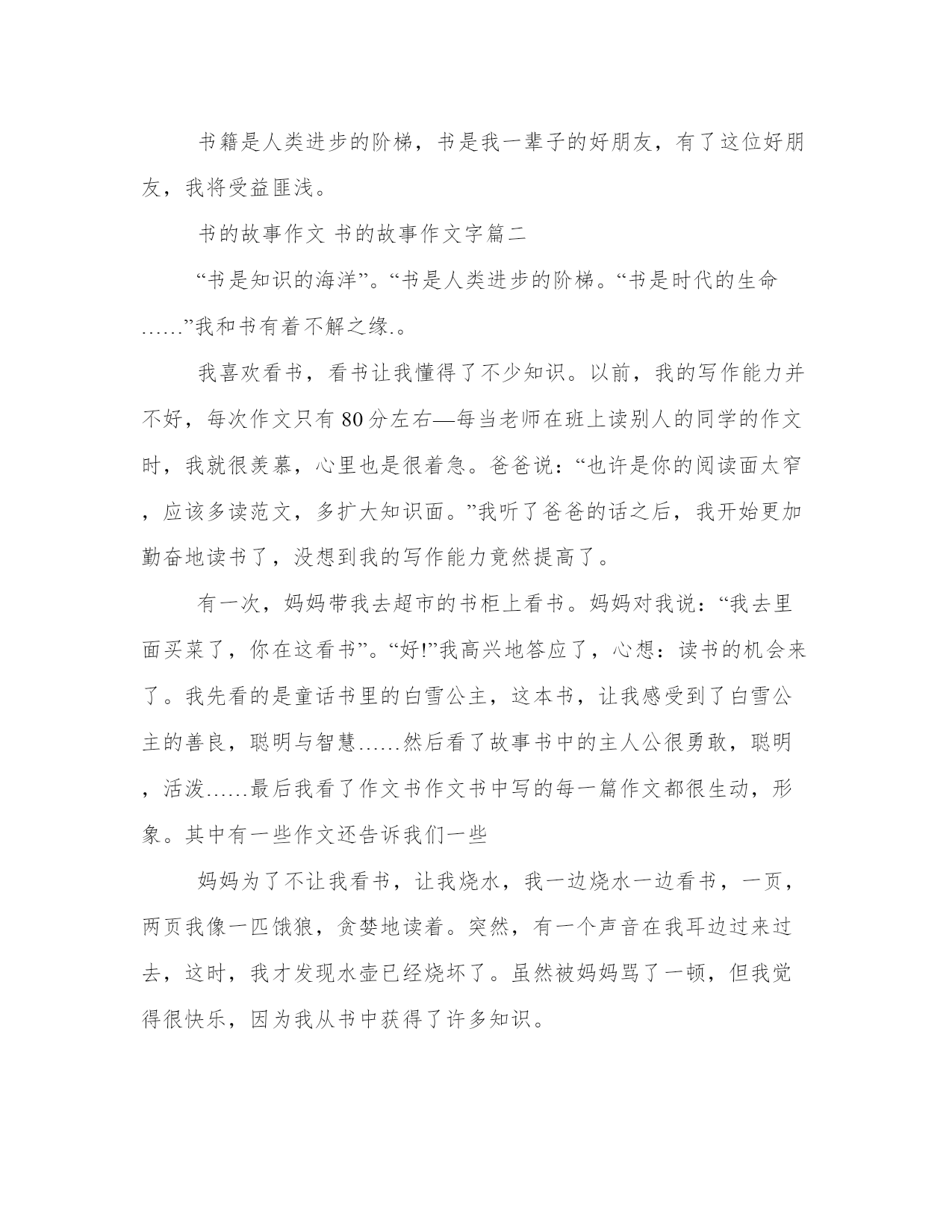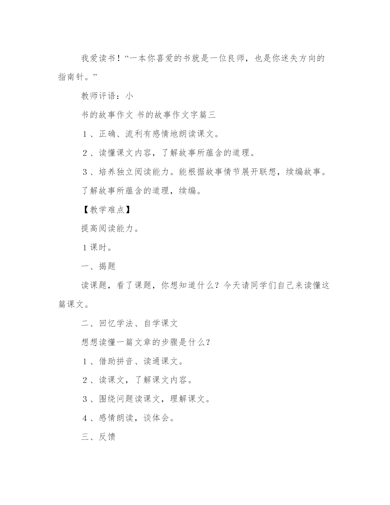 2023年书的故事作文书的故事作文字模板(三篇)每个人都曾试图在平淡的学习、工作和生活中写一篇文章。写作是培养人的观察、联想、想象、思维和记忆的重要手段。写范文的时候需要注意什么呢?有哪些格式需要注意呢?这里我整理了一些优秀的范文,希望对大家有所帮助,下面我们就来了解一下吧。书的故事作文书的故事作文字篇一当我开心的时候,我会看一些漫画类的书籍。例如,老夫子、乌龙院、漫客星期天和哆啦a梦之类的漫画书。我最喜欢看的漫画书是乌龙院、老夫子、漫客星期天。里面的故事和画面总是令我捧腹大笑。当我不开心的时候,我会看一些童话之类的书,例如:神话传说、成语故事、格林童话、故事大全……看着这些童话总是让我浮想联翩,幻想着自己能成为童话里的主角。当我遇到困难时,一些励志方面的书给了我许多启发,例如:名家优秀儿童文学这本书里有许多优美动听的故事,故事中的人物非常勇敢机灵。用科学创造文明时代,书中的人鼓励着我在快乐中阅读。在阅读中增长知识,提升能力,开拓创新思维。当我要查阅资料时,我会看一些十万个为什么等之类的书籍。这些书让我拓展了知识面,对我的学习有很大的帮助。书籍是人类进步的阶梯,书是我一辈子的好朋友,有了这位好朋友,我将受益匪浅。书的故事作文书的故事作文字篇二“书是知识的海洋”。“书是人类进步的阶梯。“书是时代的生命……”我和书有着不解之缘.。我喜欢看书,看书让我懂得了不少知识。以前,我的写作能力并不好,每次作文只有80分左右—每当老师在班上读别人的同学的作文时,我就很羡慕,心里也是很着急。爸爸说:“也许是你的阅读面太窄,应该多读范文,多扩大知识面。”我听了爸爸的话之后,我开始更加勤奋地读书了,没想到我的写作能力竟然提高了。有一次,妈妈带我去超市的书柜上看书。妈妈对我说:“我去里面买菜了,你在这看书”。“好!”我高兴地答应了,心想:读书的机会来了。我先看的是童话书里的白雪公主,这本书,让我感受到了白雪公主的善良,聪明与智慧……然后看了故事书中的主人公很勇敢,聪明,活泼……最后我看了作文书作文书中写的每一篇作文都很生动,形象。其中有一些作文还告诉我们一些妈妈为了不让我看书,让我烧水,我一边烧水一边看书,一页,两页我像一匹饿狼,贪婪地读着。突然,有一个声音在我耳边过来过去,这时,我才发现水壶已经烧坏了。虽然被妈妈骂了一顿,但我觉得很快乐,因为我从书中获得了许多知识。我爱读书!“一本你喜爱的书就是一位良师,也是你迷失方向的指南针。”教师评语:小书的故事作文书的故事作文字篇三1、正确、流利有感情地朗读课文。2、读懂课文内容,了解故事所蕴含的道理。3、培养独立阅读能力。能根据故事情节展开联想,续编故事。了解故事所蕴含的道理,续编。【教学难点】提高阅读能力。1课时。一、揭题读课题,看了课题,你想知道什么?今天请同学们自己来读懂这篇课文。二、回忆学法、自学课文想想读懂一篇文章的步骤是什么?1、借助拼音、读通课文。2、读课文,了解课文内容。3、围绕问题读课文,理解课文。4、感情朗读,谈体会。三、反馈1、同桌互读。2、抽生读,检测读音。3、说:小木偶身上发生了什么事?4、谈体会:从课文的最后一句话,你体会到了什么?(学生自由说。)四、熟悉故事情节1、分角色读课文。2、分角色表演。五、拓展训练1、展开想象续编故事。2、把编的故事写下来。六、词语盘点1、读读读记记。2、完成读读写写。3、把好词积累到词汇本。小木偶的故事启示:仅有一种本领是不行的,人应该多方面发展。建立新型的`师生关系,才能让学生拥有自主学习的权利。崔峦先生指出“教师的教,要切实转到学生的学。在教学过程中,教师只是教练、辅导员,学生是主角、主人。‘教’是为了‘学’,要服从、服务于‘学’,学生的自主学习要贯穿于教学的全过程”。在教学小木偶的故事中指导朗读小木偶头疼被误认为撒谎一部分时,孩子们强烈要求与我合作朗读,我快乐地答应了,并让孩子们自己挑选了两个同学来与我配合,我当小木偶,他们一个当小白兔,一个当老婆婆。读完,我笑盈盈地走到“小白兔”跟前:“可爱的小白兔,你读得真好,咱们来个拥抱吧!”然后又踱到“老婆婆”前,向她鞠个躬:“老婆婆,您的亲切让我感动,您的指责真让我伤心,我真的是头疼哪!”此时,教室里已炸开了窝,孩子们都绽开了灿烂的笑脸前仰后合。随后,我又赶紧调整情绪收回孩子们的思绪。我将自己变成了他们的大朋友,在愉快的气氛中完成了这篇精彩的童话。从孩子们放着亮光的眼睛中我深知他们已非常向往学习童话了。
