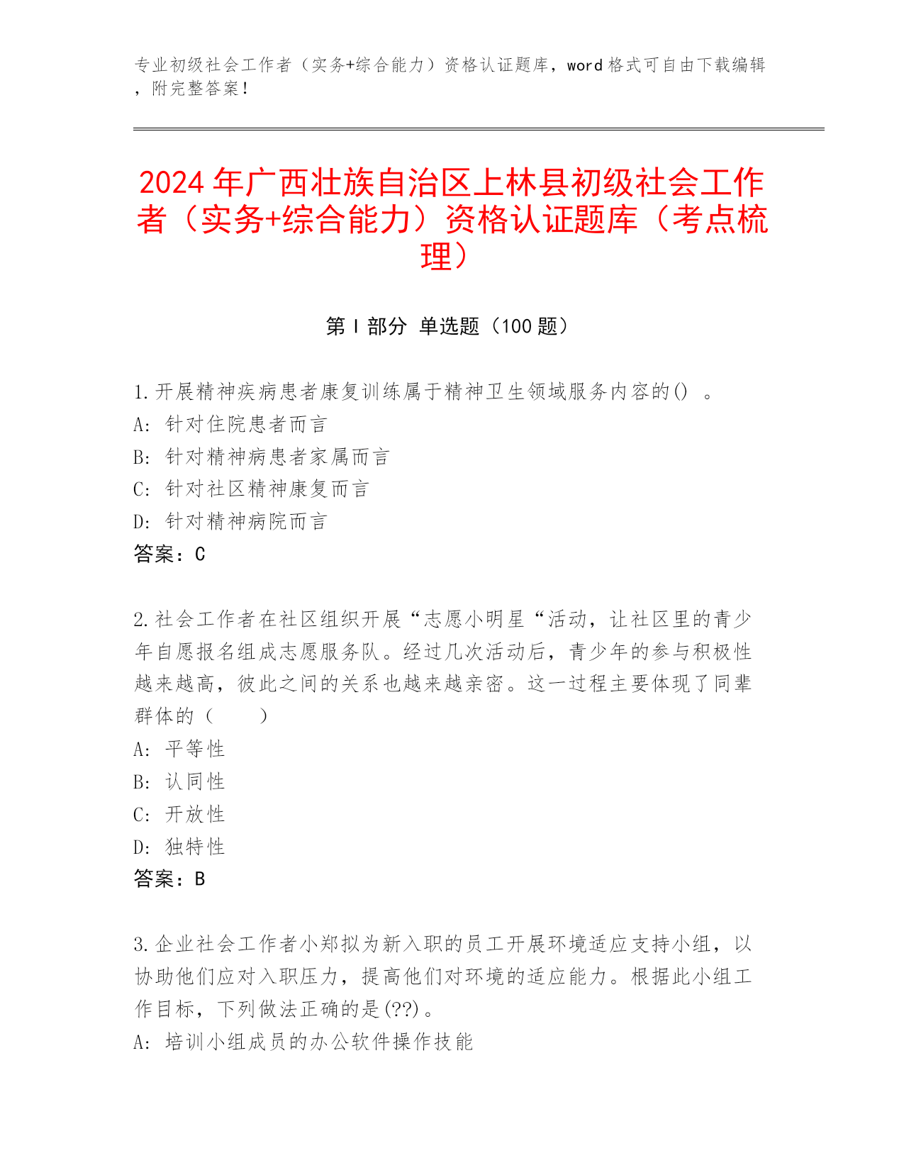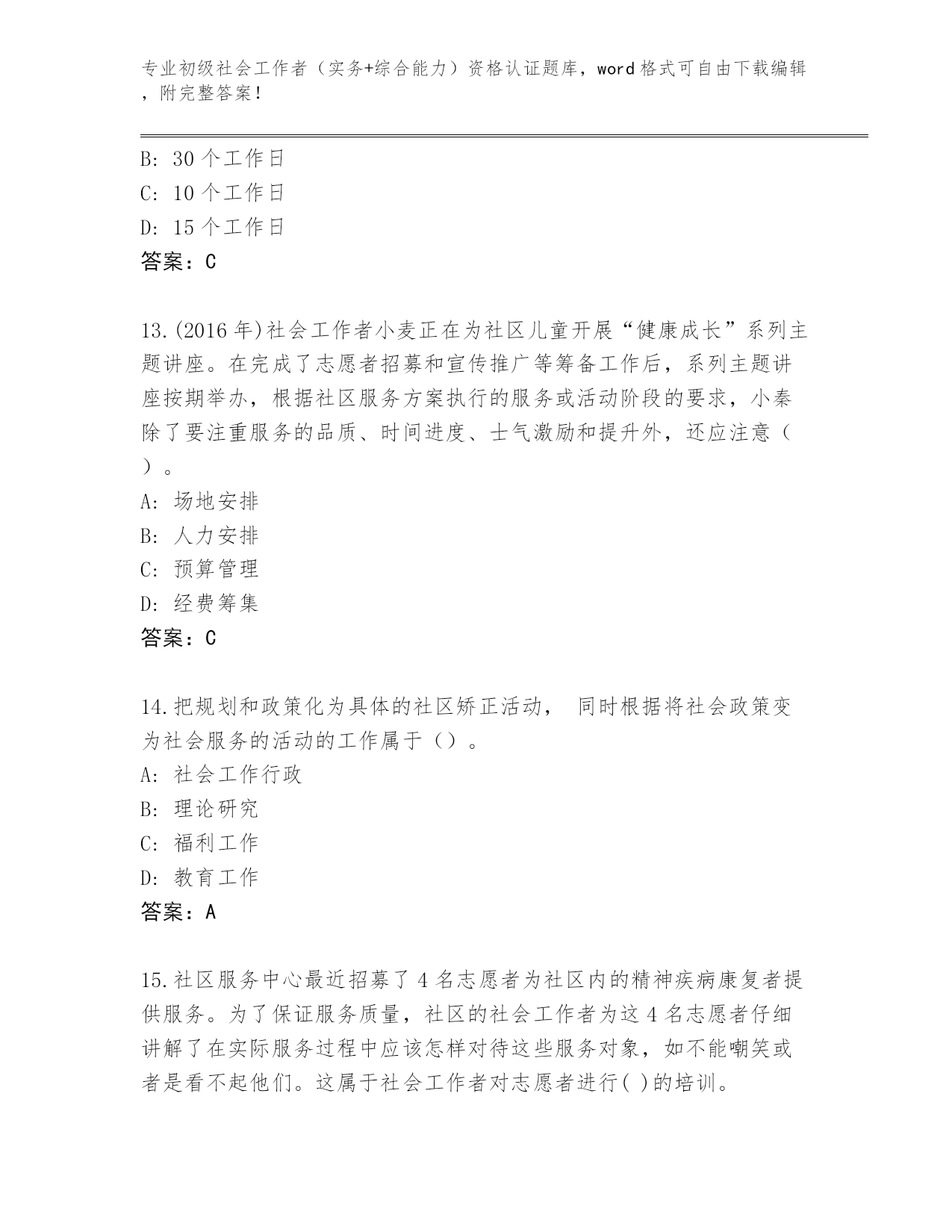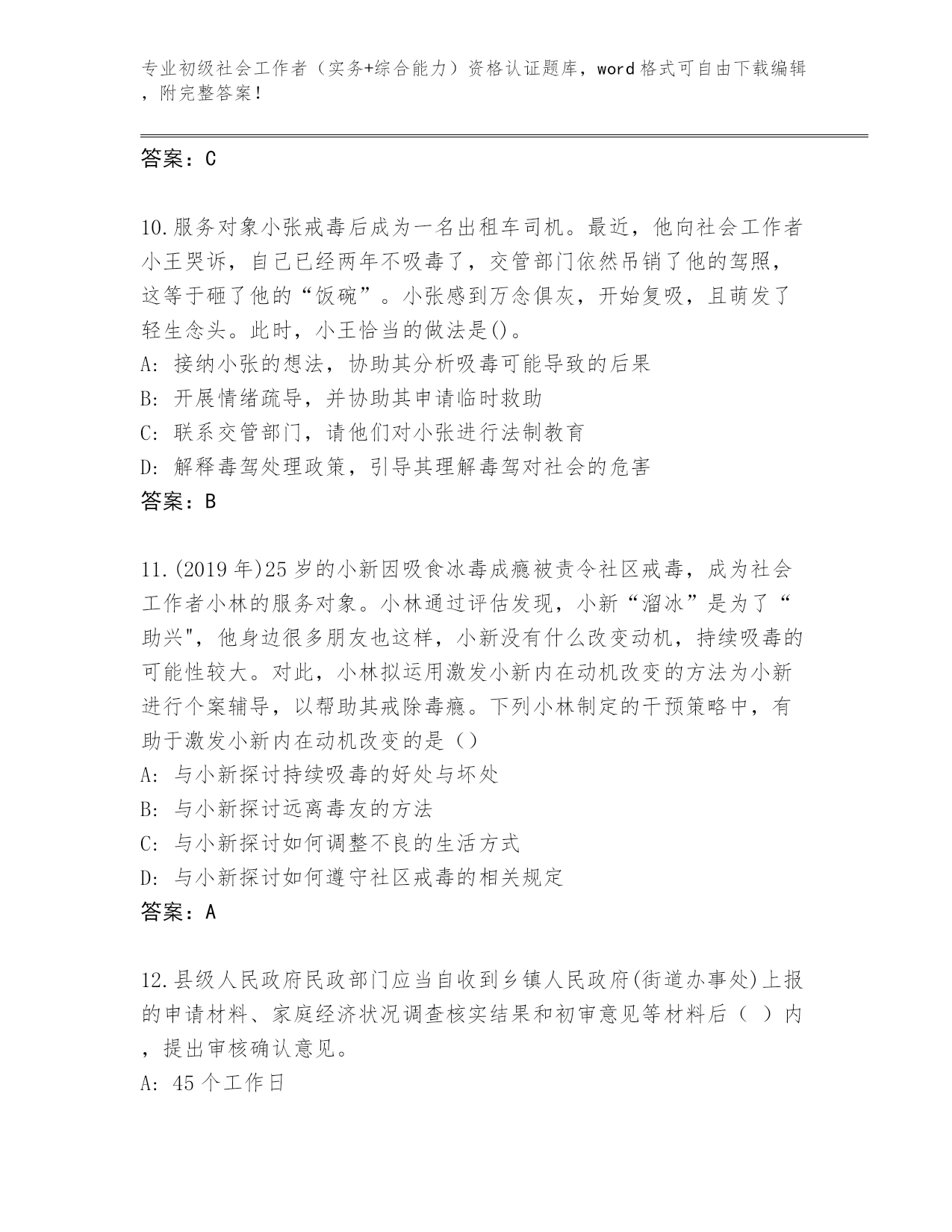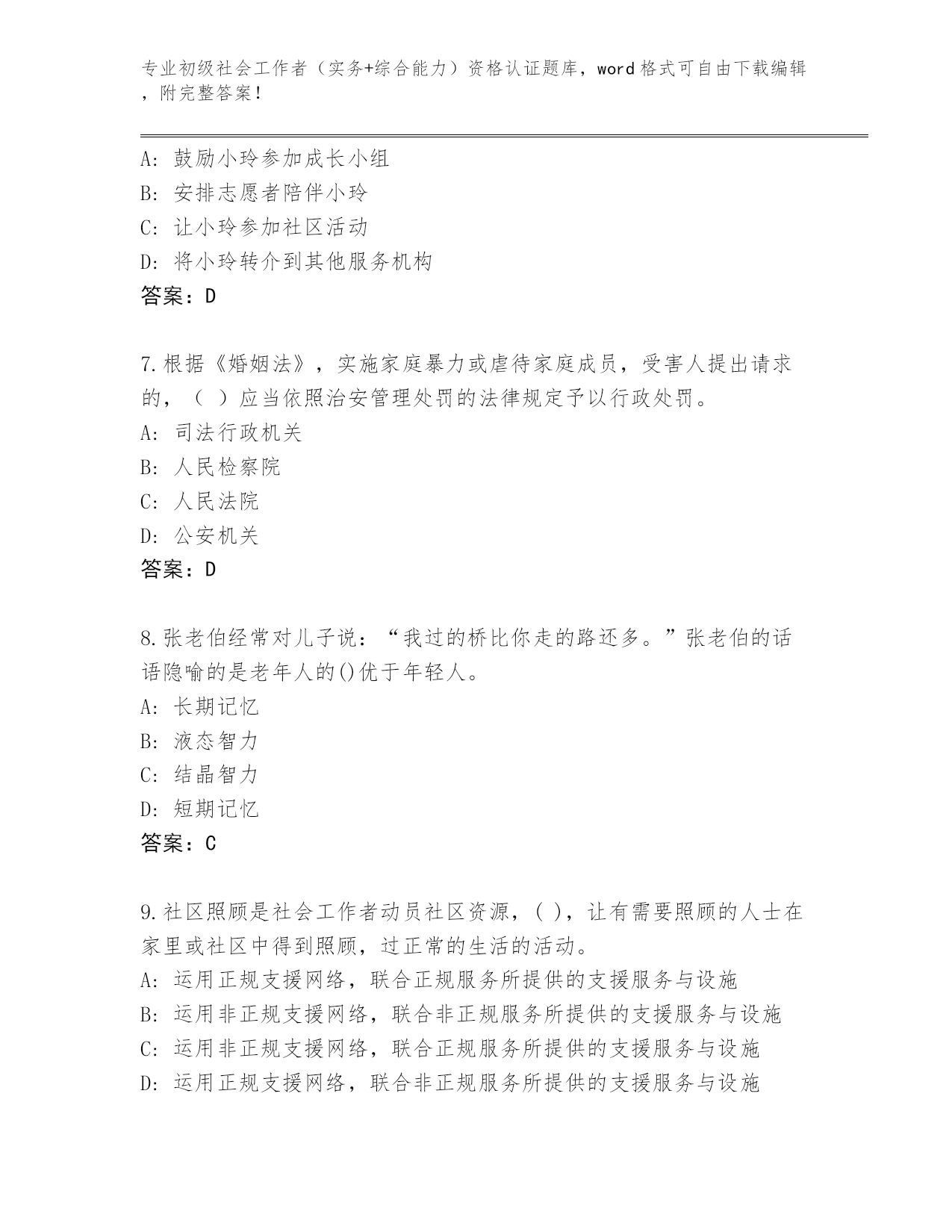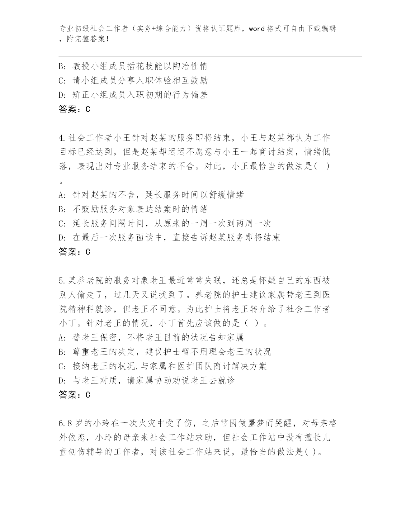 专业初级社会工作者(实务+综合能力)资格认证题库,word格式可自由下载编辑,附完整答案!2024年广西壮族自治区上林县初级社会工作者(实务+综合能力)资格认证题库(考点梳理)第I部分单选题(100题)1.开展精神疾病患者康复训练属于精神卫生领域服务内容的()。A:针对住院患者而言B:针对精神病患者家属而言C:针对社区精神康复而言D:针对精神病院而言答案:C2.社会工作者在社区组织开展“志愿小明星“活动,让社区里的青少年自愿报名组成志愿服务队。经过几次活动后,青少年的参与积极性越来越高,彼此之间的关系也越来越亲密。这一过程主要体现了同辈群体的()A:平等性B:认同性C:开放性D:独特性答案:B3.企业社会工作者小郑拟为新入职的员工开展环境适应支持小组,以协助他们应对入职压力,提高他们对环境的适应能力。根据此小组工作目标,下列做法正确的是(??)。A:培训小组成员的办公软件操作技能B:教授小组成员插花技能以陶冶性情C:请小组成员分享入职体验相互鼓励D:矫正小组成员入职初期的行为偏差答案:C4.社会工作者小王针对赵某的服务即将结束,小王与赵某都认为工作目标已经达到,但是赵某却迟迟不愿意与小王一起商讨结案,情绪低落,表现出对专业服务结束的不舍。对此,小王最恰当的做法是()。A:针对赵某的不舍,延长服务时间以舒缓情绪B:不鼓励服务对象表达结案时的情绪C:延长服务间隔时间,从原来的一周一次到两周一次D:在最后一次服务面谈中,直接告诉赵某服务即将结束答案:C5.某养老院的服务对象老王最近常常失眠,还总是怀疑自己的东西被别人偷走了,过几天又说找到了。养老院的护士建议家属带老王到医院精神科就诊,但老王不同意。为此护士将老王转介给了社会工作者小丁。针对老王的情况,小丁首先应该做的是()。A:替老王保密,不将老王目前的状况告知家属B:尊重老王的决定,建议护士暂不用理会老王的状况C:接纳老王的状况.与家属和医护团队商讨解决方案D:与老王对质,请家属协助劝说老王去就诊答案:C6.8岁的小玲在一次火灾中受了伤,之后常因做噩梦而哭醒,对母亲格外依恋,小玲的母亲来社会工作站求助,但社会工作站中没有擅长儿童创伤辅导的工作者,对该社会工作站来说,最恰当的做法是()。A:鼓励小玲参加成长小组B:安排志愿者陪伴小玲C:让小玲参加社区活动D:将小玲转介到其他服务机构答案:D7.根据《婚姻法》,实施家庭暴力或虐待家庭成员,受害人提出请求的,()应当依照治安管理处罚的法律规定予以行政处罚。A:司法行政机关B:人民检察院C:人民法院D:公安机关答案:D8.张老伯经常对儿子说:“我过的桥比你走的路还多。”张老伯的话语隐喻的是老年人的()优于年轻人。A:长期记忆B:液态智力C:结晶智力D:短期记忆答案:C9.社区照顾是社会工作者动员社区资源,(),让有需要照顾的人士在家里或社区中得到照顾,过正常的生活的活动。A:运用正规支援网络,联合正规服务所提供的支援服务与设施B:运用非正规支援网络,联合非正规服务所提供的支援服务与设施C:运用非正规支援网络,联合正规服务所提供的支援服务与设施D:运用正规支援网络,联合非正规服务所提供的支援服务与设施答案:C10.服务对象小张戒毒后成为一名出租车司机。最近,他向社会工作者小王哭诉,自己已经两年不吸毒了,交管部门依然吊销了他的驾照,这等于砸了他的“饭碗”。小张感到万念俱灰,开始复吸,且萌发了轻生念头。此时,小王恰当的做法是()。A:接纳小张的想法,协助其分析吸毒可能导致的后果B:开展情绪疏导,并协助其申请临时救助C:联系交管部门,请他们对小张进行法制教育D:解释毒驾处理政策,引导其理解毒驾对社会的危害答案:B11.(2019年)25岁的小新因吸食冰毒成瘾被责令社区戒毒,成为社会工作者小林的服务对象。小林通过评估发现,小新“溜冰”是为了“助兴",他身边很多朋友也这样,小新没有什么改变动机,持续吸毒的可能性较大。对此,小林拟运用激发小新内在动机改变的方法为小新进行个案辅导,以帮助其戒除毒瘾。下列小林制定的干预策略中,有助于激发小新内在动机改变的是()A:与小新探讨持续吸毒的好处与坏处B:与小新探讨远离毒友的方法C:与小新探讨如何调整不良的生活方式D:与小新探讨如何遵守社区戒毒的相关规定答案:A12.县级人民政府民政部门应当自收到乡镇人民政府(街道办事处)上报的申请材料、家庭经济状况调查核实结果和初审意见等材料后()内,提出审核确认意见。A:45个工作日B:30个工作日C:10个工作日D:15个工作日答案:C13.(2016年)社会工作者小麦正在为社区儿童开展“健康成长”系列主题讲座。在完成了志愿者招募和宣传推广等筹备工作后,系列主题讲座按期举办,根据社区服务方案执行的服务或活动阶段的要求,小秦除了要注重服务的品质、时间进度、士气激励和提升外,还应
