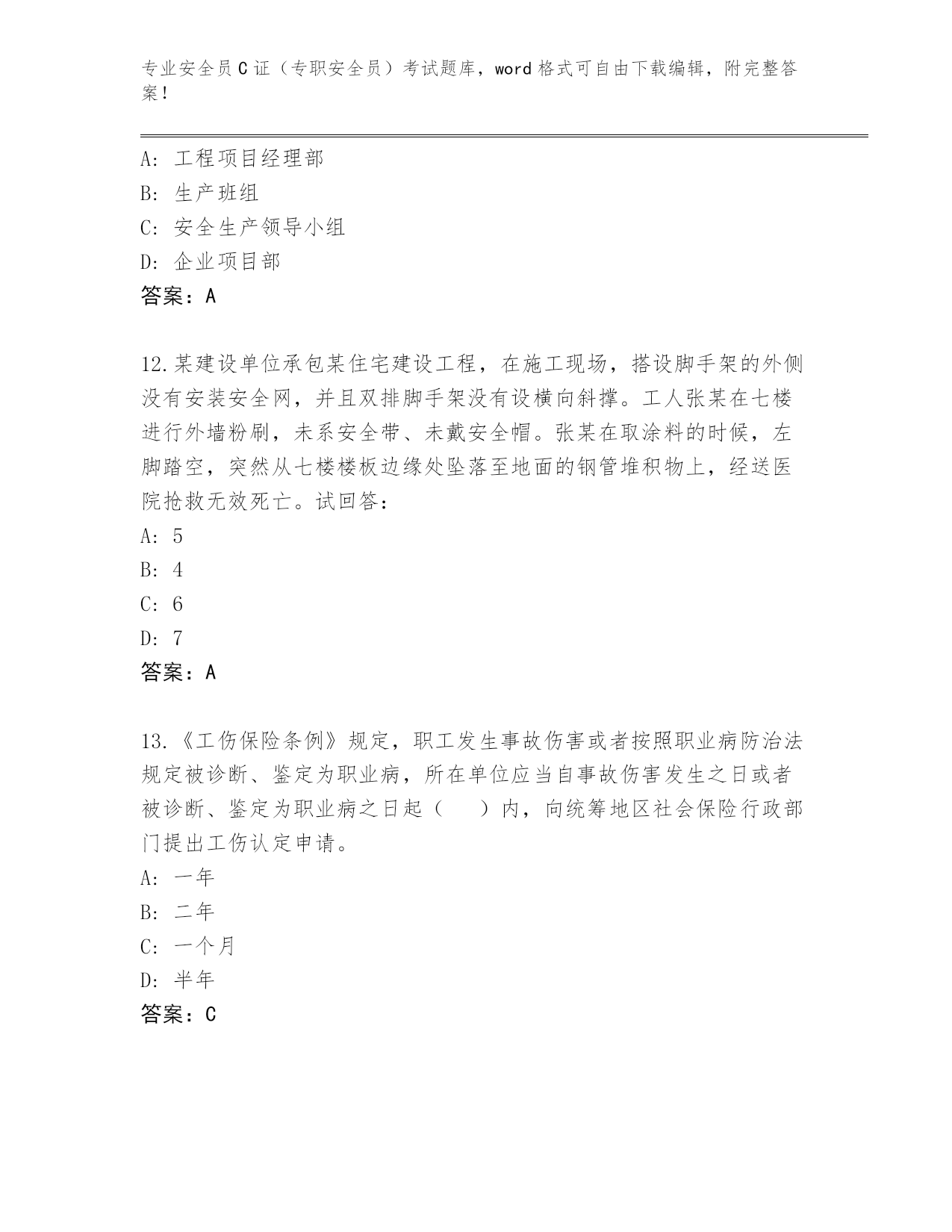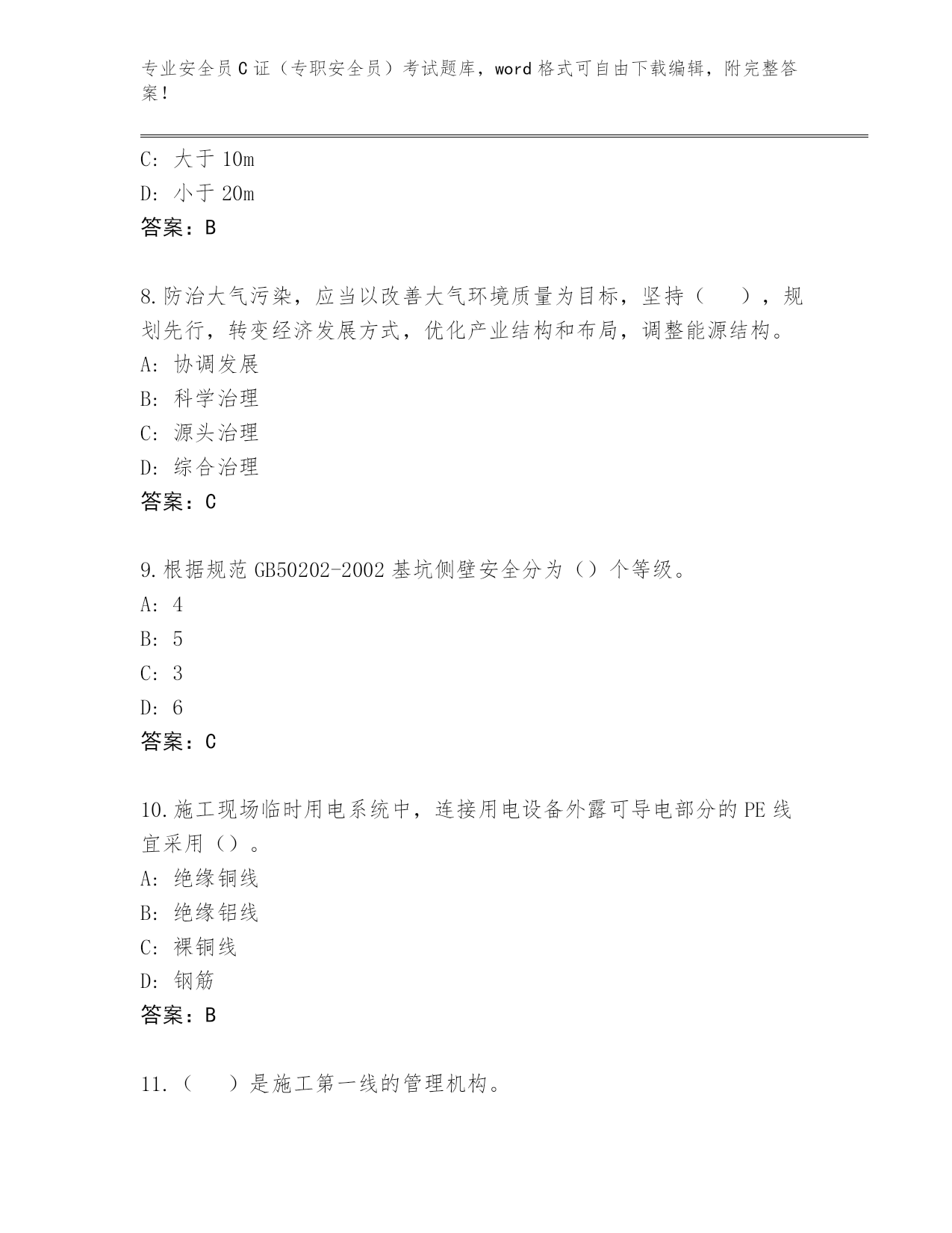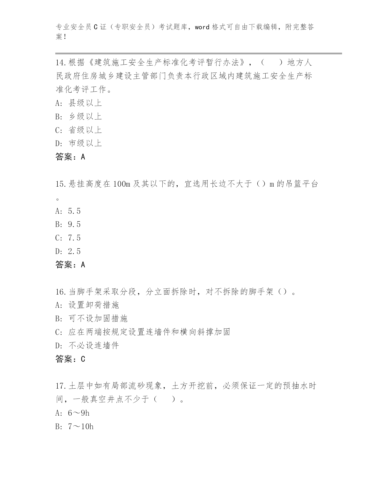 专业安全员C证(专职安全员)考试题库,word格式可自由下载编辑,附完整答案!整理广东省澄海区安全员C证(专职安全员)考试王牌题库附答案(A卷)第I部分单选题(100题)1.房屋建筑工程5~10万平方米的工程应配备不少于()的专职安全生产管理人员。A:1人B:4人C:3人D:2人答案:C2.压力容器的最高工作压力大于或者等于()。A:0.05MPaB:0.01MPaC:10kPaD:0.1MPa答案:D3.根据《建设工程安全生产管理条例》规定,作业人员()拒绝违章指挥和强令冒险作业。A:不得B:无权C:有权D:不应答案:C4.氧气瓶与乙炔瓶的距离不得小于()m。A:10B:3C:1D:5答案:D5.()是指3人以上10人以下死亡,或者10人以上50人以下重伤,或者1000万元以上5000万元以下直接经济损失的事故;上述所称的“以上”包括本数,所称的“以下”不包括本数。A:一般事故B:重大事故C:较大事故D:特别重大事故答案:C6.剪刀撑斜杆应用旋转扣件固定在与之相交的横向水平杆的伸出端或立杆上,旋转扣件中心线至主节点的距离不宜()。A:大于300mmB:大于150mmC:小于150mmD:小于300mm答案:B7.气瓶在使用中,距明火不应()。A:大于5mB:小于10mC:大于10mD:小于20m答案:B8.防治大气污染,应当以改善大气环境质量为目标,坚持(),规划先行,转变经济发展方式,优化产业结构和布局,调整能源结构。A:协调发展B:科学治理C:源头治理D:综合治理答案:C9.根据规范GB50202-2002基坑侧壁安全分为()个等级。A:4B:5C:3D:6答案:C10.施工现场临时用电系统中,连接用电设备外露可导电部分的PE线宜采用()。A:绝缘铜线B:绝缘铝线C:裸铜线D:钢筋答案:B11.()是施工第一线的管理机构。A:工程项目经理部B:生产班组C:安全生产领导小组D:企业项目部答案:A12.某建设单位承包某住宅建设工程,在施工现场,搭设脚手架的外侧没有安装安全网,并且双排脚手架没有设横向斜撑。工人张某在七楼进行外墙粉刷,未系安全带、未戴安全帽。张某在取涂料的时候,左脚踏空,突然从七楼楼板边缘处坠落至地面的钢管堆积物上,经送医院抢救无效死亡。试回答:A:5B:4C:6D:7答案:A13.《工伤保险条例》规定,职工发生事故伤害或者按照职业病防治法规定被诊断、鉴定为职业病,所在单位应当自事故伤害发生之日或者被诊断、鉴定为职业病之日起()内,向统筹地区社会保险行政部门提出工伤认定申请。A:一年B:二年C:一个月D:半年答案:C14.根据《建筑施工安全生产标准化考评暂行办法》,()地方人民政府住房城乡建设主管部门负责本行政区域内建筑施工安全生产标准化考评工作。A:县级以上B:乡级以上C:省级以上D:市级以上答案:A15.悬挂高度在100m及其以下的,宜选用长边不大于()m的吊篮平台。A:5.5B:9.5C:7.5D:2.5答案:A16.当脚手架采取分段,分立面拆除时,对不拆除的脚手架()。A:设置卸荷措施B:可不设加固措施C:应在两端按规定设置连墙件和横向斜撑加固D:不必设连墙件答案:C17.土层中如有局部流砂现象,土方开挖前,必须保证一定的预抽水时间,一般真空井点不少于()。A:6~9hB:7~10hC:3~4hD:4~6h答案:B18.安全帽耐冲击试验最大冲击力不应超过多少()A:700kgB:500kgC:600kgD:400kg答案:B19.易燃仓库内严禁使用()照明灯具。A:25瓦白炽灯B:碘钨灯C:日光灯D:防爆灯答案:B20.案例:东平建筑公司是原南市一间建筑施工企业,单位主要负责人是张三,该公司现承建原北市市政府办公楼项目,由李四担任项目经理,王五担任项目副经理,赵六是东平建筑公司的安全生产部门经理。A:李四B:张三C:赵六D:王五答案:B21.违反《中华人民共和国消防法》规定,擅自拆封或者使用被公安机关消防机构查封的场所、部位的,尚不构成犯罪的,处10日以上15日以下拘留,可以并处()罚款。A:五万元以下B:五百元以下C:五万元以上D:五百元以上答案:B22.建筑施工企业应当依法设置专门的(),在企业主要负责人的领导下开展本企业的安全生产管理工作。A:安全生产监督机构B:安全生产管理机构C:安全生产保障机构D:安全生产实施机构答案:B23.()必须采用有效的职业病防护设施,并为劳动者提供符合职业病防治要求的个人使用的职业病防护用品。A:用人单位B:卫生行政部门C:职业卫生技术服务机构D:组织机构答案:A24.()共分为总则、术语、基本规定、评价框架体系、环境保护评价指标、节材与材料资源利用评价指标等11个方面,重点是环境保护和节约、合理利用资源。A:《中华人民共和国建筑法》B:《建设工程质量管理条例》C:
