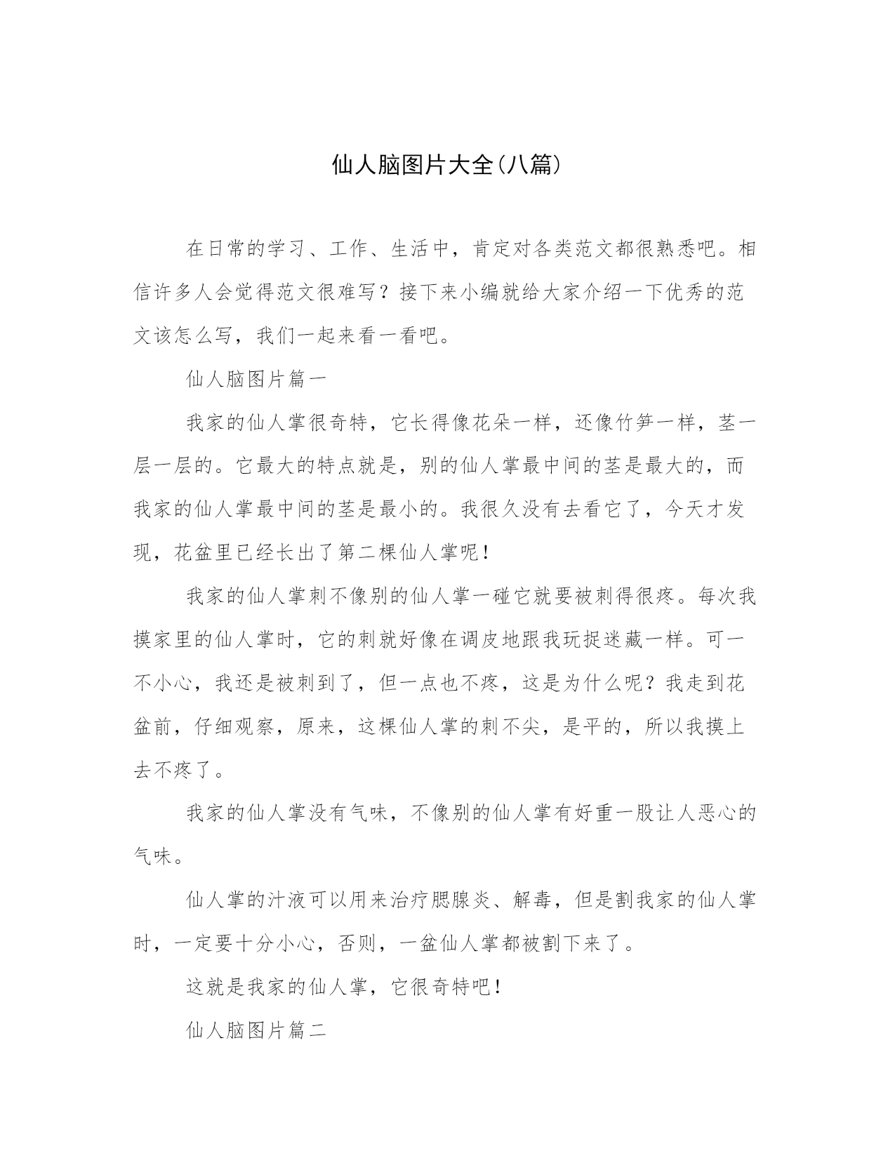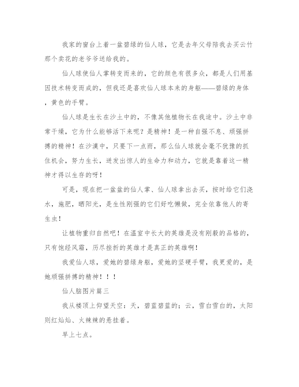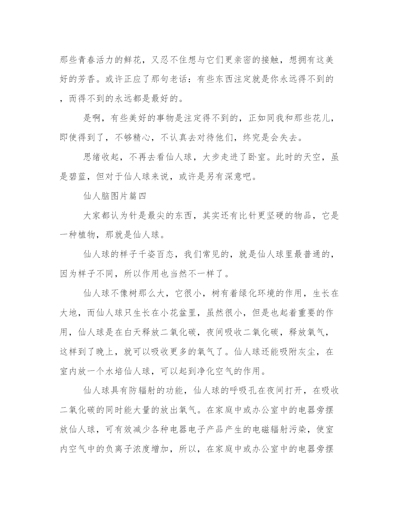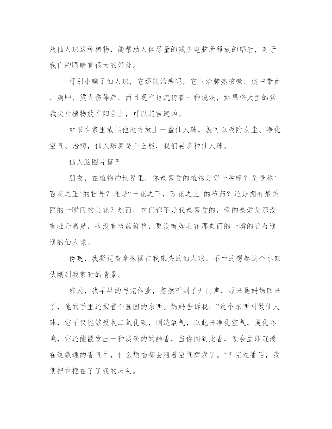 仙人脑图片大全(八篇)在日常的学习、工作、生活中,肯定对各类范文都很熟悉吧。相信许多人会觉得范文很难写?接下来小编就给大家介绍一下优秀的范文该怎么写,我们一起来看一看吧。仙人脑图片篇一我家的仙人掌很奇特,它长得像花朵一样,还像竹笋一样,茎一层一层的。它最大的特点就是,别的仙人掌最中间的茎是最大的,而我家的仙人掌最中间的茎是最小的。我很久没有去看它了,今天才发现,花盆里已经长出了第二棵仙人掌呢!我家的仙人掌刺不像别的仙人掌一碰它就要被刺得很疼。每次我摸家里的仙人掌时,它的刺就好像在调皮地跟我玩捉迷藏一样。可一不小心,我还是被刺到了,但一点也不疼,这是为什么呢?我走到花盆前,仔细观察,原来,这棵仙人掌的刺不尖,是平的,所以我摸上去不疼了。我家的仙人掌没有气味,不像别的仙人掌有好重一股让人恶心的气味。仙人掌的汁液可以用来治疗腮腺炎、解毒,但是割我家的仙人掌时,一定要十分小心,否则,一盆仙人掌都被割下来了。这就是我家的仙人掌,它很奇特吧!仙人脑图片篇二我家的窗台上着一盆碧绿的仙人球,它是去年父母陪我去买云竹那个卖花的老爷爷送给我的。仙人球使仙人掌转变而来的,它的颜色有很多众,都是人们用基因技术转变而成的,但我还是喜欢仙人球本来的身躯——碧绿的身体,黄色的手臂。仙人球是生长在沙土中的,不像其他植物长在我途中。沙土中非常干燥,它为什么能够活下来呢?是精神!是一种自强不息、顽强拼搏的精神!在沙漠中,只要下一点雨,那么仙人球就会毫不犹豫的抓住机会,努力生长,迸发出惊人的生命力和动力,它就是靠着这一精神才得以生存的呀!可是,现在把一盆盆的仙人掌、仙人球拿出去买,按时给它们浇水,施肥,晒阳光,是生性刚强的它们好吃懒做,完全依靠他人的寄生虫!让植物重归自然吧!在温室中长大的英雄是没有刚毅的品格的,只有饱经风霜,历尽挫折的英雄才是真正的英雄啊!我爱仙人球,爱她的碧绿身躯,爱她的坚硬手臂,我更爱的,是她顽强拼搏的精神!!!仙人脑图片篇三我从楼顶上仰望天空:天,碧蓝碧蓝的;云,雪白雪白的,太阳则红灿灿、火辣辣的悬挂着。早上七点。本该是冬天,却是一副夏阳的情景。转身想要下楼,不想在楼梯口看到一盆仙人球,想着:这盆仙人球怎么会在这儿,它不是应该在厨房的窗台边吗?真奇怪!于是,我把仙人球带下楼,放回原处。再定眼一看,去发现它已不是自己先前看到的样子了。不知什么时候仙人球已经萎缩成小小的一团,上面突出一个尖尖的顶,下面则有点肥大,可给人整体的感觉还是很小。记得今年春节刚过,就买回来的仙人球,是一个巴掌大小的模样,还开着许多的深粉色花朵,美丽极了,当时我还以为是塑料,因为太像假的了,而且在我看来仙人球是不开花的。买回来后才发现自己是真的。但是,花儿却一天天枯萎。再后来,仙人球渐渐变成了一类似拳头大小的圆形球球,再再后来,搁置着没去理它也就淡忘了。什么时候变成现在这个样子也还真没有想到。我怀疑它要死了。看着渐渐缩水的小团体,我却无能为力,怎么办?我想不出解决的方法来。只记得,小学时有一篇课后阅读,名为养花,里面有一句话,大概意思是:花都养不活,怎么养活自己呢?而原句怎么说的,我已经记不大清楚了。其实,在养这株仙人球前,我也曾经尝试着种过一些别的花,像海棠花,水仙花等,但是最后,都一次次地枯萎完结了。直到现在,也仅仅是在我的心里,存着它们最盛的模样。当花儿枯萎的时候,总给我颇多感触,害怕失去,害怕失去那些美好的事物,所以暗暗下定决心,以后再也不养花儿了!但每每看到那些青春活力的鲜花,又忍不住想与它们更亲密的接触,想拥有这美好的芳香。或许正应了那句老话:有些东西注定就是你永远得不到的,而得不到的永远都是最好的。是啊,有些美好的事物是注定得不到的,正如同我和那些花儿,即使得到了,不够精心,不认真去对待他们,终究是会失去。思绪收起,不再去看仙人球,大步走进了卧室。此时的天空,虽是碧蓝,但对于仙人球来说,或许是另有深意吧。仙人脑图片篇四大家都认为针是最尖的东西,其实还有比针更坚硬的物品,它是一种植物,那就是仙人球。仙人球的样子千姿百态,我们常见的,就是仙人球里最普通的,因为样子不同,所以作用也当然不一样了。仙人球不像树那么大,它很小,树有着绿化环境的作用,生长在大地,而仙人球只生长在小花盆里,虽然很小,但是也起着重要的作用,仙人球是在白天释放二氧化碳,夜间吸收二氧化碳,释放氧气,这样到了晚上,就可以吸收更多的氧气了。仙人球还能吸附灰尘,在室内放一个水培仙人球,可以起到净化空气的作用。仙人球具有防辐射的功能,仙人球的呼吸孔在夜间打开,在吸收二氧化碳的同时能大量的放出氧气。在家庭中或办公室中的电器旁摆放仙人球,可有效减少各种电器电子产品产生的电磁辐射污染,使室内空气中的负离子浓度增加,所以,在家庭中或办公室中的电器旁摆放仙人球这种植物,能帮助人体尽量的减少电脑所释放的辐射,对于我