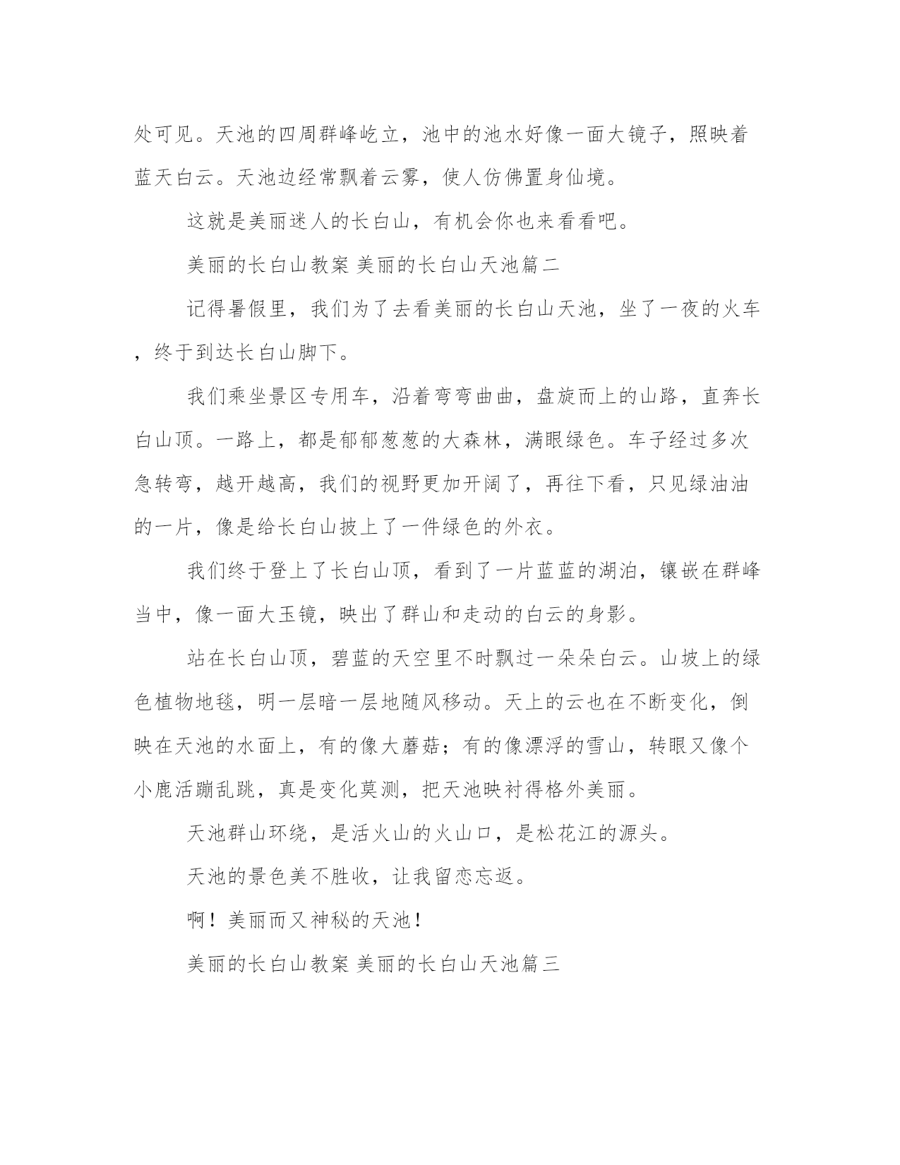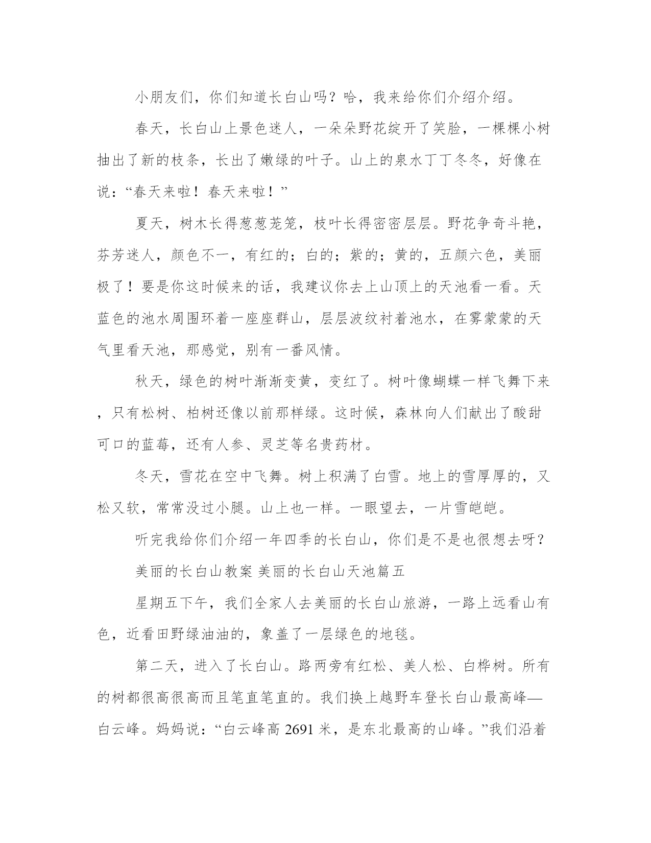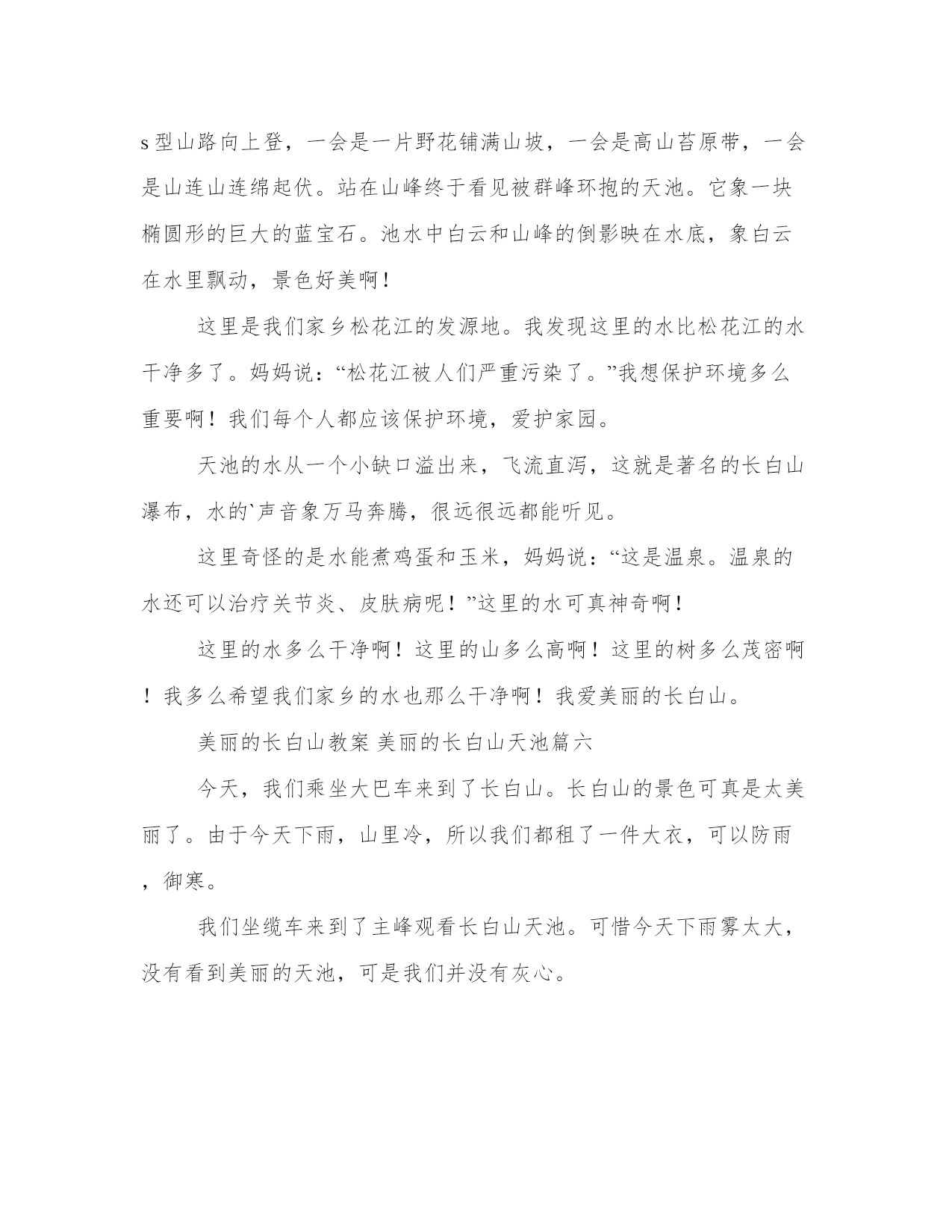 最新美丽的长白山教案美丽的长白山天池(7篇)作为一名教师,通常需要准备好一份教案,编写教案助于积累教学经验,不断提高教学质量。写教案的时候需要注意什么呢?有哪些格式需要注意呢?下面我帮大家找寻并整理了一些优秀的教案范文,我们一起来了解一下吧。美丽的长白山教案美丽的长白山天池篇一长白山景色真是迷人呀!我和奶奶首先乘车来到了山脚下的高山花园,那里绿草如茵、落英缤纷,姹紫嫣红的花儿争奇斗艳。挺拔秀丽的美人松伸出漂亮的枝干仿佛在迎接我们的到来。再往上走,我们来到了锦江大峡谷,大峡谷就象条巨龙,蜿蜒盘旋。谷底里,一座座形状奇特的岩石拔地而起。有的像骆驼,有的像狮子,有的像黑熊,有些形状更加奇异,让人们联想起了天池怪兽。长白山瀑布是长白山最著名的景点之一,银白色的瀑布就像一条玉带挂在峭壁上。看着壮观的瀑布,我不禁想起了李白的千古名句“飞流直下三千尺,疑是银河落九天。”瀑布不远处就是长白山温泉。远远望去,温泉四周雾气腾腾。我们随着人群来到了温泉旁边,温泉的水像开了锅一样,不断往上翻涌。这里的谁可以煮熟鸡蛋呢!长白山最顶端就是著名的长白山天池了。我和奶奶坐着缆车来到了这里,这里同山脚下真是两个季节呀!一片片没有融化尽的积雪随处可见。天池的四周群峰屹立,池中的池水好像一面大镜子,照映着蓝天白云。天池边经常飘着云雾,使人仿佛置身仙境。这就是美丽迷人的长白山,有机会你也来看看吧。美丽的长白山教案美丽的长白山天池篇二记得暑假里,我们为了去看美丽的长白山天池,坐了一夜的火车,终于到达长白山脚下。我们乘坐景区专用车,沿着弯弯曲曲,盘旋而上的山路,直奔长白山顶。一路上,都是郁郁葱葱的大森林,满眼绿色。车子经过多次急转弯,越开越高,我们的视野更加开阔了,再往下看,只见绿油油的一片,像是给长白山披上了一件绿色的外衣。我们终于登上了长白山顶,看到了一片蓝蓝的湖泊,镶嵌在群峰当中,像一面大玉镜,映出了群山和走动的白云的身影。站在长白山顶,碧蓝的天空里不时飘过一朵朵白云。山坡上的绿色植物地毯,明一层暗一层地随风移动。天上的云也在不断变化,倒映在天池的水面上,有的像大蘑菇;有的像漂浮的雪山,转眼又像个小鹿活蹦乱跳,真是变化莫测,把天池映衬得格外美丽。天池群山环绕,是活火山的火山口,是松花江的源头。天池的景色美不胜收,让我留恋忘返。啊!美丽而又神秘的天池!美丽的长白山教案美丽的长白山天池篇三星期五下午,我们全家人去美丽的长白山旅游,一路上远看山有色,近看田野绿油油的,象盖了一层绿色的地毯。第二天,进入了长白山。路两旁有红松、美人松、白桦树……所有的树都很高很高而且笔直笔直的。我们换上越野车登长白山最高峰—白云峰。妈妈说:“白云峰高2691米,是东北最高的山峰。”我们沿着s型山路向上登,一会是一片野花铺满山坡,一会是高山苔原带,一会是山连山连绵起伏。站在山峰终于看见被群峰环抱的天池。它象一块椭圆形的巨大的蓝宝石。池水中白云和山峰的倒影映在水底,象白云在水里飘动,景色好美啊!这里是我们家乡松花江的发源地。我发现这里的水比松花江的水干净多了。妈妈说:“松花江被人们严重污染了。”我想保护环境多么重要啊!我们每个人都应该保护环境,爱护家园。天池的水从一个小缺口溢出来,飞流直泻,这就是著名的长白山瀑布,水的声音象万马奔腾,很远很远都能听见。这里奇怪的是水能煮鸡蛋和玉米,妈妈说:“这是温泉。温泉的水还可以治疗关节炎、皮肤病呢!这里的水可真神奇啊!这里的水多么干净啊!这里的山多么高啊!这里的树多么茂密啊!我多么希望我们家乡的水也那么干净啊!我爱美丽的长白山。美丽的长白山教案美丽的长白山天池篇四小朋友们,你们知道长白山吗?哈,我来给你们介绍介绍。春天,长白山上景色迷人,一朵朵野花绽开了笑脸,一棵棵小树抽出了新的枝条,长出了嫩绿的叶子。山上的泉水丁丁冬冬,好像在说:“春天来啦!春天来啦!”夏天,树木长得葱葱茏笼,枝叶长得密密层层。野花争奇斗艳,芬芳迷人,颜色不一,有红的;白的;紫的;黄的,五颜六色,美丽极了!要是你这时候来的话,我建议你去上山顶上的天池看一看。天蓝色的池水周围环着一座座群山,层层波纹衬着池水,在雾蒙蒙的天气里看天池,那感觉,别有一番风情。秋天,绿色的树叶渐渐变黄,变红了。树叶像蝴蝶一样飞舞下来,只有松树、柏树还像以前那样绿。这时候,森林向人们献出了酸甜可口的蓝莓,还有人参、灵芝等名贵药材。冬天,雪花在空中飞舞。树上积满了白雪。地上的雪厚厚的,又松又软,常常没过小腿。山上也一样。一眼望去,一片雪皑皑。听完我给你们介绍一年四季的长白山,你们是不是也很想去呀?美丽的长白山教案美丽的长白山天池篇五星期五下午,我们全家人去美丽的长白山旅游,一路上远看山有色,近看田野绿油油的,象盖了一层绿色的地毯。第二天,进入了长白山。路两旁有红松、美人松、白桦树。所有的树都很高很高而且笔直笔直的。我