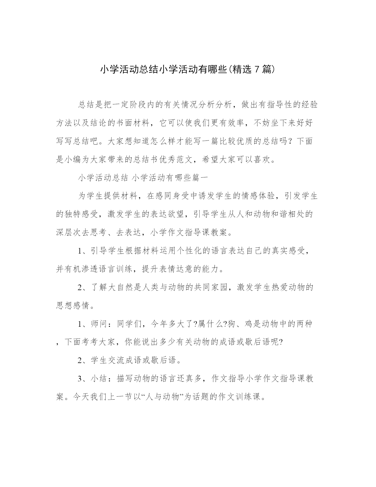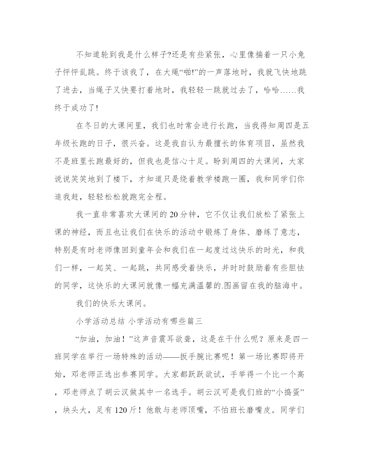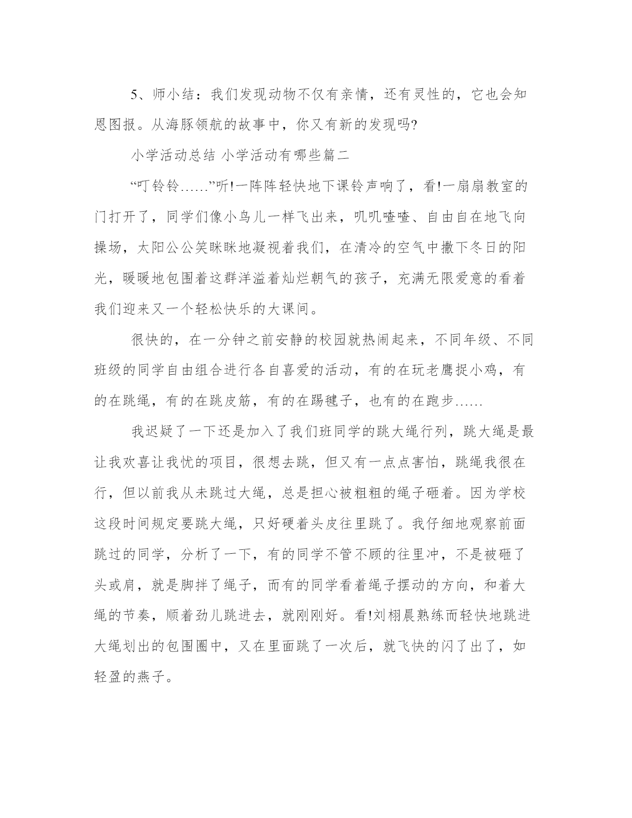 小学活动总结小学活动有哪些(精选7篇)总结是把一定阶段内的有关情况分析分析,做出有指导性的经验方法以及结论的书面材料,它可以使我们更有效率,不妨坐下来好好写写总结吧。大家想知道怎么样才能写一篇比较优质的总结吗?下面是小编为大家带来的总结书优秀范文,希望大家可以喜欢。小学活动总结小学活动有哪些篇一为学生提供材料,在感同身受中诱发学生的情感体验,引发学生的独特感受,激发学生的表达欲望,引导学生从人和动物和谐相处的深层次去思考、去表达,小学作文指导课教案。1、引导学生根据材料运用个性化的语言表达自己的真实感受,并有机渗透语言训练,提升表情达意的能力。2、了解大自然是人类与动物的共同家园,激发学生热爱动物的思想感情。1、师问:同学们,今年多大了?属什么?狗、鸡是动物中的两种,下面考考大家,你能说出多少有关动物的成语或歇后语呢?2、学生交流成语或歇后语。3、小结:描写动物的语言还真多,作文指导小学作文指导课教案。今天我们上一节以“人与动物”为话题的作文训练课。1、师述:刚才我发现,一说起动物,你们的眼睛就亮了。下面,我们一起走进动物世界感受一番。有个要求,请用积累的词语正确地描写你看到的画面。●课件出示一段趣味盎然的动物录像片。●画面定格:各种姿态各异的动物。2、学生用积累的词语正确地描写看到的画面,老师随机点拨,适当评价,鼓励学生说得准确、生动、形象。3、师述:一个个形象生动的词透着你们对动物的喜爱,来,拿起你的笔,用一二句话描写一下你眼中的动物世界。●学生写话,老师巡视。4、学生交流,老师立足动物世界的特点进行简评。1、师述:你们眼中的动物世界是那么丰富多彩、趣味盎然、令人神往。下面我们再次走进动物世界感受一下。想想哪一个画面最感动你?●课件播放一段大象母-子情深的感人录像。2、学生交流感受。3、师述:动物之间的这份爱感动了你们,也感动了老师。还有两则故事,我想把它推荐给大家,请你认真读读,用心感悟,相信你的感悟会越来越深。●提供文字材料,学生自主阅读(材料附后)。4、交流对第一则故事义鼠救主的新感受与新发现。5、师小结:我们发现动物不仅有亲情,还有灵性的,它也会知恩图报。从海豚领航的故事中,你又有新的发现吗?小学活动总结小学活动有哪些篇二“叮铃铃……”听!一阵阵轻快地下课铃声响了,看!一扇扇教室的门打开了,同学们像小鸟儿一样飞出来,叽叽喳喳、自由自在地飞向操场,太阳公公笑眯眯地凝视着我们,在清冷的空气中撒下冬日的阳光,暖暖地包围着这群洋溢着灿烂朝气的孩子,充满无限爱意的看着我们迎来又一个轻松快乐的大课间。很快的,在一分钟之前安静的校园就热闹起来,不同年级、不同班级的同学自由组合进行各自喜爱的活动,有的在玩老鹰捉小鸡,有的在跳绳,有的在跳皮筋,有的在踢毽子,也有的在跑步……我迟疑了一下还是加入了我们班同学的跳大绳行列,跳大绳是最让我欢喜让我忧的项目,很想去跳,但又有一点点害怕,跳绳我很在行,但以前我从未跳过大绳,总是担心被粗粗的绳子砸着。因为学校这段时间规定要跳大绳,只好硬着头皮往里跳了。我仔细地观察前面跳过的同学,分析了一下,有的同学不管不顾的往里冲,不是被砸了头或肩,就是脚拌了绳子,而有的同学看着绳子摆动的方向,和着大绳的节奏,顺着劲儿跳进去,就刚刚好。看!刘栩晨熟练而轻快地跳进大绳划出的包围圈中,又在里面跳了一次后,就飞快的闪了出了,如轻盈的燕子。不知道轮到我是什么样子?还是有些紧张,心里像揣着一只小兔子怦怦乱跳。终于该我了,在大绳“啪!”的一声落地时,我就飞快地跳了进去,当绳子又快要打着地时,我轻轻一跳就过去了,哈哈……我终于成功了!在冬日的大课间里,我们也时常会进行长跑,当我得知周四是五年级长跑的日子,很兴奋。这是我自认为最擅长的体育项目,虽然我不是班里长跑最好的,但我也是信心十足。盼到周四的大课间,大家说说笑笑地到了楼下,才知道只是绕着教学楼跑一圈,我和同学们你追我赶,轻轻松松就跑完全程。我一直非常喜欢大课间的20分钟,它不仅让我们放松了紧张上课的神经,而且也让我们在快乐的活动中锻炼了身体、磨练了意志,特别是有时老师像回到童年会和我们在一起度过这快乐的时光,和我们一样,一起笑、一起跳,共同感受着快乐,并时时鼓励着有些胆怯的同学,这快乐的大课间就像一幅充满温馨的.图画留在我的脑海中。我们的快乐大课间。小学活动总结小学活动有哪些篇三“加油,加油!”这声音震耳欲聋,这是在干什么呢?原来是四一班同学在举行一场特殊的活动——扳手腕比赛呢!第一场比赛即将开始,邓老师正选出参赛同学。大家都跃跃欲试,手举得一个比一个高,邓老师点了胡云汉做其中一名选手。胡云汉可是我们班的“小捣蛋”,块头大,足有120斤!他敢与老师顶嘴,不怕班长磨嘴皮。同学们都讨厌他。可邓老师却偏偏点了我与他比赛,尽管我有一百个不愿意,但作为班长,可不能在此刻丢脸啊!我们