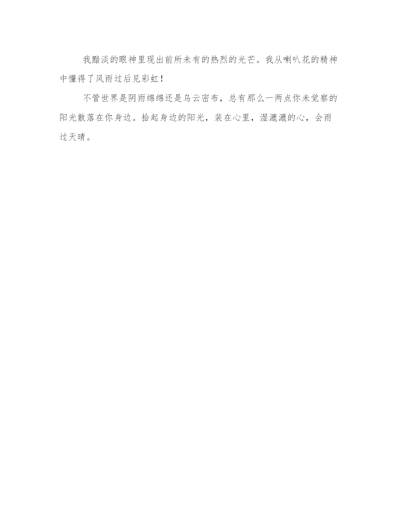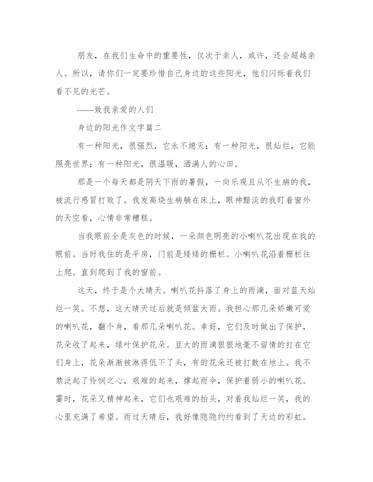 2023年身边的阳光作文字优质在日常学习、工作或生活中,大家总少不了接触作文或者范文吧,通过文章可以把我们那些零零散散的思想,聚集在一块。相信许多人会觉得范文很难写?下面是小编帮大家整理的优质范文,仅供参考,大家一起来看看吧。身边的阳光作文字篇一友情,是我们生命中不可缺少的,是我们生命中最需要的,亦是我们生命中最难看透的。友情,简单来说,就分为两类:可以得到利益的对象、可以倾诉心事的对象。我相信,让我们选,大多数人肯定都会选择第二类。毕竟,谁都不愿意被利用,不是吗?谁都想要一个可以无论在任何时候,都可以陪伴自己,相信自己的人。朋友,会在我们伤心时,给我们温暖的拥抱;在我们无助时,给我们一个可以依靠的肩膀;在我们需要帮助的时候,伸出一双温暖的手。在我们遇见困难时,需要帮助时,我们第一个想到的不是家人便一定是朋友。他们虽然在我们骄傲自大时,会打击我们。但,在我们遇到困难时,他们一定会伸出援手,一定会二话不说的帮助我们。在我们懦弱时,他们或许会给予讽刺。但,在我们悲伤时,他们一定会不辞千里的来看我们,陪伴我们。朋友,在我们生命中的重要性,仅次于亲人,或许,还会超越亲人。所以,请你们一定要珍惜自己身边的这些阳光,他们闪烁着我们看不见的光芒。——致我亲爱的人们身边的阳光作文字篇二有一种阳光,很强烈,它永不熄灭;有一种阳光,很灿烂,它能照亮世界;有一种阳光,很温暖,洒满人的心田。那是一个每天都是阴天下雨的暑假,一向乐观且从不生病的我,被流行感冒打败了。我发高烧生病躺在床上,眼神黯淡的我盯着窗外的天空看,心情非常糟糕。当我眼前全是灰色的时候,一朵颜色明亮的小喇叭花出现在我的眼前。当时我住的是平房,门前是矮矮的栅栏。小喇叭花沿着栅栏往上爬。直到爬到了我的窗前。这天,终于是个大晴天。喇叭花抖落了身上的雨滴,面对蓝天灿烂一笑。不想,这大晴天过后就是倾盆大雨。我担心那几朵娇嫩可爱的喇叭花,翻个身,看那几朵喇叭花。幸好,它们及时做出了保护,花朵收了起来,绿叶保护花朵。豆大的雨滴狠狠地毫不留情的打在它们身上,花朵渐渐被淋得低下了头,有的花朵还被打散在地上。我不禁泛起了怜悯之心,艰难的起来,撑起雨伞,保护着弱小的喇叭花。霎时,花朵又精神起来,它们也艰难的抬头,对着我灿烂一笑,我的心里充满了希望。雨过天晴后,我好像隐隐约约看到了天边的彩虹。我黯淡的眼神里现出前所未有的热烈的光芒。我从喇叭花的精神中懂得了风雨过后见彩虹!不管世界是阴雨绵绵还是乌云密布,总有那么一两点你未觉察的阳光散落在你身边。拾起身边的阳光,装在心里,湿漉漉的心,会雨过天晴。