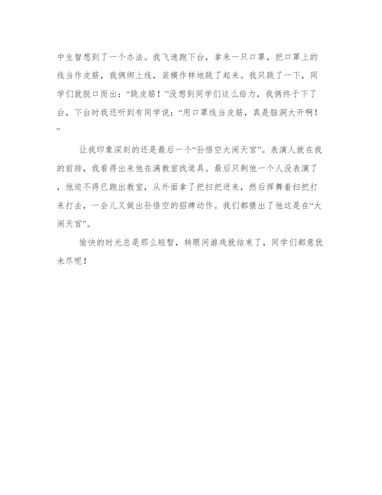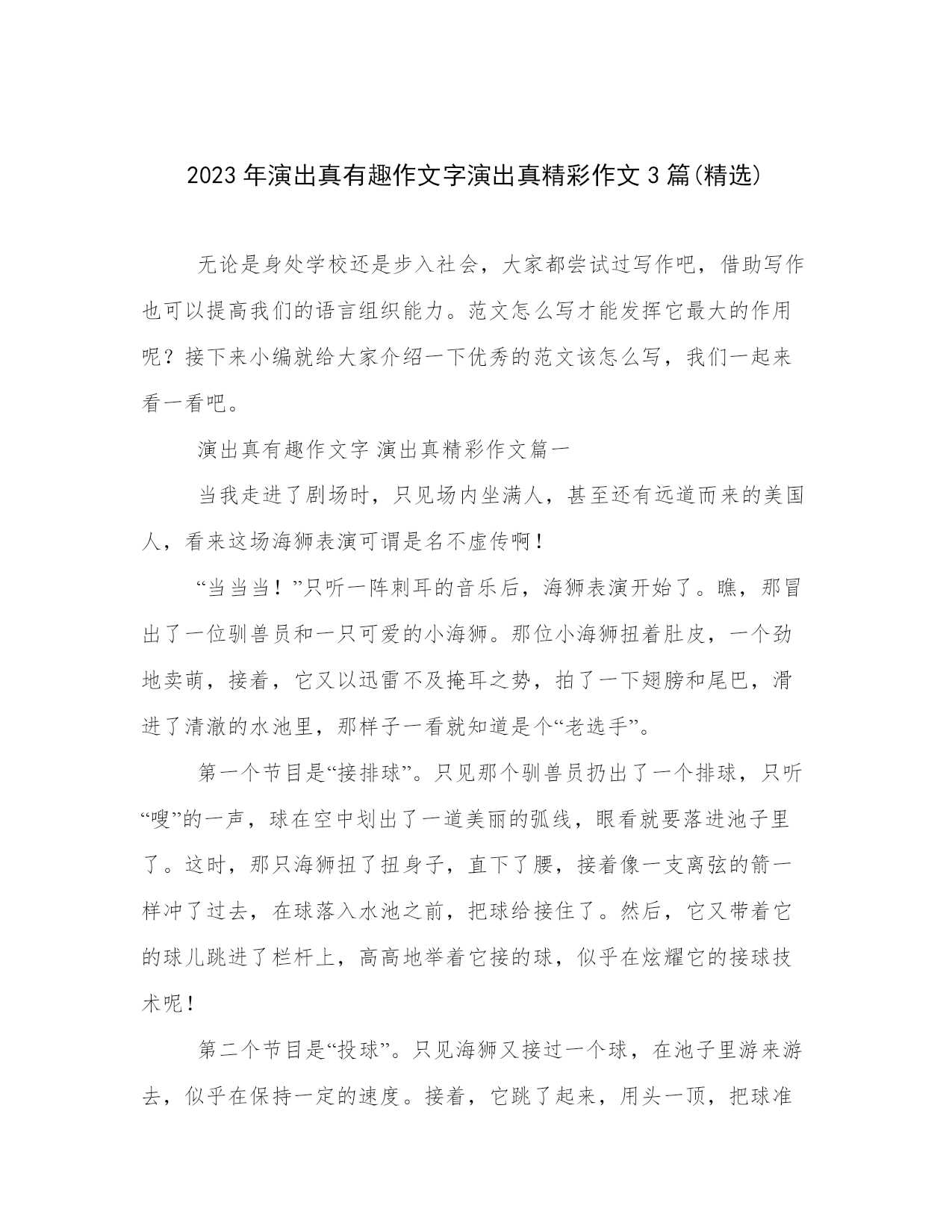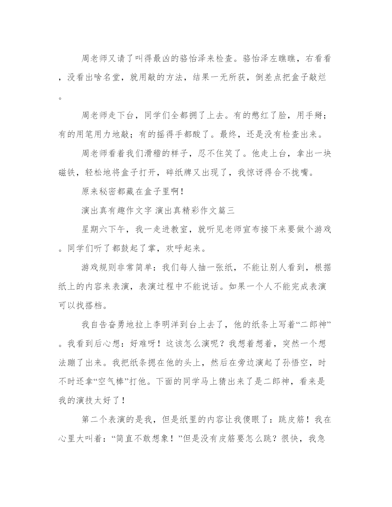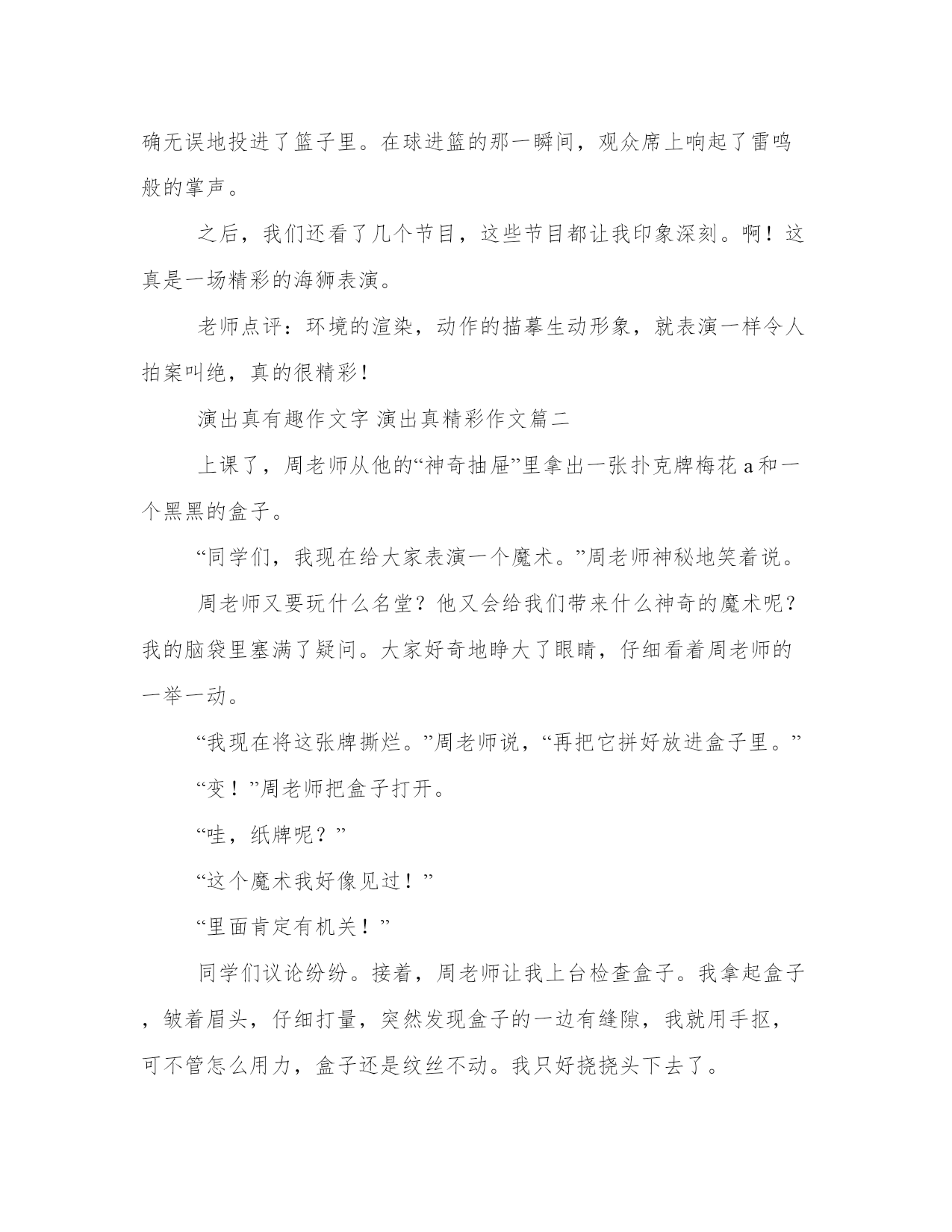 2023年演出真有趣作文字演出真精彩作文3篇(精选)无论是身处学校还是步入社会,大家都尝试过写作吧,借助写作也可以提高我们的语言组织能力。范文怎么写才能发挥它最大的作用呢?接下来小编就给大家介绍一下优秀的范文该怎么写,我们一起来看一看吧。演出真有趣作文字演出真精彩作文篇一当我走进了剧场时,只见场内坐满人,甚至还有远道而来的美国人,看来这场海狮表演可谓是名不虚传啊!“当当当!”只听一阵刺耳的音乐后,海狮表演开始了。瞧,那冒出了一位驯兽员和一只可爱的小海狮。那位小海狮扭着肚皮,一个劲地卖萌,接着,它又以迅雷不及掩耳之势,拍了一下翅膀和尾巴,滑进了清澈的水池里,那样子一看就知道是个“老选手”。第一个节目是“接排球”。只见那个驯兽员扔出了一个排球,只听“嗖”的一声,球在空中划出了一道美丽的弧线,眼看就要落进池子里了。这时,那只海狮扭了扭身子,直下了腰,接着像一支离弦的箭一样冲了过去,在球落入水池之前,把球给接住了。然后,它又带着它的球儿跳进了栏杆上,高高地举着它接的球,似乎在炫耀它的接球技术呢!第二个节目是“投球”。只见海狮又接过一个球,在池子里游来游去,似乎在保持一定的速度。接着,它跳了起来,用头一顶,把球准确无误地投进了篮子里。在球进篮的那一瞬间,观众席上响起了雷鸣般的掌声。之后,我们还看了几个节目,这些节目都让我印象深刻。啊!这真是一场精彩的海狮表演。老师点评:环境的渲染,动作的描摹生动形象,就表演一样令人拍案叫绝,真的很精彩!演出真有趣作文字演出真精彩作文篇二上课了,周老师从他的“神奇抽屉”里拿出一张扑克牌梅花a和一个黑黑的盒子。“同学们,我现在给大家表演一个魔术。”周老师神秘地笑着说。周老师又要玩什么名堂?他又会给我们带来什么神奇的魔术呢?我的脑袋里塞满了疑问。大家好奇地睁大了眼睛,仔细看着周老师的一举一动。“我现在将这张牌撕烂。”周老师说,“再把它拼好放进盒子里。”“变!”周老师把盒子打开。“哇,纸牌呢?”“这个魔术我好像见过!”“里面肯定有机关!”同学们议论纷纷。接着,周老师让我上台检查盒子。我拿起盒子,皱着眉头,仔细打量,突然发现盒子的一边有缝隙,我就用手抠,可不管怎么用力,盒子还是纹丝不动。我只好挠挠头下去了。周老师又请了叫得最凶的骆怡泽来检查。骆怡泽左瞧瞧,右看看,没看出啥名堂,就用敲的方法,结果一无所获,倒差点把盒子敲烂。周老师走下台,同学们全都拥了上去。有的憋红了脸,用手掰;有的用笔用力地敲;有的摇得手都酸了。最终,还是没有检查出来。周老师看着我们滑稽的样子,忍不住笑了。他走上台,拿出一块磁铁,轻松地将盒子打开,碎纸牌又出现了,我惊讶得合不拢嘴。原来秘密都藏在盒子里啊!演出真有趣作文字演出真精彩作文篇三星期六下午,我一走进教室,就听见老师宣布接下来要做个游戏。同学们听了都鼓起了掌,欢呼起来。游戏规则非常简单:我们每人抽一张纸,不能让别人看到,根据纸上的内容来表演,表演过程中不能说话。如果一个人不能完成表演可以找搭档。我自告奋勇地拉上李明洋到台上去了,他的纸条上写着“二郎神”。我看到后心想:好难呀!这该怎么演呢?我想着想着,突然一个想法蹦了出来。我把纸条摁在他的头上,然后在旁边演起了孙悟空,时不时还拿“空气棒”打他。下面的同学马上猜出来了是二郎神,看来是我的演技太好了!第二个表演的是我,但是纸里的内容让我傻眼了:跳皮筋!我在心里大叫着:“简直不敢想象!”但是没有皮筋要怎么跳?很快,我急中生智想到了一个办法。我飞速跑下台,拿来一只口罩,把口罩上的线当作皮筋,我俩绑上线,装模作样地跳了起来。我只跳了一下,同学们就脱口而出:“跳皮筋!”没想到同学们这么给力,我俩终于下了台,下台时我还听到有同学说:“用口罩线当皮筋,真是脑洞大开啊!”让我印象深刻的还是最后一个“孙悟空大闹天宫”。表演人就在我的前排,我看得出来他在满教室找道具。最后只剩他一个人没表演了,他迫不得已跑出教室,从外面拿了把扫把进来,然后挥舞着扫把打来打去,一会儿又做出孙悟空的招牌动作。我们都猜出了他这是在“大闹天宫”。愉快的时光总是那么短暂,转眼间游戏就结束了,同学们都意犹未尽呢!