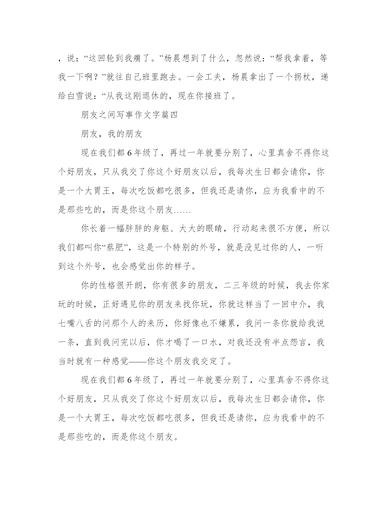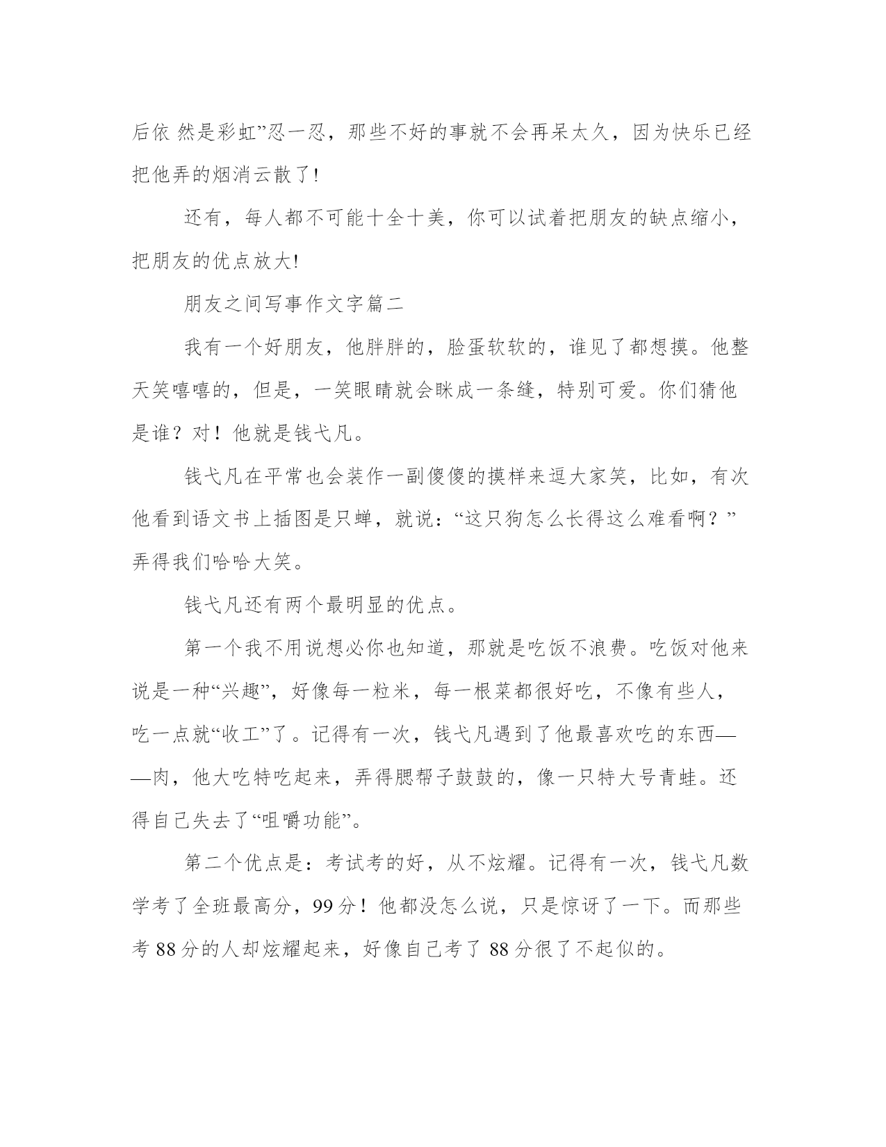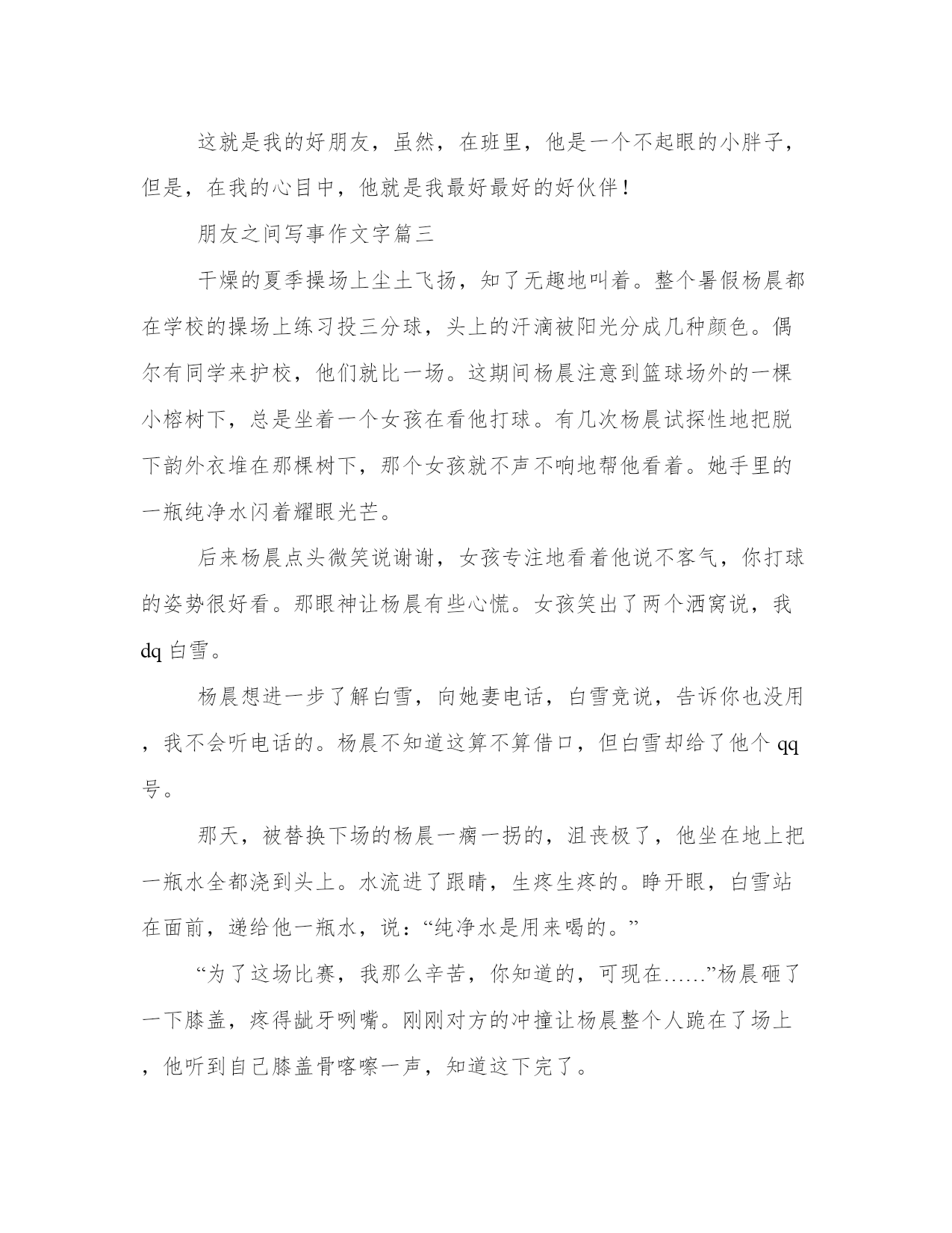 朋友之间写事作文字14篇(汇总)每个人都曾试图在平淡的学习、工作和生活中写一篇文章。写作是培养人的观察、联想、想象、思维和记忆的重要手段。范文书写有哪些要求呢?我们怎样才能写好一篇范文呢?下面是小编为大家收集的优秀范文,供大家参考借鉴,希望可以帮助到有需要的朋友。朋友之间写事作文字篇一有时候我们一起回家,聊得好好的,却对一件事产生了不同看法。他往东,你非得往西,然后就在那里争执不休,吵一吵,如果误会能解开也行呀,但是却吵得更激烈了,甚至要动手了(倒吸一口冷气),结果你的朋友很生气的对你说:“我要和你绝交!”而你那时也正气在头上,不假思索地说:“行!”那时候你们的气都消了一大半,都有些后悔当时自己说的话,就想跟对方道歉,但又不知道该怎么办,就陷入了苦恼之中,嘻嘻,其实很简单的啦;1.你要先想好怎样跟他道歉,语气要稳,不能很快,觉得你没有诚意。2.你可以在街上给他挑个礼物,说:“收下就等于你原谅我了。”3.你要尽所能的帮助他,让他的困难出尽量减少一些。以上几点你都可以试试,但如果这还不行的话,那我也就没有办法了,所以说,朋友之间发生不同的观念时,你可以忍一忍,“风雨过后依然是彩虹”忍一忍,那些不好的事就不会再呆太久,因为快乐已经把他弄的烟消云散了!还有,每人都不可能十全十美,你可以试着把朋友的缺点缩小,把朋友的优点放大!朋友之间写事作文字篇二我有一个好朋友,他胖胖的,脸蛋软软的,谁见了都想摸。他整天笑嘻嘻的,但是,一笑眼睛就会眯成一条缝,特别可爱。你们猜他是谁?对!他就是钱弋凡。钱弋凡在平常也会装作一副傻傻的摸样来逗大家笑,比如,有次他看到语文书上插图是只蝉,就说:“这只狗怎么长得这么难看啊?”弄得我们哈哈大笑。钱弋凡还有两个最明显的优点。第一个我不用说想必你也知道,那就是吃饭不浪费。吃饭对他来说是一种“兴趣”,好像每一粒米,每一根菜都很好吃,不像有些人,吃一点就“收工”了。记得有一次,钱弋凡遇到了他最喜欢吃的东西——肉,他大吃特吃起来,弄得腮帮子鼓鼓的,像一只特大号青蛙。还得自己失去了“咀嚼功能”。第二个优点是:考试考的好,从不炫耀。记得有一次,钱弋凡数学考了全班最高分,99分!他都没怎么说,只是惊讶了一下。而那些考88分的人却炫耀起来,好像自己考了88分很了不起似的。这就是我的好朋友,虽然,在班里,他是一个不起眼的小胖子,但是,在我的心目中,他就是我最好最好的好伙伴!朋友之间写事作文字篇三干燥的夏季操场上尘土飞扬,知了无趣地叫着。整个暑假杨晨都在学校的操场上练习投三分球,头上的汗滴被阳光分成几种颜色。偶尔有同学来护校,他们就比一场。这期间杨晨注意到篮球场外的一棵小榕树下,总是坐着一个女孩在看他打球。有几次杨晨试探性地把脱下韵外衣堆在那棵树下,那个女孩就不声不响地帮他看着。她手里的一瓶纯净水闪着耀眼光芒。后来杨晨点头微笑说谢谢,女孩专注地看着他说不客气,你打球的姿势很好看。那眼神让杨晨有些心慌。女孩笑出了两个洒窝说,我dq白雪。杨晨想进一步了解白雪,向她妻电话,白雪竞说,告诉你也没用,我不会听电话的。杨晨不知道这算不算借口,但白雪却给了他个qq号。那天,被替换下场的杨晨一瘸一拐的,沮丧极了,他坐在地上把一瓶水全都浇到头上。水流进了跟睛,生疼生疼的。睁开眼,白雪站在面前,递给他一瓶水,说:“纯净水是用来喝的。”“为了这场比赛,我那么辛苦,你知道的,可现在……”杨晨砸了一下膝盖,疼得龇牙咧嘴。刚刚对方的冲撞让杨晨整个人跪在了场上,他听到自己膝盖骨喀嚓一声,知道这下完了。白雪一直注视他,静静地听着他,抱怨完才说话:“这点挫折怕什么,还有决赛呢!”杨晨笑了,这个白净柔弱的女孩肯定没有经历过什么挫折和打击,所以体验不到自己的感受。杨展把头整个埋在腿弯里喃喃自语道:“看来我不适合打球,你说呢?你也不知道腿瘸了的痛苦吧?”他没有听到白雪的回答,以为她生气了,抬头看时,却见白雪正仰望着天上飞过的飞机,兀自说着:“真想坐飞机去看看大海呀!”白雪在qq上的名字叫查无此人,个性签名是:请看着我的眼睛说话。看来这是个很自恋的女孩子。杨晨歪着嘴一笑,发信息给白雪:有没有兴趣看我的文章?查无此人回:好呀!杨展平时除了打球还喜欢写文章,他很少拿给别人看,除非是他认定可交的朋友。几分钟后,查无此人又发来信息:有没有兴趣参加今年的新概念作文大赛?杨晨回:我没有勇气。查无此人回:我帮你找勇气。第二天上学时,杨展在校门口叫白雪,她却头都不回。杨晨纳闷了,怎么忽冷忽热的?昨天还聊得那么开心,现在却像不认识一样。杨展发现白雪很内向,她并不经常和别人说话,而且也很孤傲。女孩子唧唧喳喳时,她也不理会,但每次白雪和别人对话时,都会很认真地看着对方的脸。课间操,杨展把文学社的稿子拿到广播室外的时候,在走廊里遇到了白雪,她的脚好像扭伤了,正扶着墙走。见到杨晨,白雪却笑了,说:“这