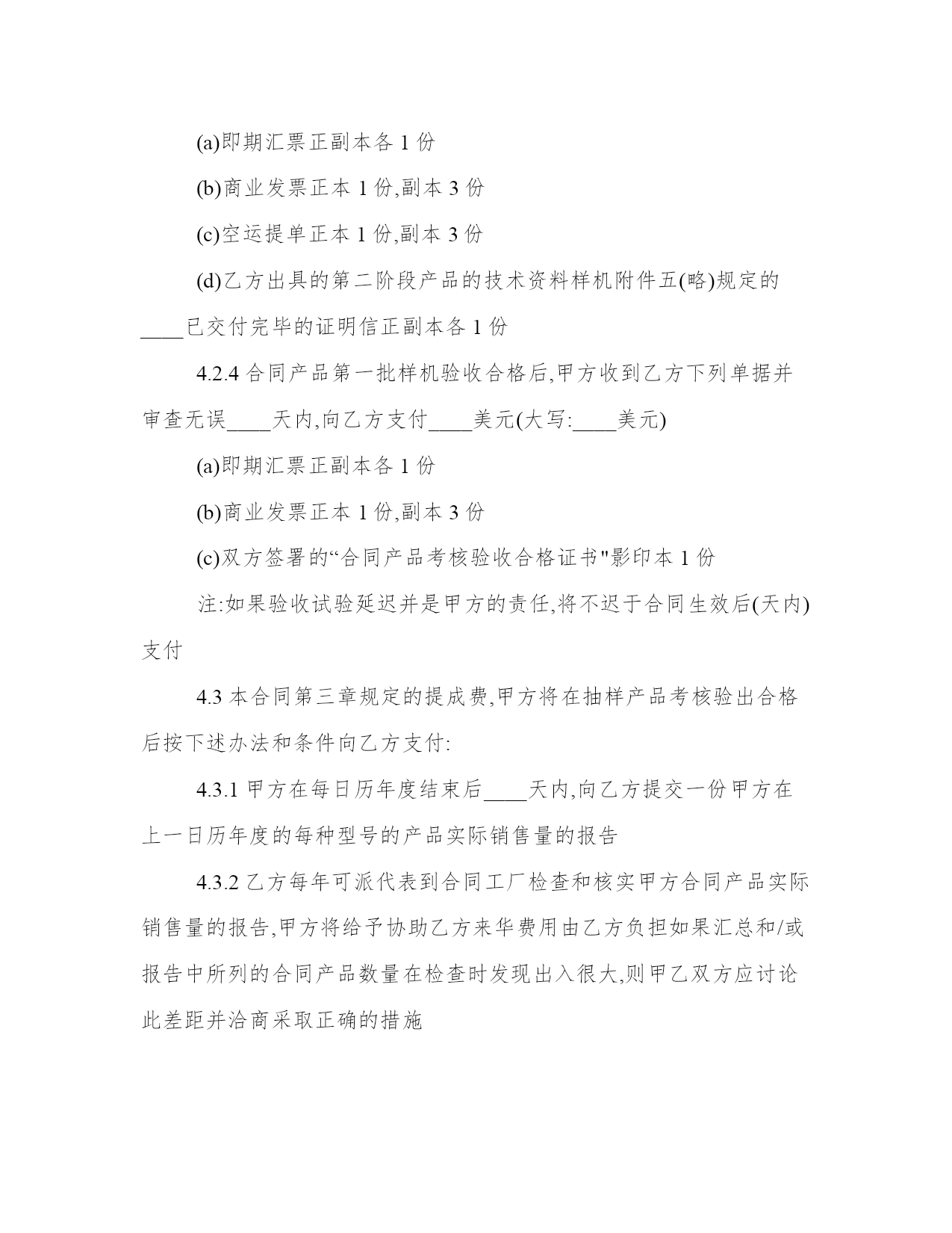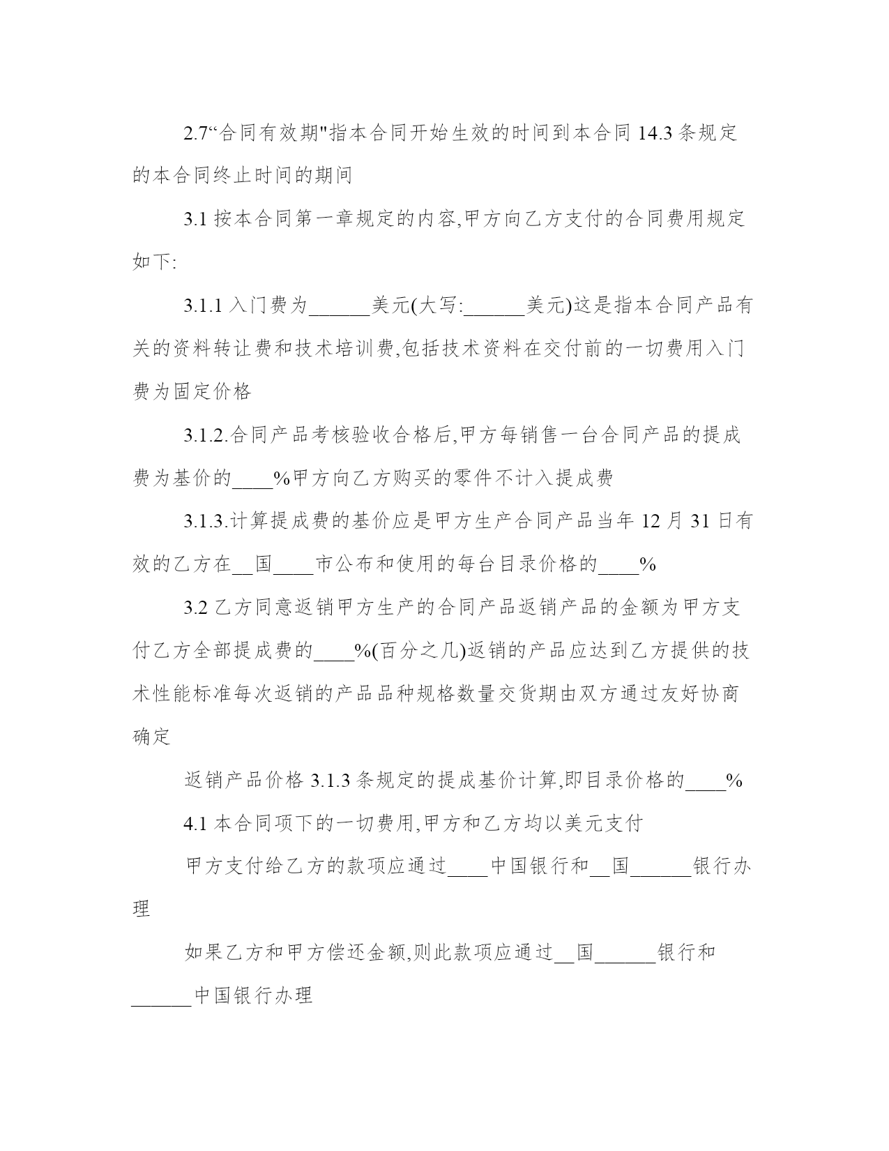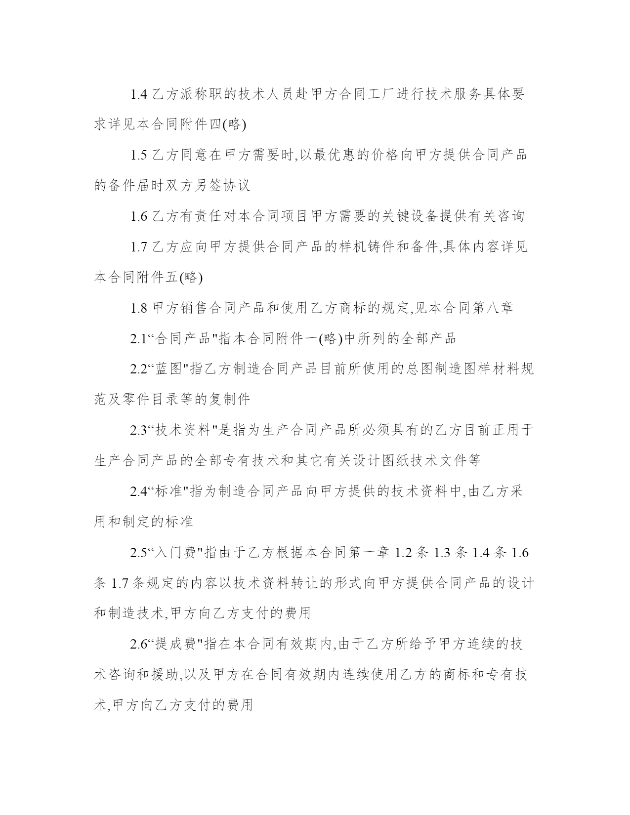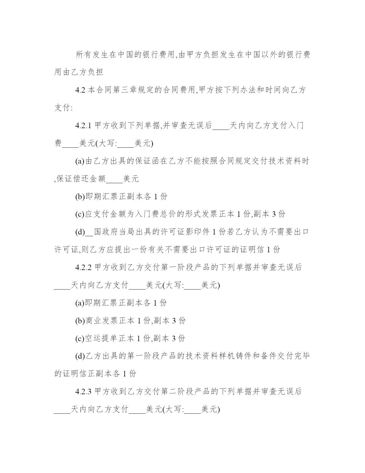 最新中外合作合同实用合同是适应私有制的商品经济的客观要求而出现的,是商品交换在法律上的表现形式。合同是适应私有制的商品经济的客观要求而出现的,是商品交换在法律上的表现形式。那么合同应该怎么制定才合适呢?这里我整理了一些优秀的合同范文,希望对大家有所帮助,下面我们就来了解一下吧。中外合作合同篇一本合同于____年____月____日在______签订甲方为:中国______公司合同工厂:中国______厂(以下简称甲方)乙方为:×国______公司(以下简称乙方)1.1乙方同意向甲方提供制造××合同产品的书面及非书面专有技术用该项技术所生产的合同产品的品种规格技术性能等详见本合同附件一(略)1.2乙方负责向甲方提供制造使用和销售合同产品的专有技术和其它所有有关技术资料技术资料的内容及有关事项详见本合同附件二(略)1.3乙方负责安排甲方技术人员在乙方工厂进行培训,乙方应采取有效措施使甲方人员掌握制造合同产品的技术,具体内容见本合同附件三(略)1.4乙方派称职的技术人员赴甲方合同工厂进行技术服务具体要求详见本合同附件四(略)1.5乙方同意在甲方需要时,以最优惠的价格向甲方提供合同产品的备件届时双方另签协议1.6乙方有责任对本合同项目甲方需要的关键设备提供有关咨询1.7乙方应向甲方提供合同产品的样机铸件和备件,具体内容详见本合同附件五(略)1.8甲方销售合同产品和使用乙方商标的规定,见本合同第八章2.1“合同产品"指本合同附件一(略)中所列的全部产品2.2“蓝图"指乙方制造合同产品目前所使用的总图制造图样材料规范及零件目录等的复制件2.3“技术资料"是指为生产合同产品所必须具有的乙方目前正用于生产合同产品的全部专有技术和其它有关设计图纸技术文件等2.4“标准"指为制造合同产品向甲方提供的技术资料中,由乙方采用和制定的标准2.5“入门费"指由于乙方根据本合同第一章1.2条1.3条1.4条1.6条1.7条规定的内容以技术资料转让的形式向甲方提供合同产品的设计和制造技术,甲方向乙方支付的费用2.6“提成费"指在本合同有效期内,由于乙方所给予甲方连续的技术咨询和援助,以及甲方在合同有效期内连续使用乙方的商标和专有技术,甲方向乙方支付的费用2.7“合同有效期"指本合同开始生效的时间到本合同14.3条规定的本合同终止时间的期间3.1按本合同第一章规定的内容,甲方向乙方支付的合同费用规定如下:3.1.1入门费为______美元(大写:______美元)这是指本合同产品有关的资料转让费和技术培训费,包括技术资料在交付前的一切费用入门费为固定价格3.1.2.合同产品考核验收合格后,甲方每销售一台合同产品的提成费为基价的____%甲方向乙方购买的零件不计入提成费3.1.3.计算提成费的基价应是甲方生产合同产品当年12月31日有效的乙方在__国____市公布和使用的每台目录价格的____%3.2乙方同意返销甲方生产的合同产品返销产品的金额为甲方支付乙方全部提成费的____%(百分之几)返销的产品应达到乙方提供的技术性能标准每次返销的产品品种规格数量交货期由双方通过友好协商确定返销产品价格3.1.3条规定的提成基价计算,即目录价格的____%4.1本合同项下的一切费用,甲方和乙方均以美元支付甲方支付给乙方的款项应通过____中国银行和__国______银行办理如果乙方和甲方偿还金额,则此款项应通过__国______银行和______中国银行办理所有发生在中国的银行费用,由甲方负担发生在中国以外的银行费用由乙方负担4.2本合同第三章规定的合同费用,甲方按下列办法和时间向乙方支付:4.2.1甲方收到下列单据,并审查无误后____天内向乙方支付入门费____美元(大写:____美元)(a)由乙方出具的保证函在乙方不能按照合同规定交付技术资料时,保证偿还金额____美元(b)即期汇票正副本各1份(c)应支付金额为入门费总价的形式发票正本1份,副本3份(d)__国政府当局出具的许可证影印件1份若乙方认为不需要出口许可证,则乙方应提出一份有关不需要出口许可证的证明信1份4.2.2甲方收到乙方交付第一阶段产品的下列单据并审查无误后____天内向乙方支付____美元(大写:____美元)(a)即期汇票正副本各1份(b)商业发票正本1份,副本3份(c)空运提单正本1份,副本3份(d)乙方出具的第一阶段产品的技术资料样机铸件和备件交付完毕的证明信正副本各1份4.2.3甲方收到乙方交付第二阶段产品的下列单据并审查无误后____天内向乙方支付____美元(大写:____美元)(a)即期汇票正副本各1份(b)商业发票正本1份,副本3份(c)空运提单正本1份,副本3份(d)乙方出具的第二阶段产品的技术资料样机附件五(略)规定的____已交付完毕的证明信正副本各1份4.2.4合同产品第一