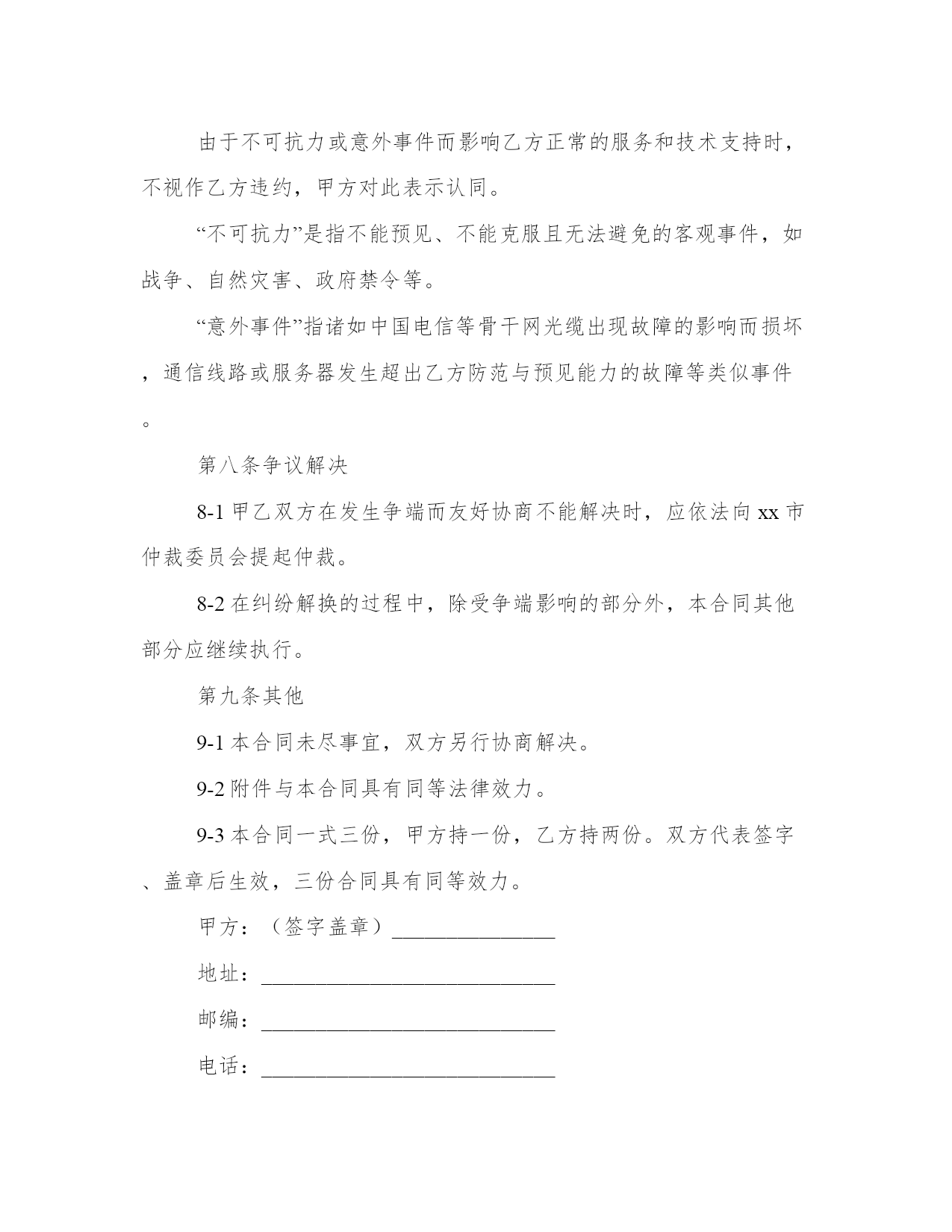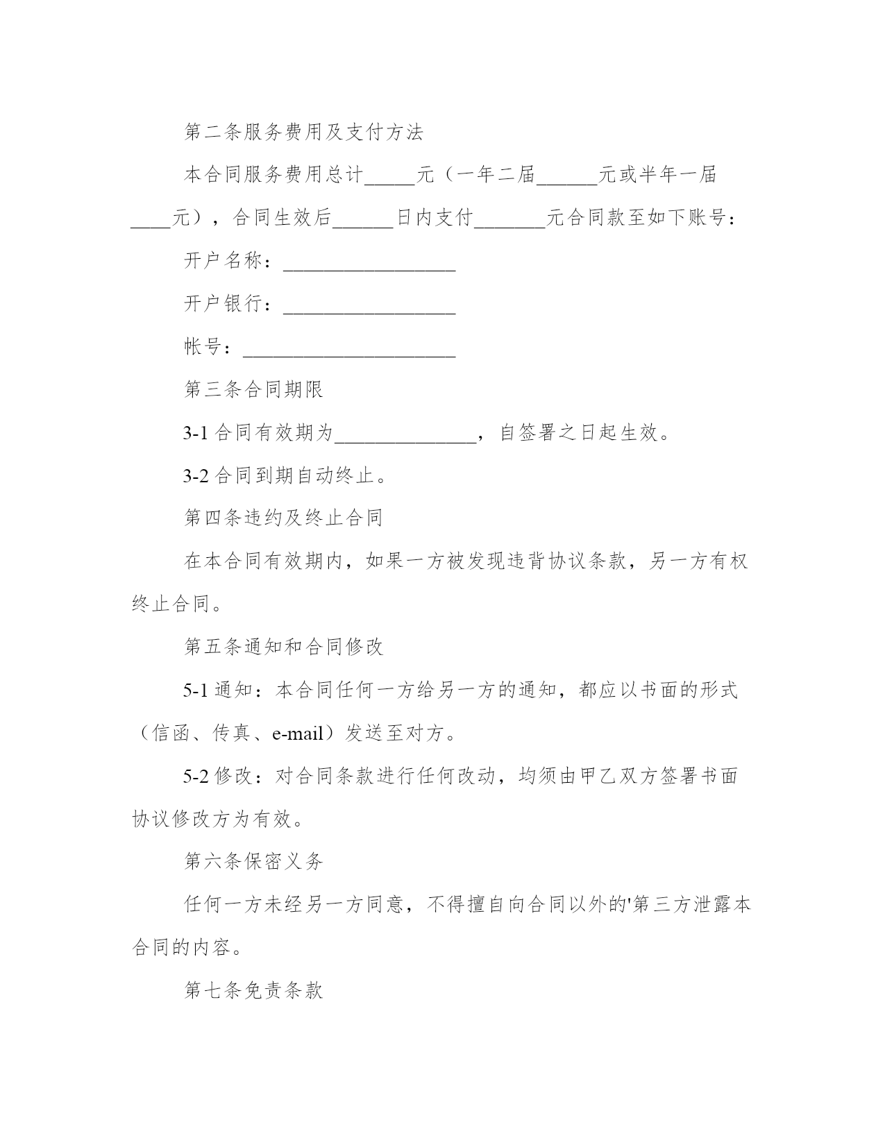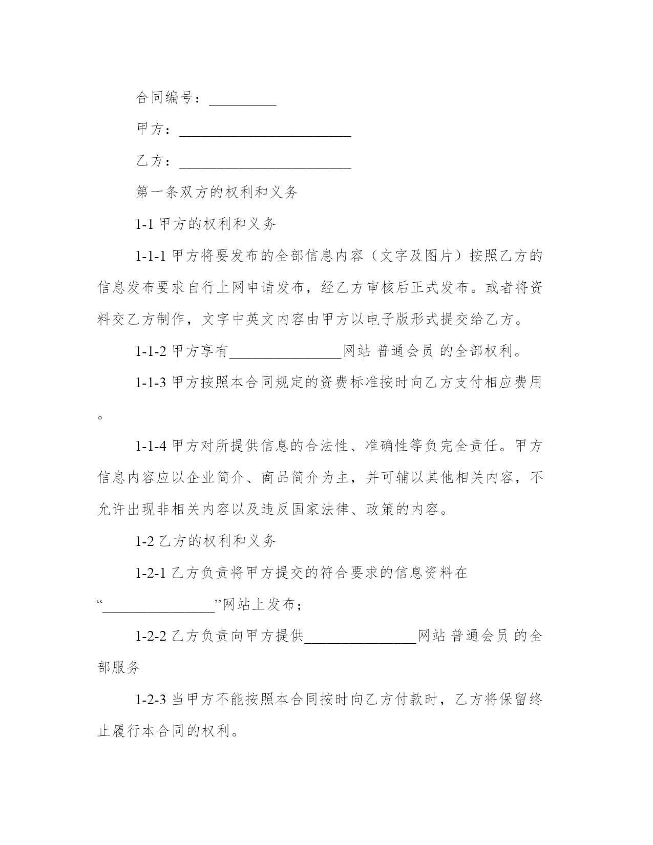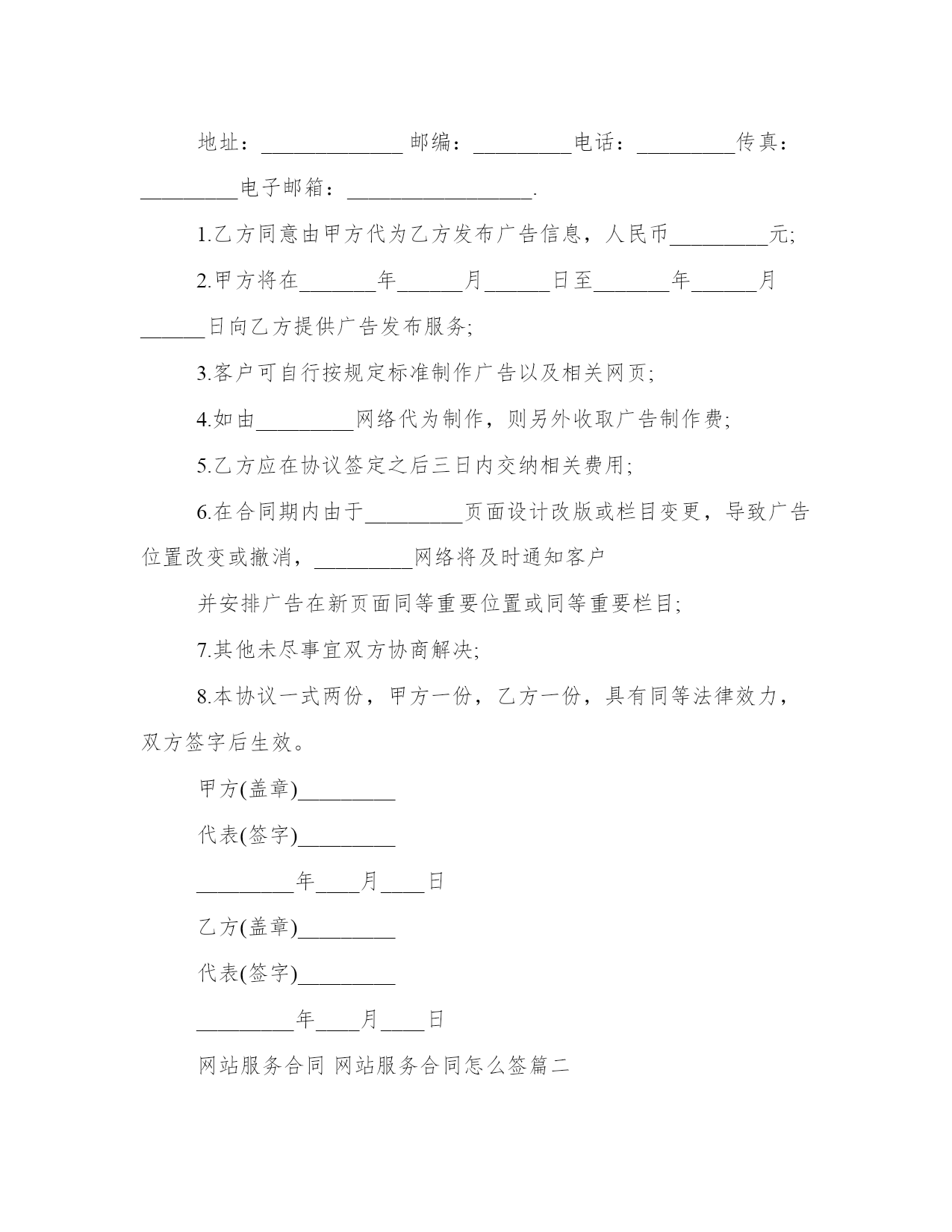 最新网站服务合同网站服务合同怎么签精选现今社会公众的法律意识不断增强,越来越多事情需要用到合同,合同协调着人与人,人与事之间的关系。那么合同应该怎么制定才合适呢?下面是小编给大家带来的合同的范文模板,希望能够帮到你哟!网站服务合同网站服务合同怎么签篇一乙方:__________________________(以下简称甲方)是_________网站首页广告指定代理,全权负责_________网站广告制作发布业务及相关客户服务工作_________(以下简称乙方)是从事_______的公司。甲乙双方经友好协商,就乙方申请_________网站广告宣传事宜达成如下协议:□主页广告a区口主页广告b区□主页广告c区□主页广告d区□主页广告e区□主页广告f区□主页广告g区□主页广告h区口通栏广告a区□通栏广告b区□通栏广告c区□文字广告□弹出广告y区□浮动广告z区□文字链接(友情链接)□文字链接(网站链接)广告申请公司/单位或个人全称:_________________(中文)负责人姓名:_________地址:_____________邮编:_________电话:_________传真:_________电子邮箱:_________________.1.乙方同意由甲方代为乙方发布广告信息,人民币_________元;2.甲方将在_______年______月______日至_______年______月______日向乙方提供广告发布服务;3.客户可自行按规定标准制作广告以及相关网页;4.如由_________网络代为制作,则另外收取广告制作费;5.乙方应在协议签定之后三日内交纳相关费用;6.在合同期内由于_________页面设计改版或栏目变更,导致广告位置改变或撤消,_________网络将及时通知客户并安排广告在新页面同等重要位置或同等重要栏目;7.其他未尽事宜双方协商解决;8.本协议一式两份,甲方一份,乙方一份,具有同等法律效力,双方签字后生效。甲方(盖章)_________代表(签字)__________________年____月____日乙方(盖章)_________代表(签字)__________________年____月____日网站服务合同网站服务合同怎么签篇二合同编号:_________甲方:_______________________乙方:_______________________第一条双方的权利和义务1-1甲方的权利和义务1-1-1甲方将要发布的全部信息内容(文字及图片)按照乙方的信息发布要求自行上网申请发布,经乙方审核后正式发布。或者将资料交乙方制作,文字中英文内容由甲方以电子版形式提交给乙方。1-1-2甲方享有_______________网站普通会员的全部权利。1-1-3甲方按照本合同规定的资费标准按时向乙方支付相应费用。1-1-4甲方对所提供信息的合法性、准确性等负完全责任。甲方信息内容应以企业简介、商品简介为主,并可辅以其他相关内容,不允许出现非相关内容以及违反国家法律、政策的内容。1-2乙方的权利和义务1-2-1乙方负责将甲方提交的符合要求的信息资料在“_______________”网站上发布;1-2-2乙方负责向甲方提供_______________网站普通会员的全部服务1-2-3当甲方不能按照本合同按时向乙方付款时,乙方将保留终止履行本合同的权利。第二条服务费用及支付方法本合同服务费用总计_____元(一年二届______元或半年一届____元),合同生效后______日内支付_______元合同款至如下账号:开户名称:_________________开户银行:_________________帐号:_____________________第三条合同期限3-1合同有效期为______________,自签署之日起生效。3-2合同到期自动终止。第四条违约及终止合同在本合同有效期内,如果一方被发现违背协议条款,另一方有权终止合同。第五条通知和合同修改5-1通知:本合同任何一方给另一方的通知,都应以书面的形式(信函、传真、e-mail)发送至对方。5-2修改:对合同条款进行任何改动,均须由甲乙双方签署书面协议修改方为有效。第六条保密义务任何一方未经另一方同意,不得擅自向合同以外的'第三方泄露本合同的内容。第七条免责条款由于不可抗力或意外事件而影响乙方正常的服务和技术支持时,不视作乙方违约,甲方对此表示认同。“不可抗力”是指不能预见、不能克服且无法避免的客观事件,如战争、自然灾害、政府禁令等。“意外事件”指诸如中国电信等骨干网光缆出现故障的影响而损坏,通信线路或服务器发生超出乙方防范与预见能力的故障等类似事件。第八条争议解决8-1甲乙双方在发生争端而友好协商不能解决时,应依法向xx市仲